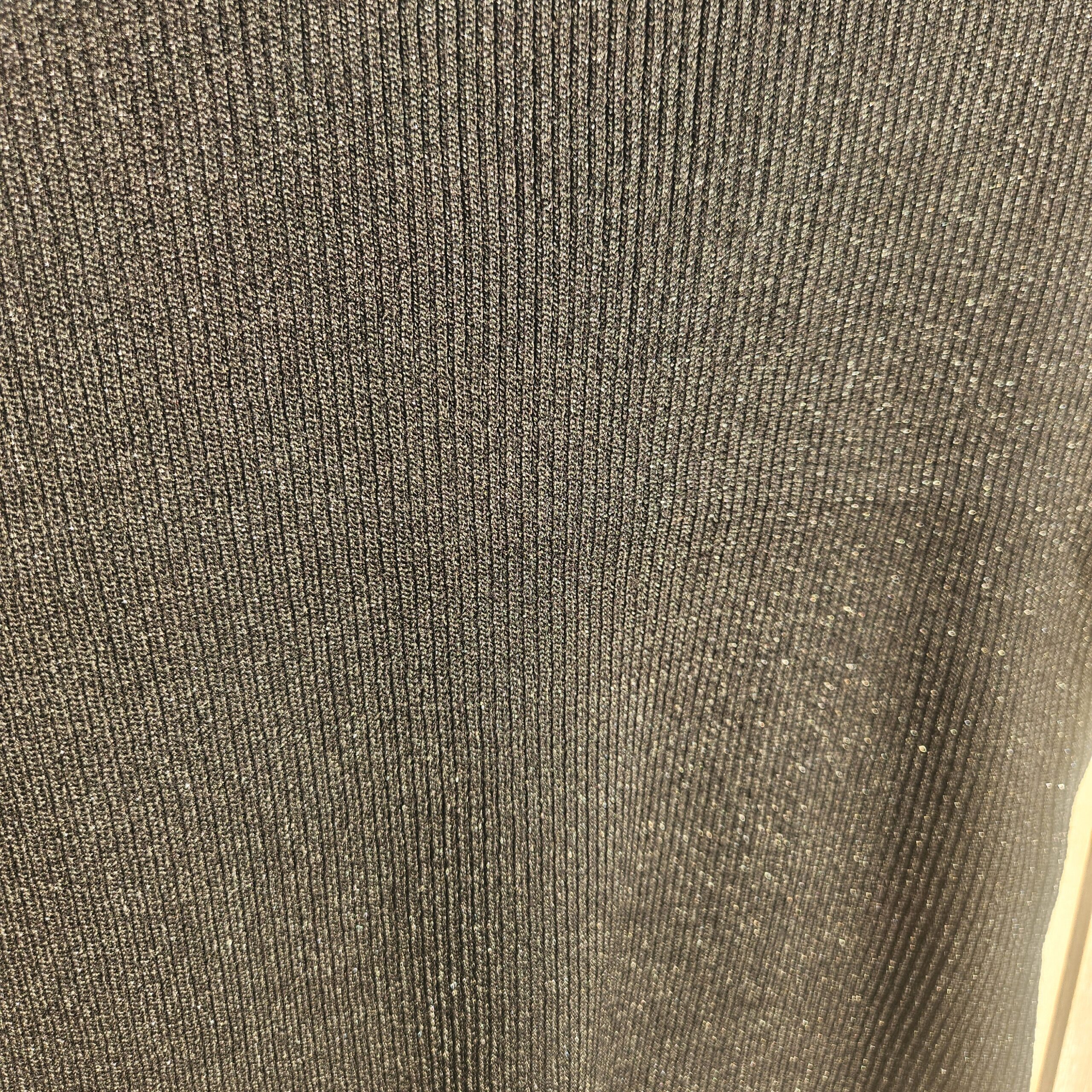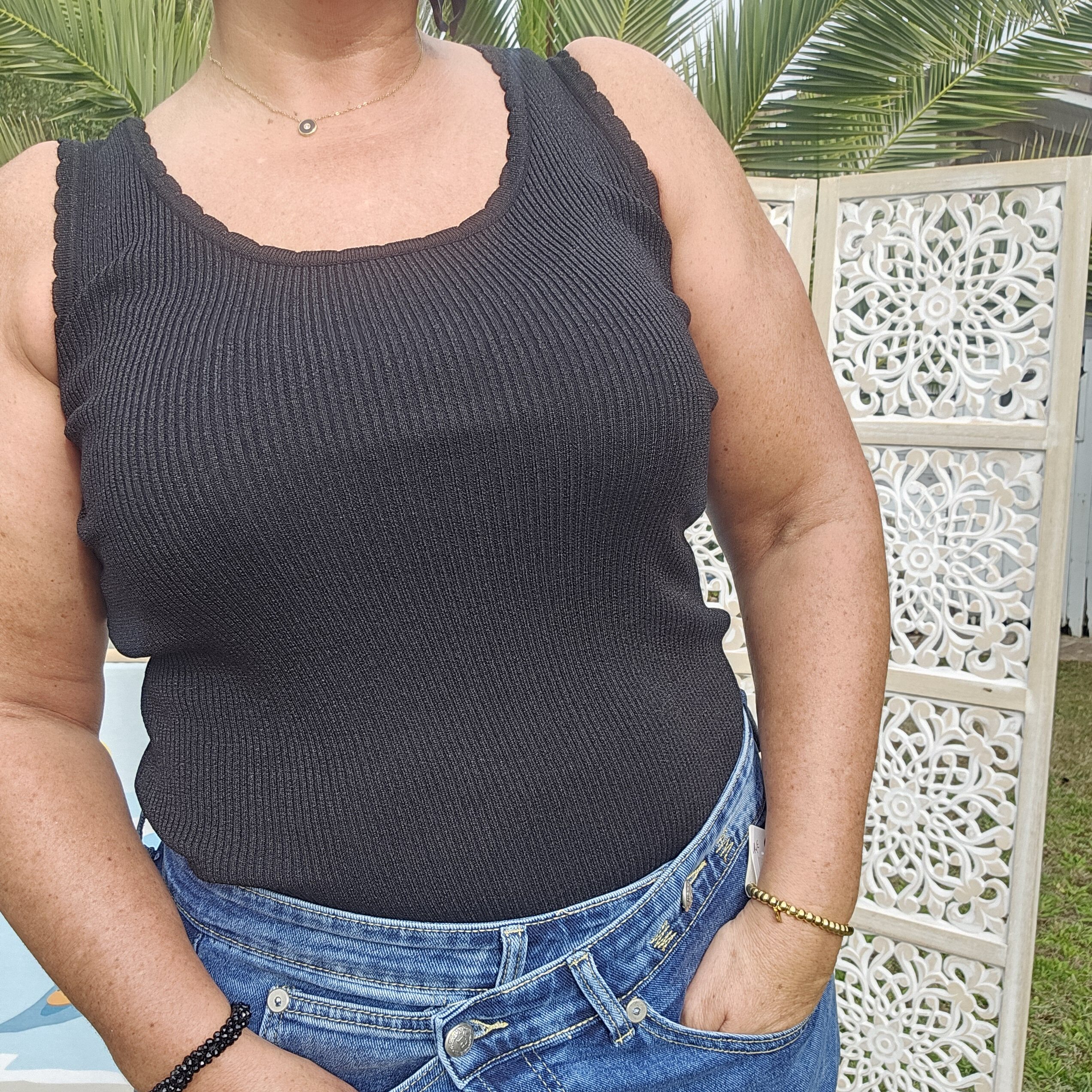 Débardeur noir côtelé en lurex brillant, arrondit devant et derrière, le tour du décolleté et bretelles est en petites vagues. Très extensible.