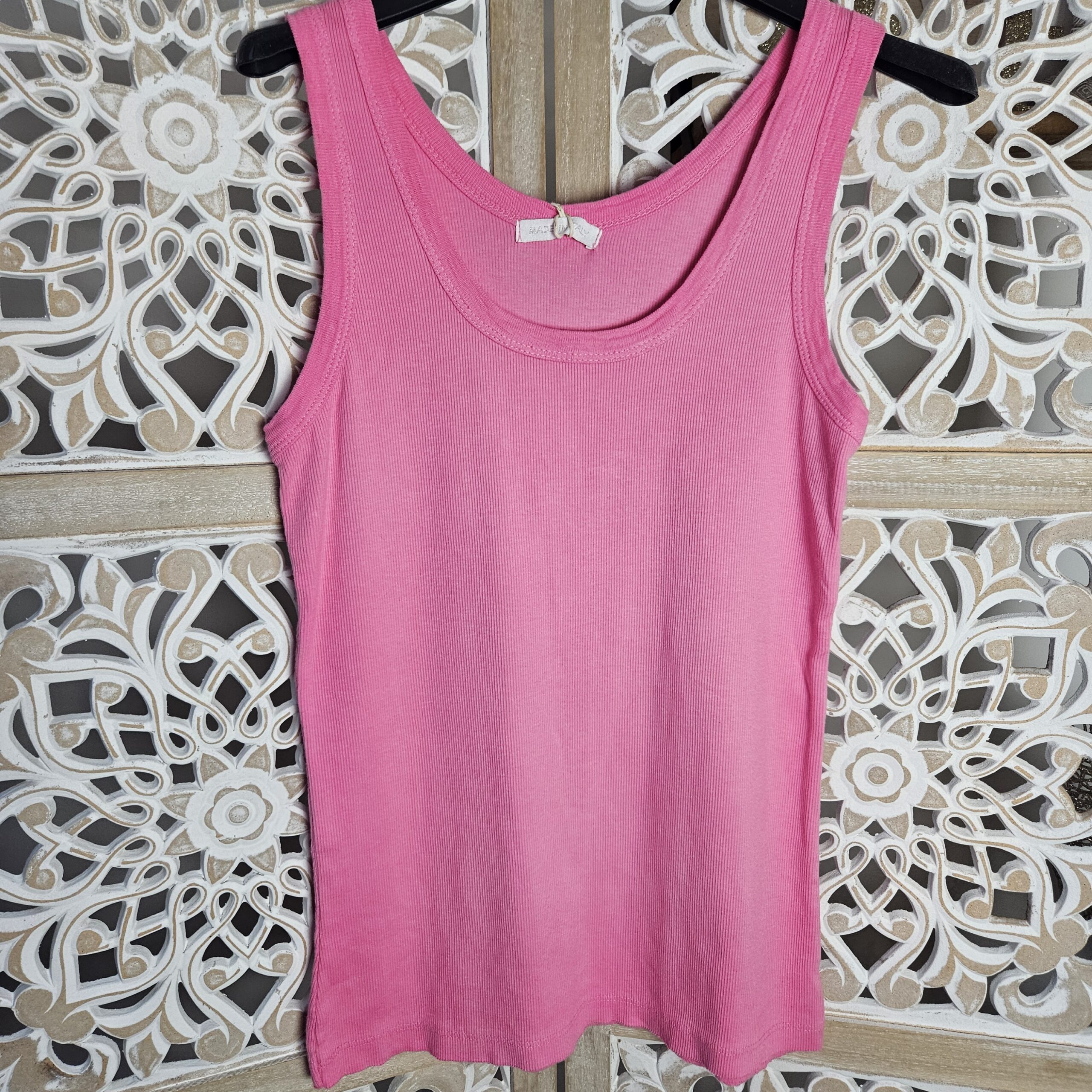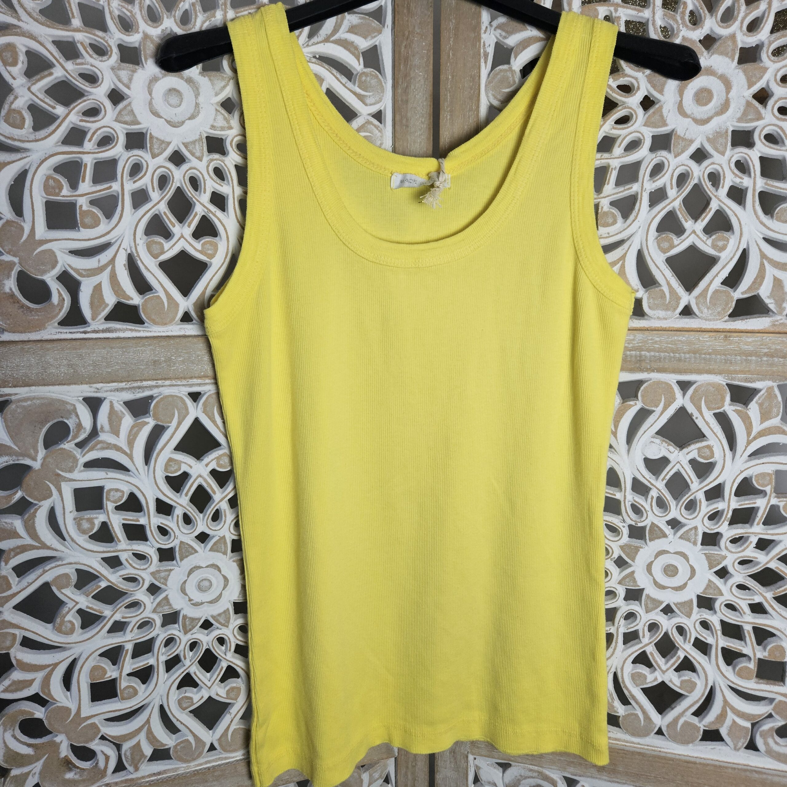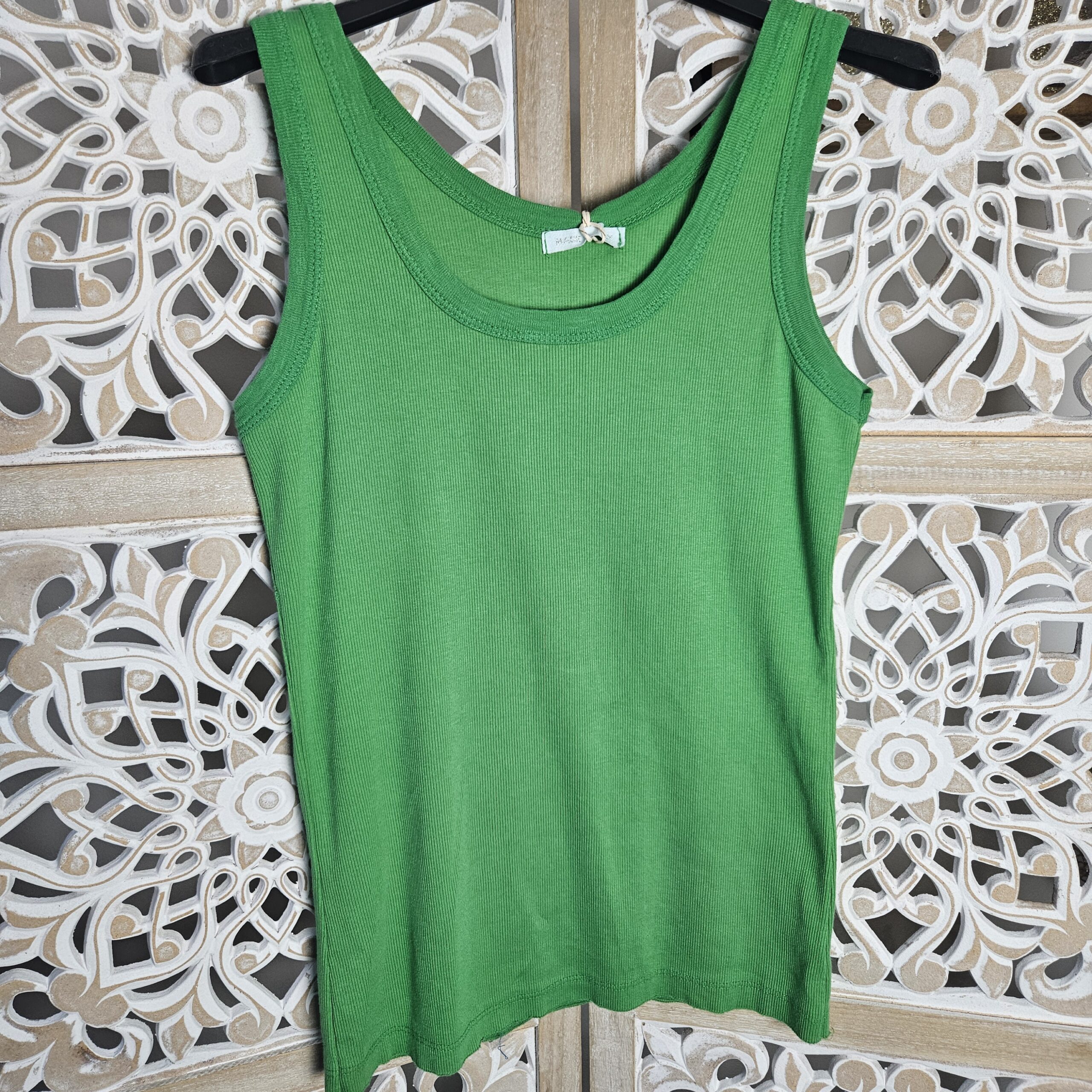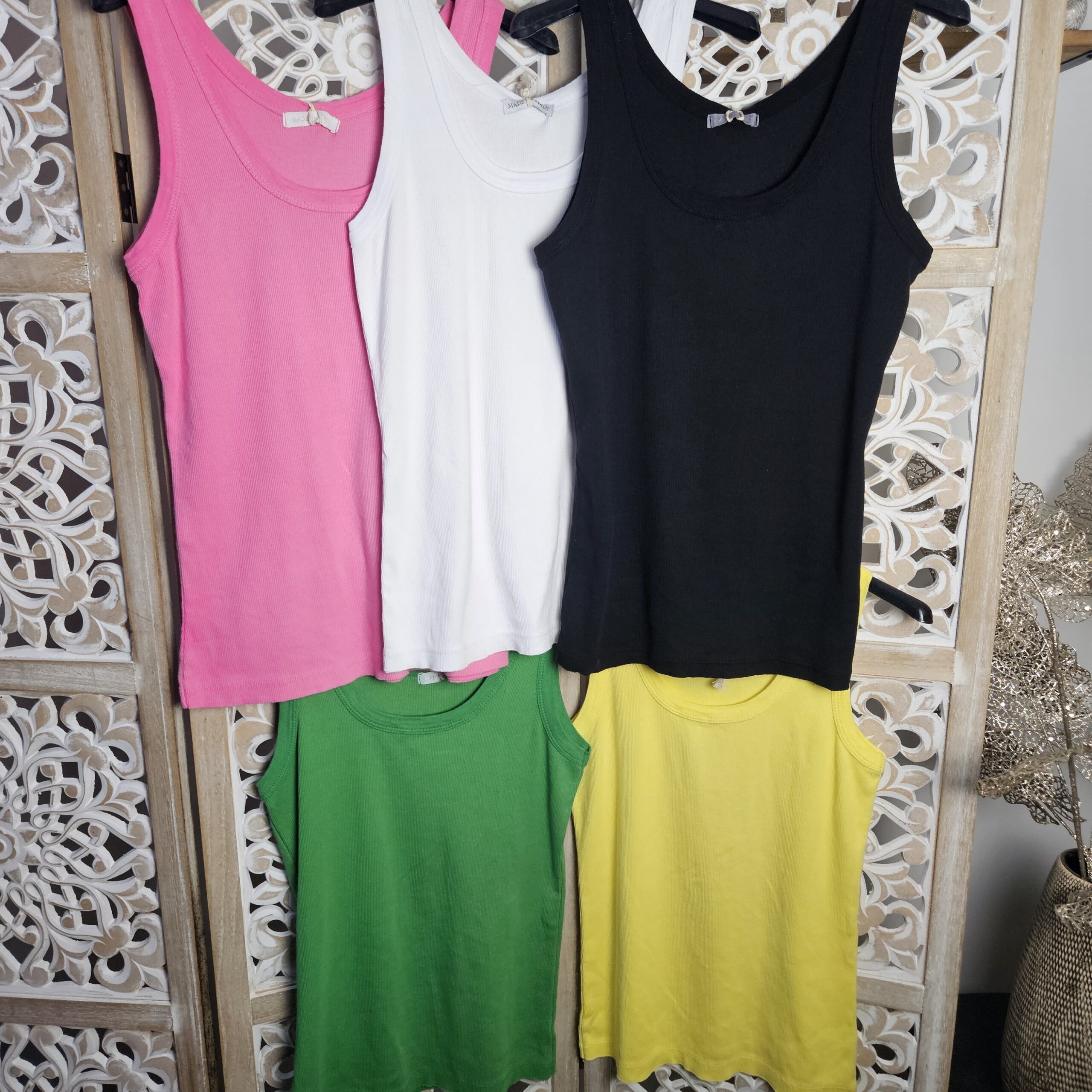 Débardeur uni côtelé, très extensible. Existe en rose bonbon, en blanc, en jaune, en vert Gucci et en noir. TU