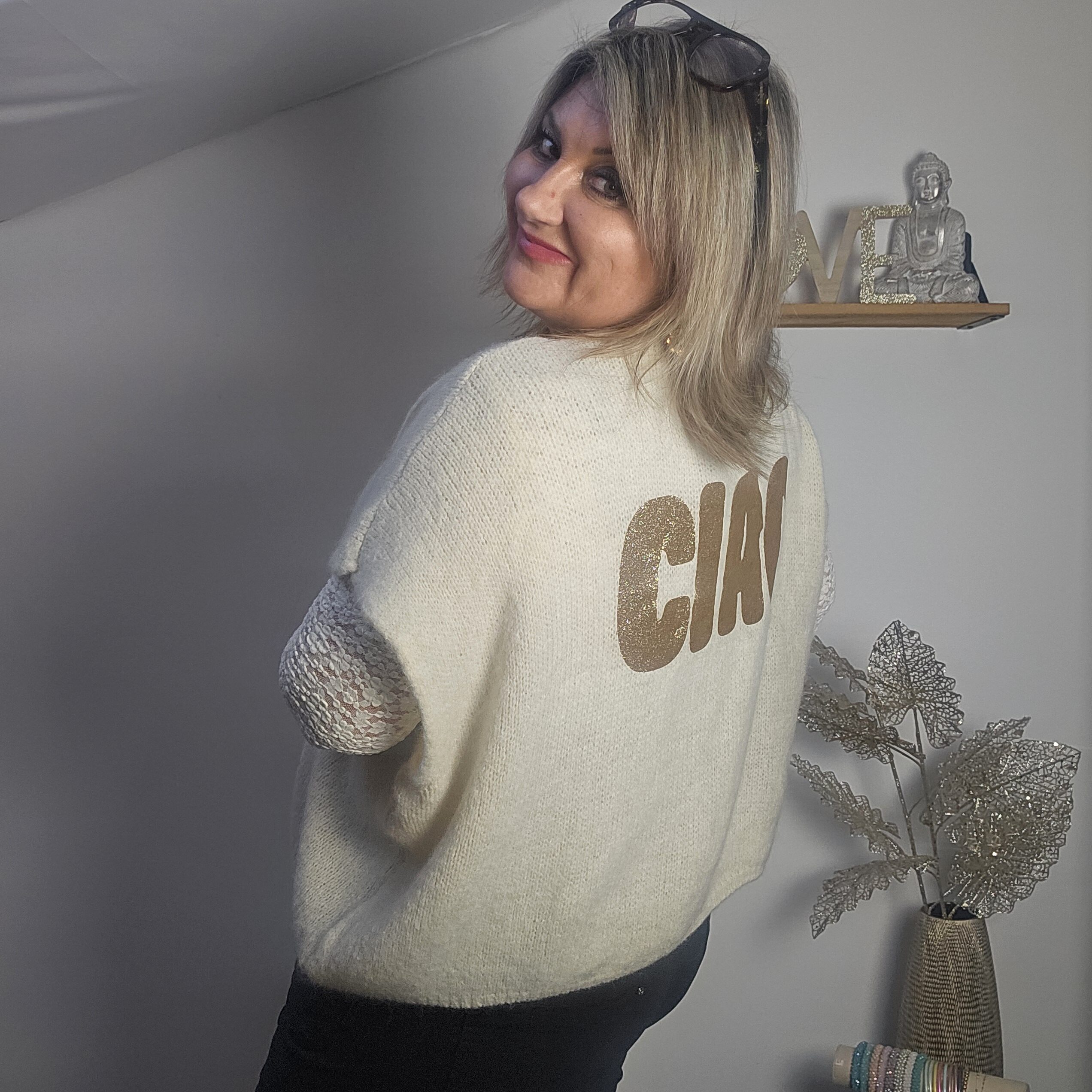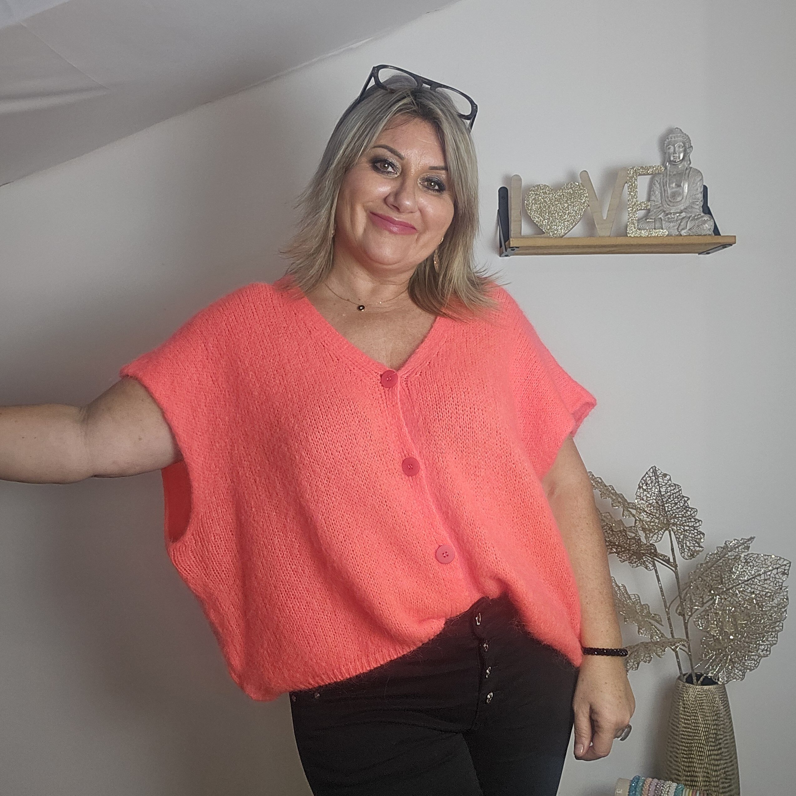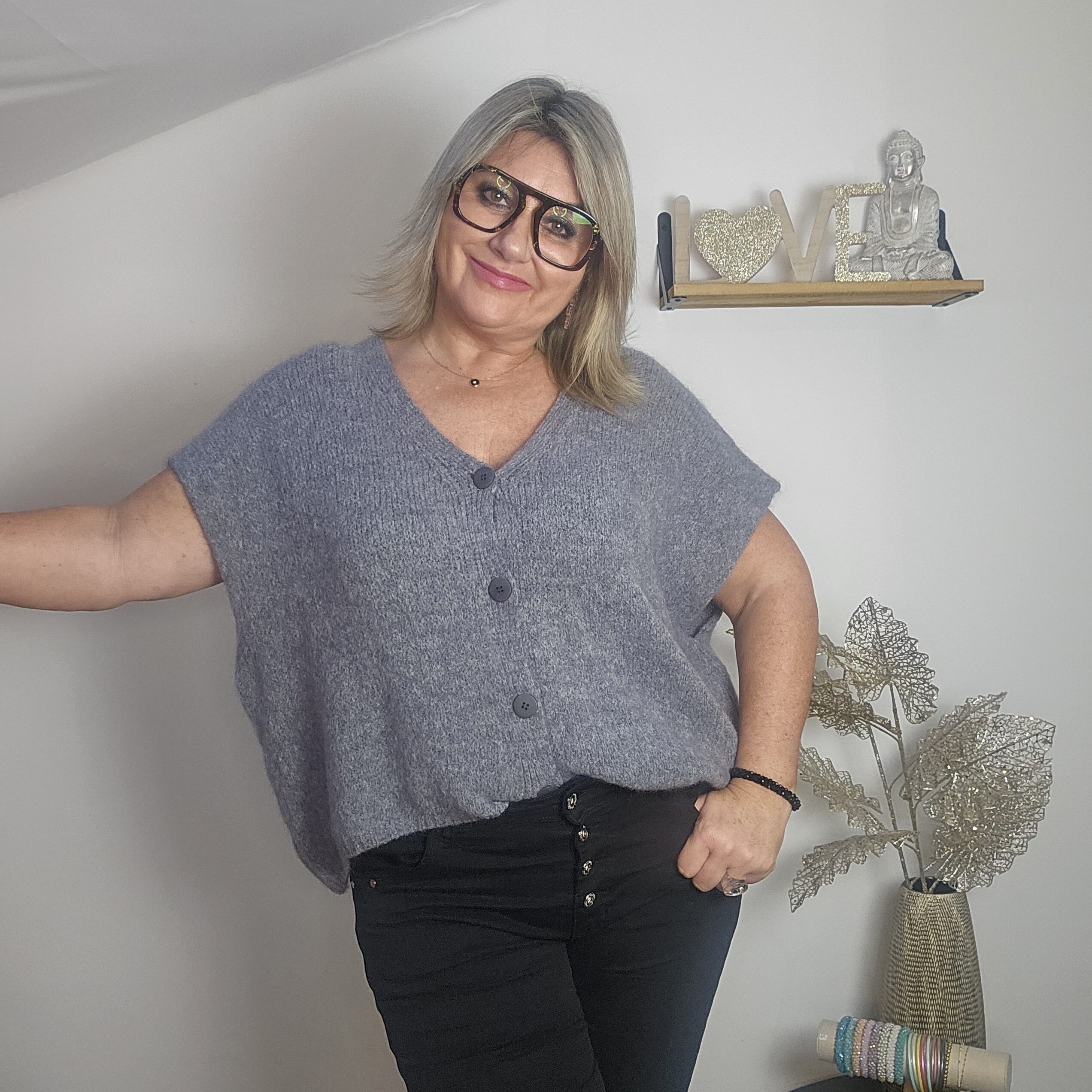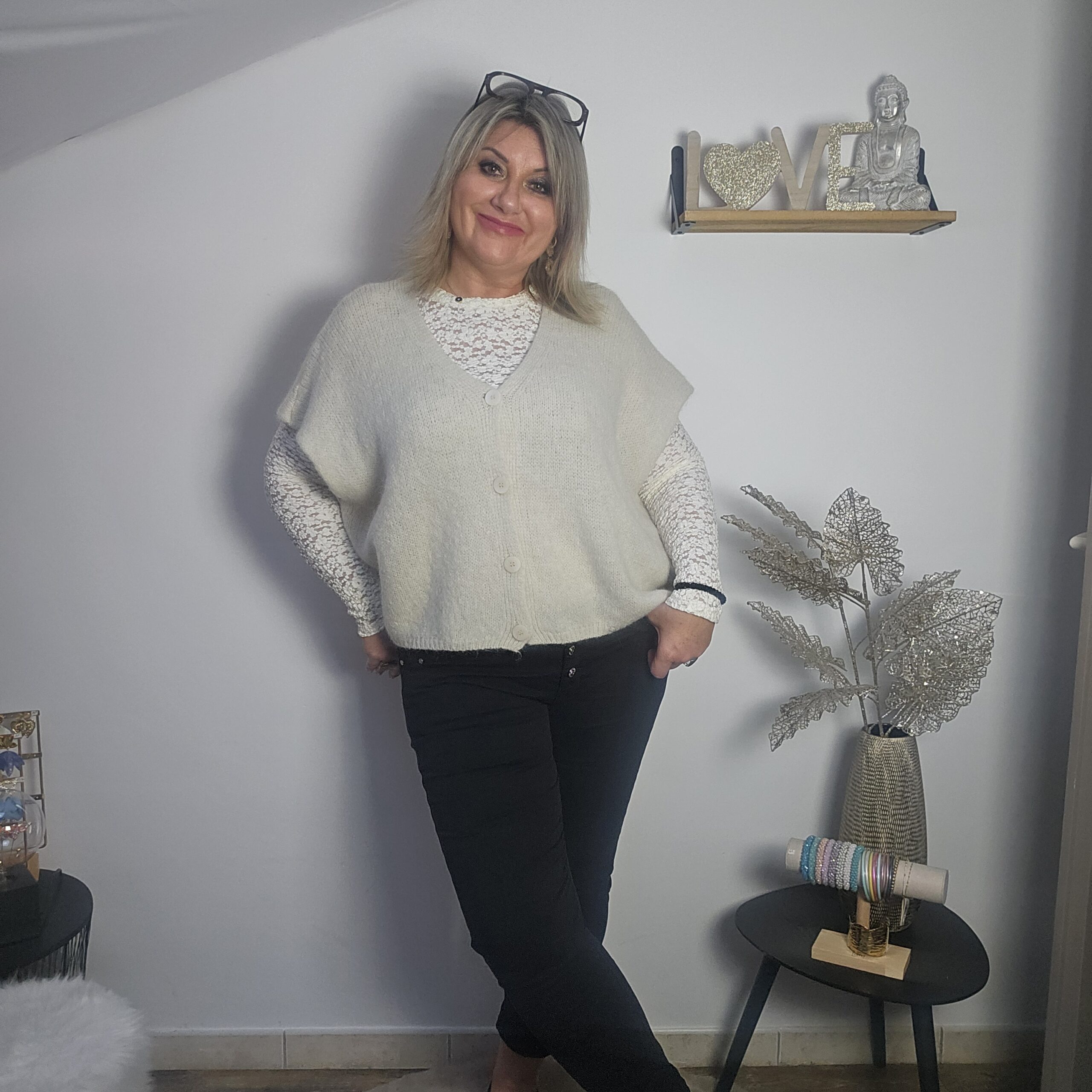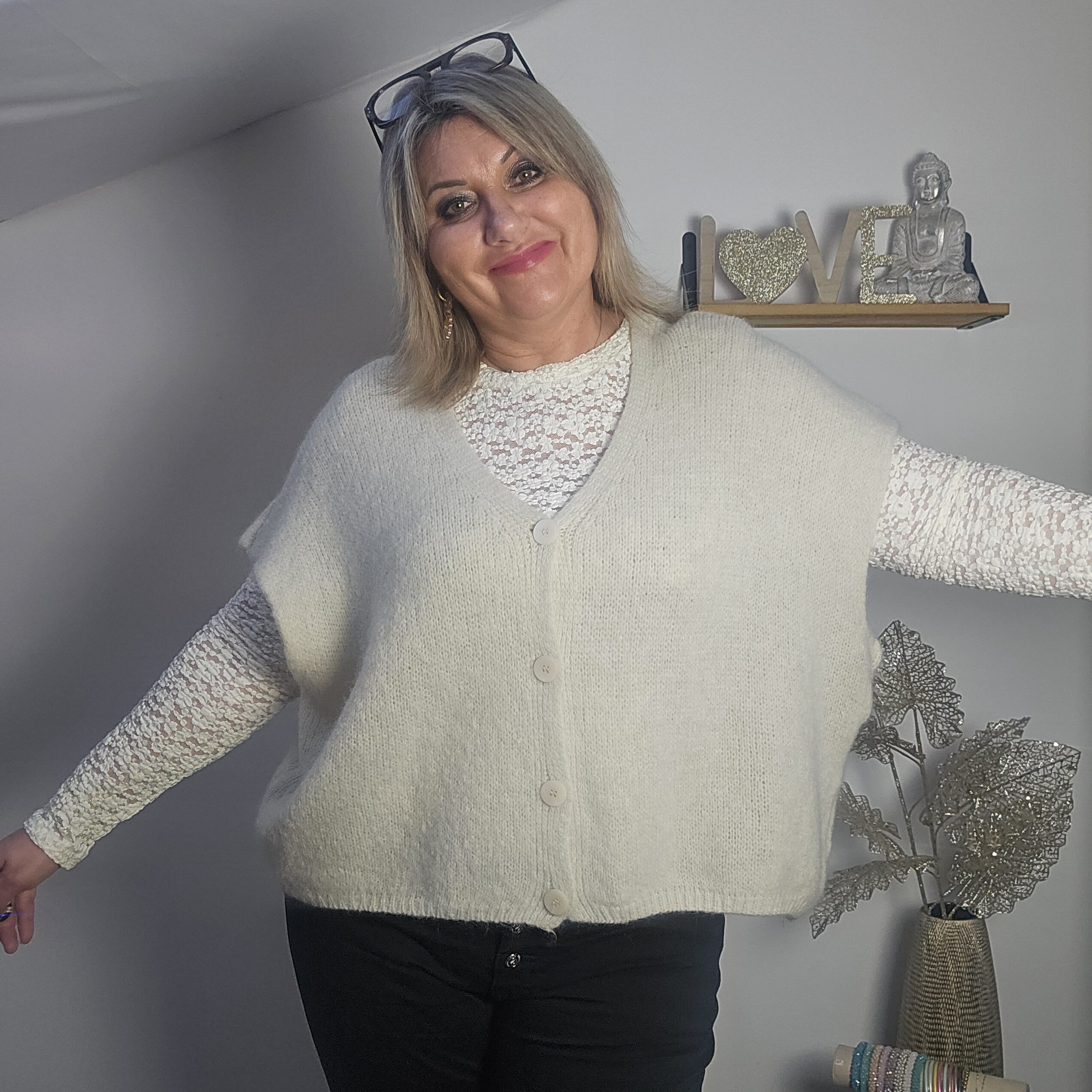 Mon regard pailleté : Gilet très doux, peut se porter avec un top dentelle à manches longues, ou une chemise, accompagné d’un pantalon, un jean’s ou une jupe, ou sur une robe.