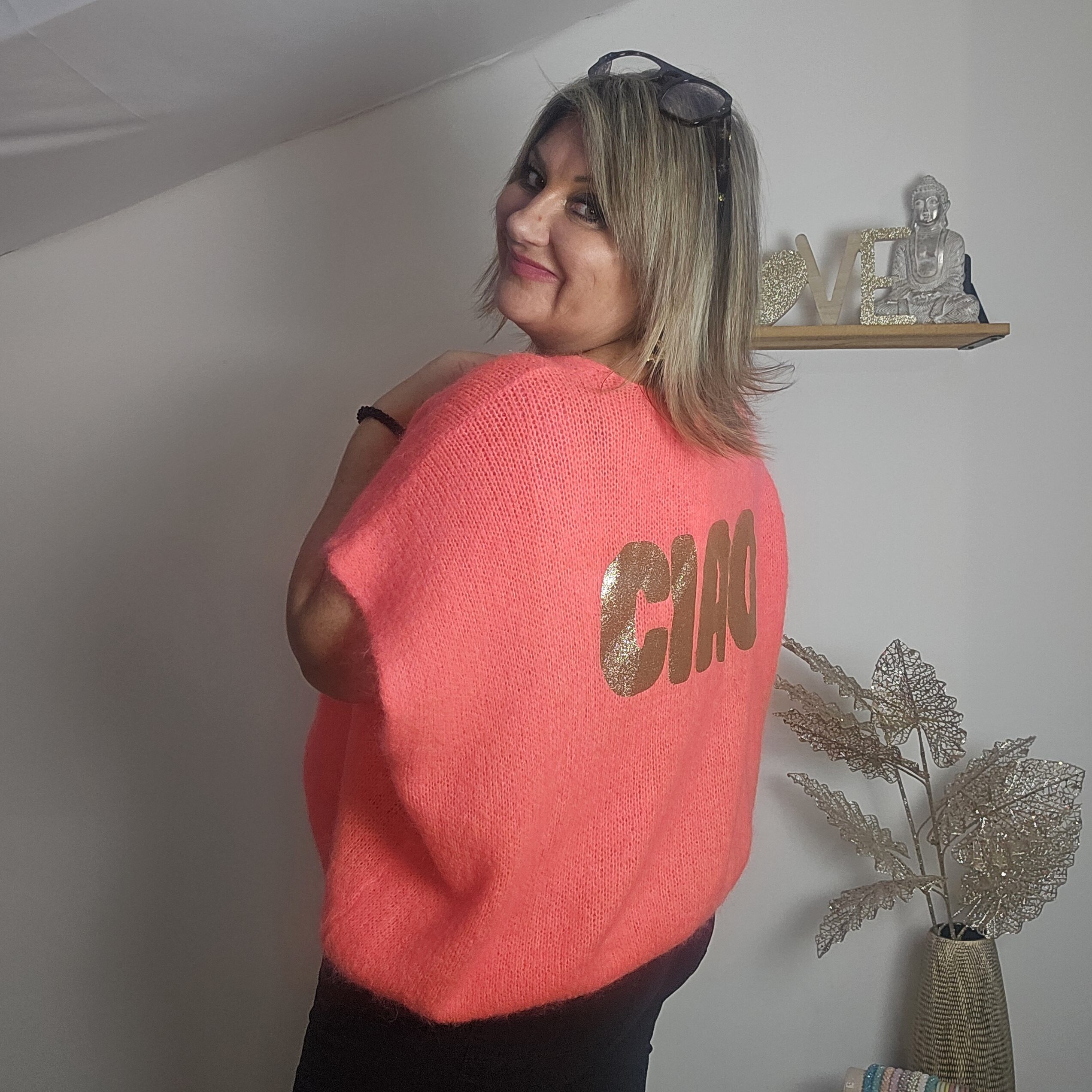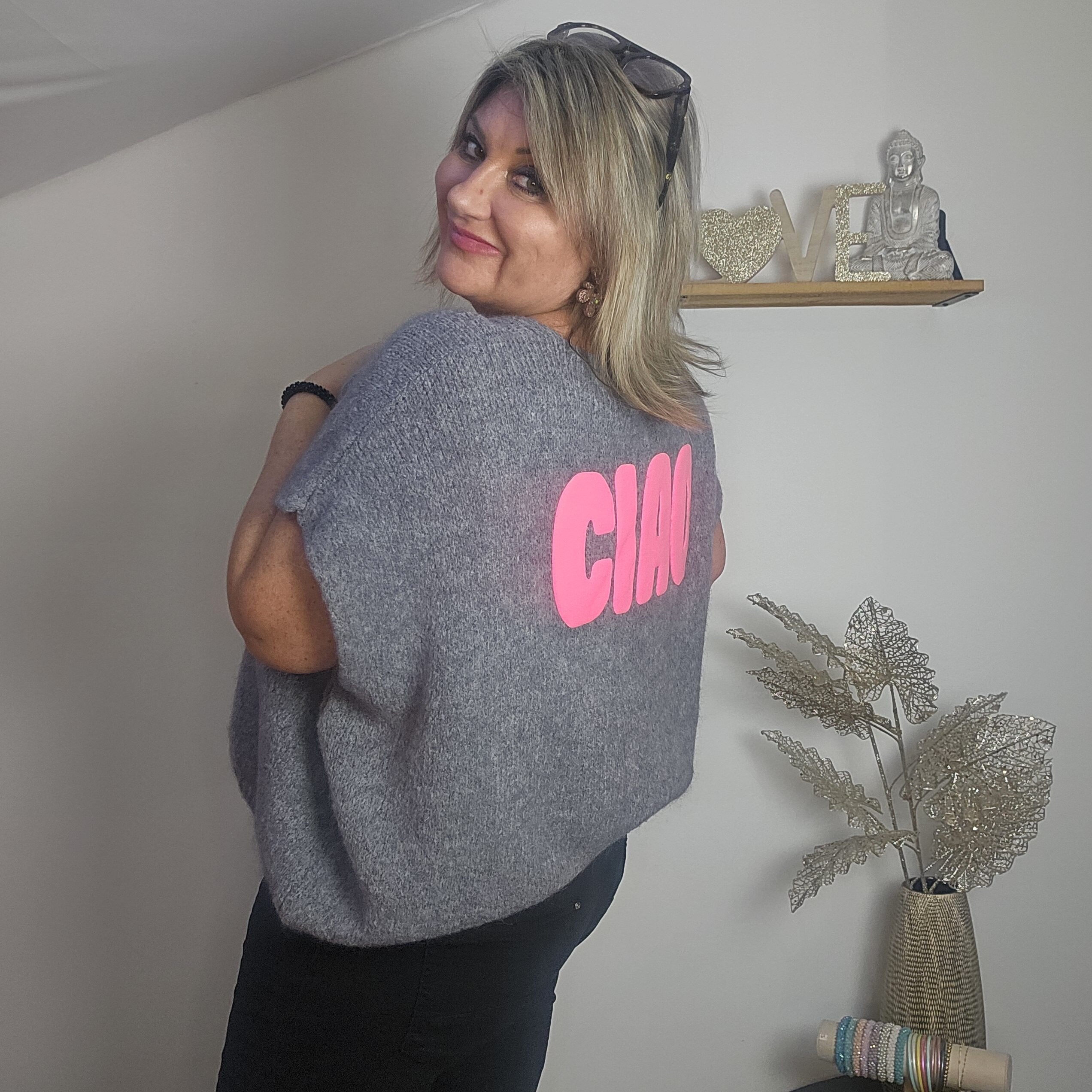 Gilet sans manches avec 4 boutons devant, au dos inscription CIAO en paillettes ou fluo, chaud et très doux, ne pique absolument pas ! Existe en beige/doré, corail/doré, gris/rose fluo, kaki/jaune fluo, prune/doré.