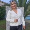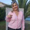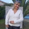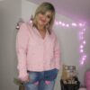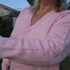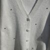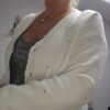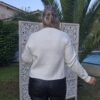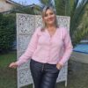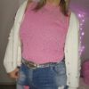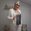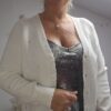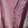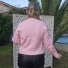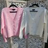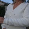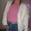Gilet avec amas de petits sequins, col et bouts des manches ondulées, existe en beige et rose bébé. TU.