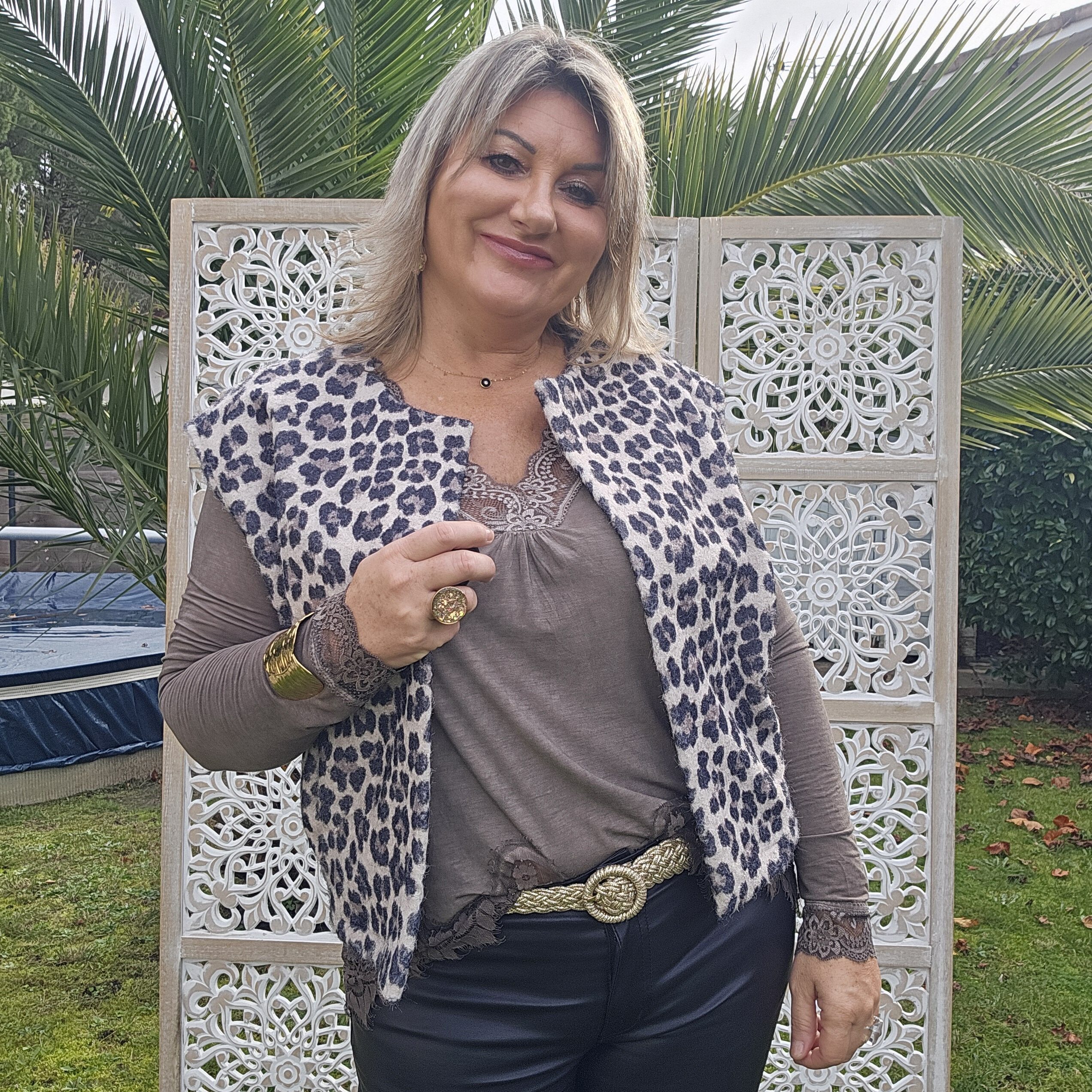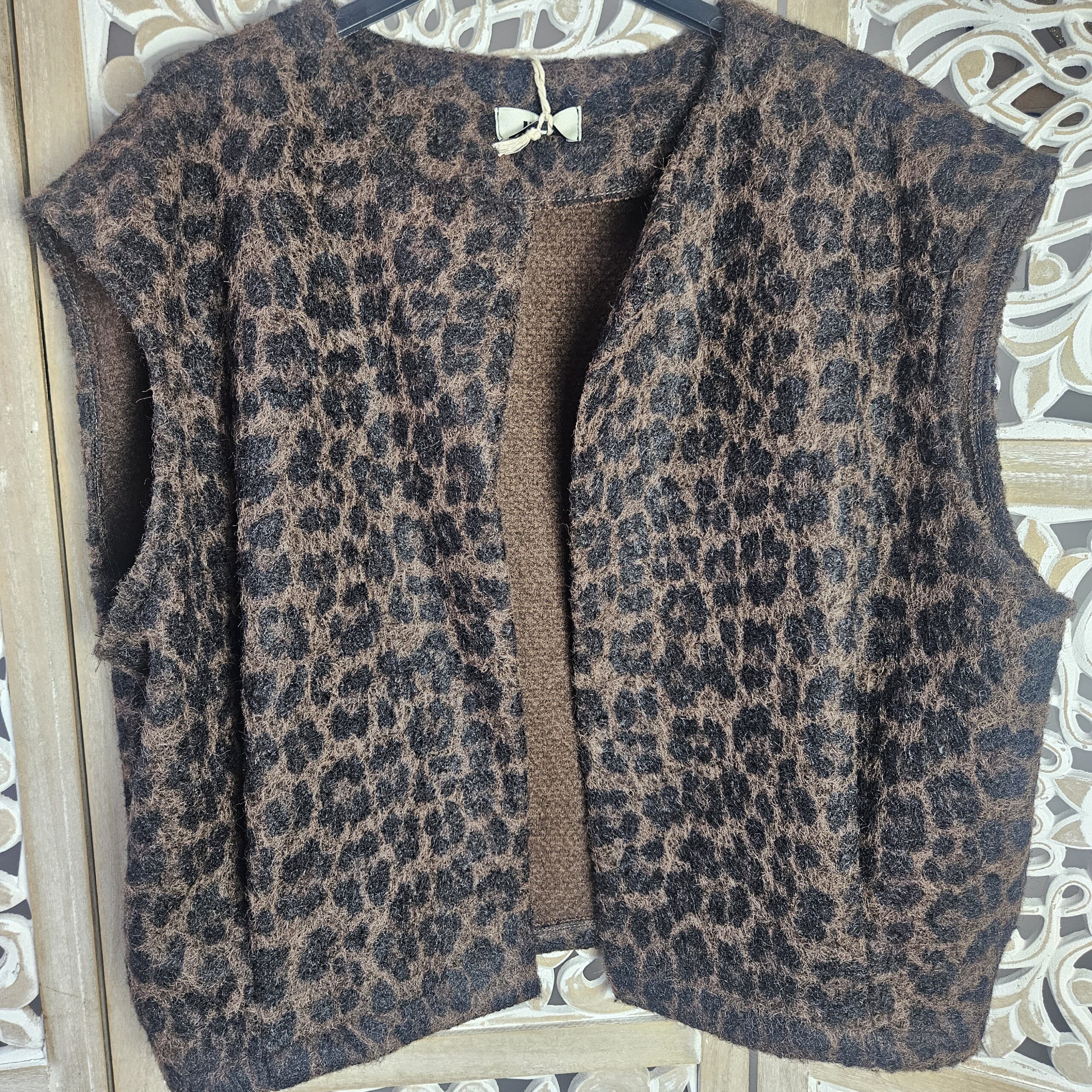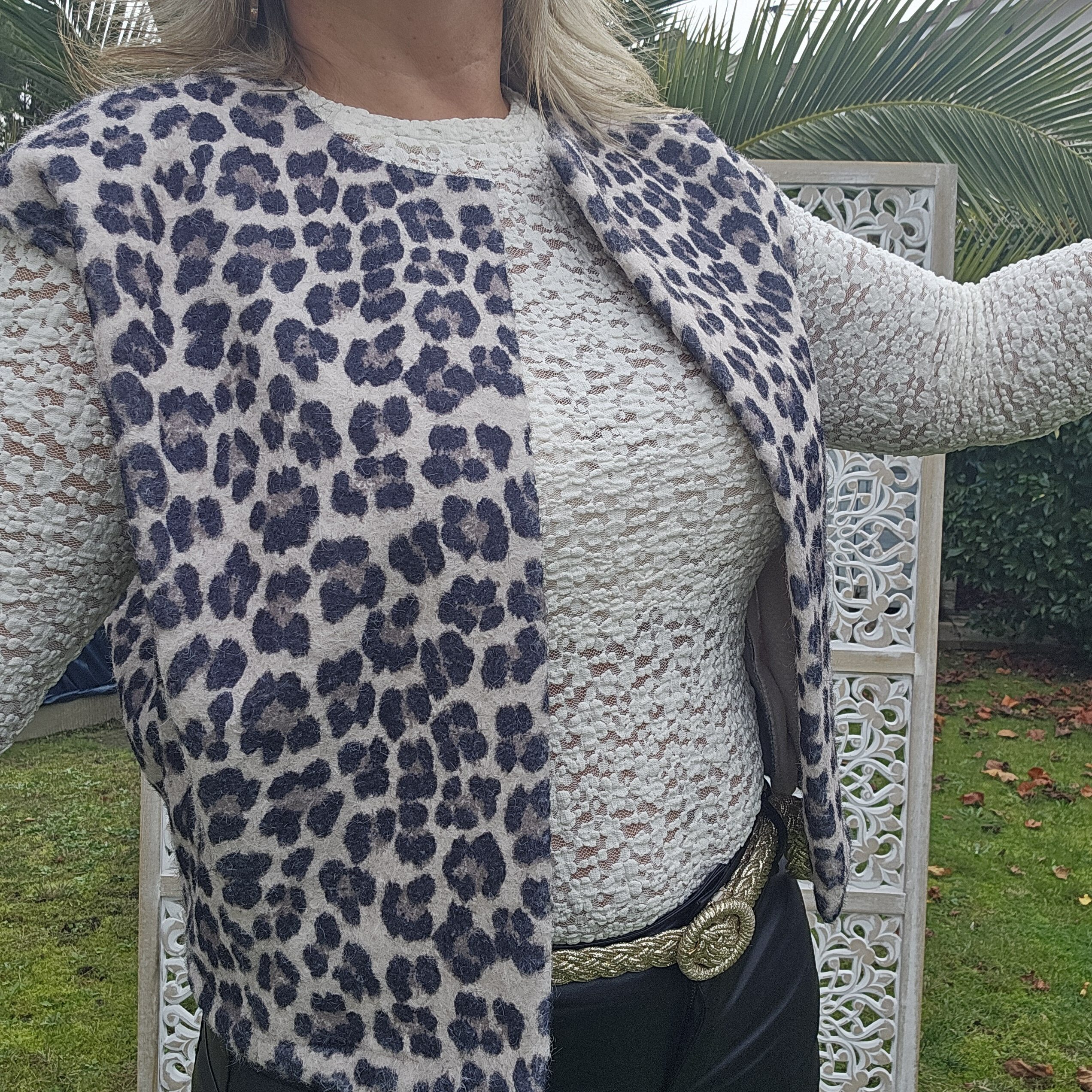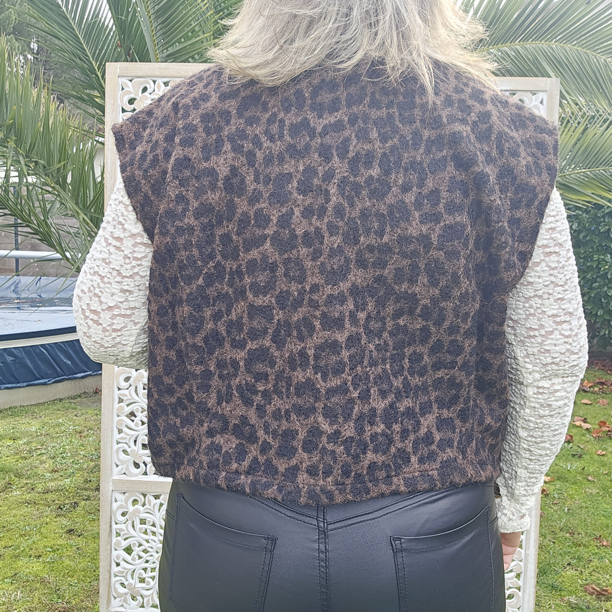 Gilet cintré à la taille sans manches léopard, chaud et très doux aspect laine bouillie (étiquette 100% Polyester), ne pique absolument pas ! Poches sur les côtés.