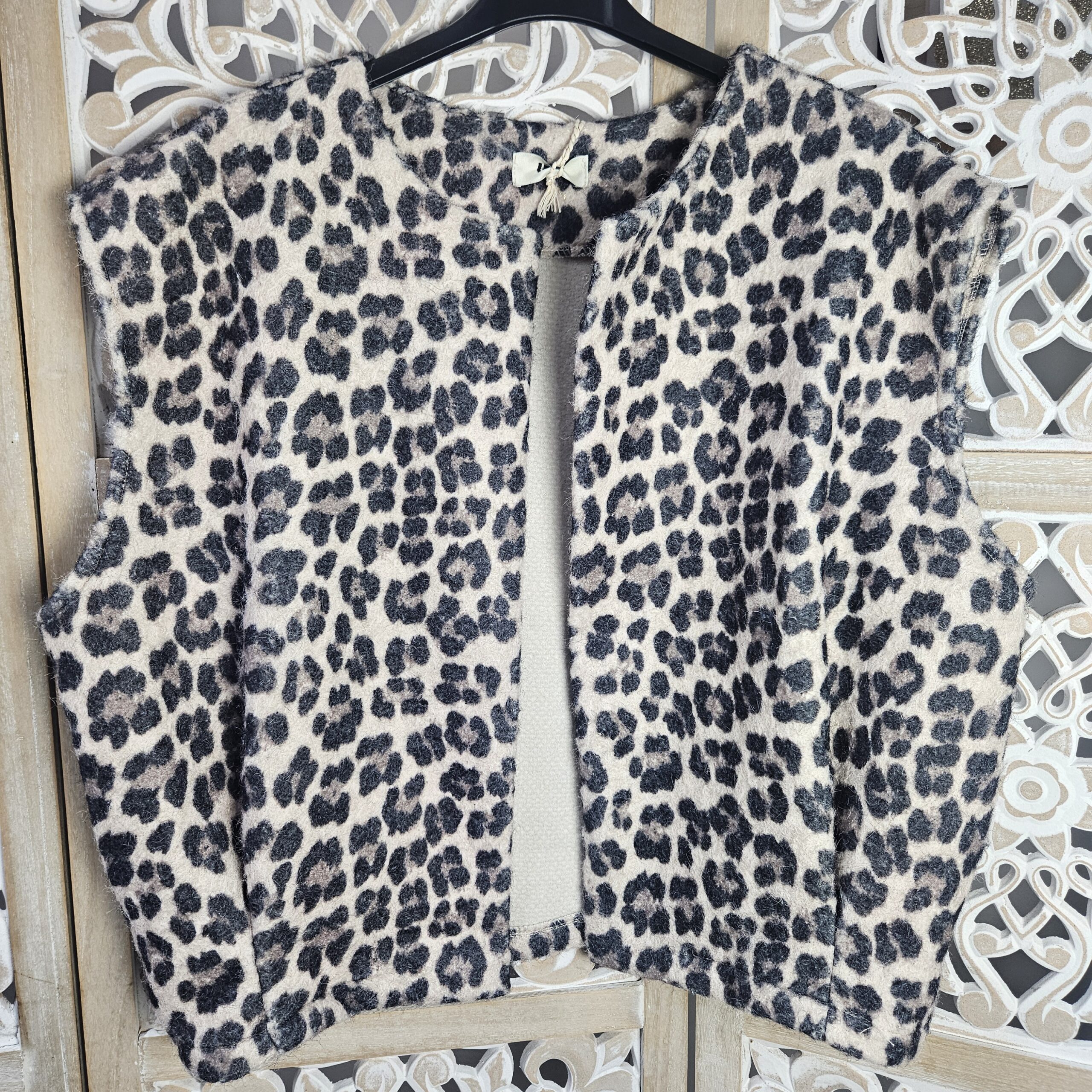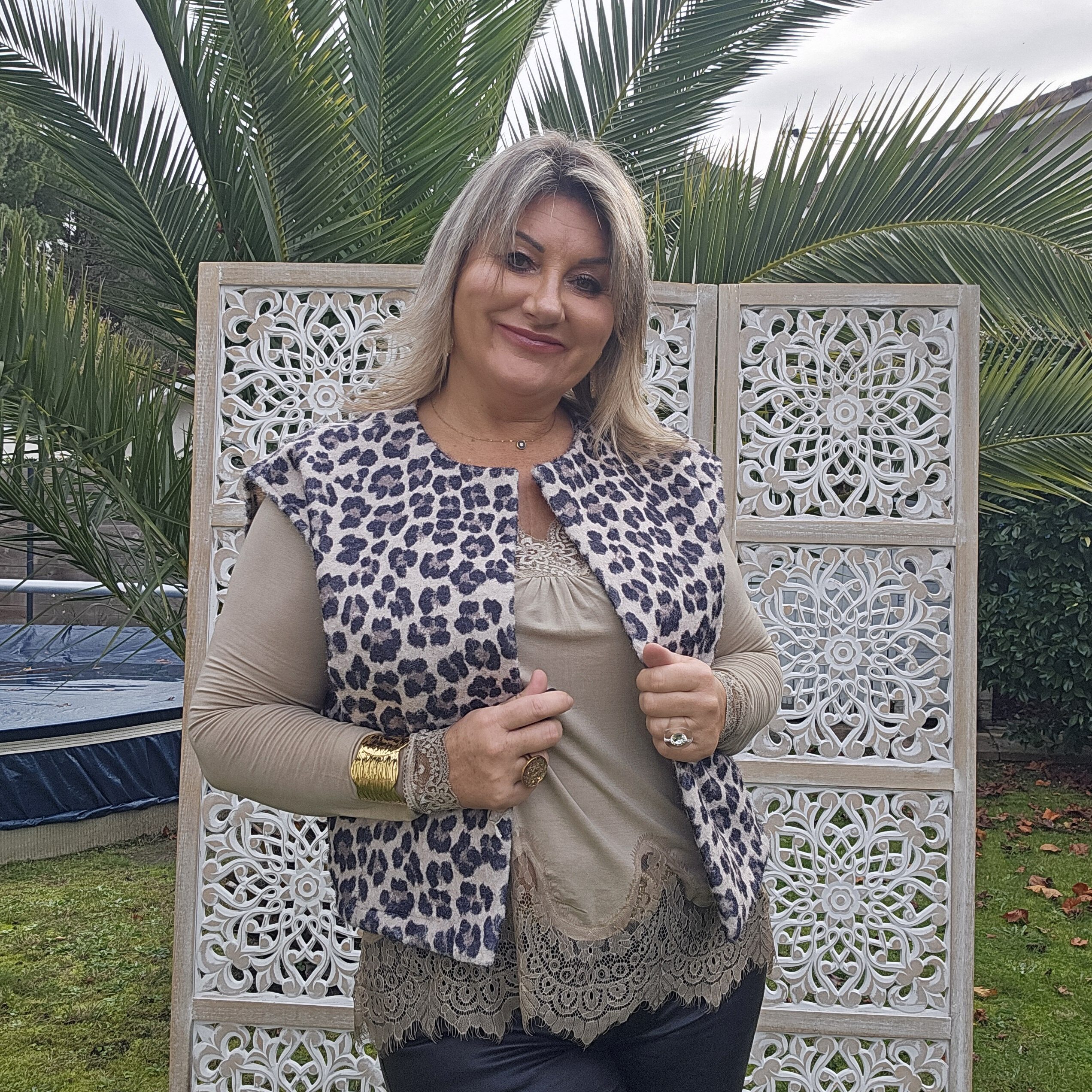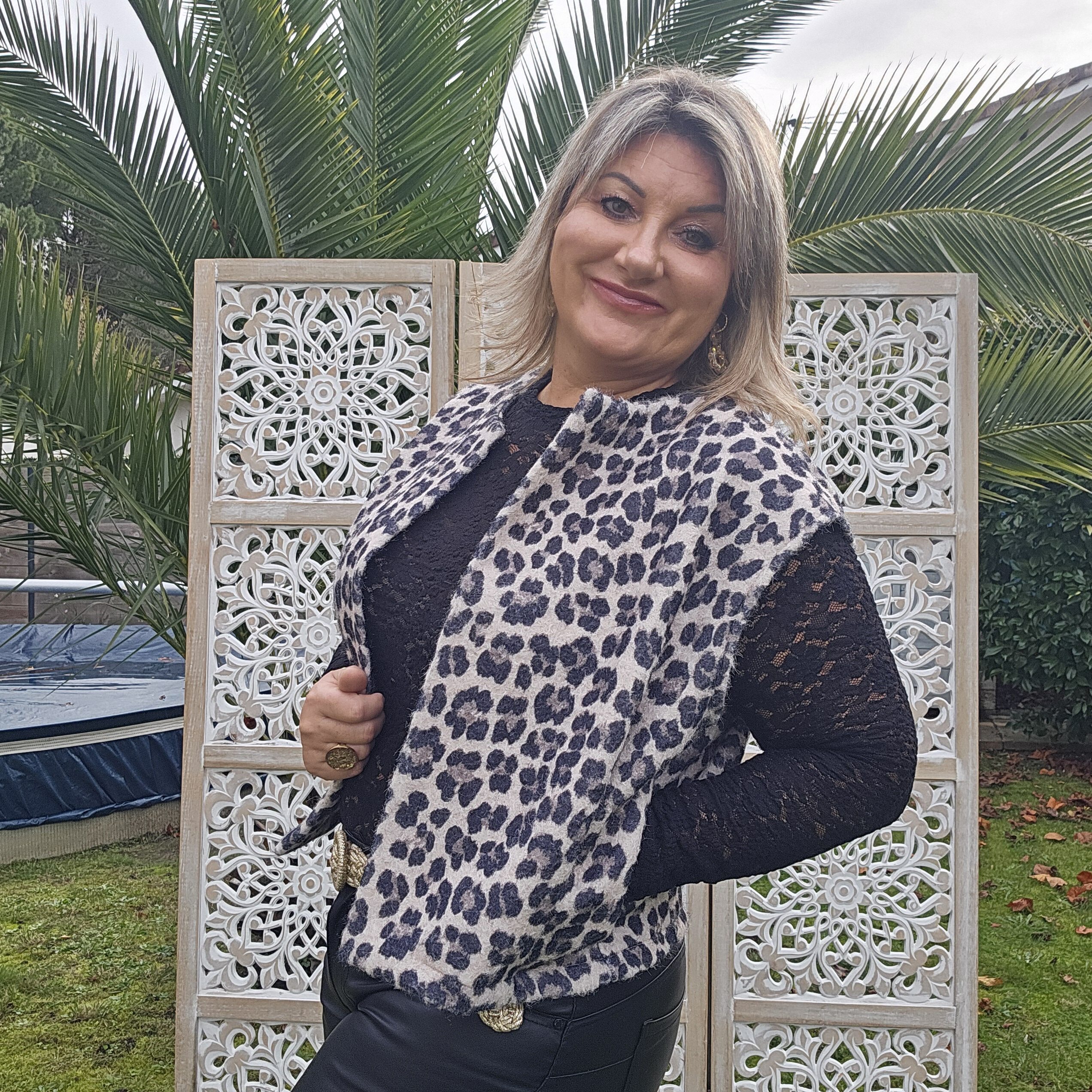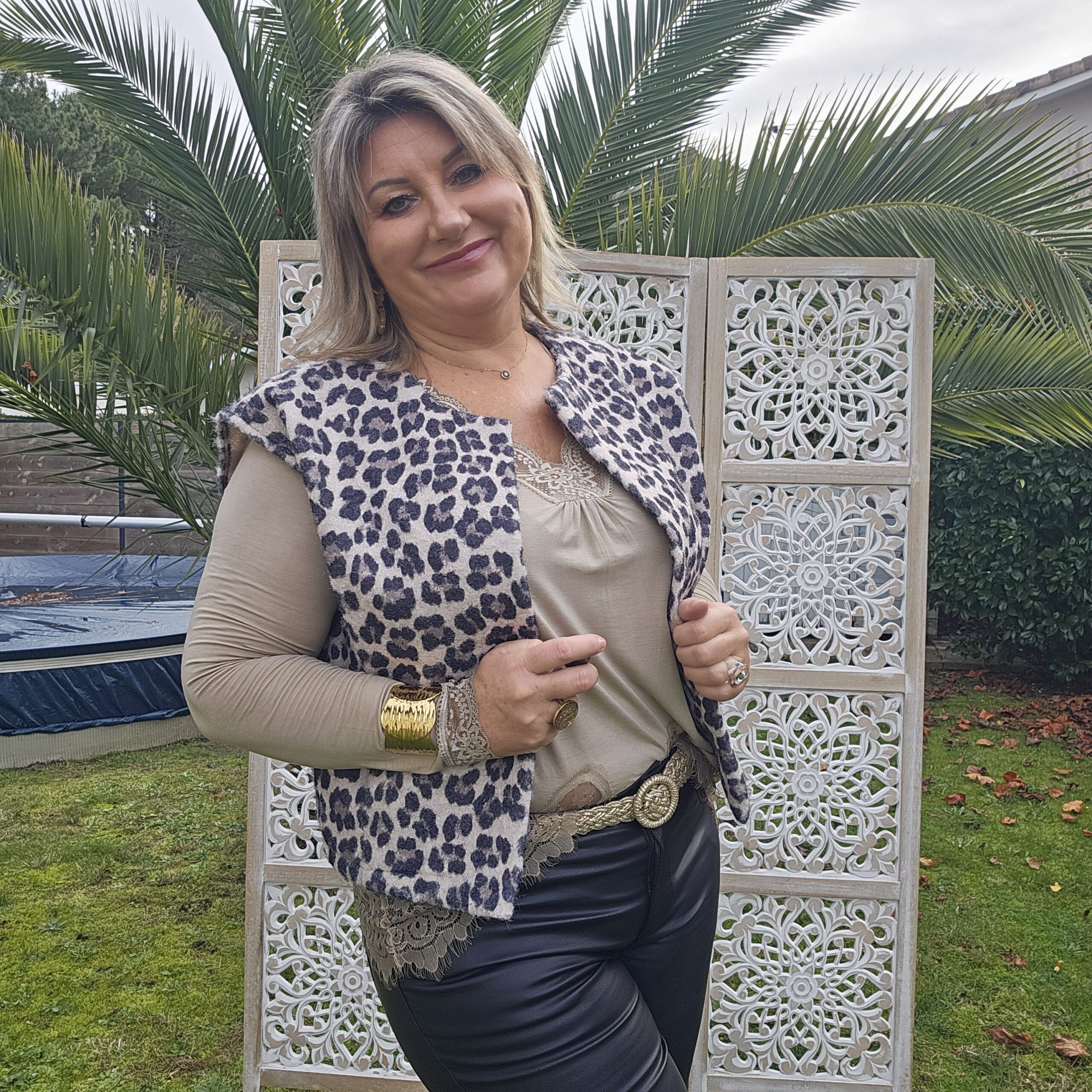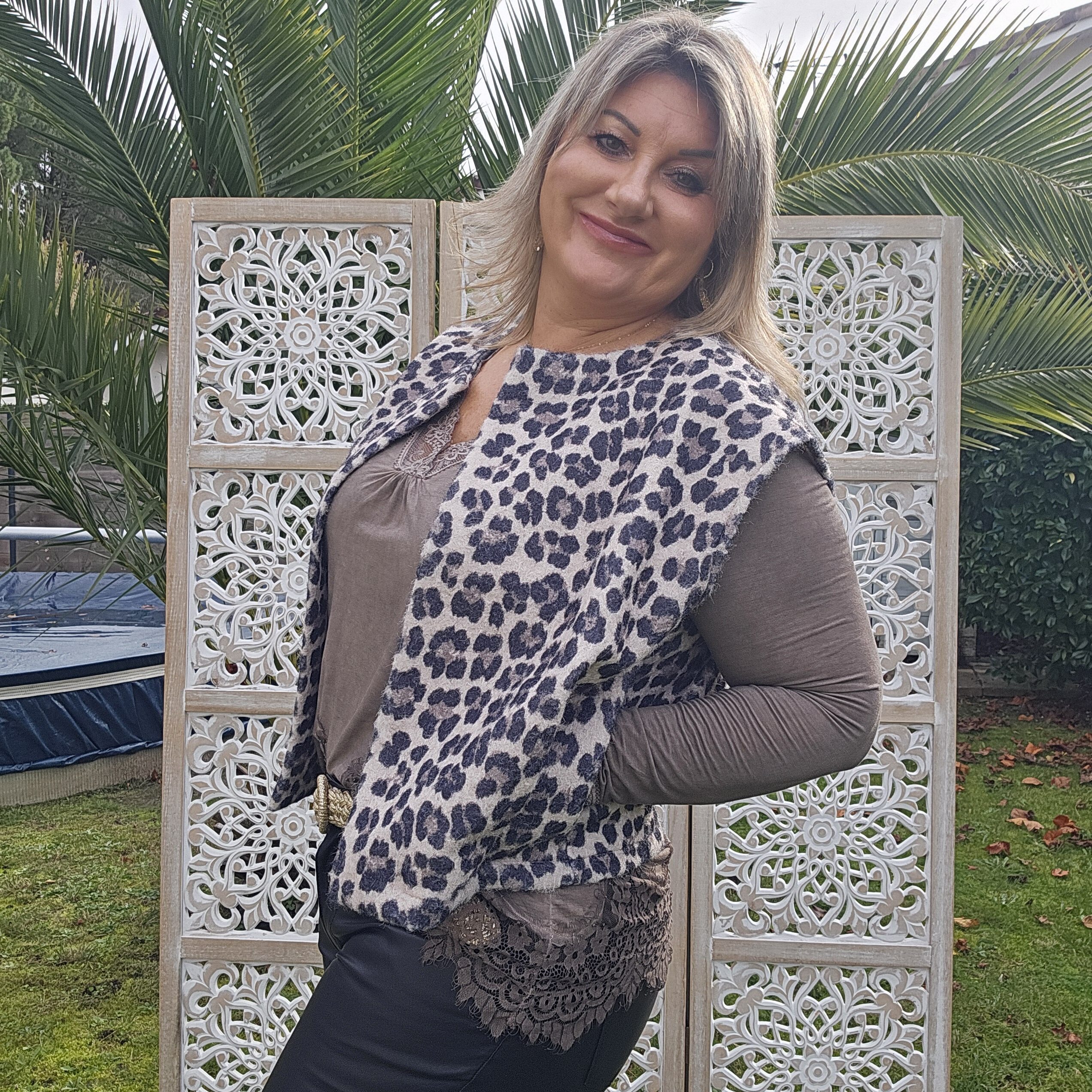 Gilet cintré à la taille sans manches léopard, chaud et très doux aspect laine bouillie (étiquette 100% Polyester), ne pique absolument pas ! Poches sur les côtés.