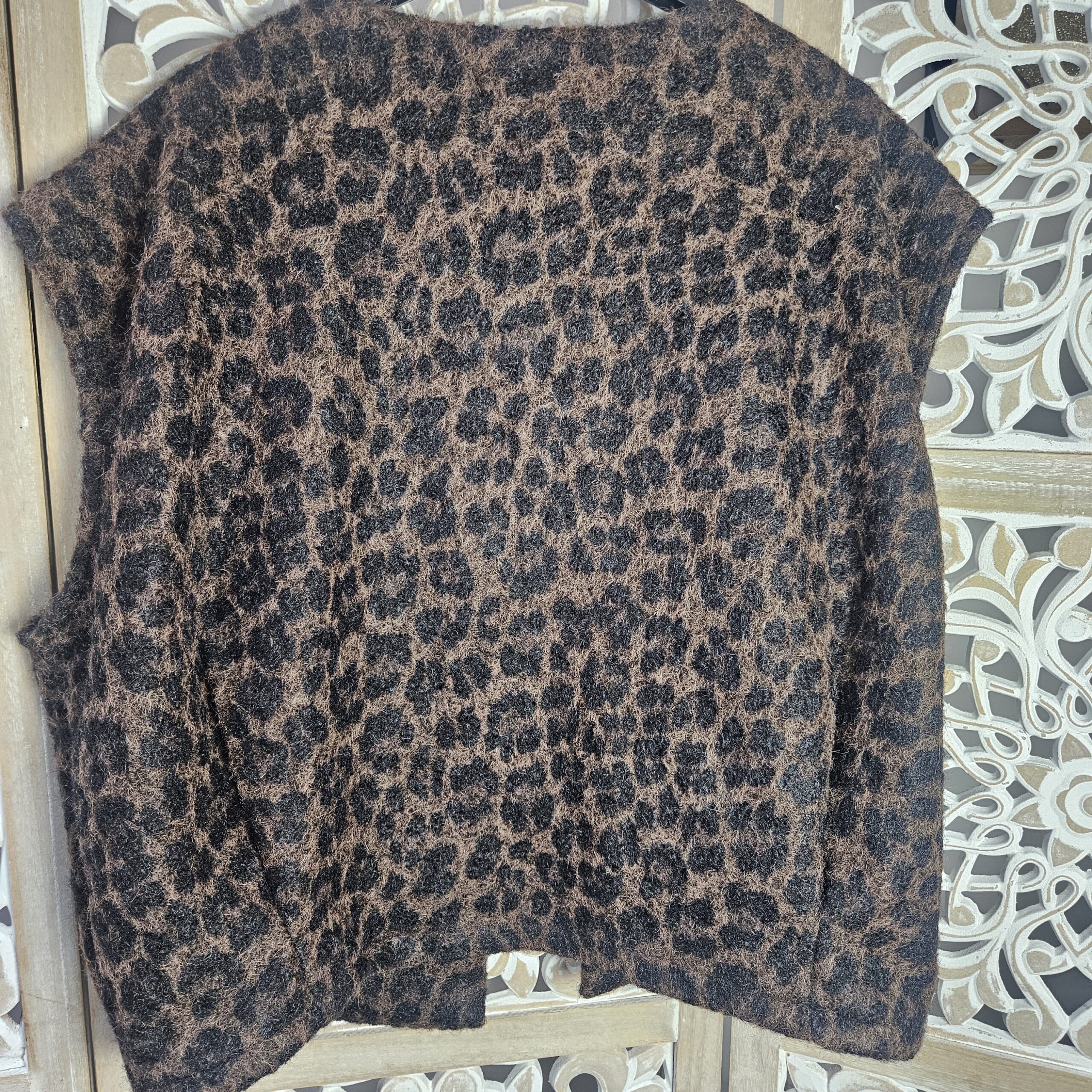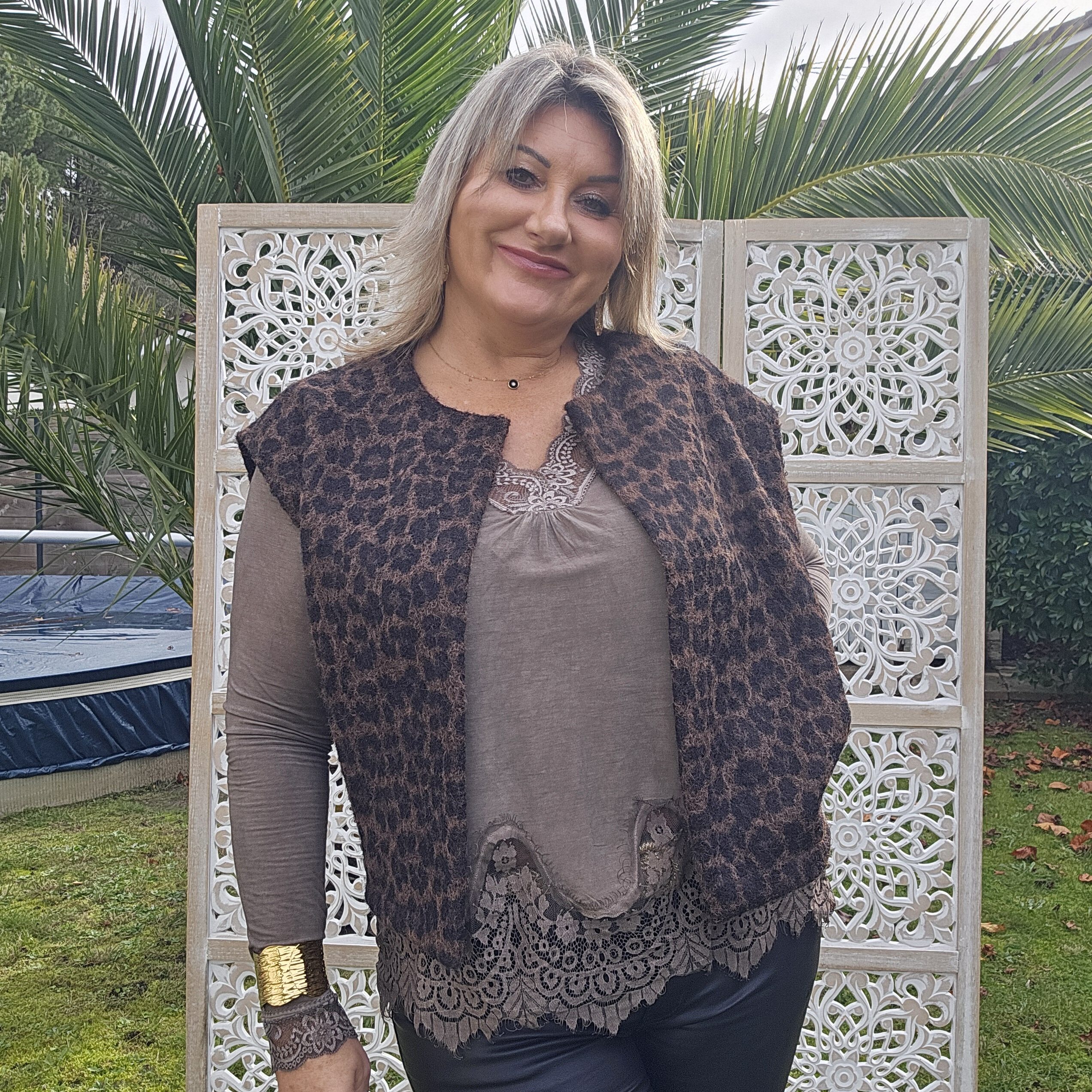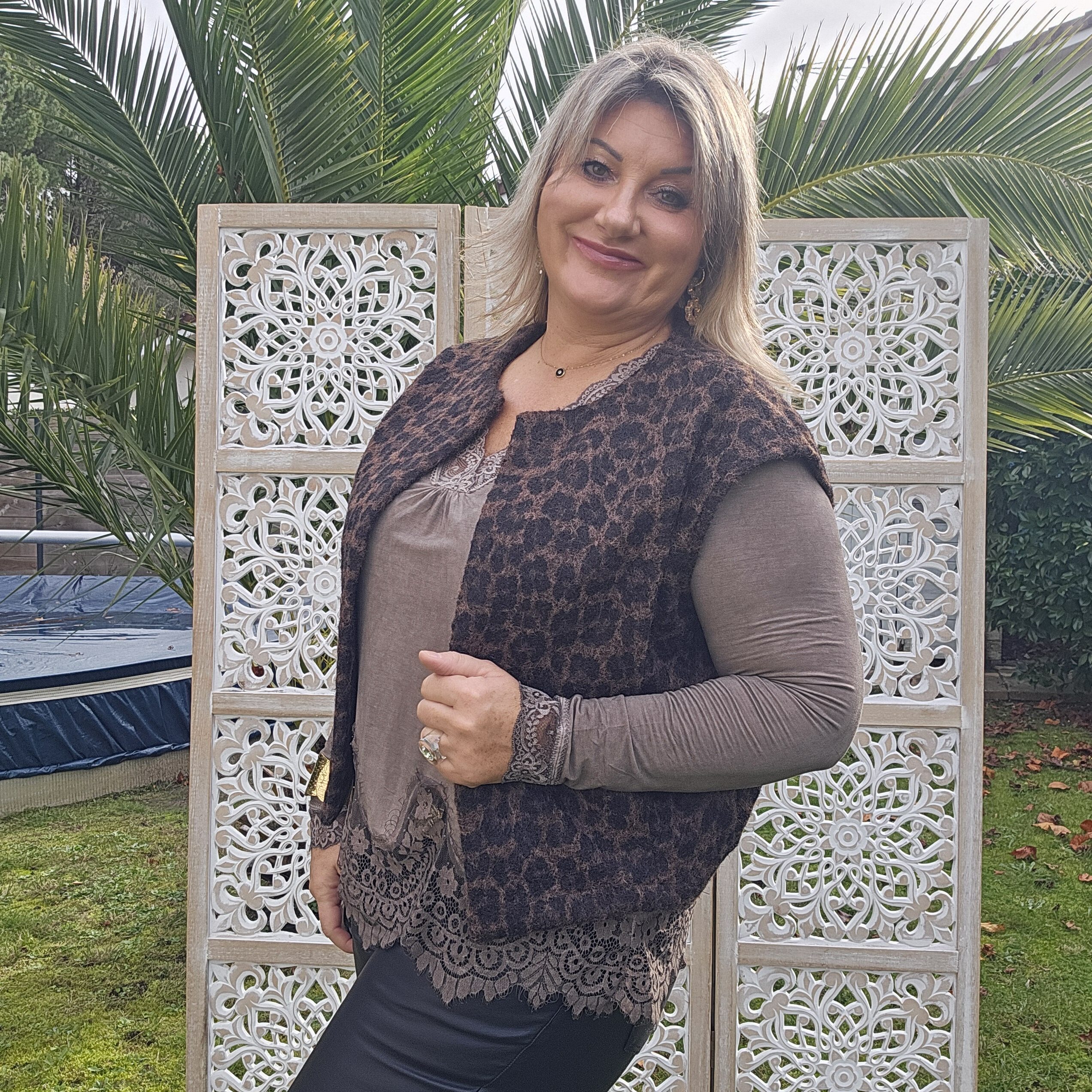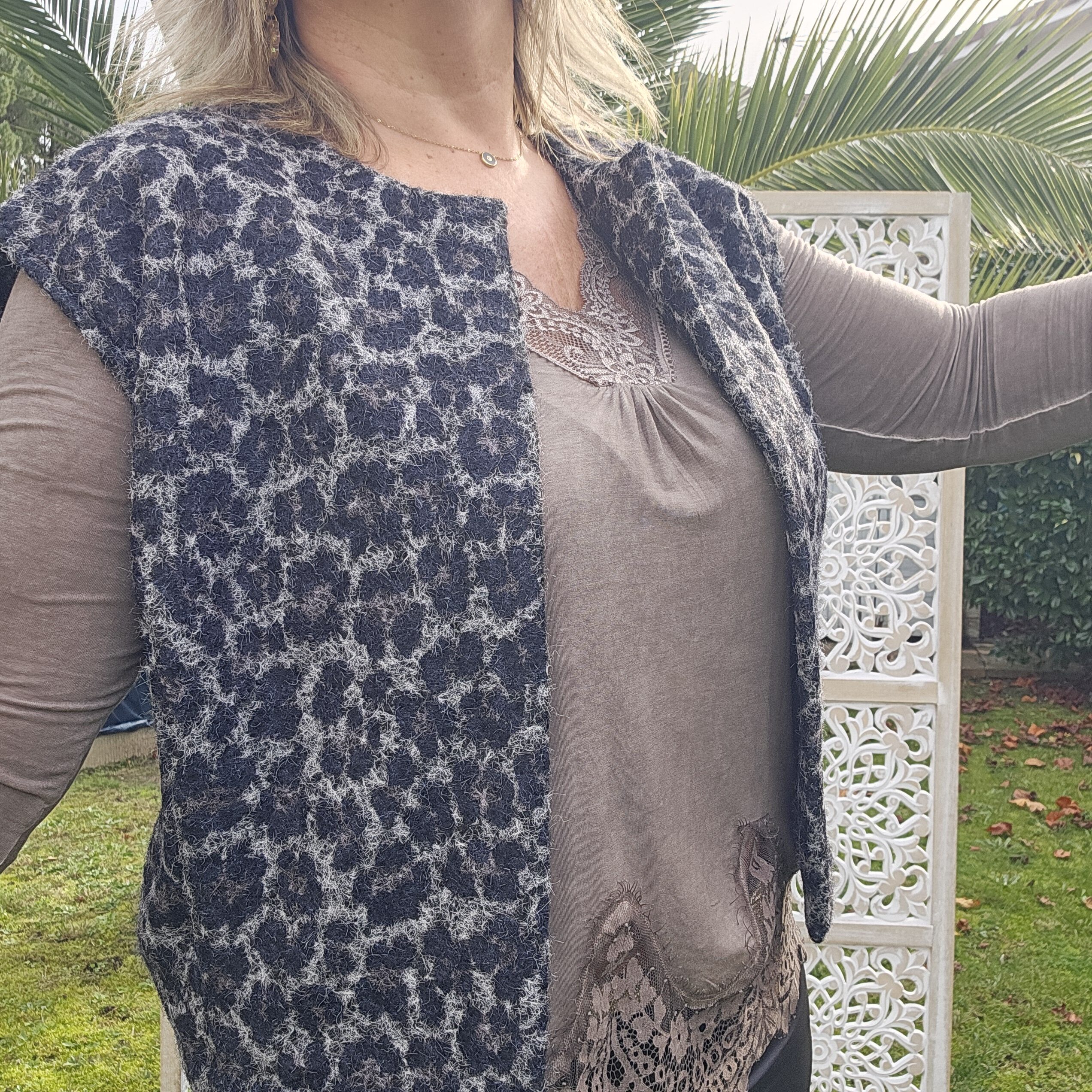 Gilet cintré à la taille sans manches léopard, chaud et très doux aspect laine bouillie (étiquette 100% Polyester), ne pique absolument pas ! Poches sur les côtés.