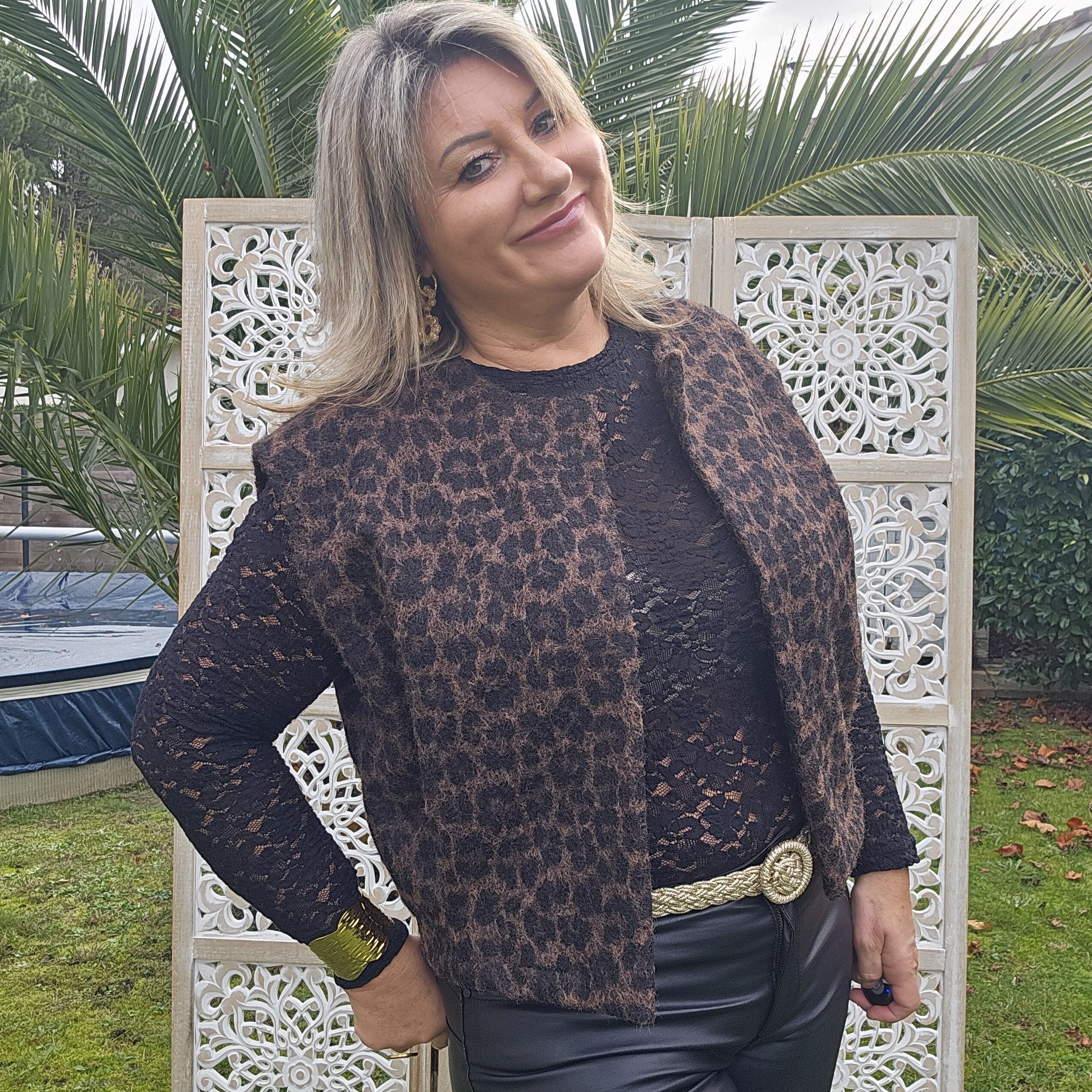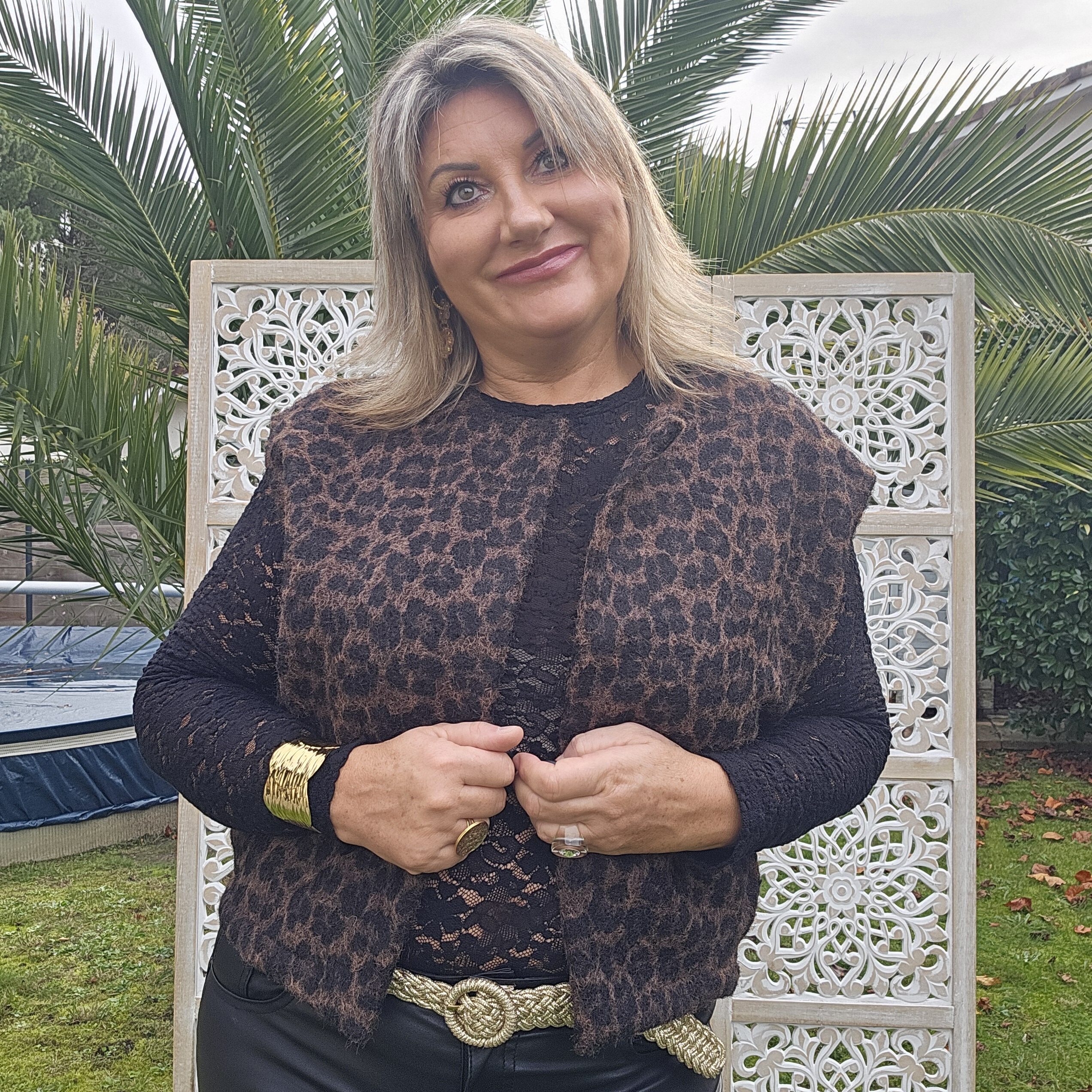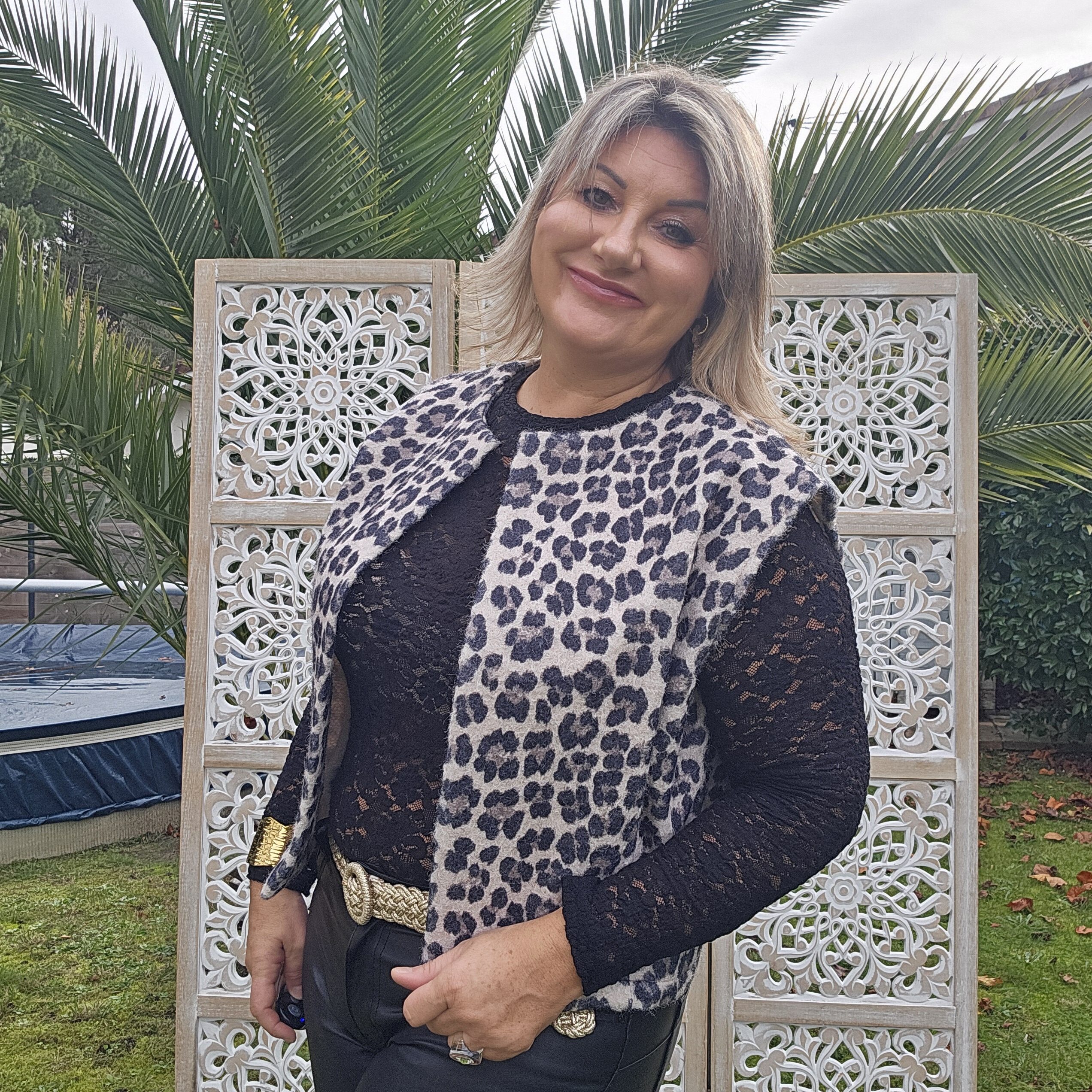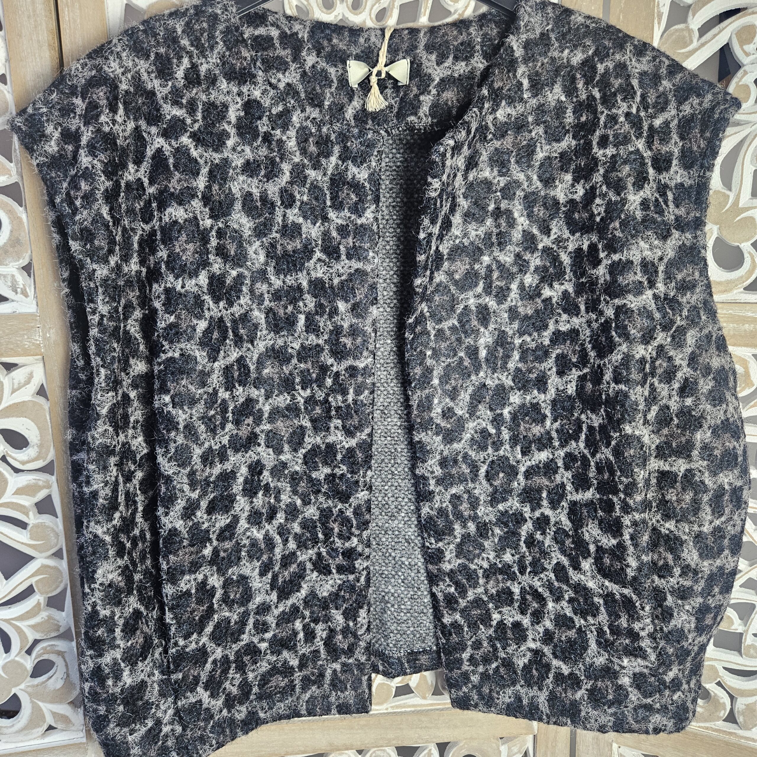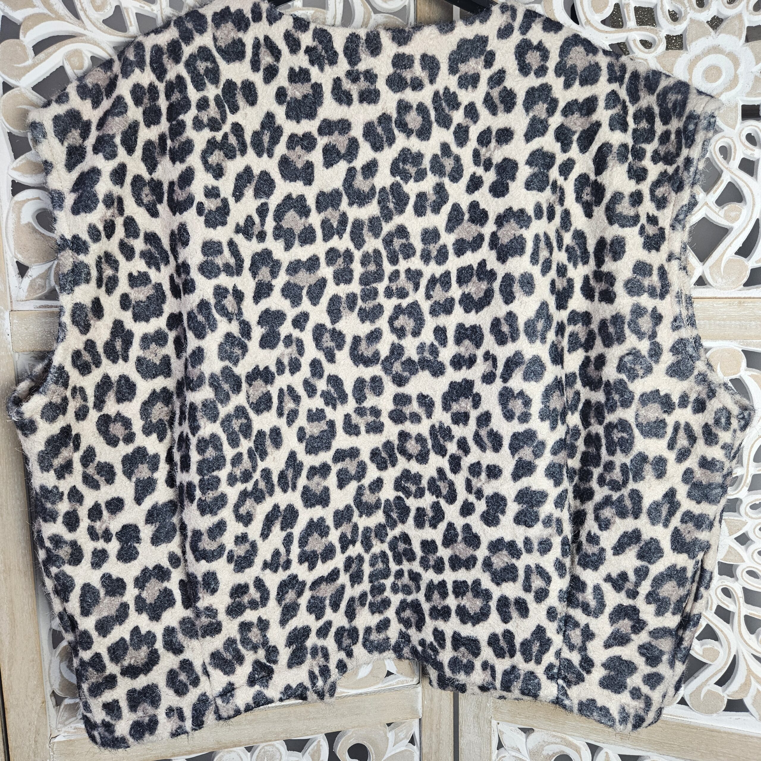 Gilet cintré à la taille sans manches léopard, chaud et très doux aspect laine bouillie (étiquette 100% Polyester), ne pique absolument pas ! Poches sur les côtés.