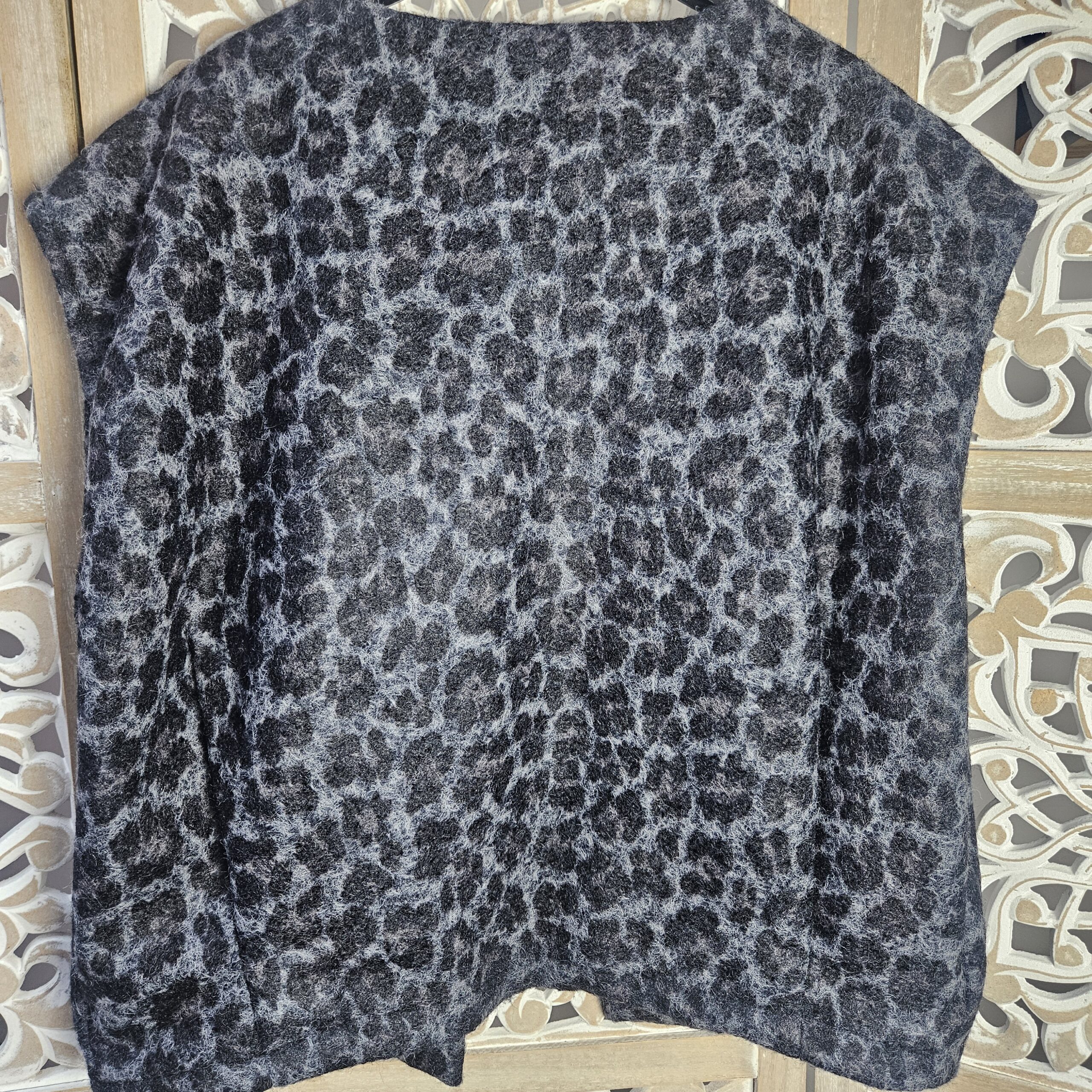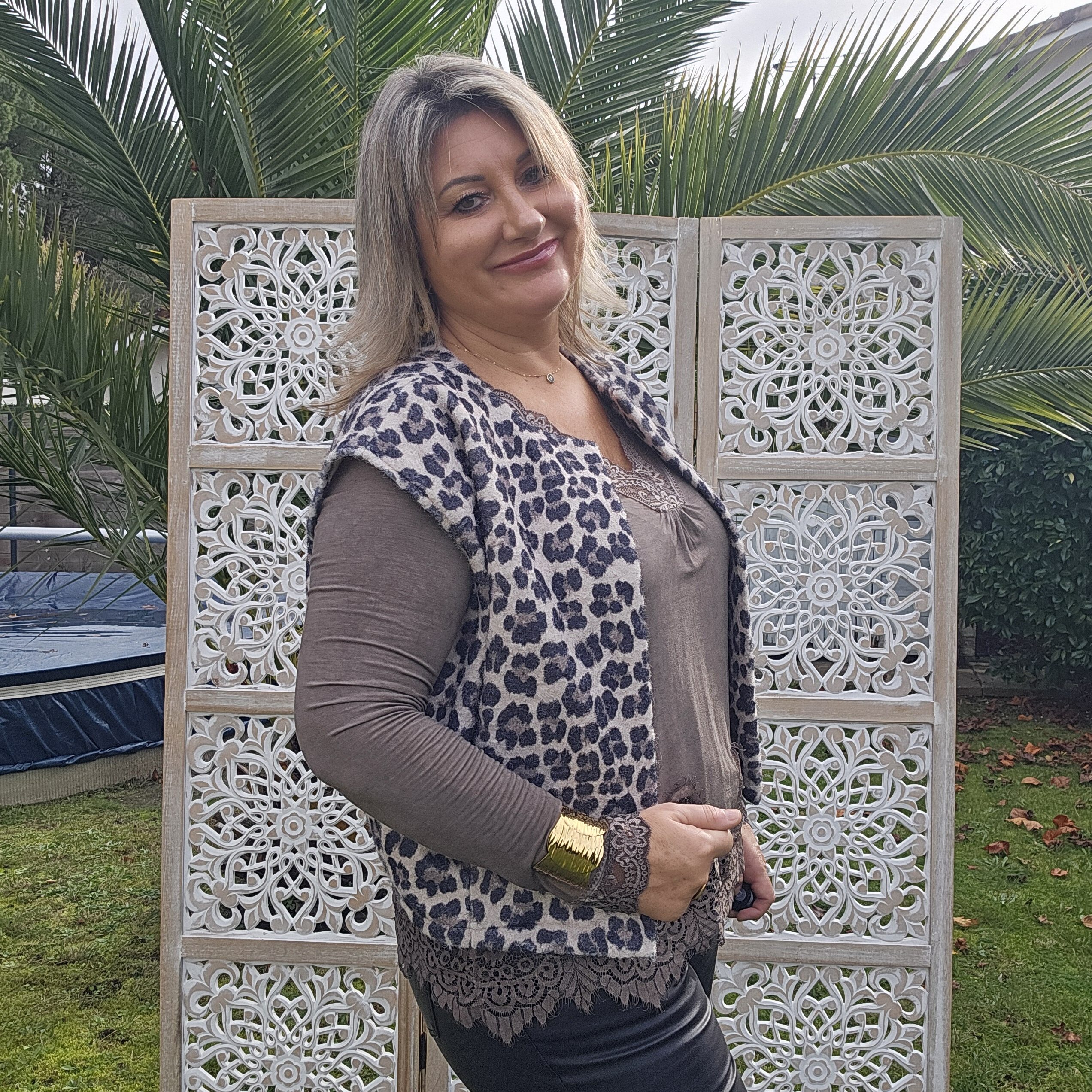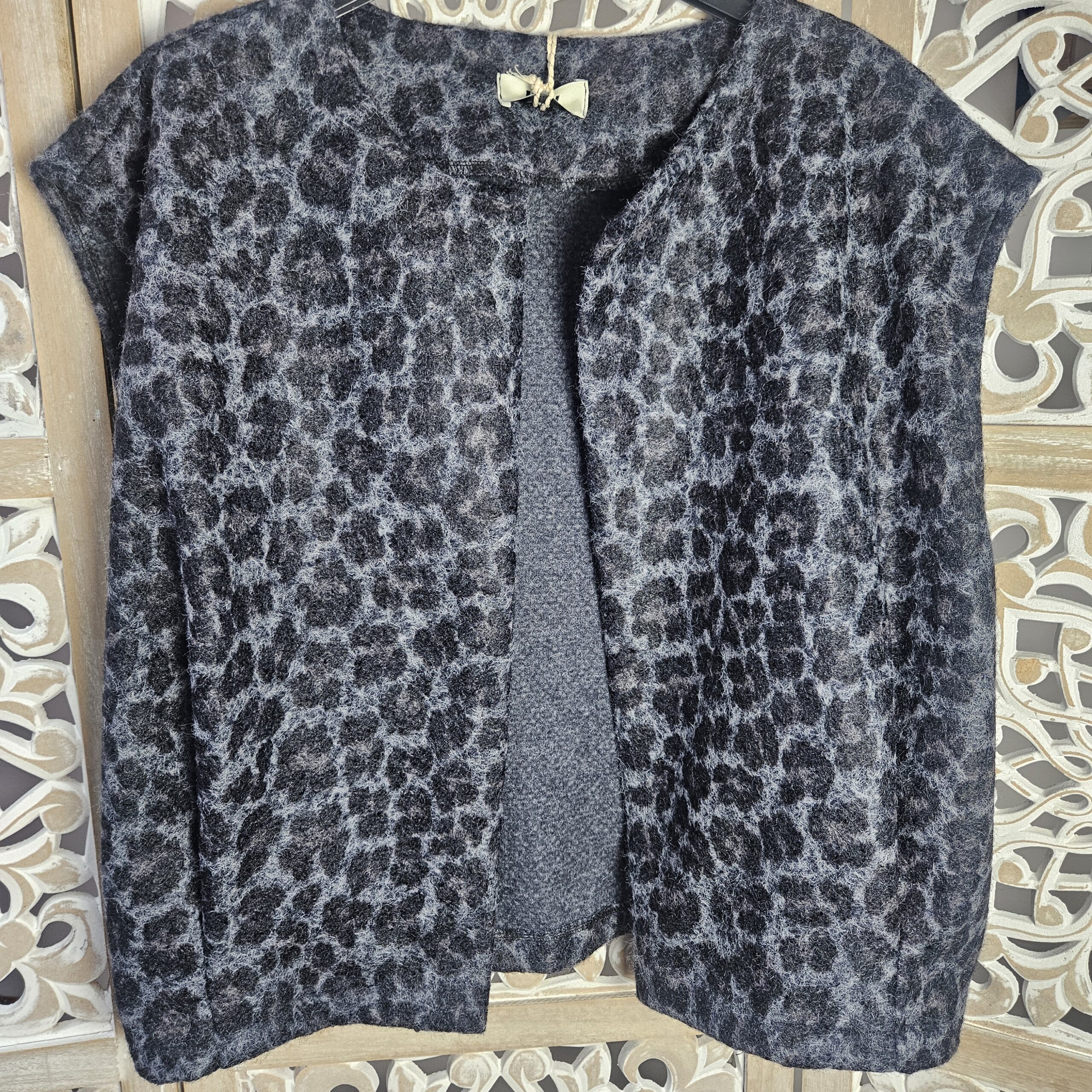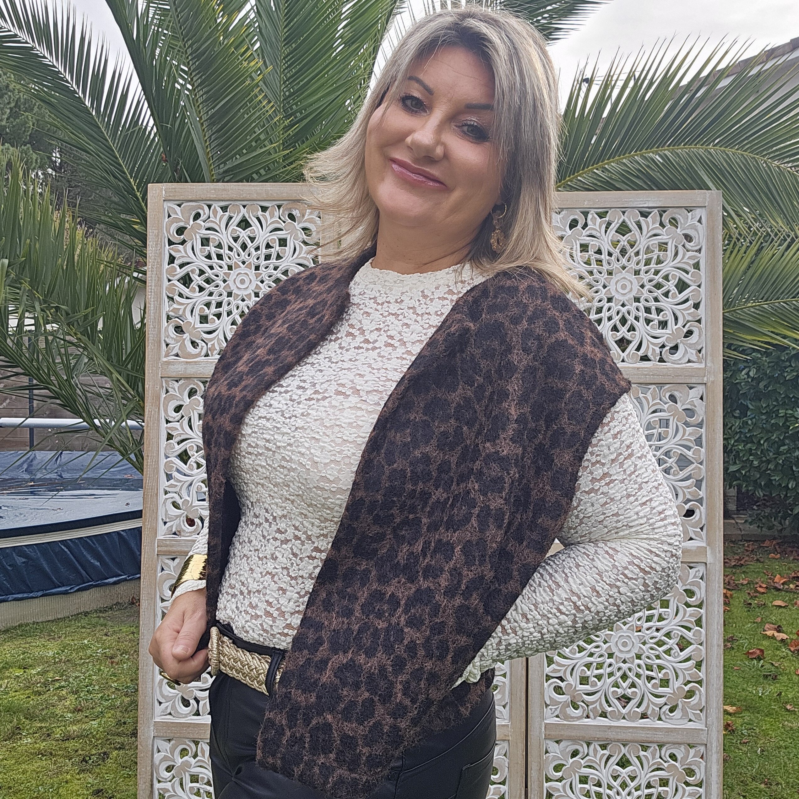 Gilet cintré à la taille sans manches léopard, chaud et très doux aspect laine bouillie (étiquette 100% Polyester), ne pique absolument pas ! Poches sur les côtés.