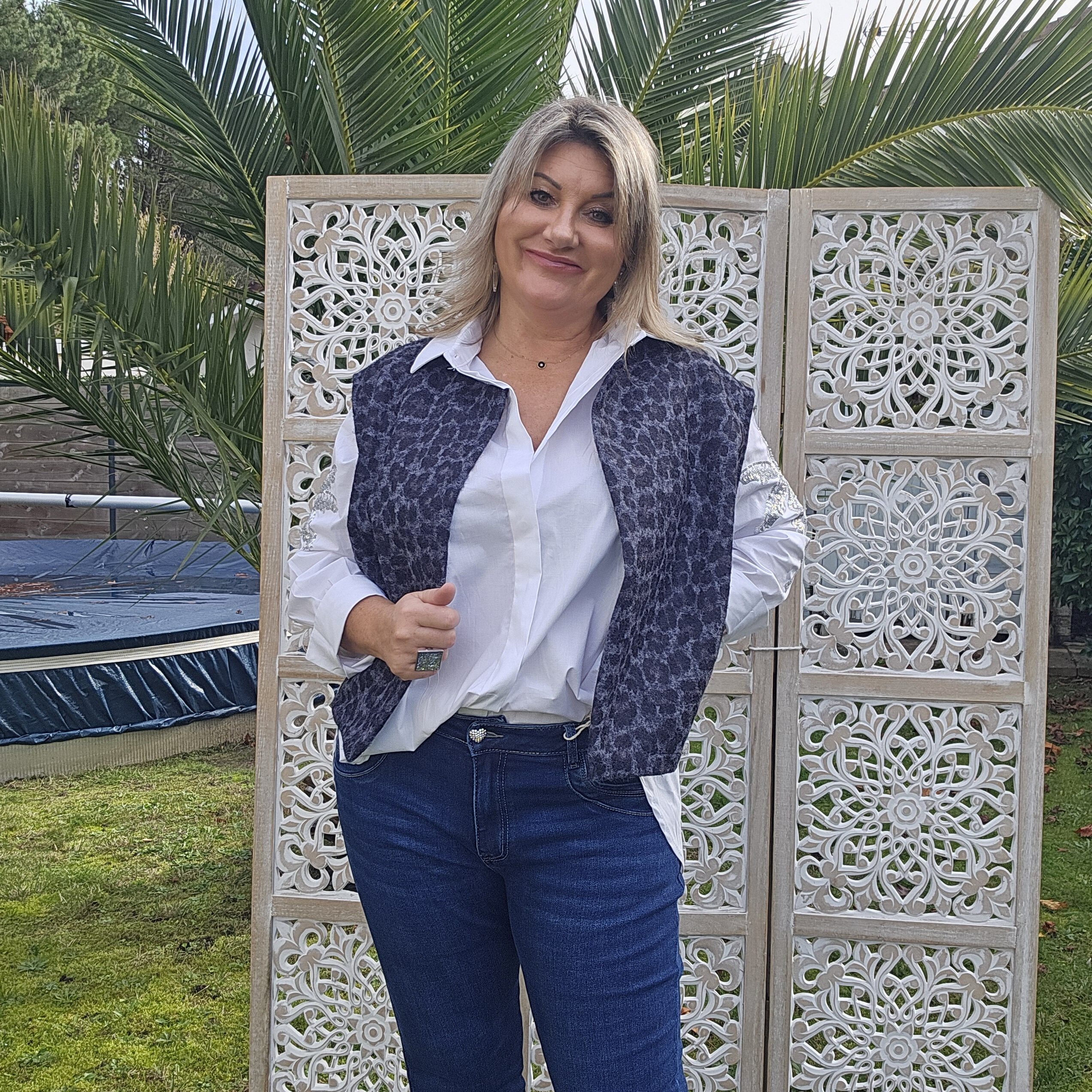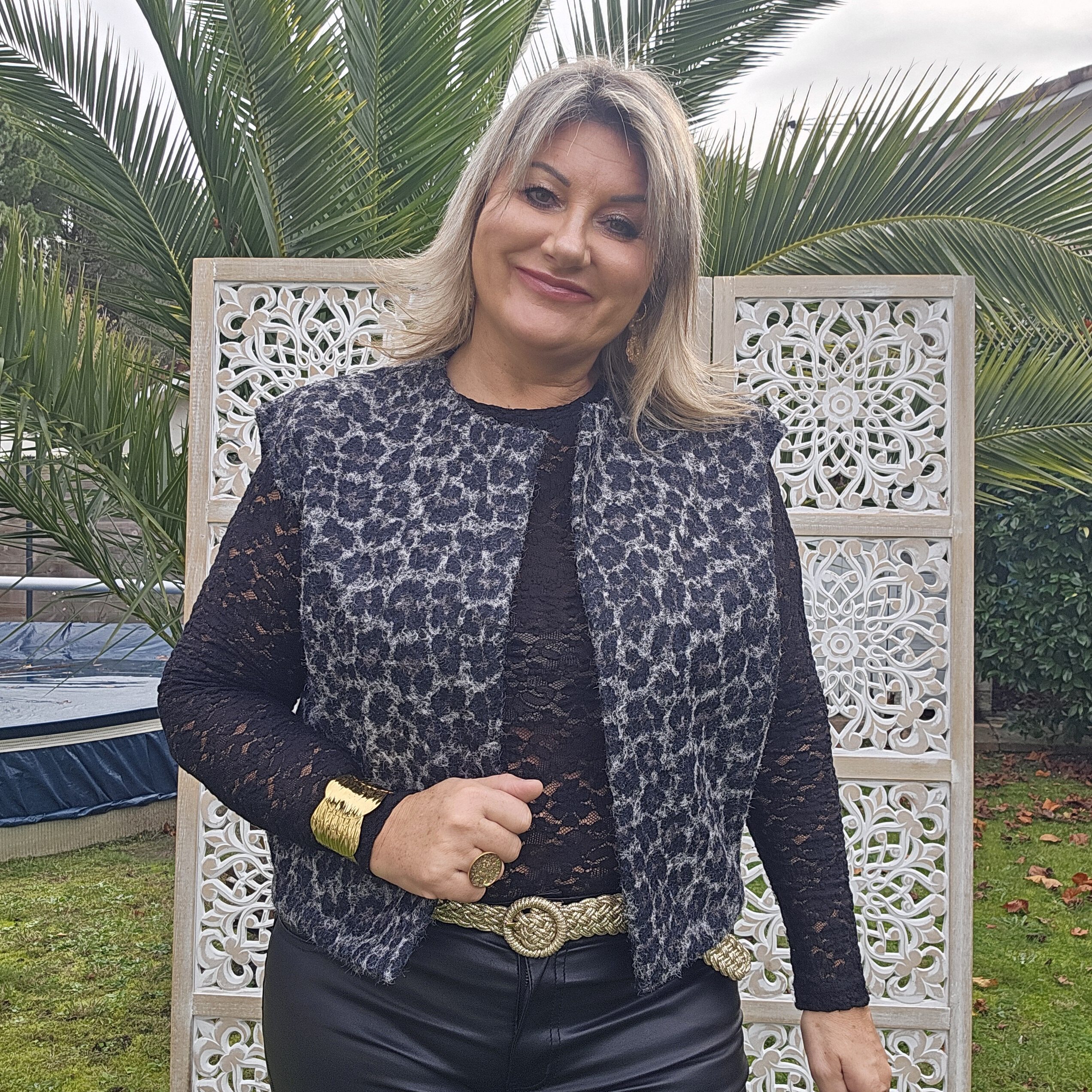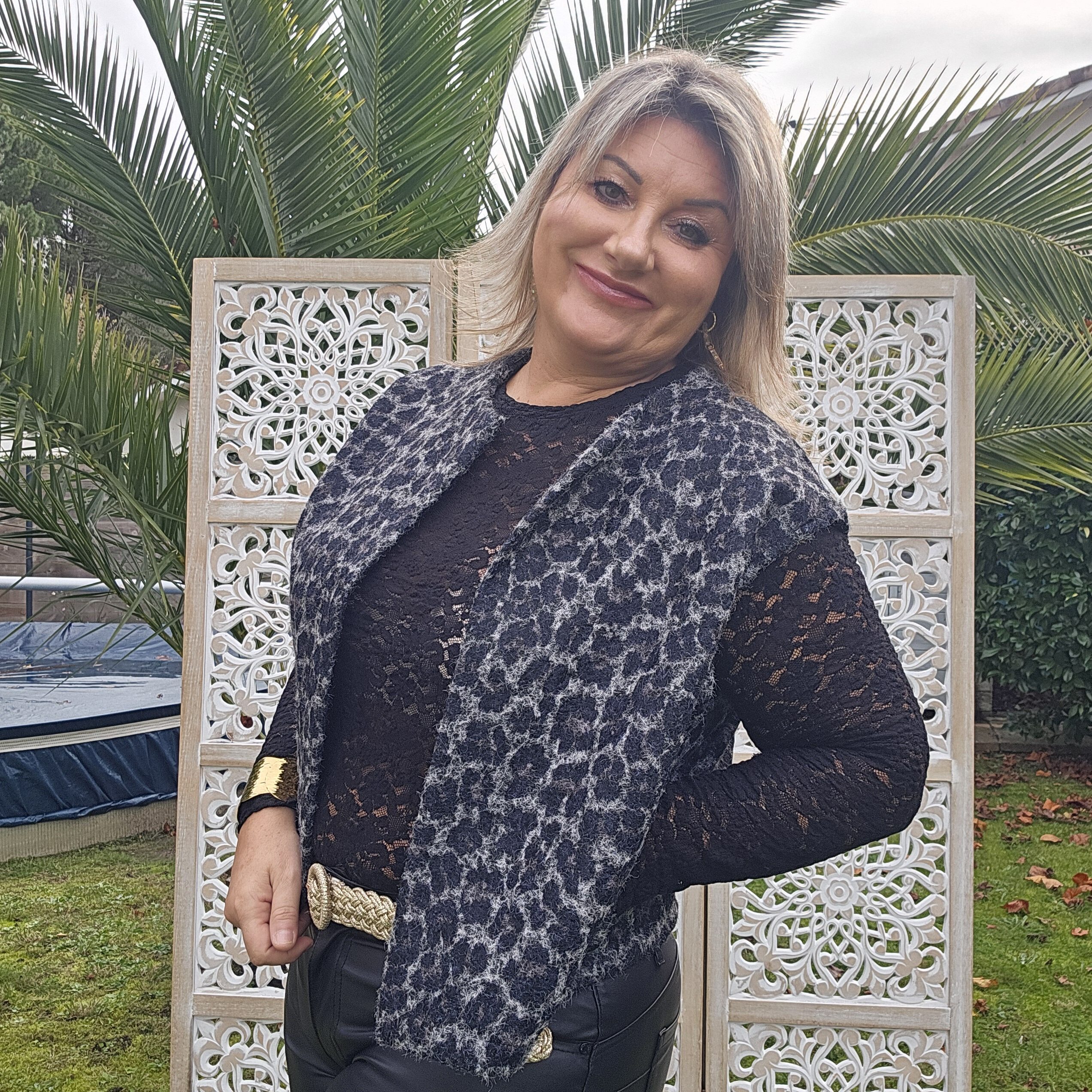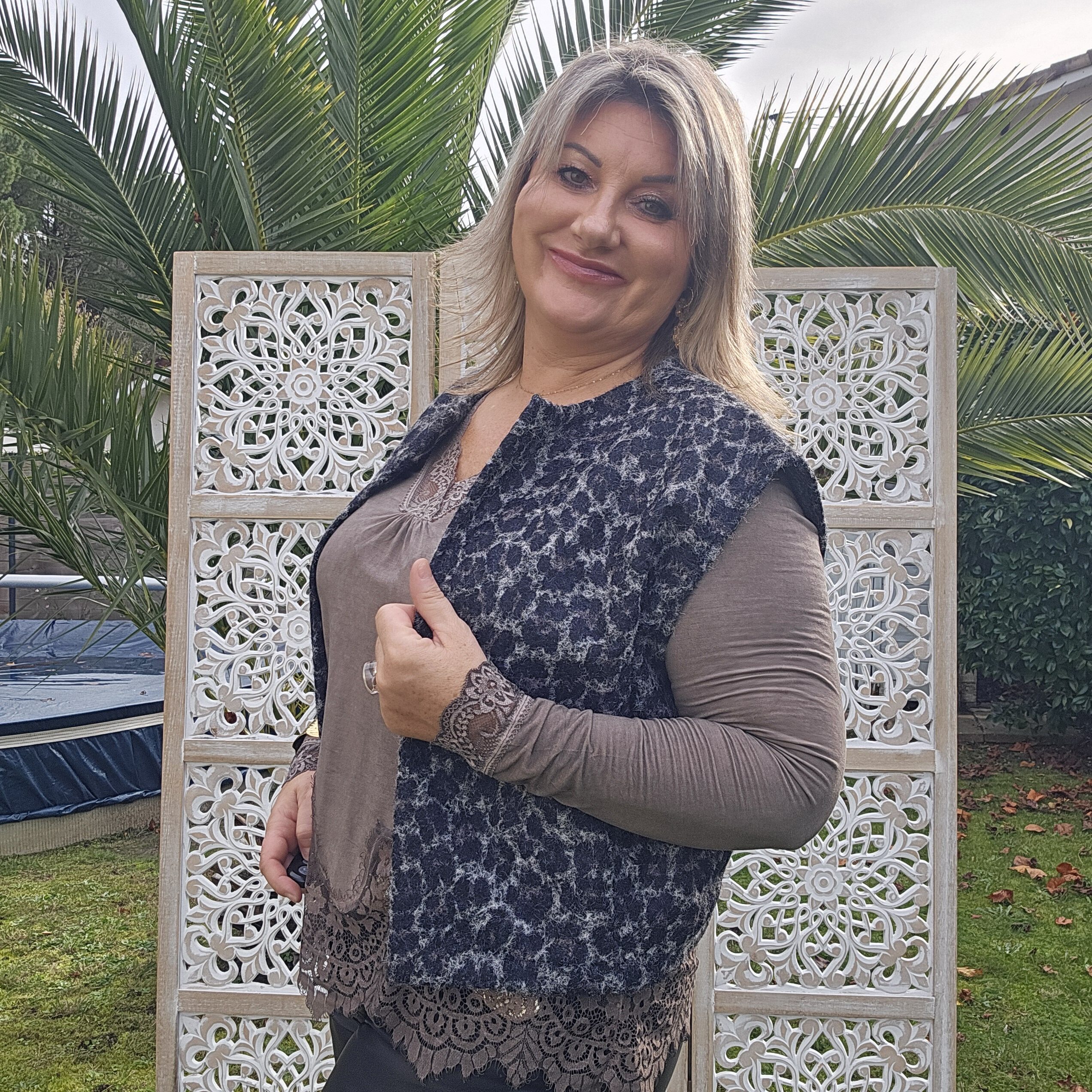 Mon regard pailleté : Gilet très doux, peut se porter avec un top dentelle à manches longues, ou une chemise, accompagné d’un pantalon, un jean’s, une jupe, ou sur une robe.