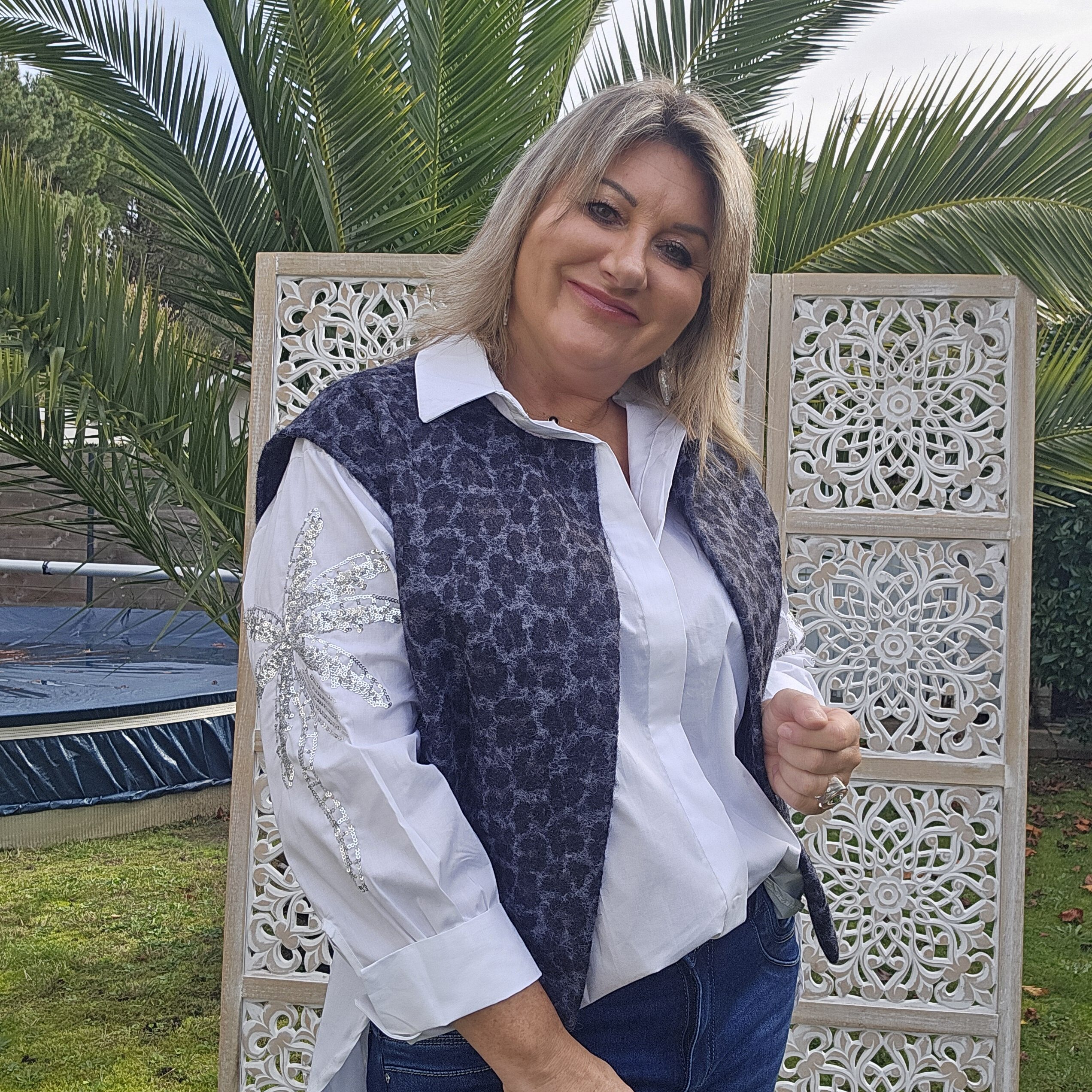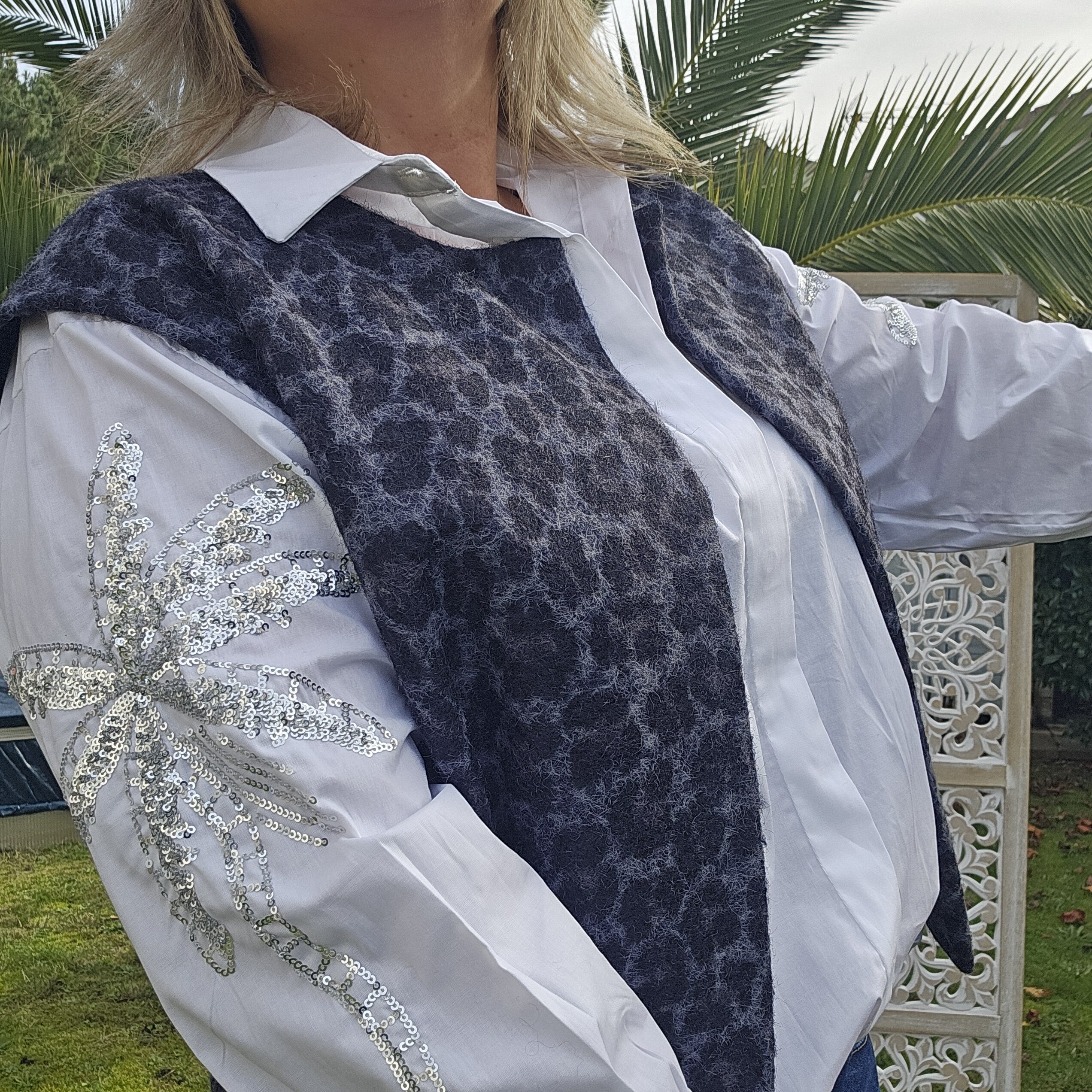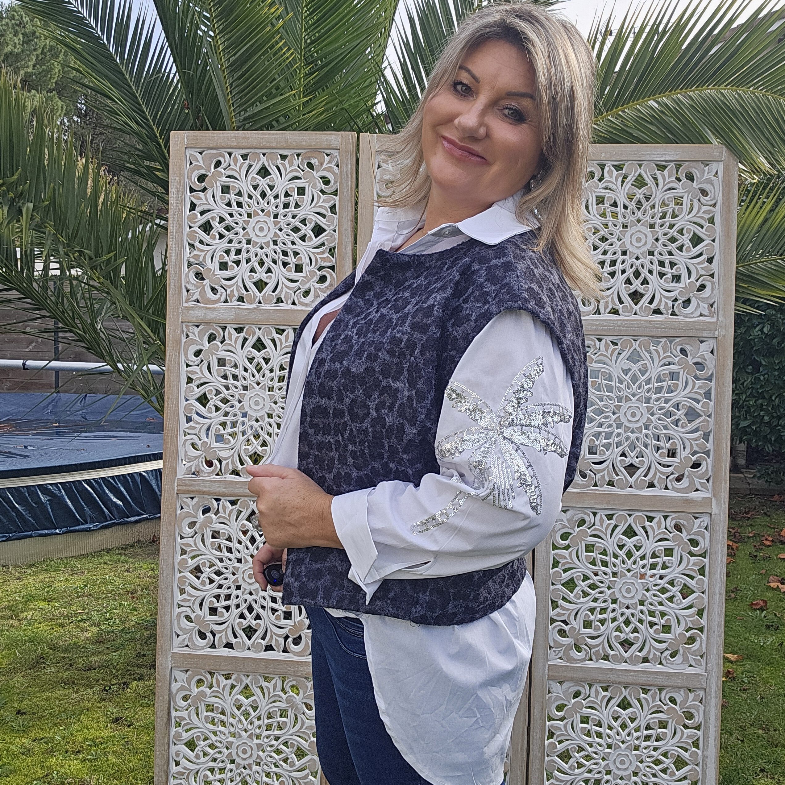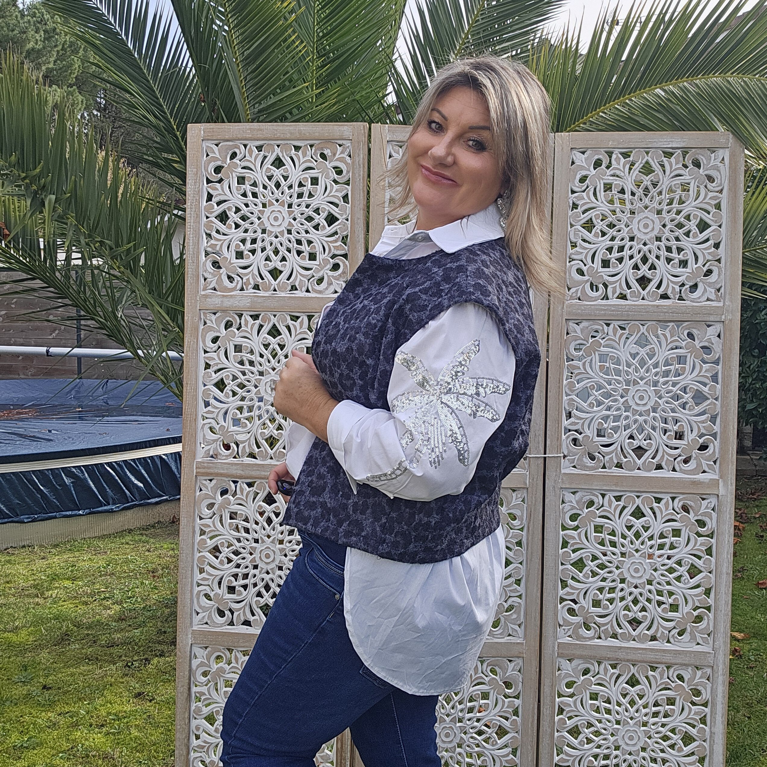 Mon regard pailleté : Gilet très doux, peut se porter avec un top dentelle à manches longues, ou une chemise, accompagné d’un pantalon, un jean’s, une jupe, ou sur une robe.