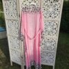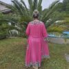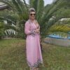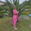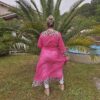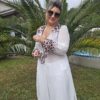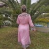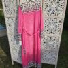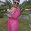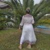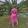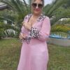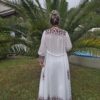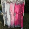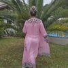 Gilet long d’été léopard, type kimono, léger et transparent, manches longues élastiquées, peut se nouer avec la ceinture, décoration léopard aux épaules, bout des manches, sur tout le bas du kimono, et au bout de la ceinture. Existe en blanc, en rose et fuchsia. TU.