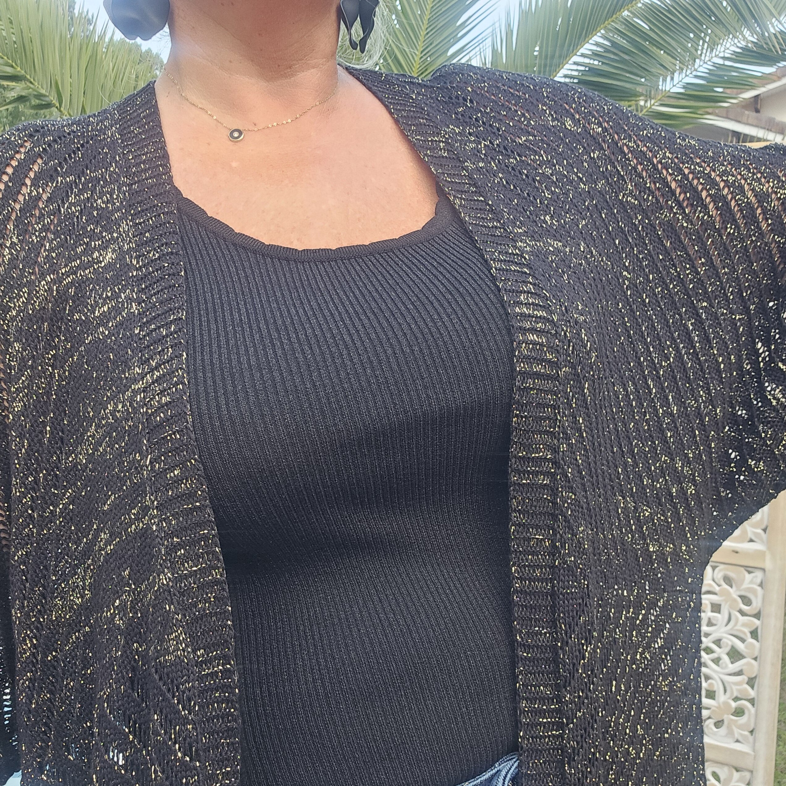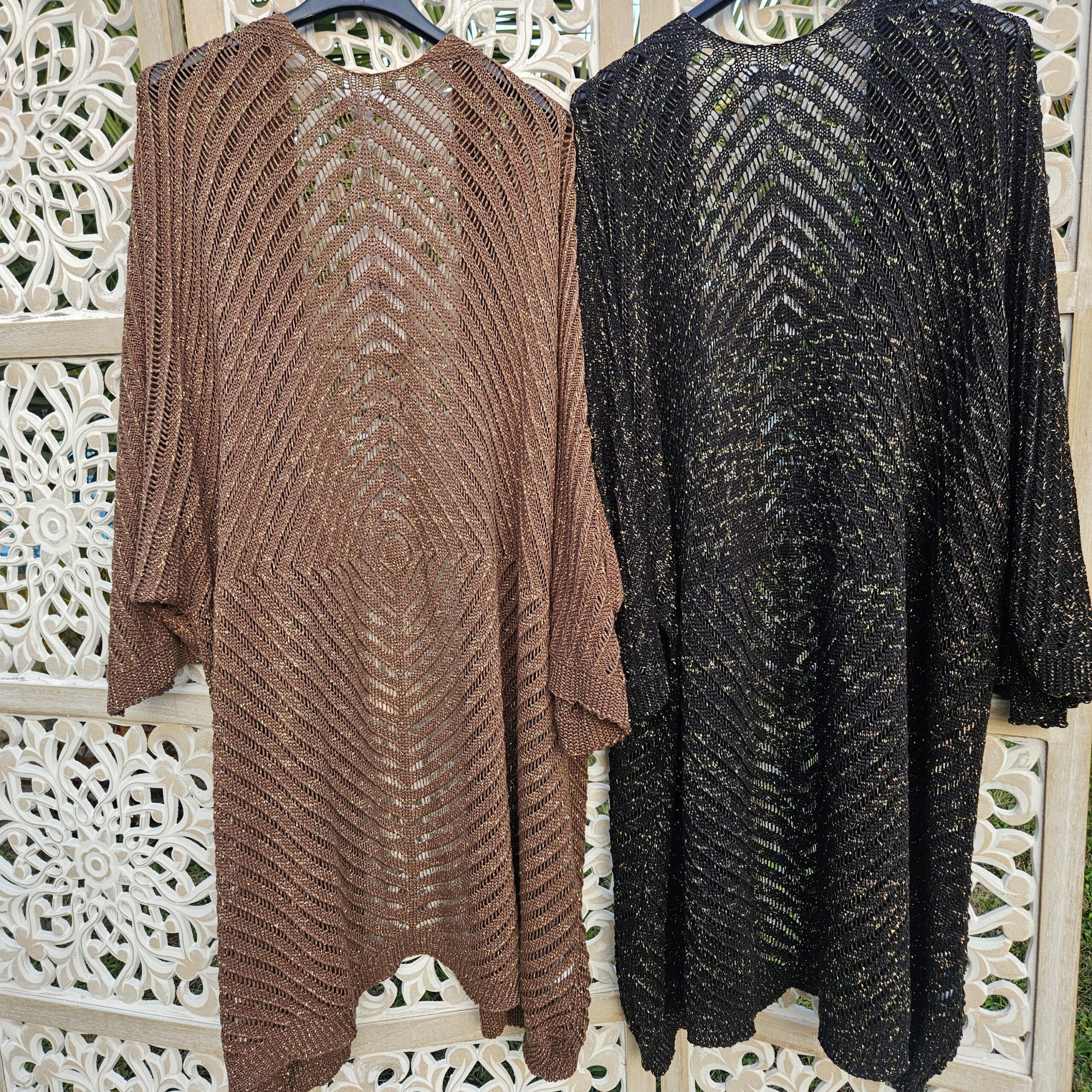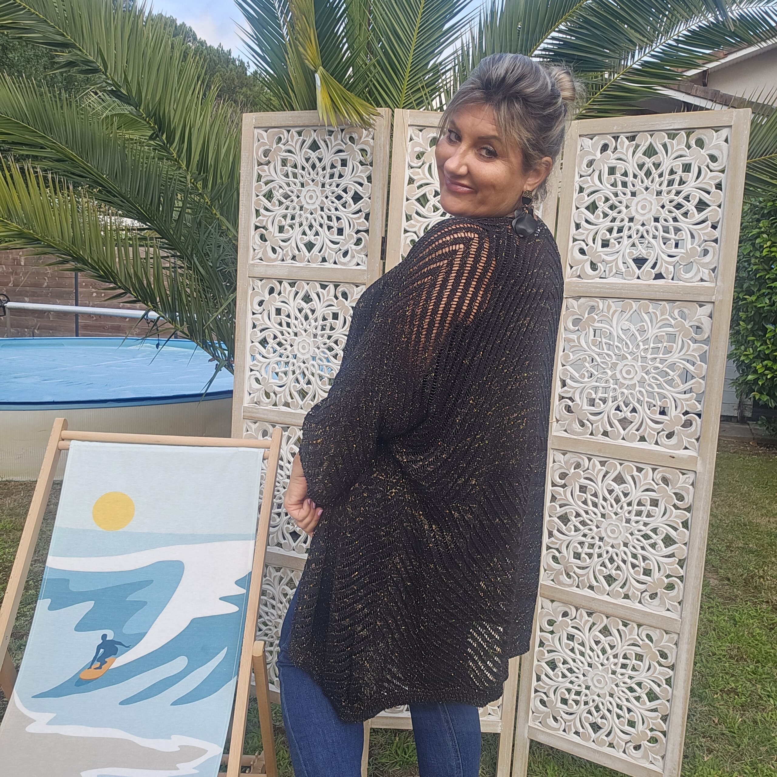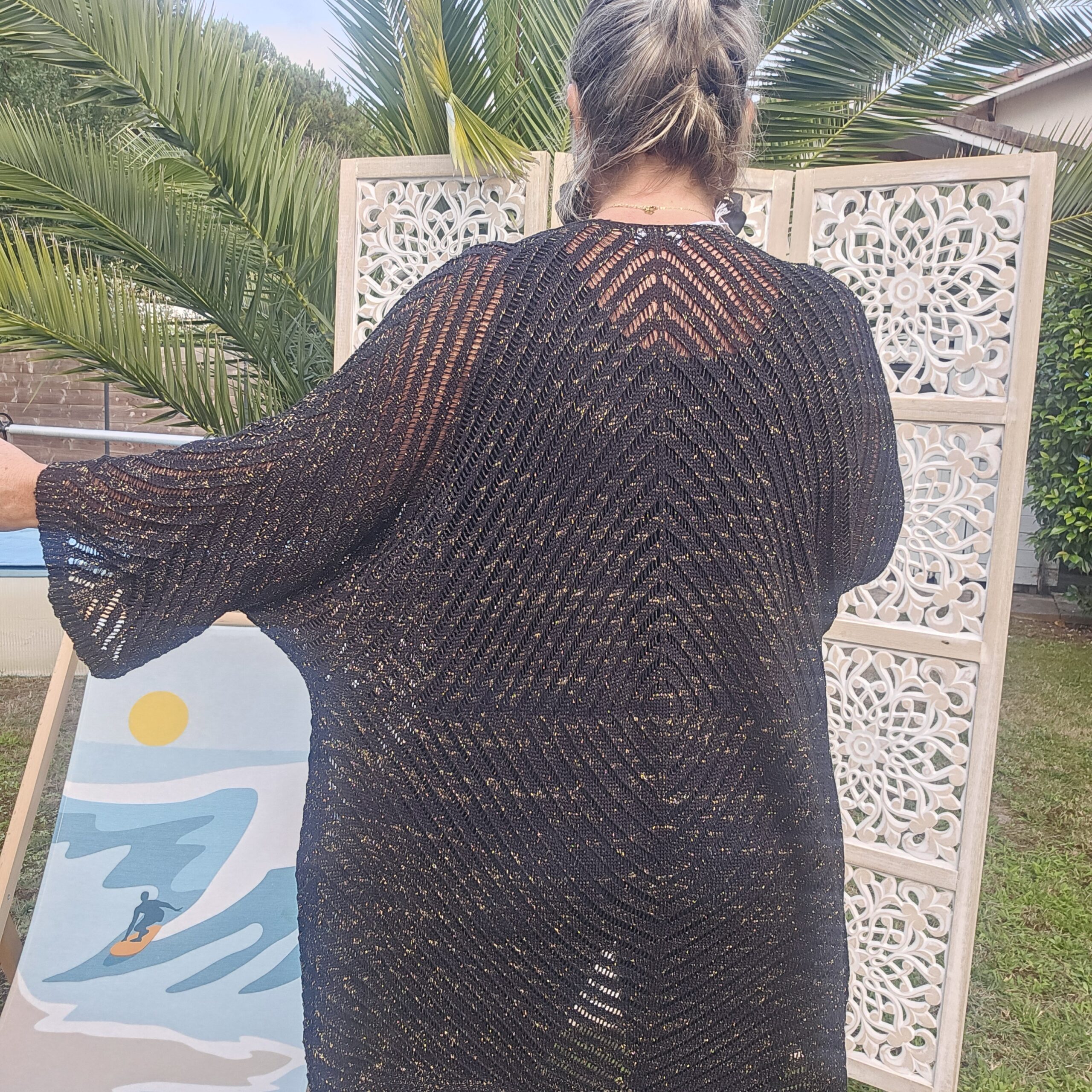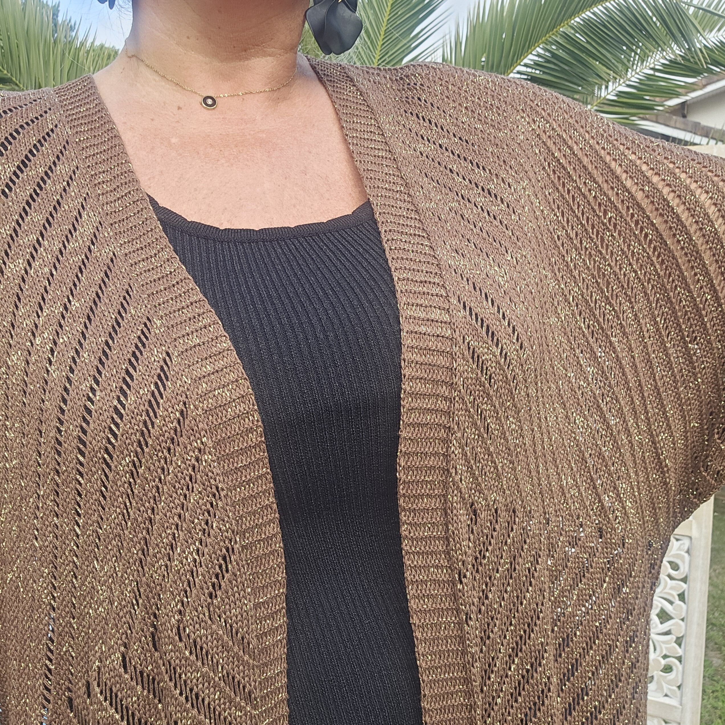 Gilet long en lurex brillant doré, ajouré, magnifique maille, manches larges. Dans le dos, la maille est en forme géométrique. TU. Existe en chocolat et noir.