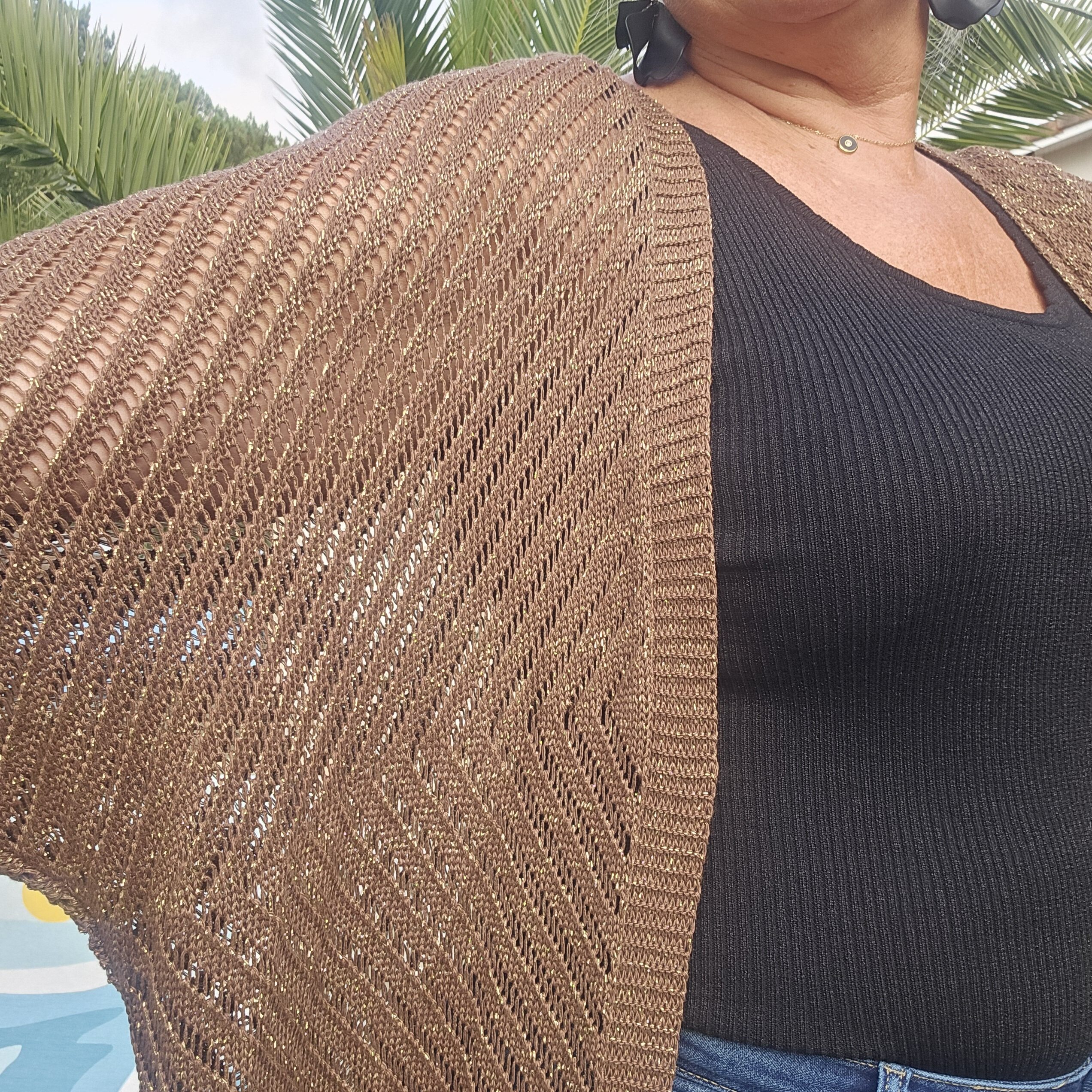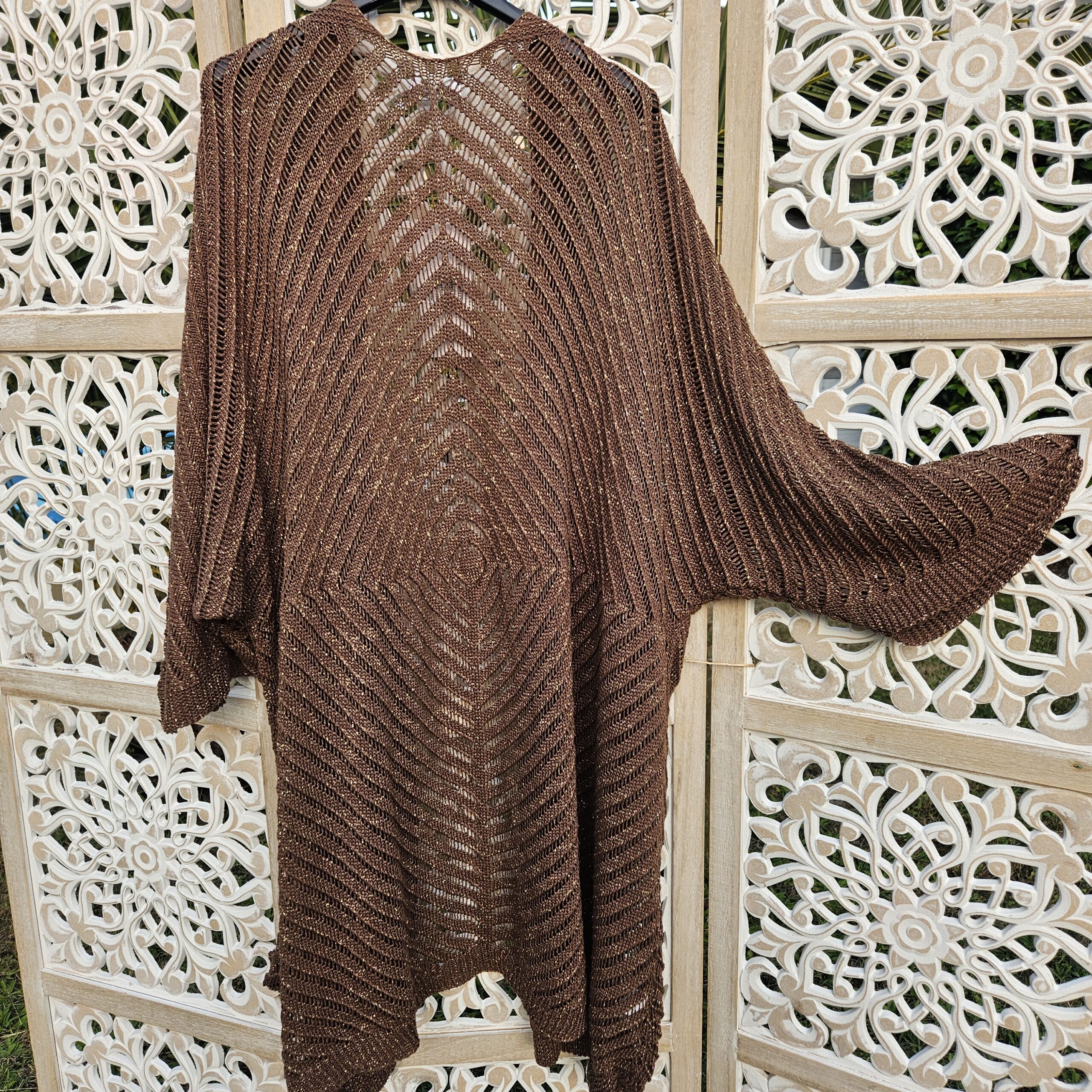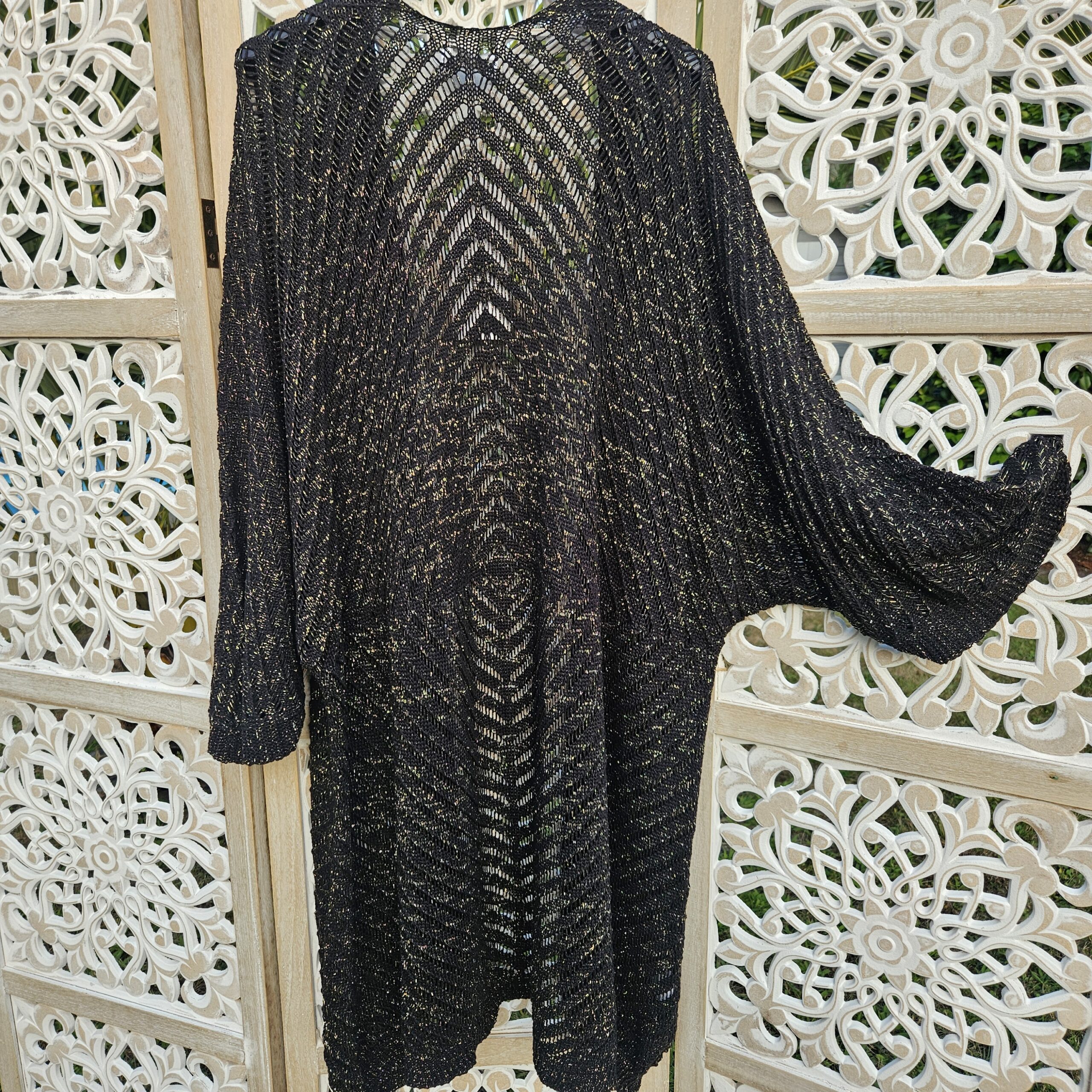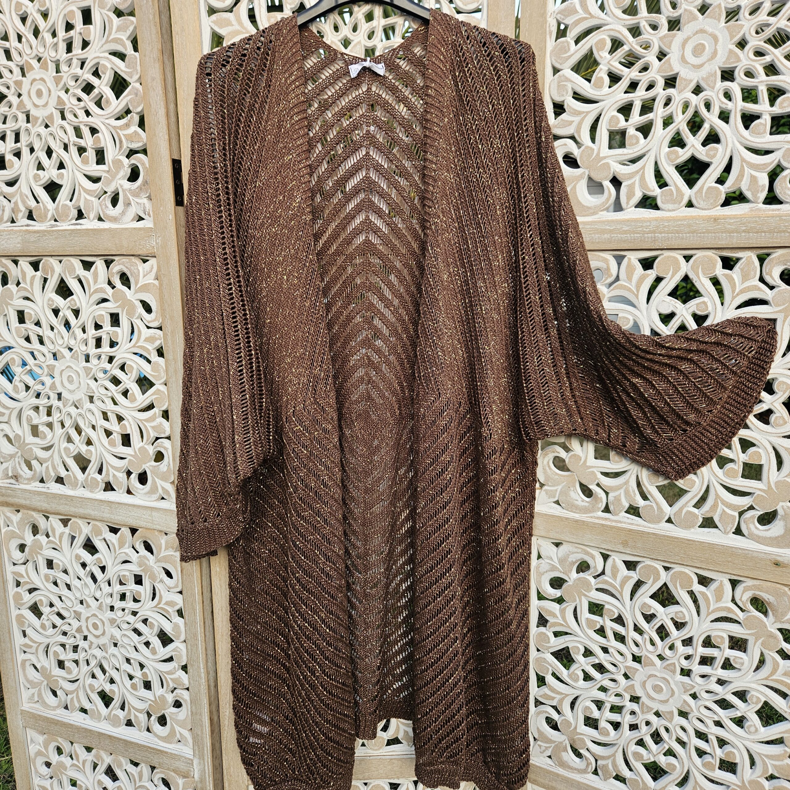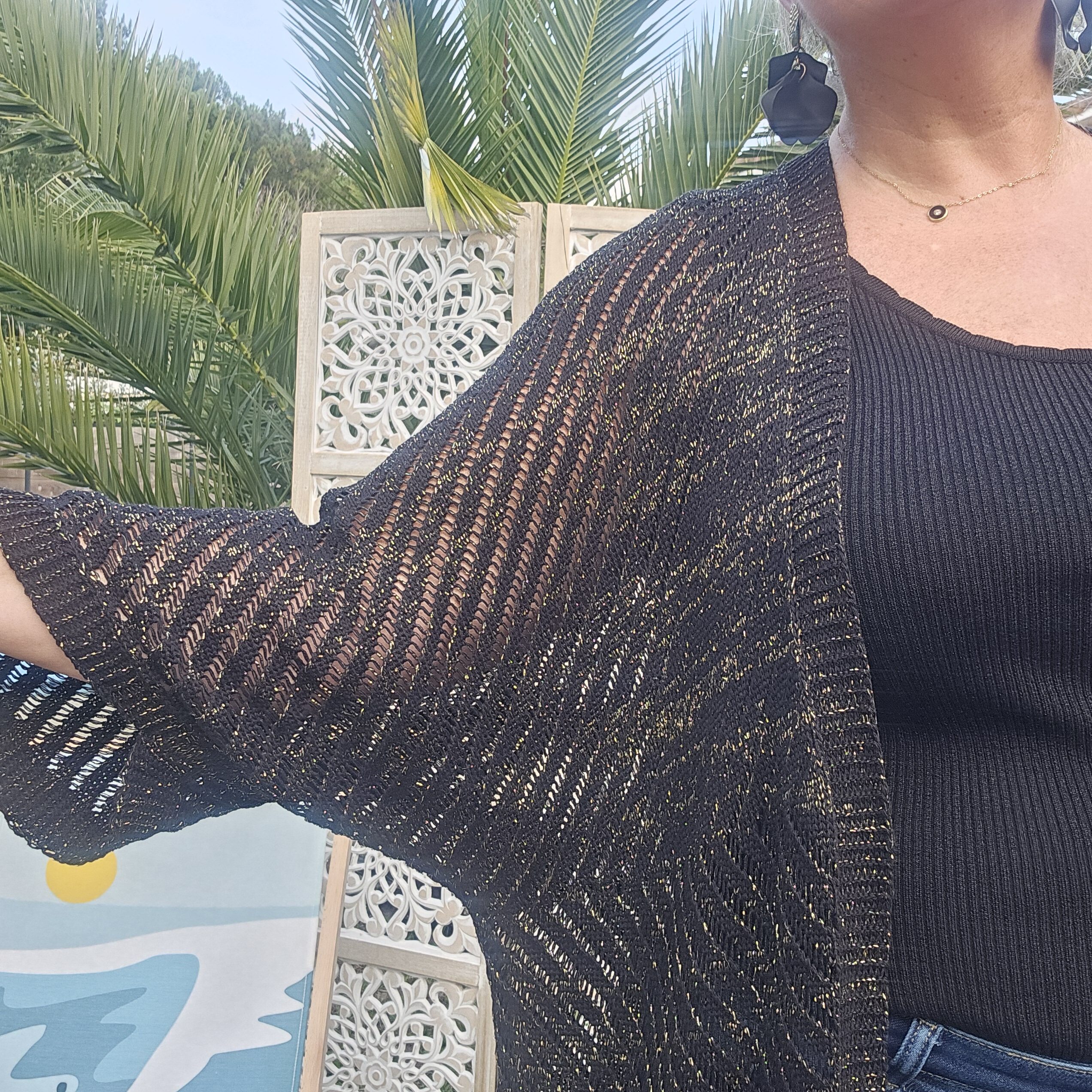 Gilet long en lurex brillant doré, ajouré, magnifique maille, manches larges. Dans le dos, la maille est en forme géométrique. TU. Existe en chocolat et noir.