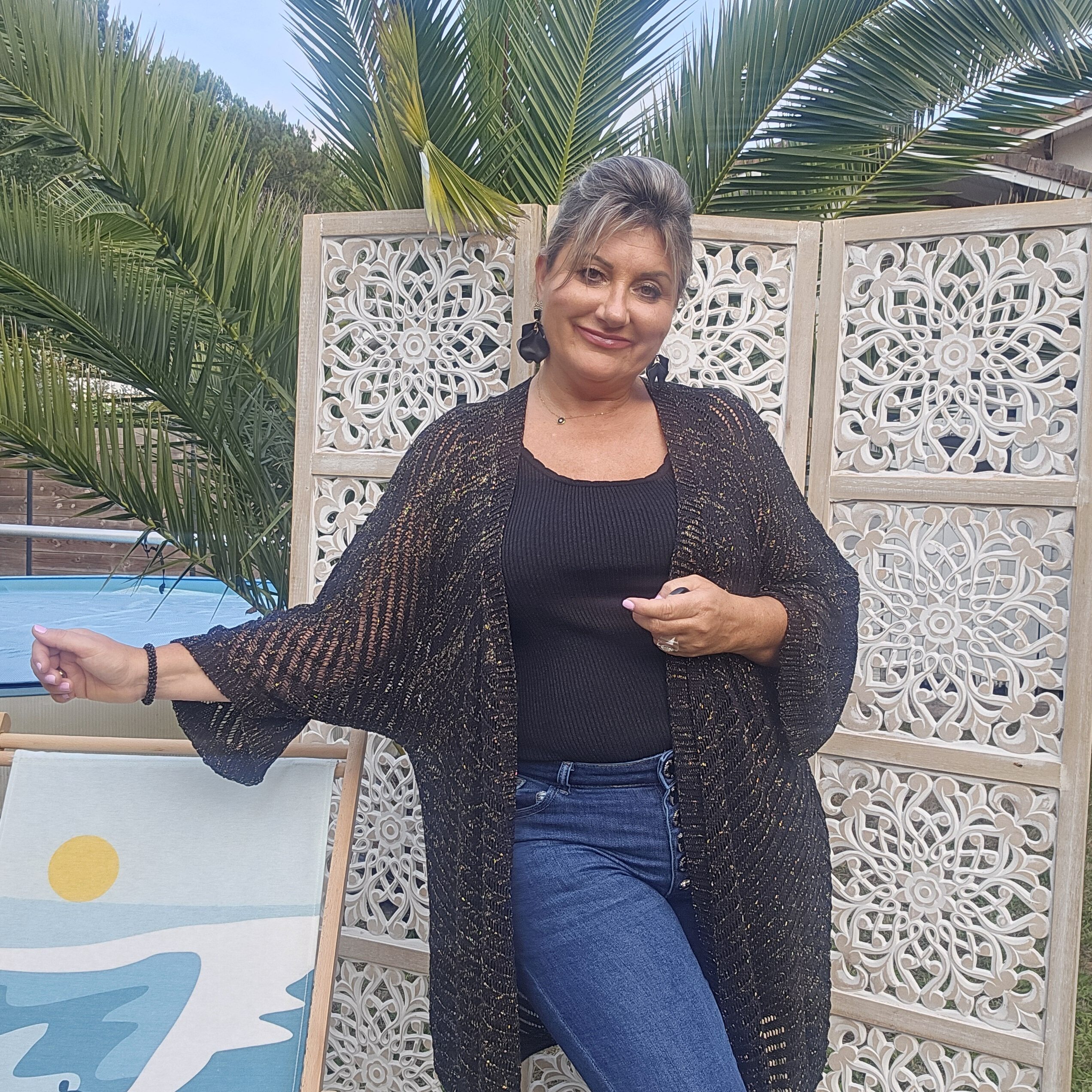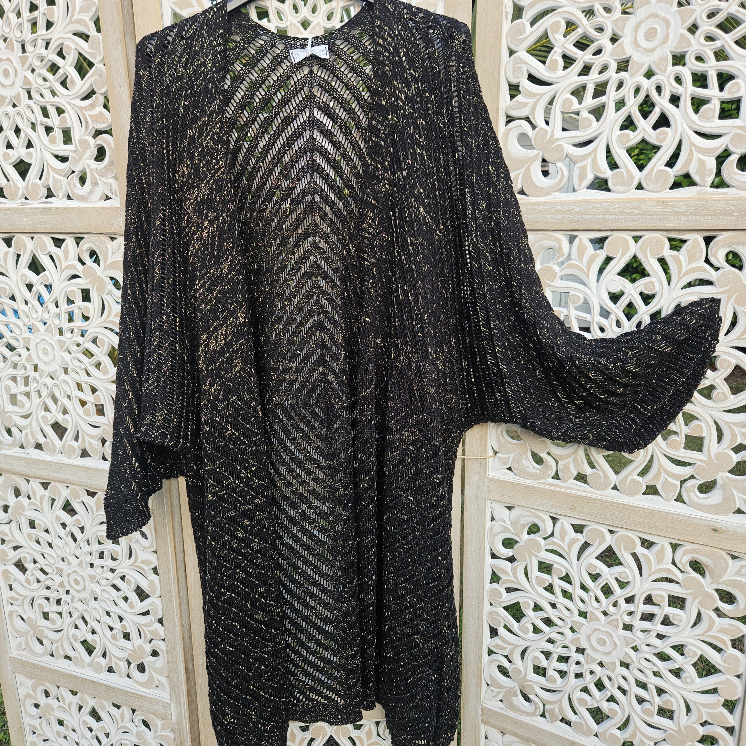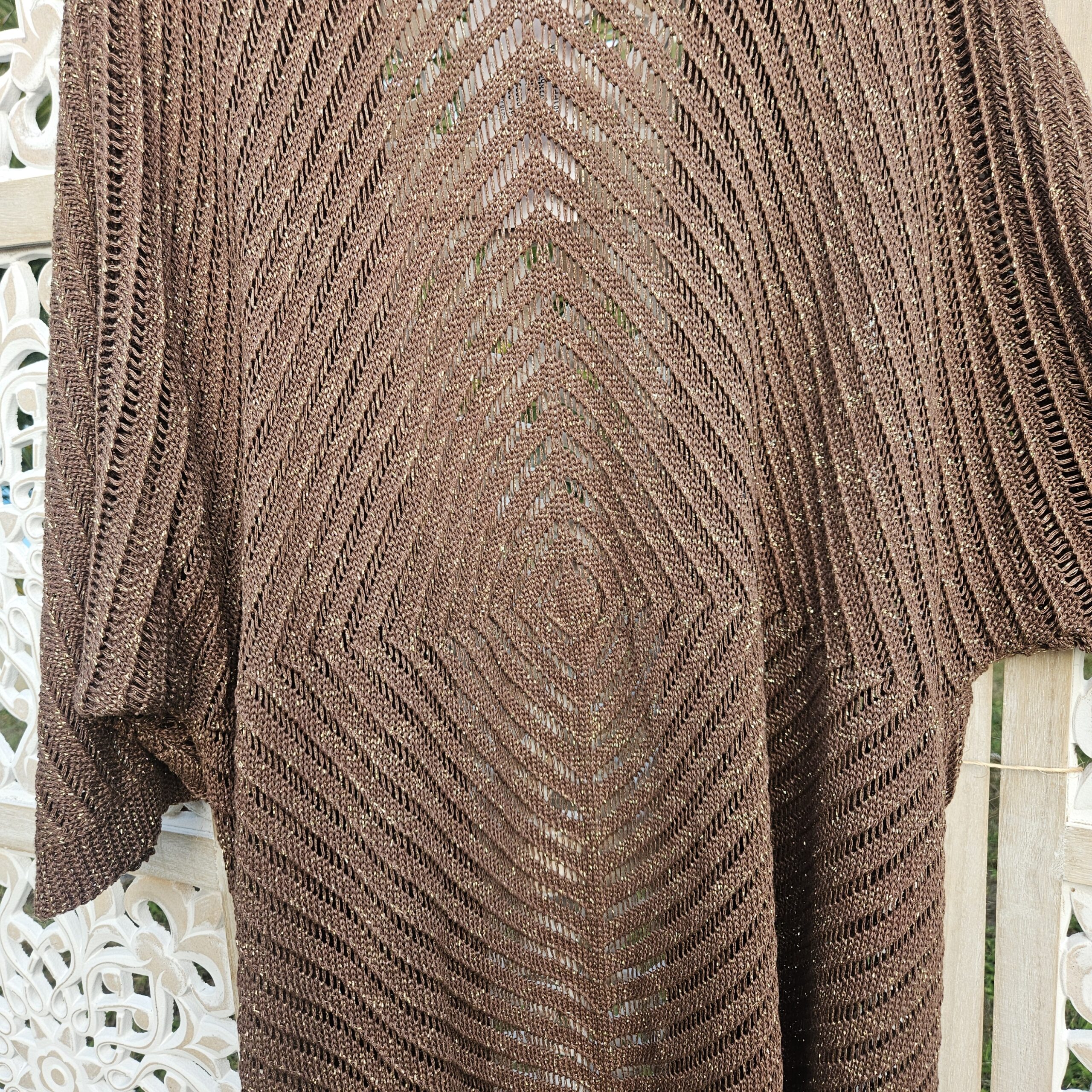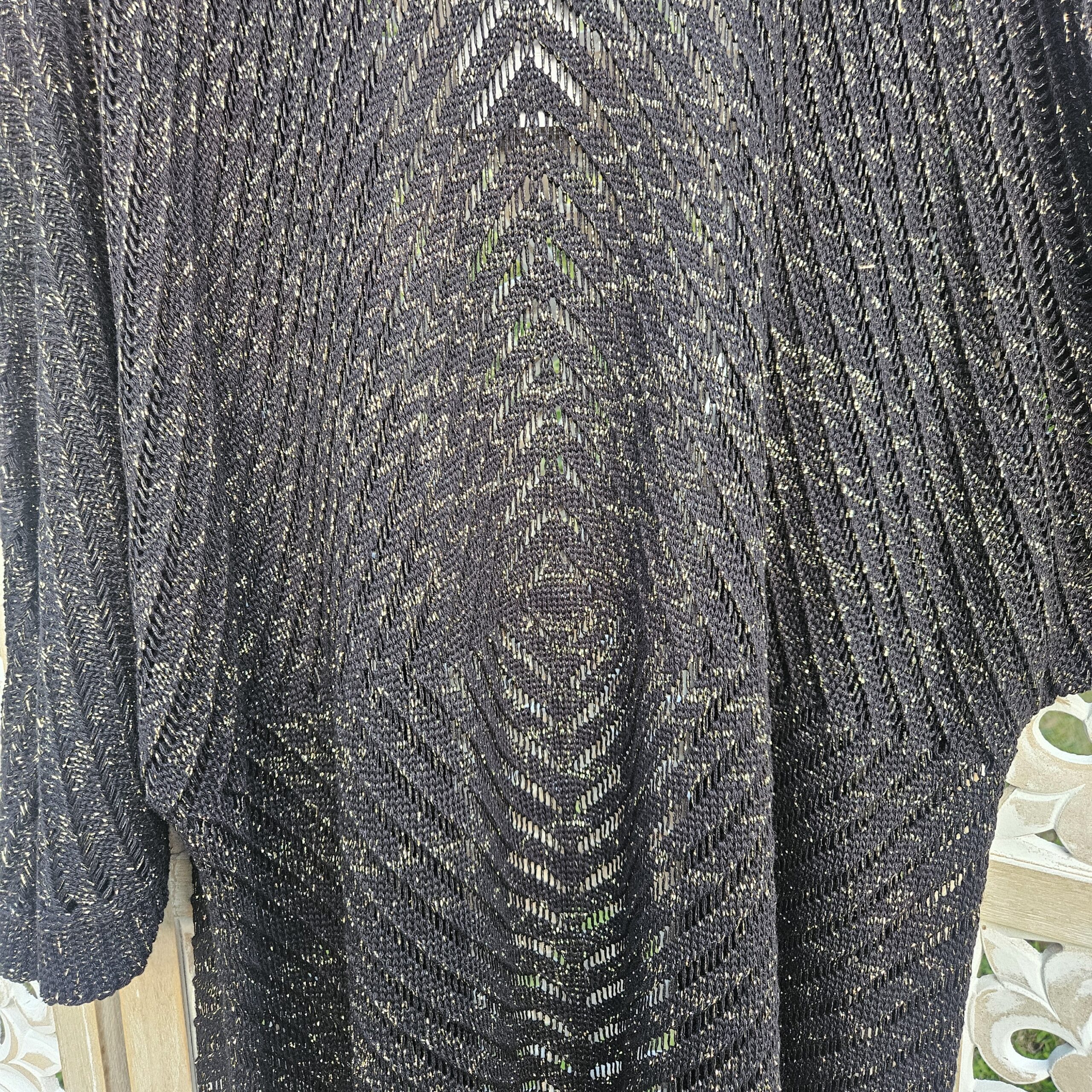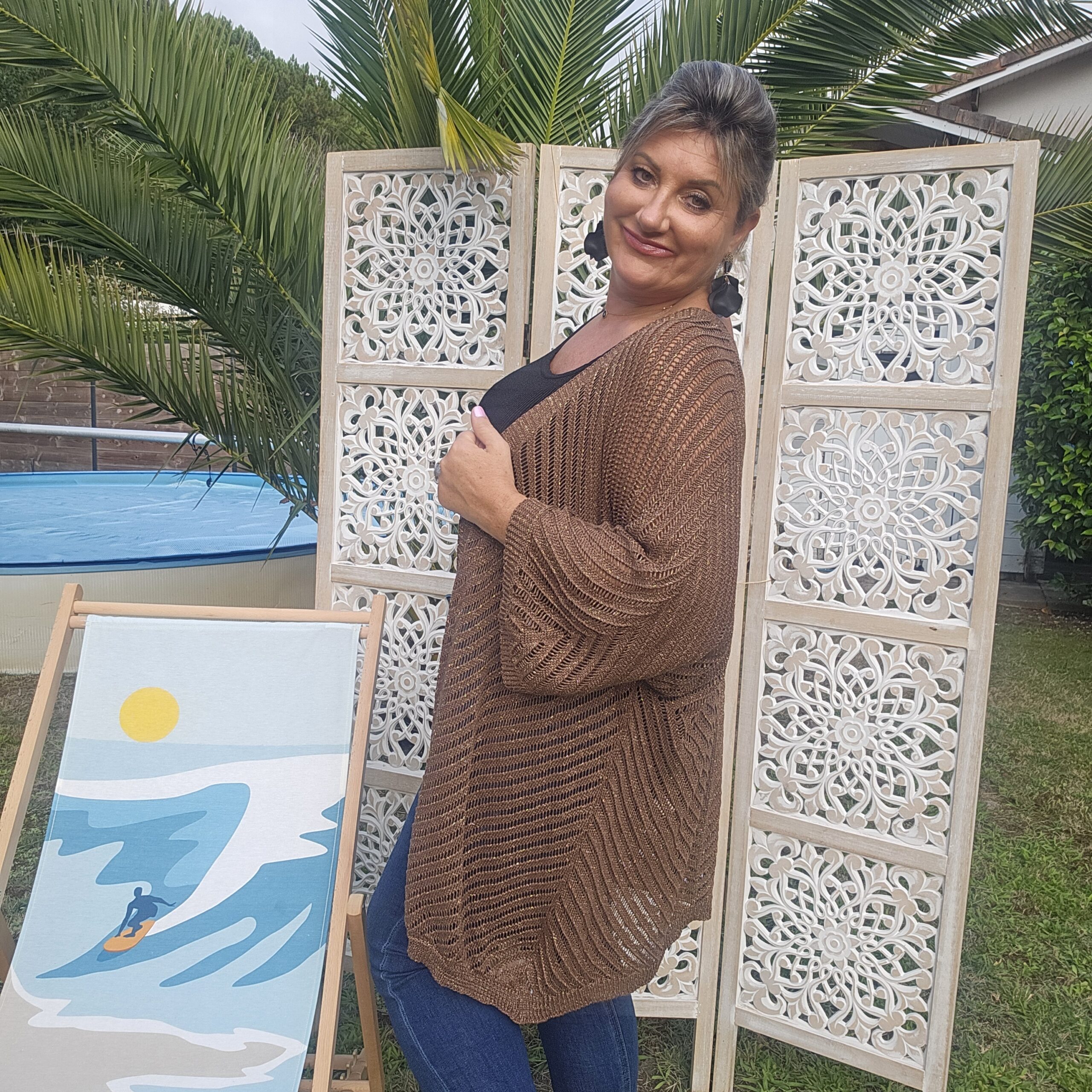 Gilet long en lurex brillant doré, ajouré, magnifique maille, manches larges. Dans le dos, la maille est en forme géométrique. TU. Existe en chocolat et noir.