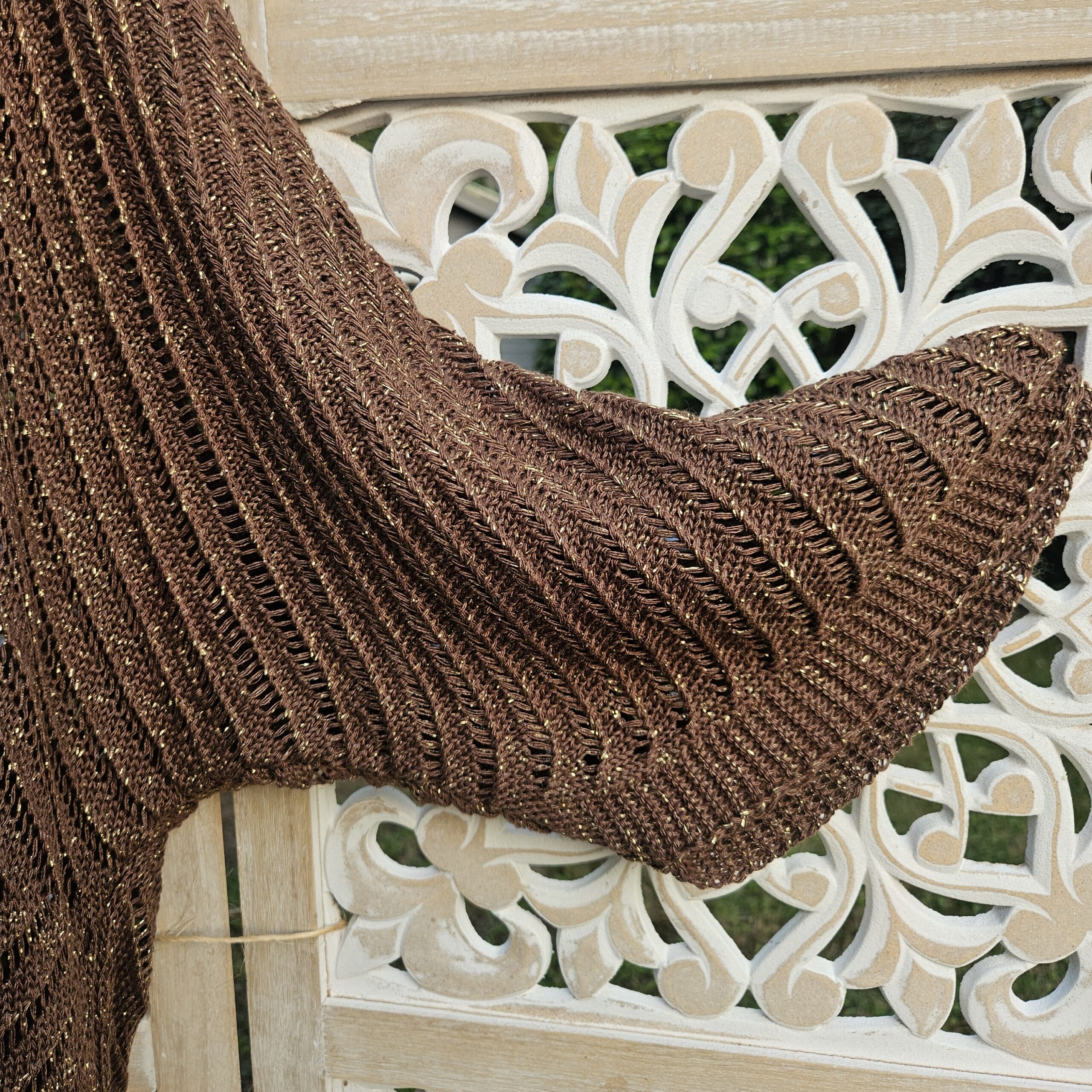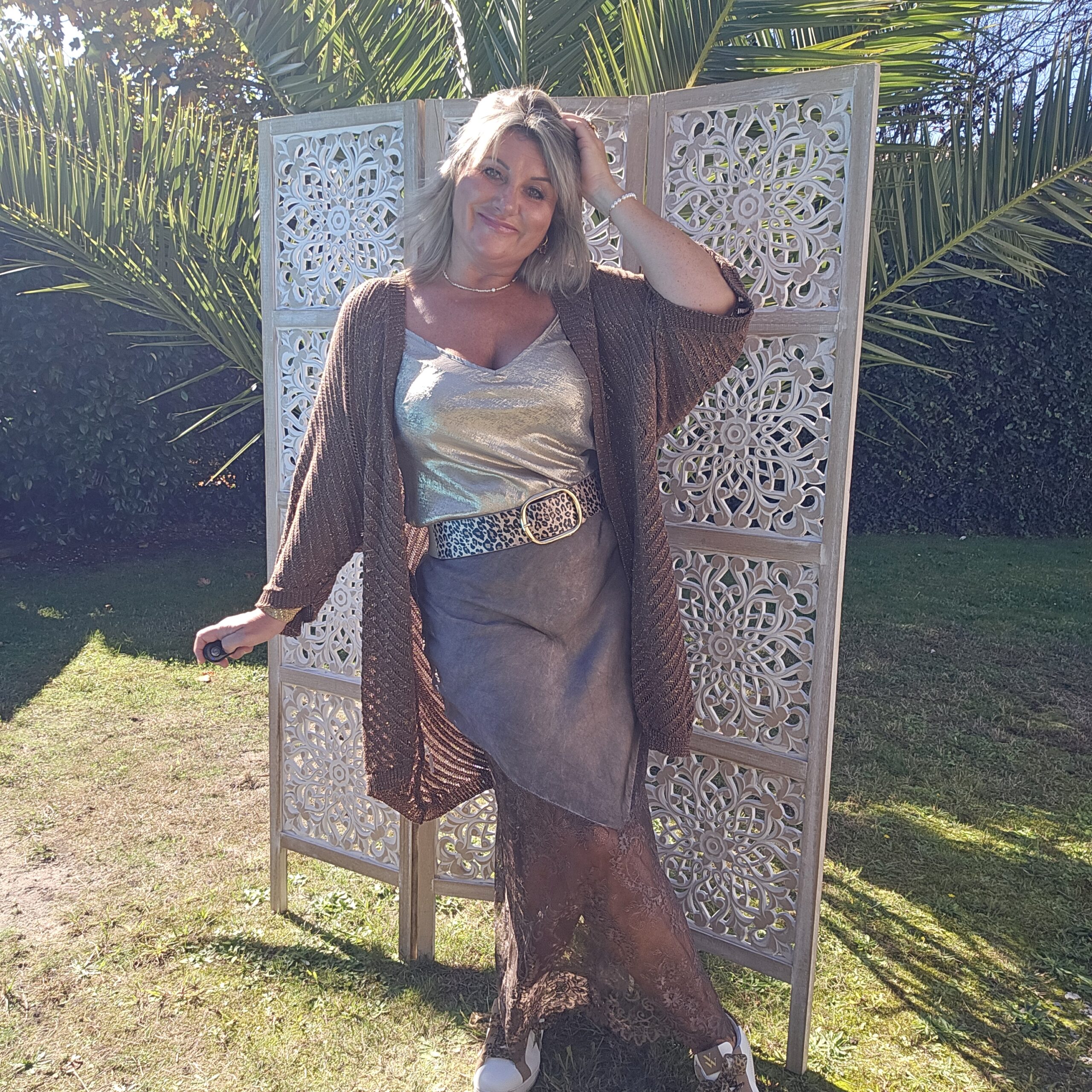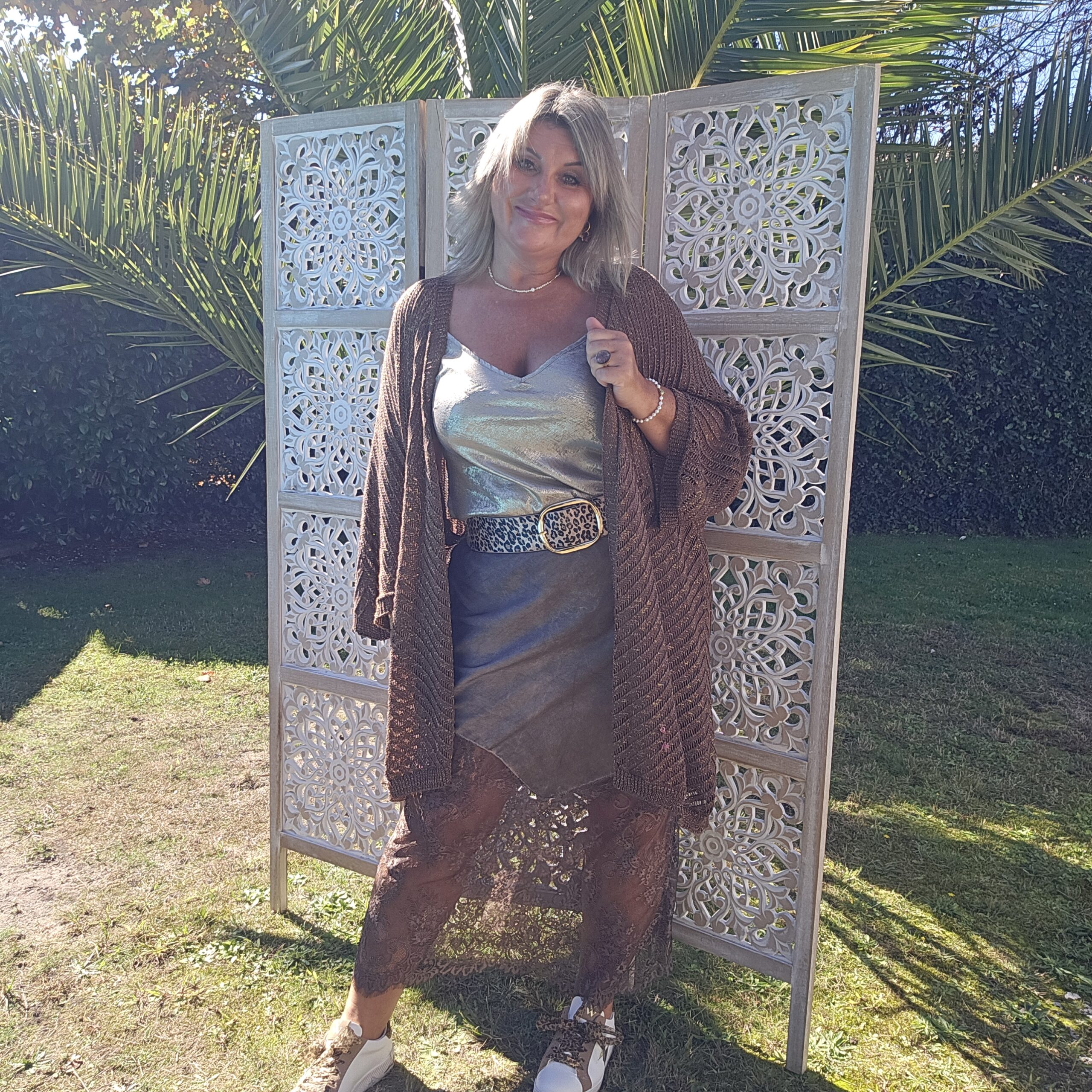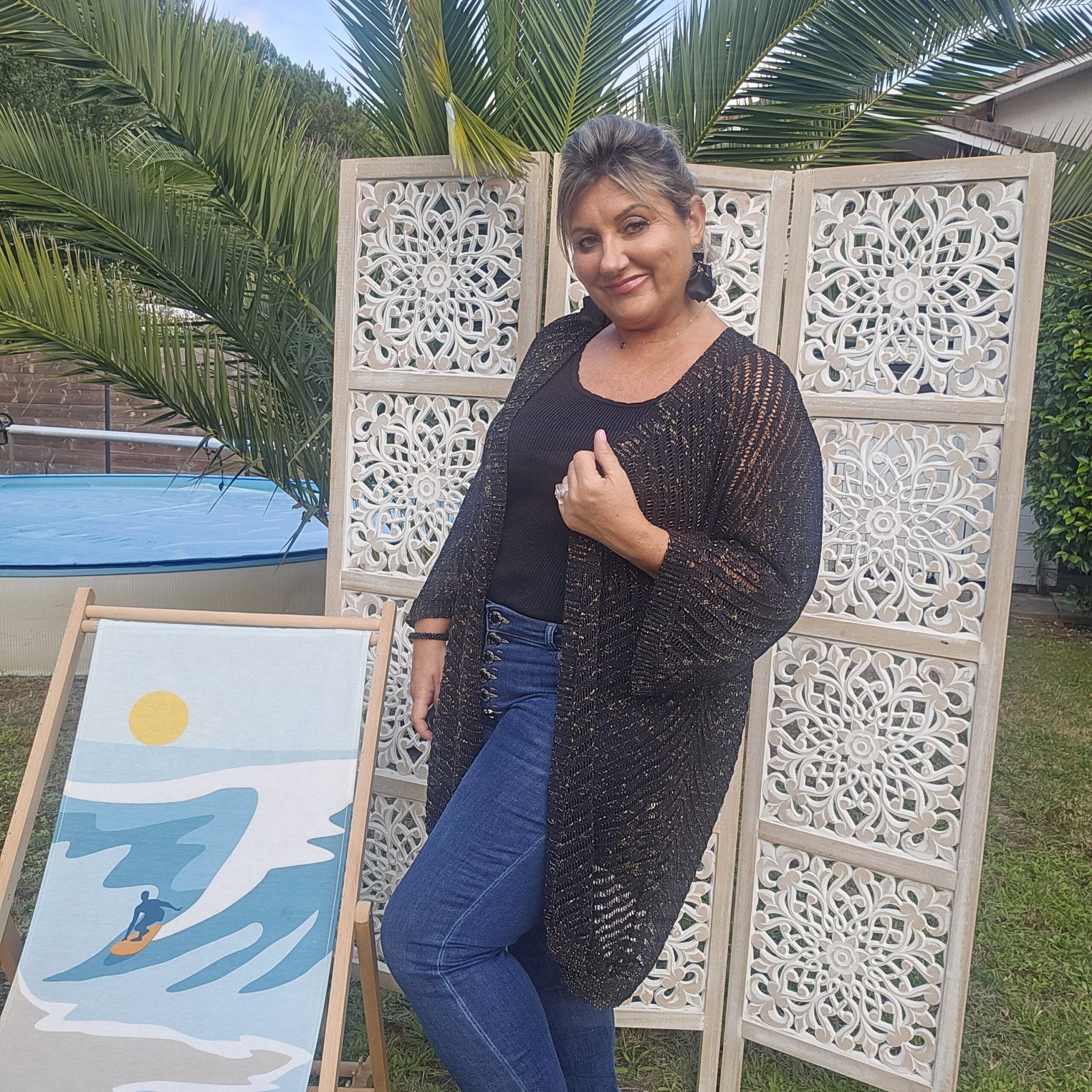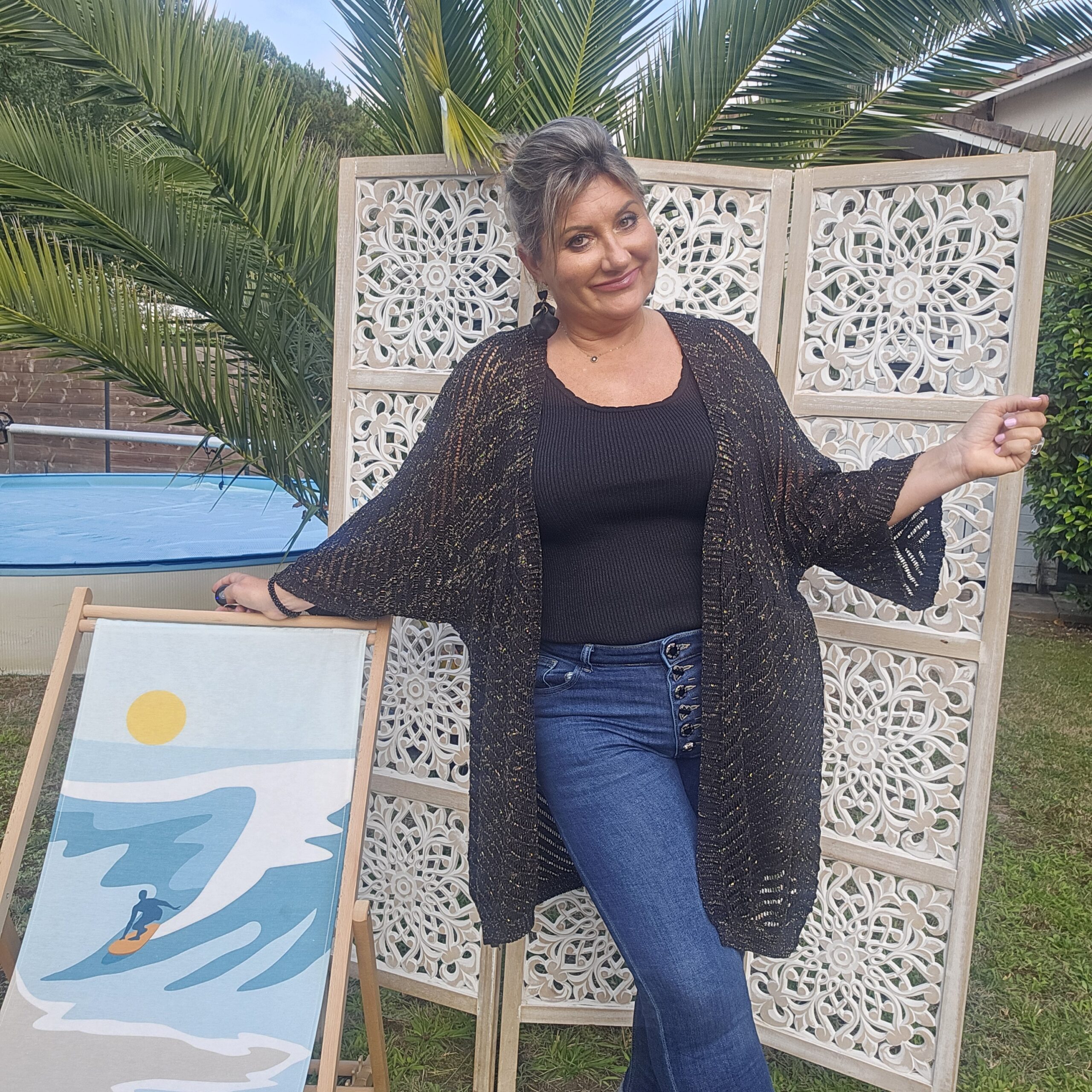 Gilet long en lurex brillant doré, ajouré, magnifique maille, manches larges. Dans le dos, la maille est en forme géométrique. TU. Existe en chocolat et noir.
