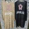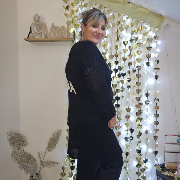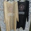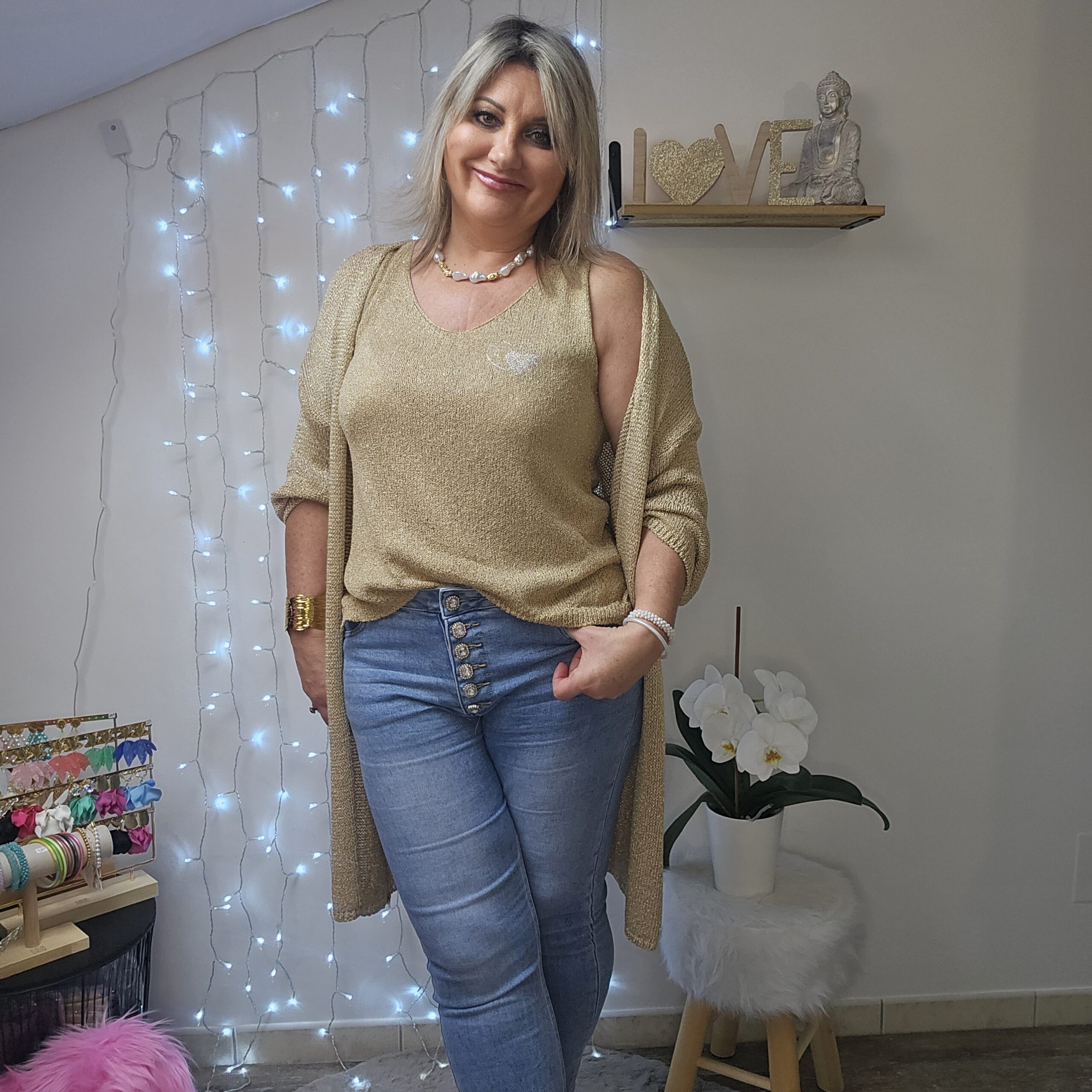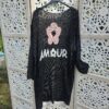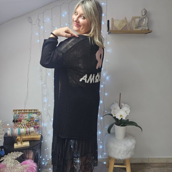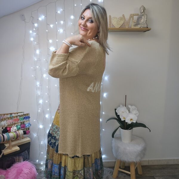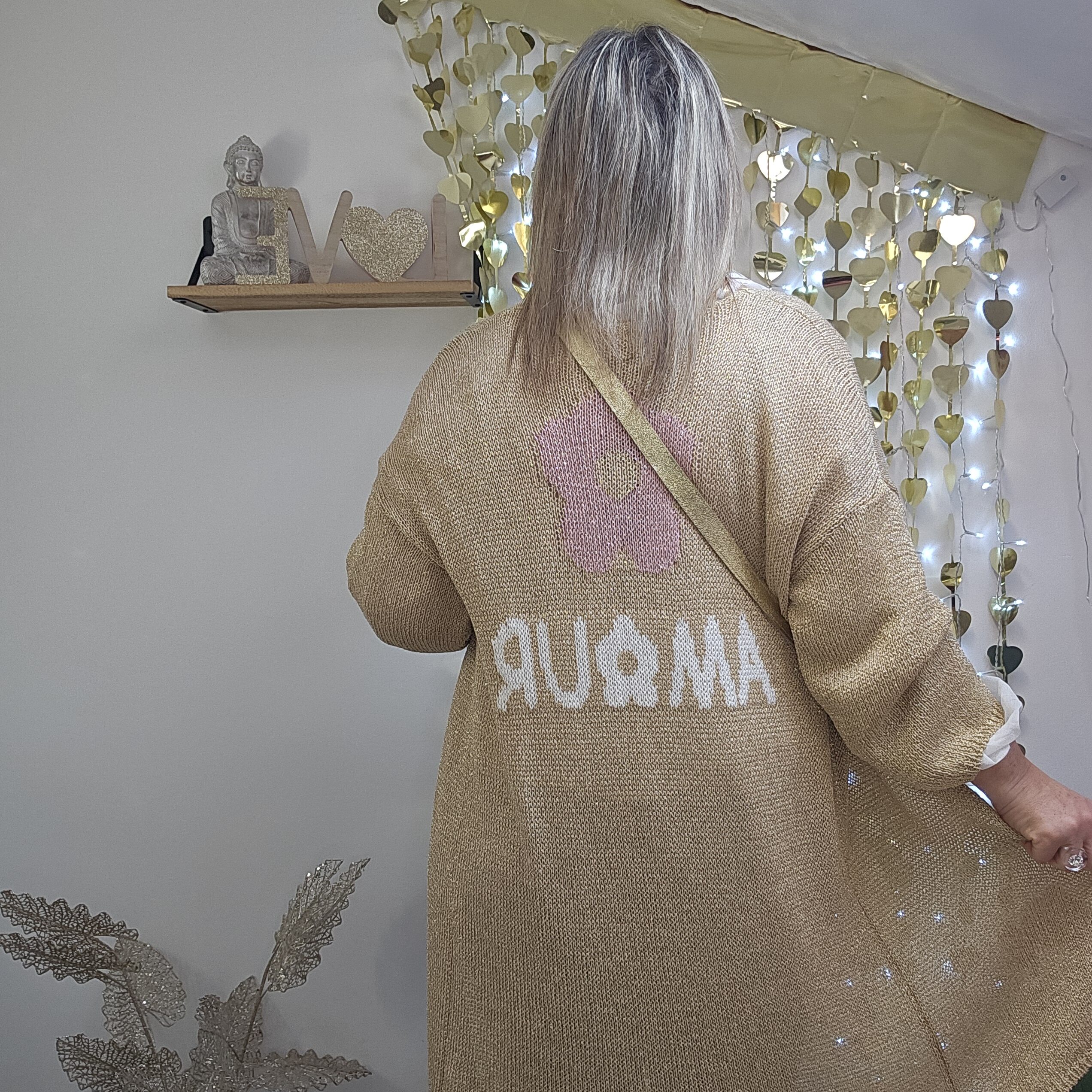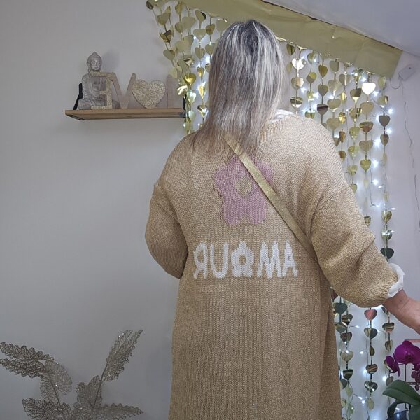 Gilet long brillant , aspect lurex, léger avec fleur et AMOUR au dos, TU.