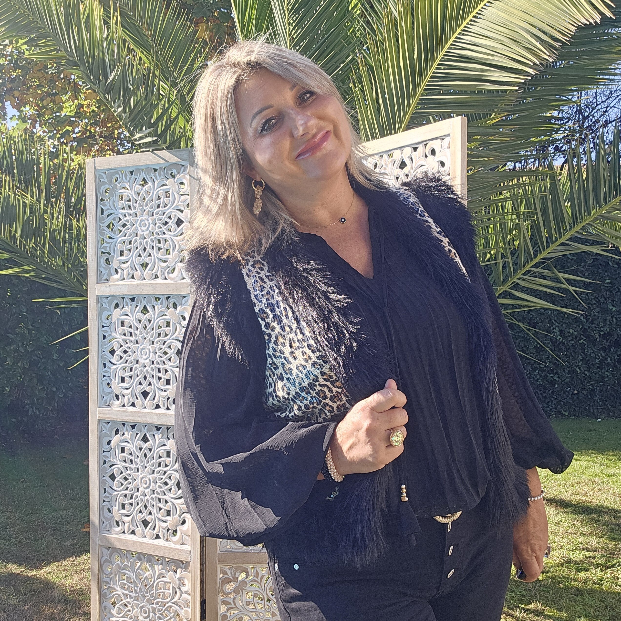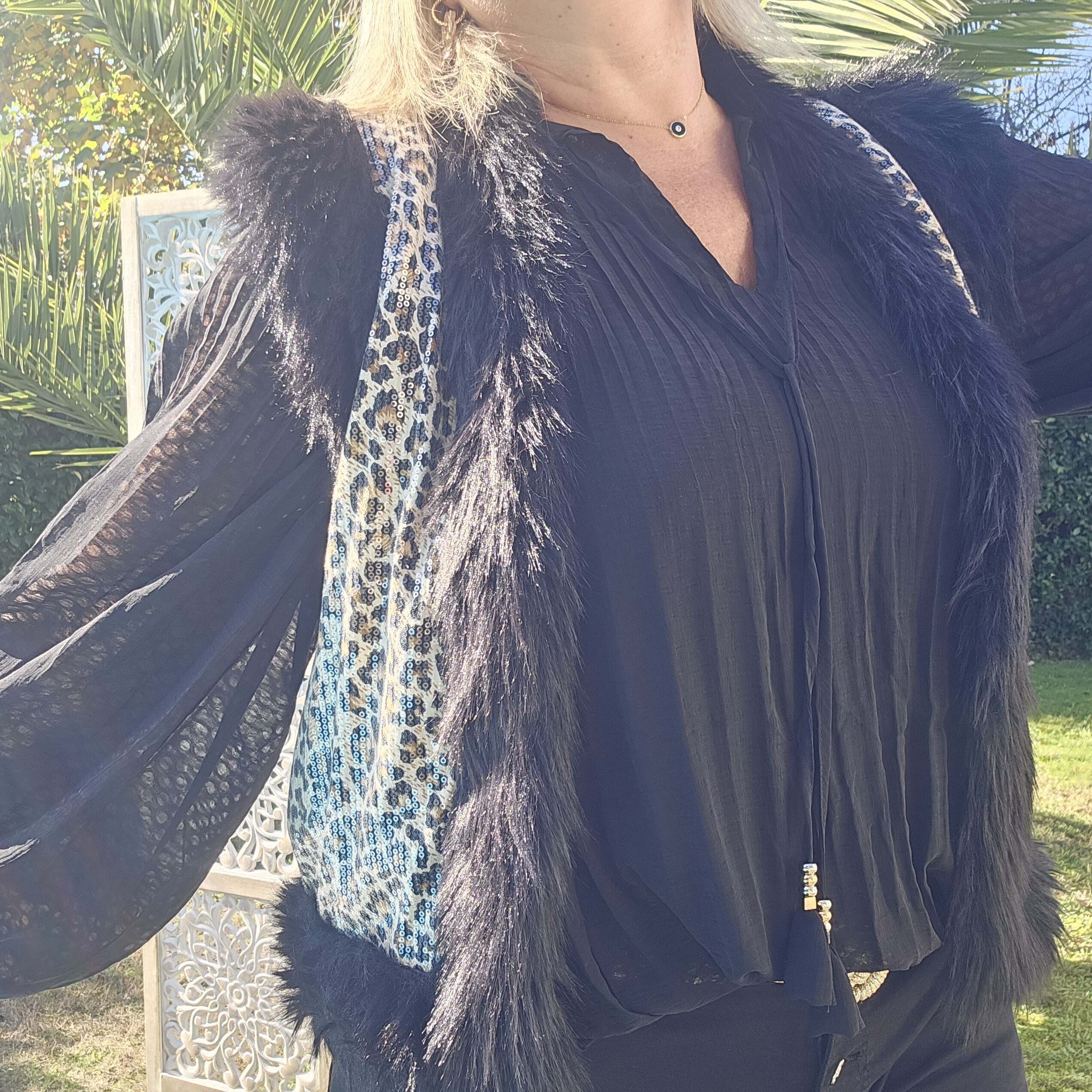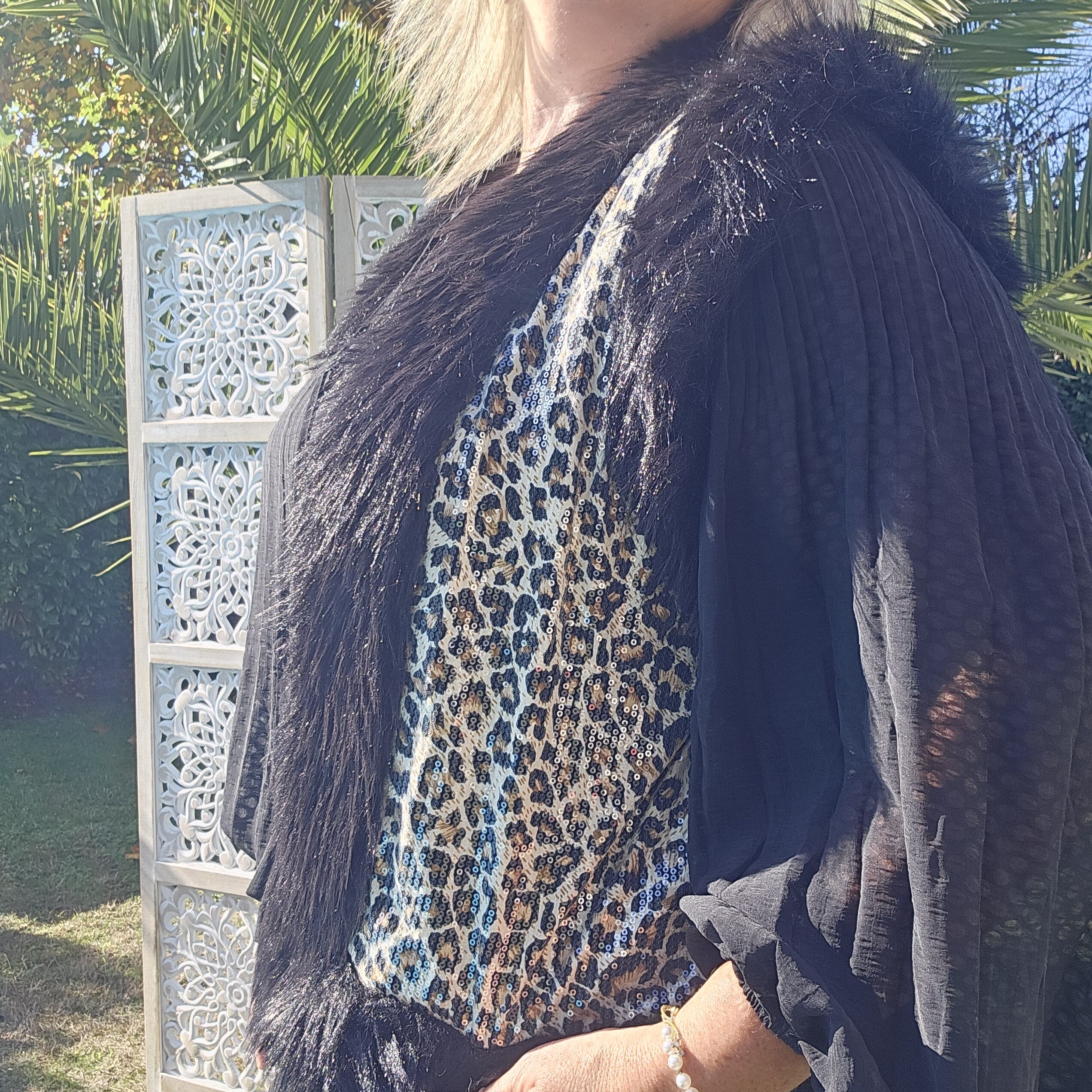 Gilet noir sans manches en fausse fourrure et tissu en léopard orné en sequins transparents. Dos uni. Fourrure autour du gilet ainsi qu’autour des bras. Très doux et très chaud, à mettre sur un chemisier, une blouse, un pull. TU (36/44)