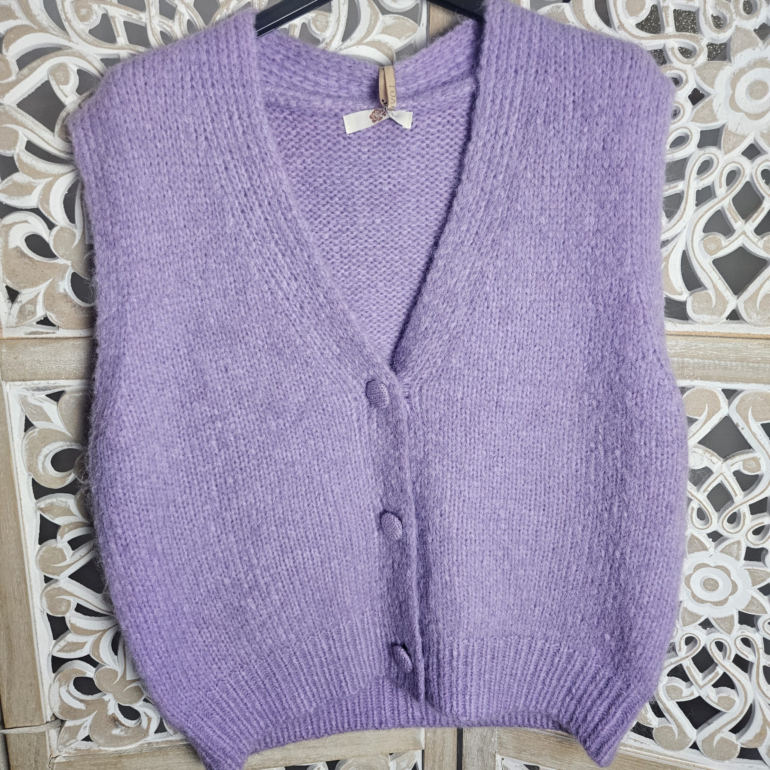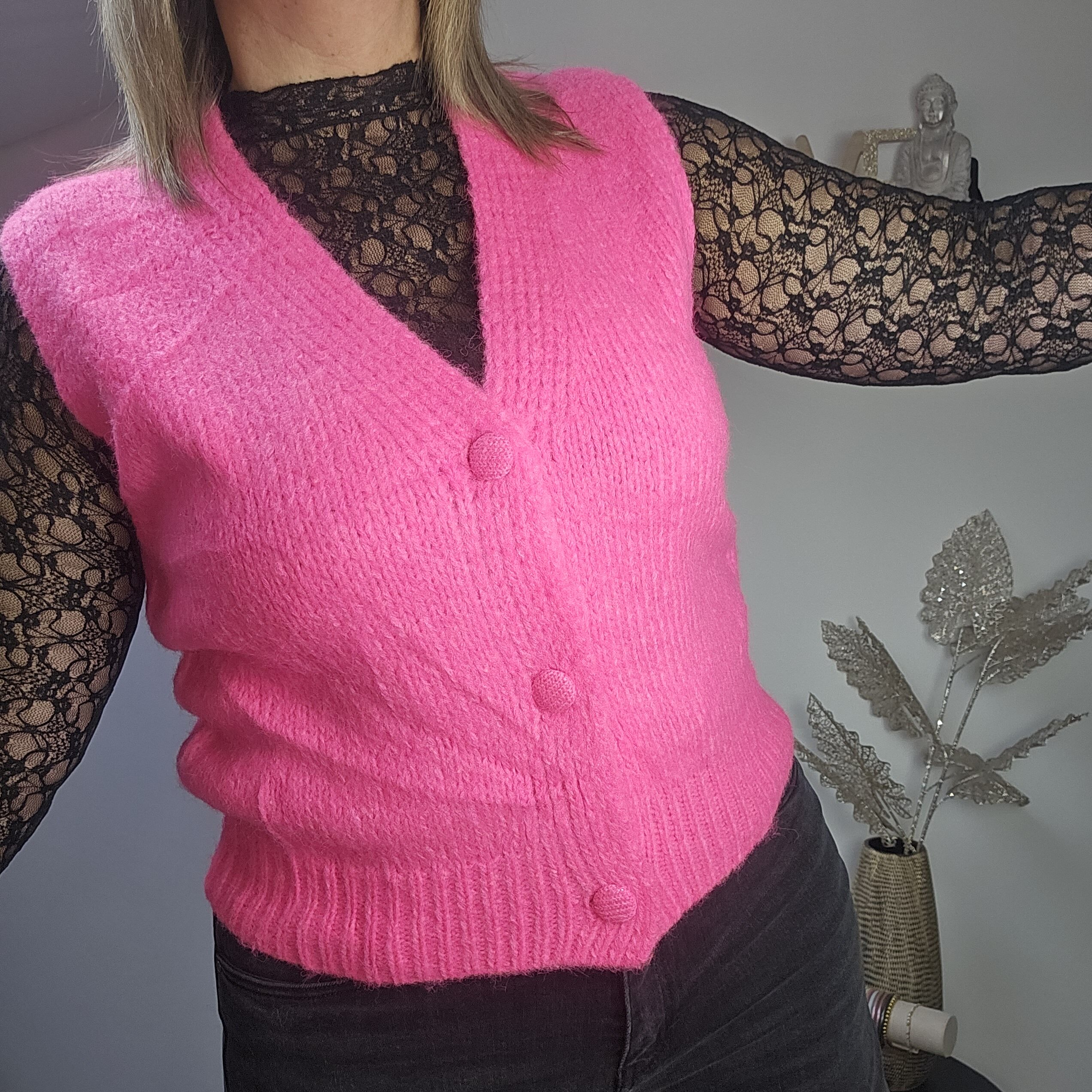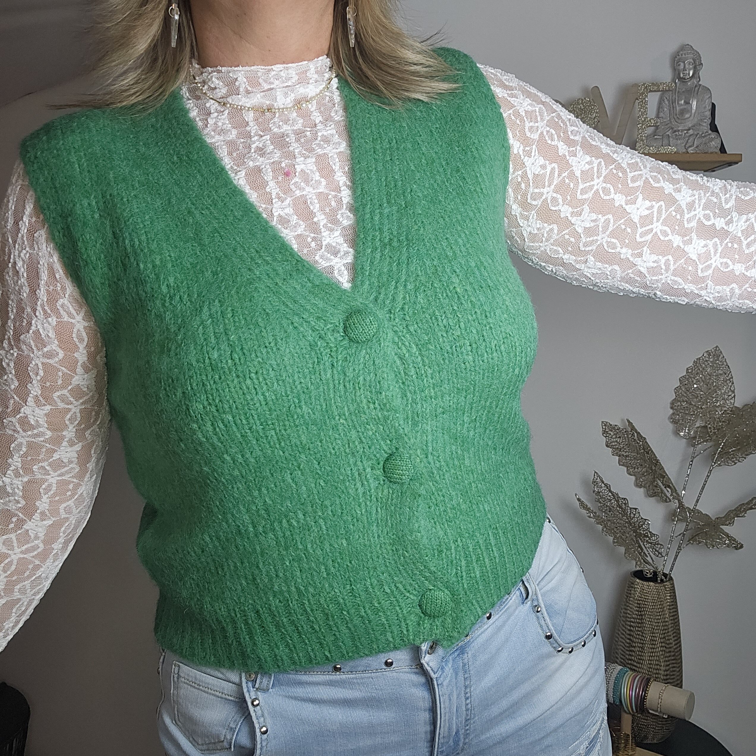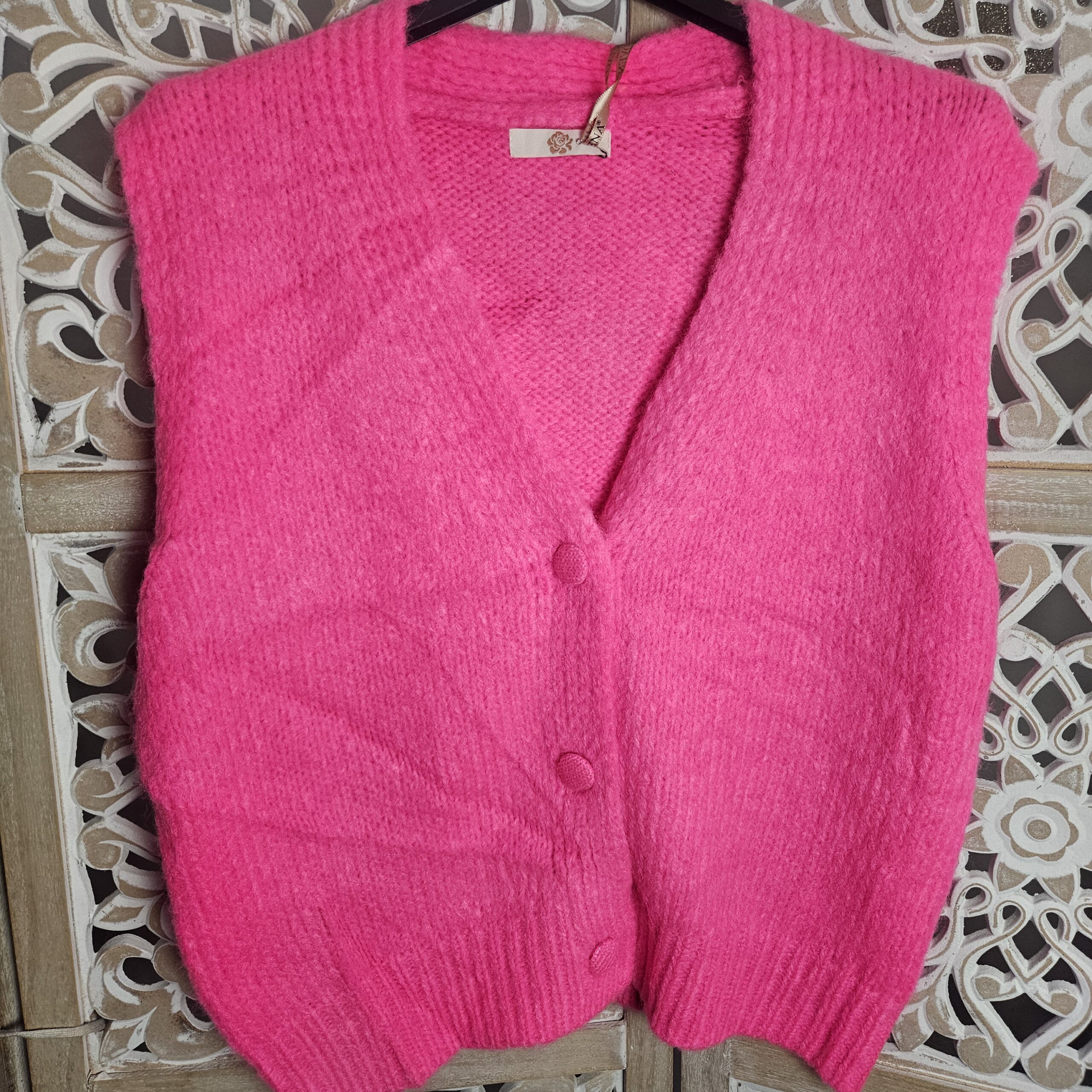 Gilet cintré sans manches avec 3 boutons devant, col V, chaud et très doux, ne pique absolument pas ! Existe en orange fluo, fuchsia fluo, vert Gucci, violet, taupe et noir. Peut se porter seul ou avec une mousseline.