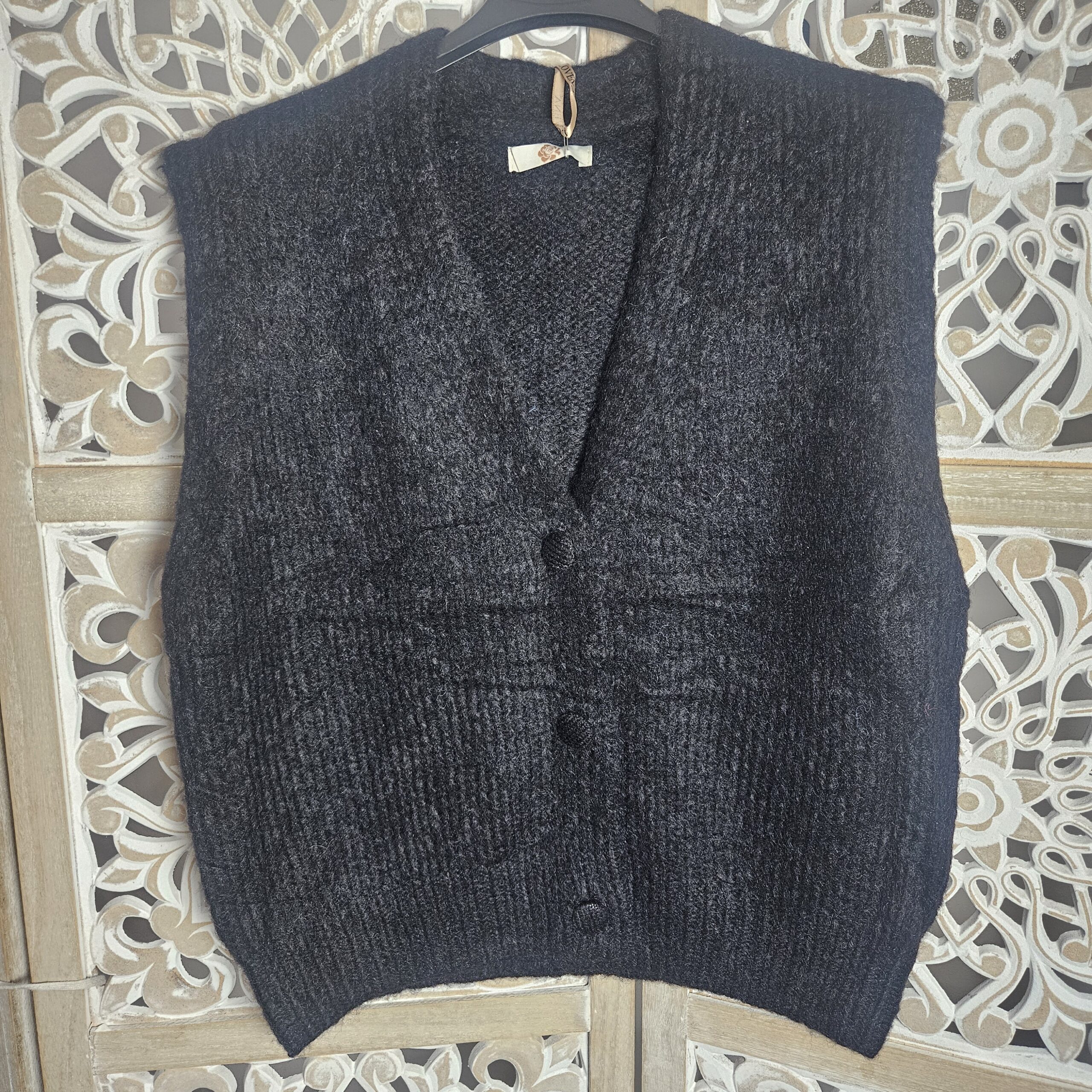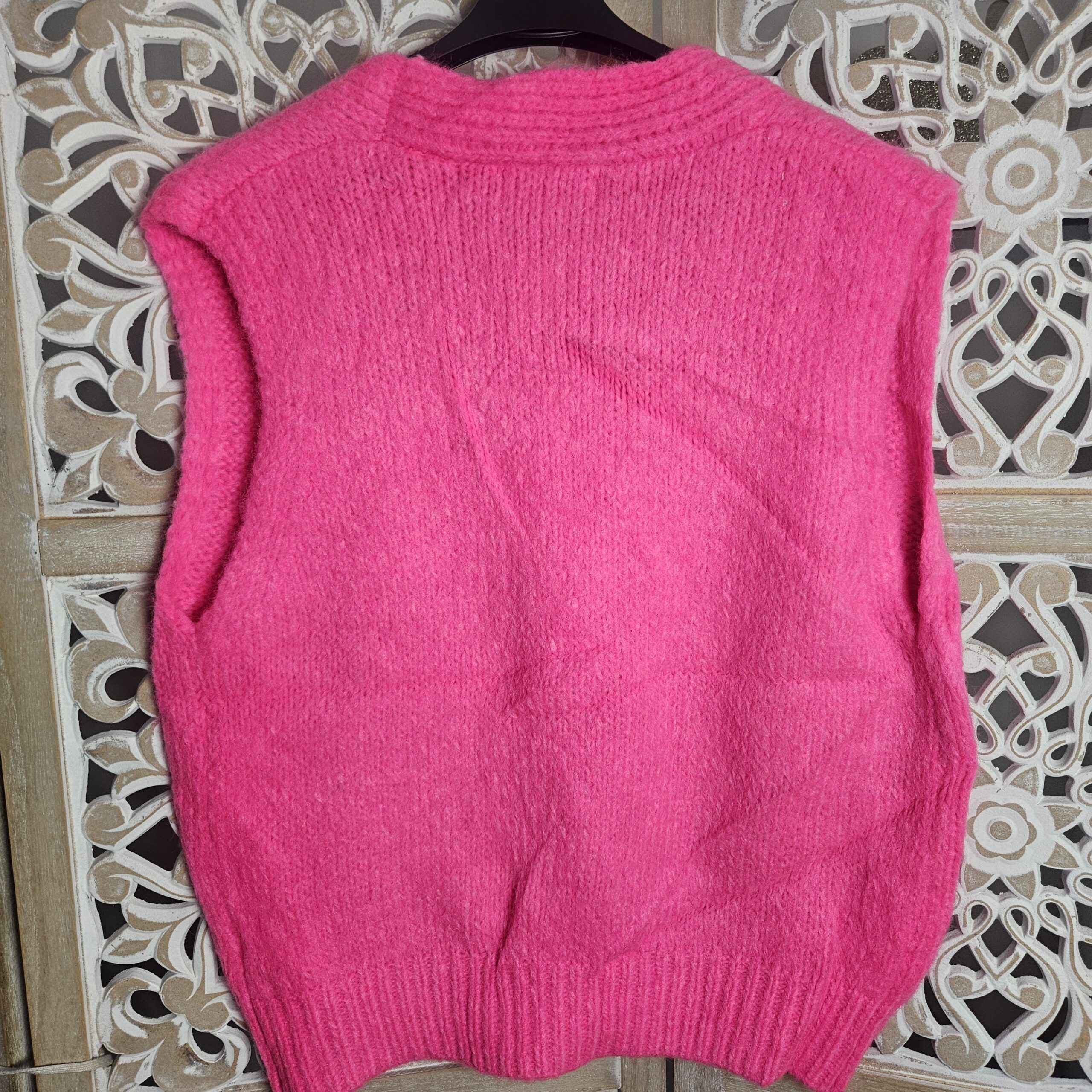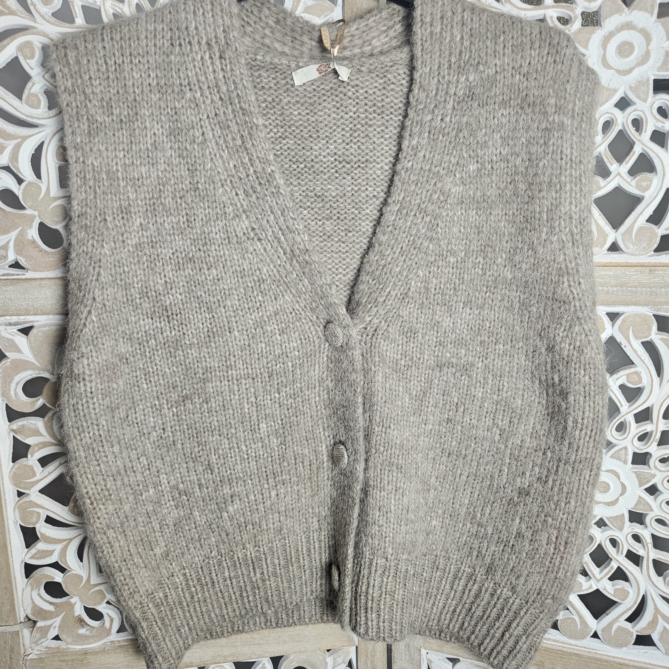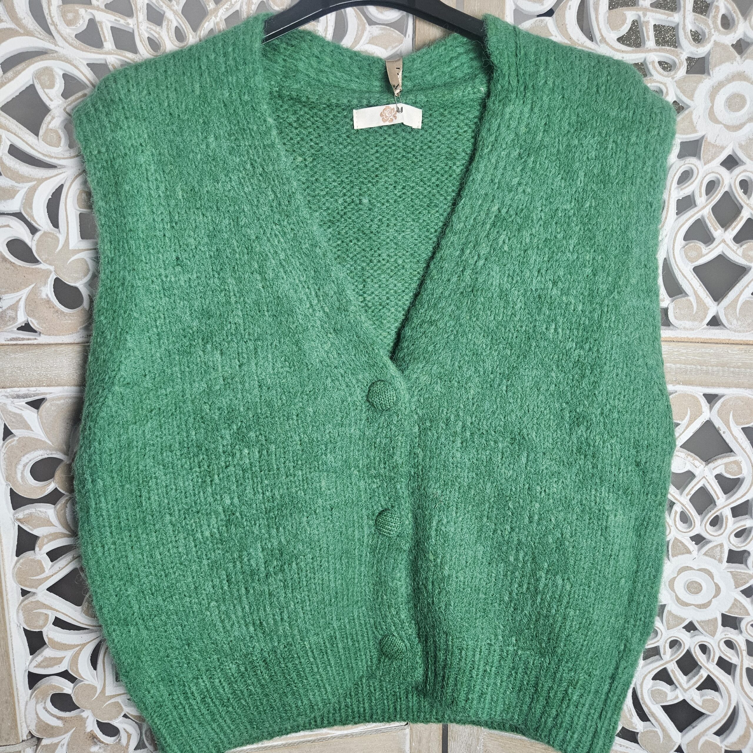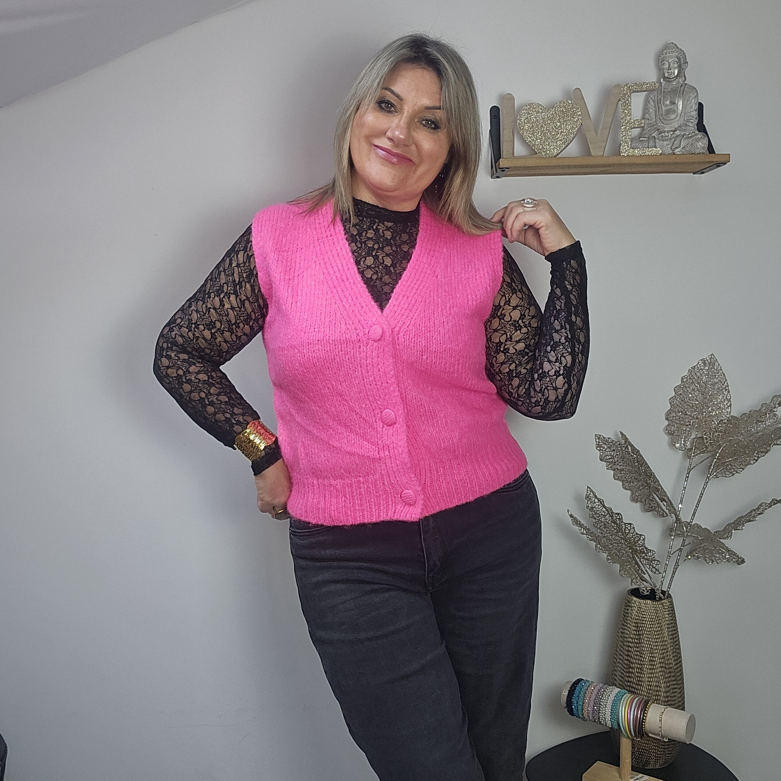 Gilet cintré sans manches avec 3 boutons devant, col V, chaud et très doux, ne pique absolument pas ! Existe en orange fluo, fuchsia fluo, vert Gucci, violet, taupe et noir. Peut se porter seul ou avec une mousseline.