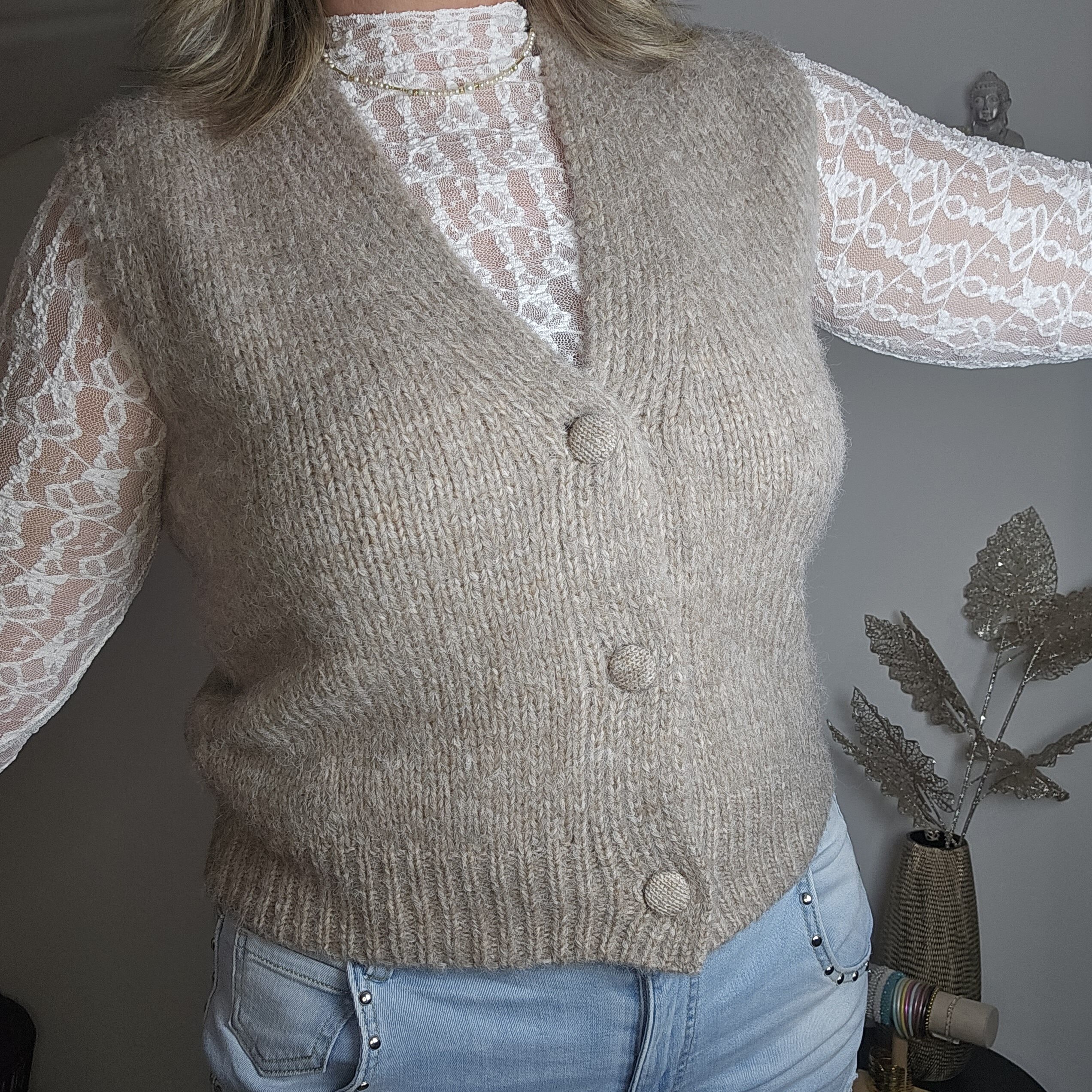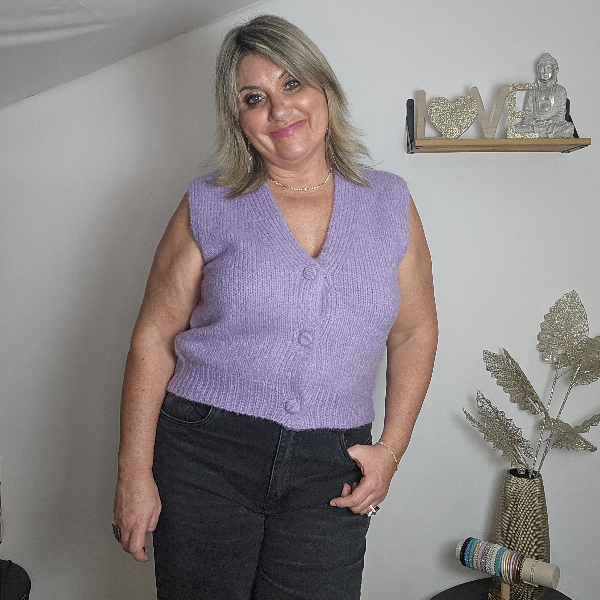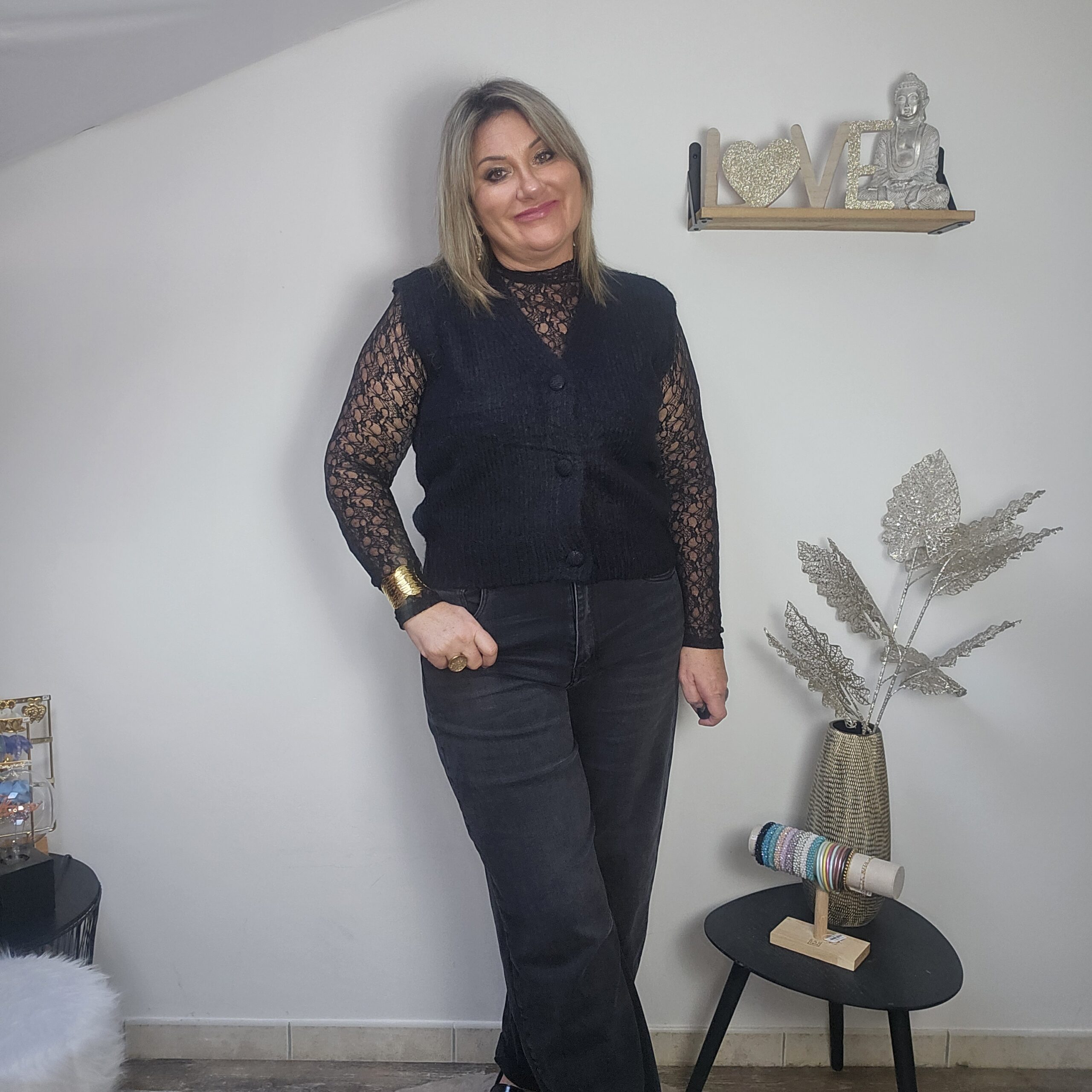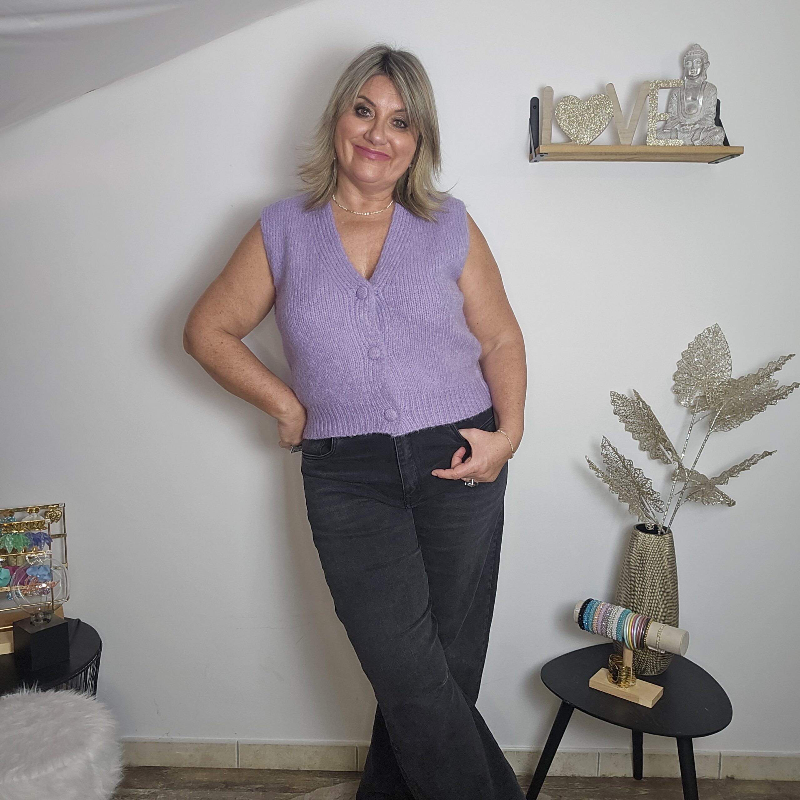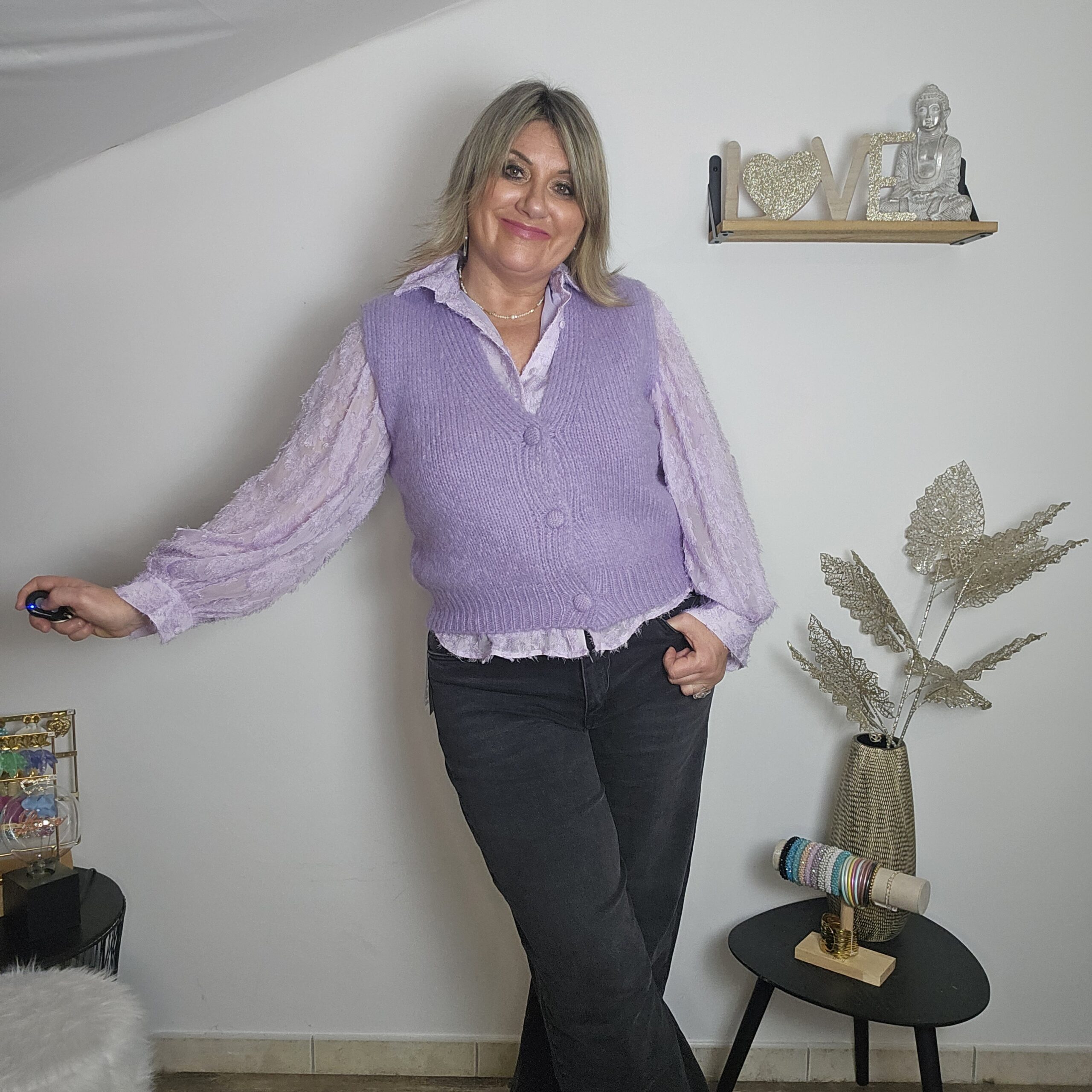 Mon regard pailleté : Gilet très doux, peut se porter avec une mousseline en dentelle à manches longues, ou une chemise, accompagné d’un pantalon, un jean ou une jupe.