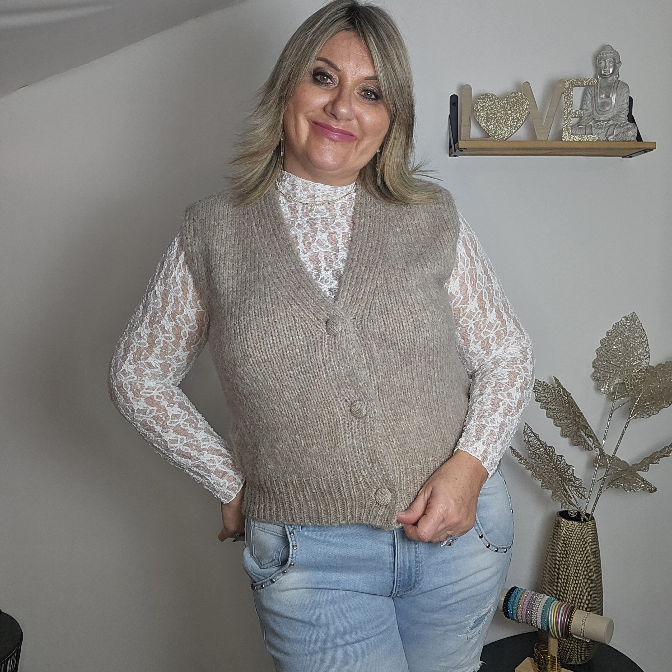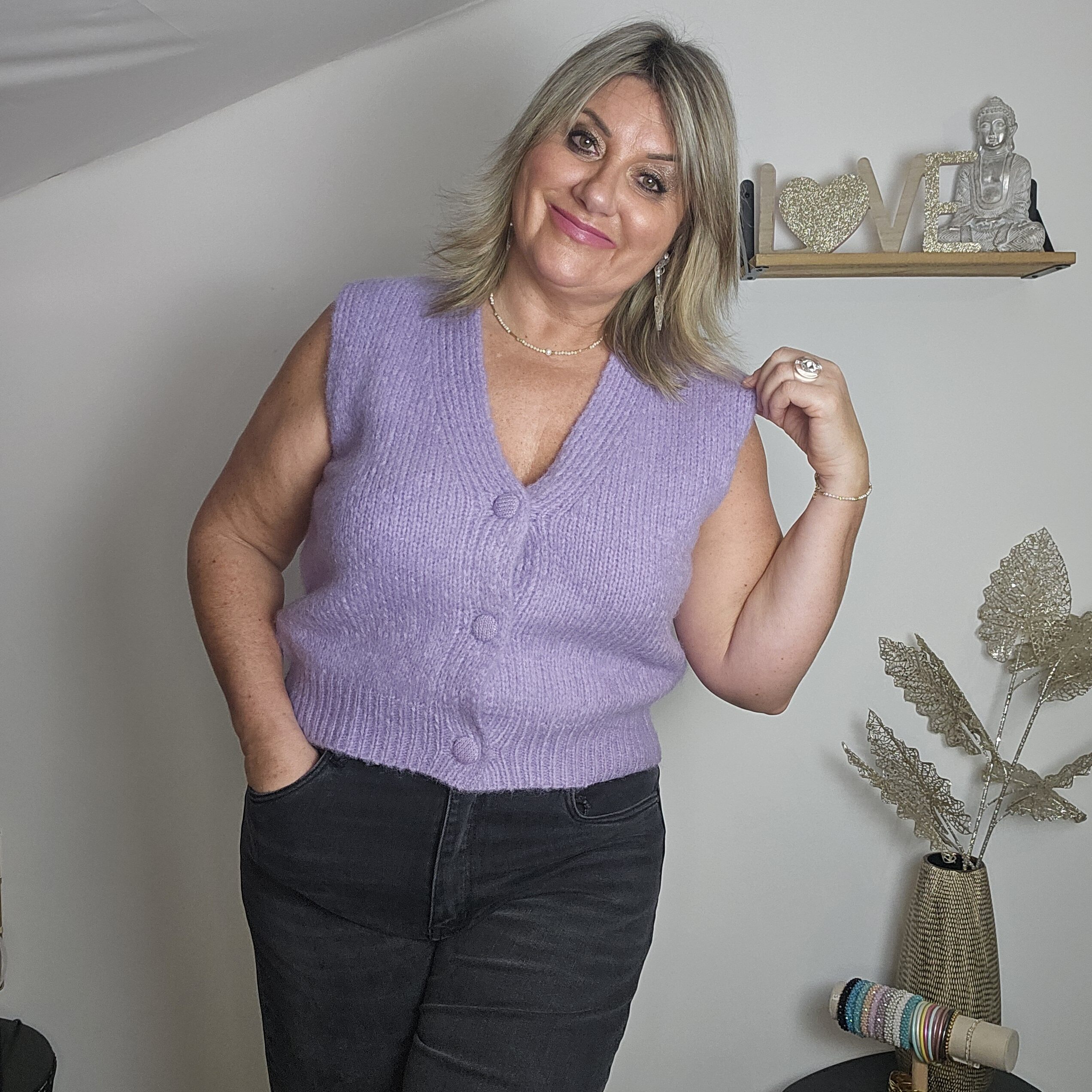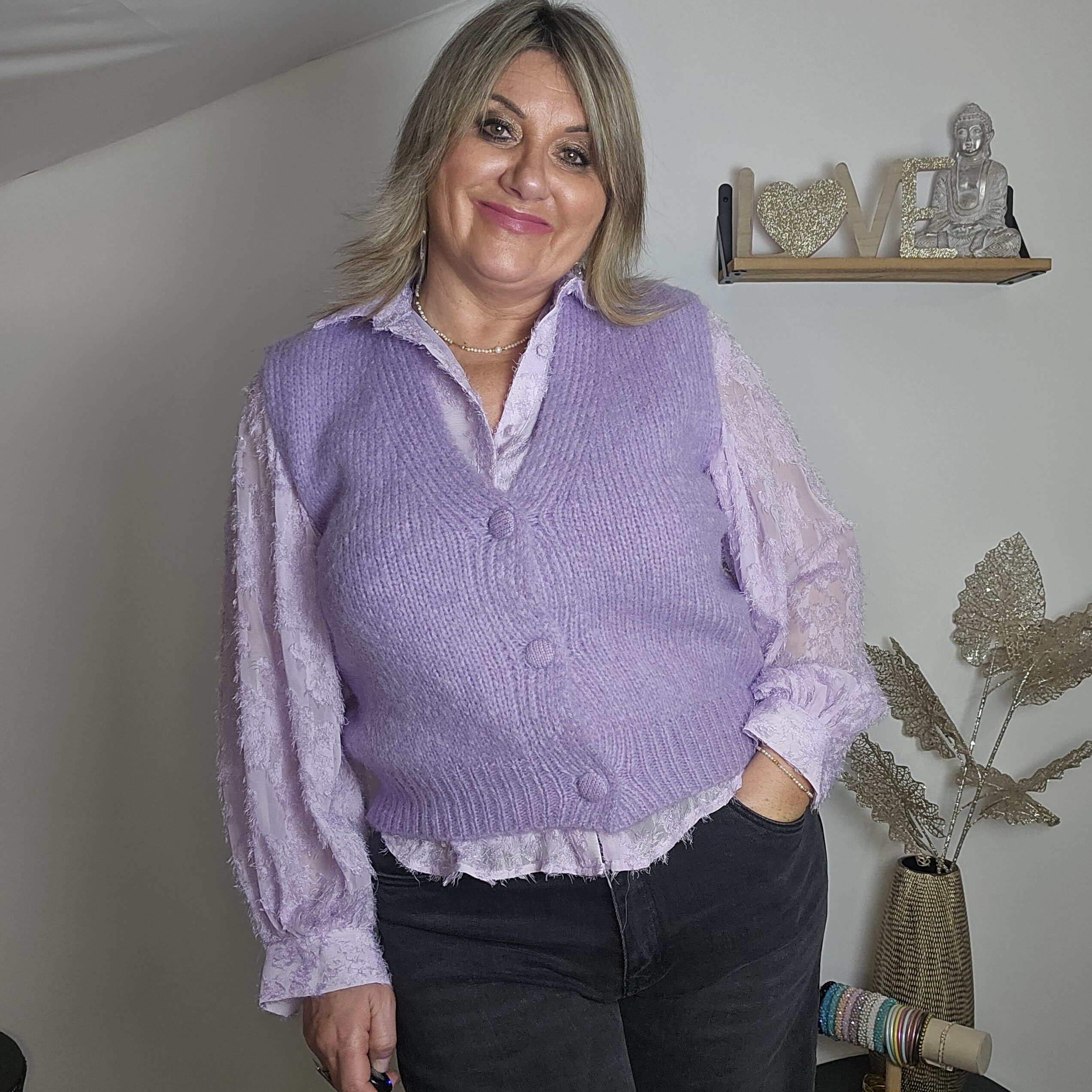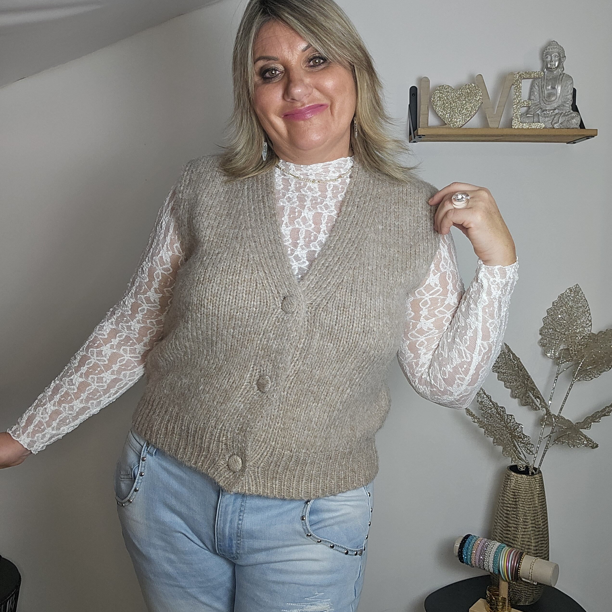Mon regard pailleté : Gilet très doux, peut se porter avec une mousseline en dentelle à manches longues, ou une chemise, accompagné d’un pantalon, un jean ou une jupe.