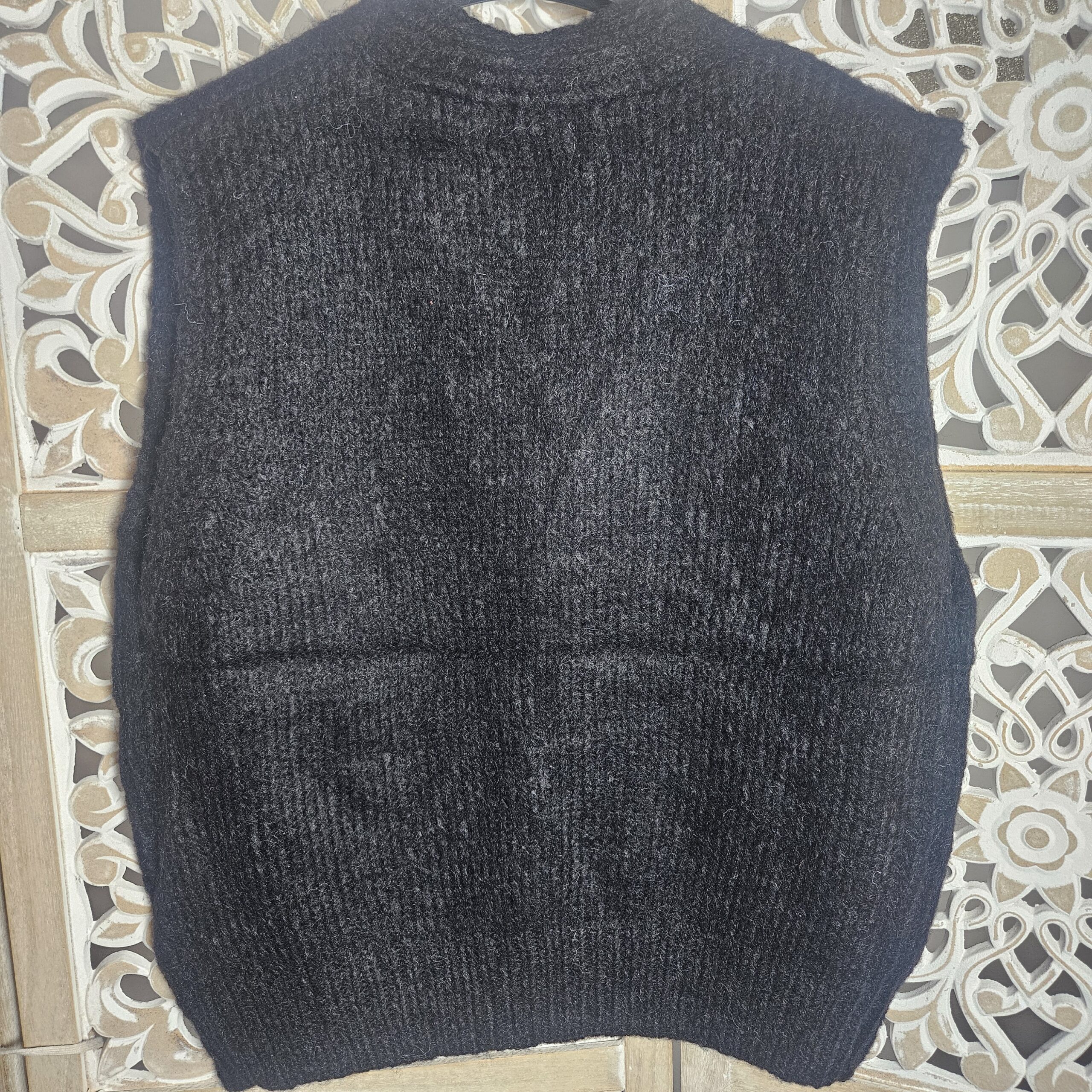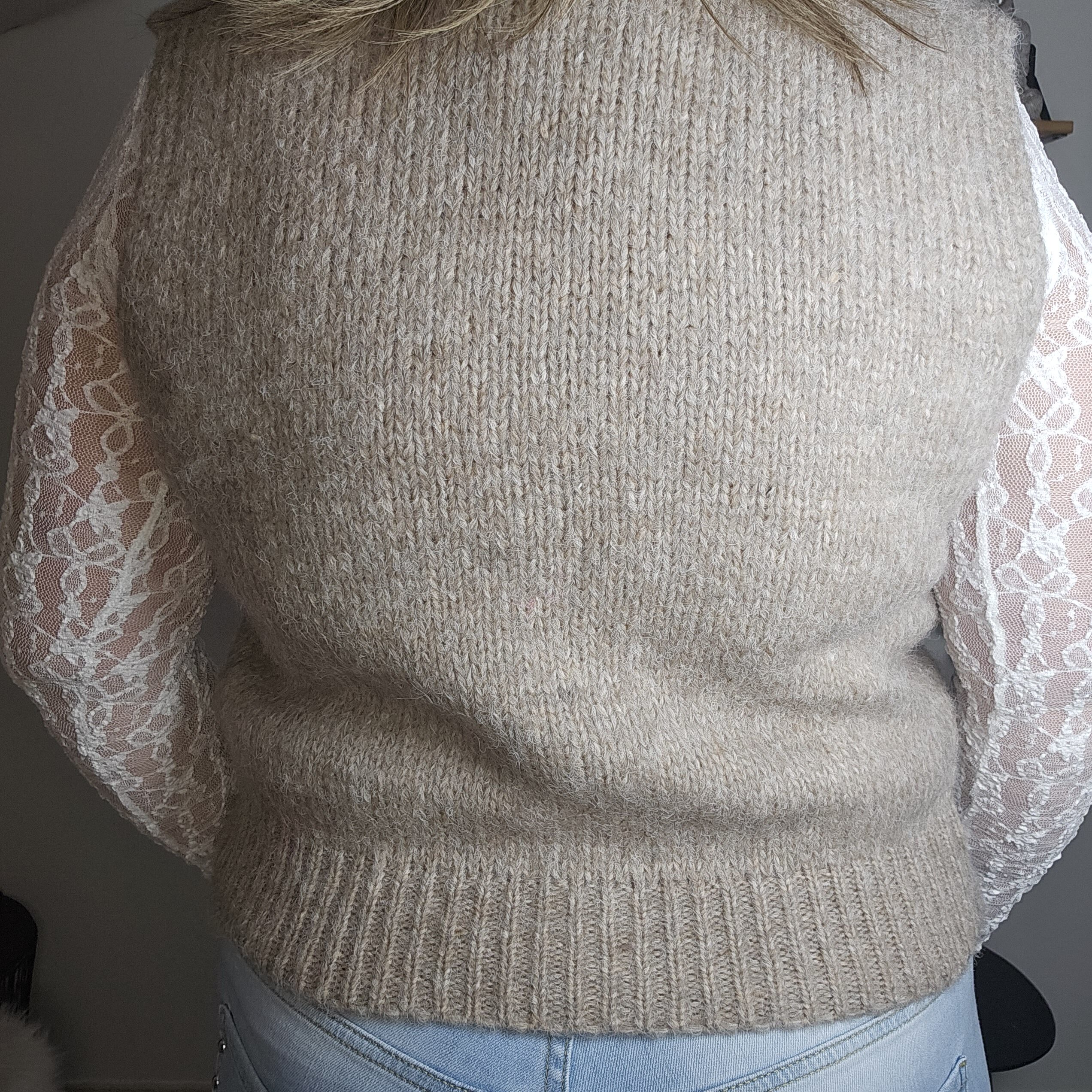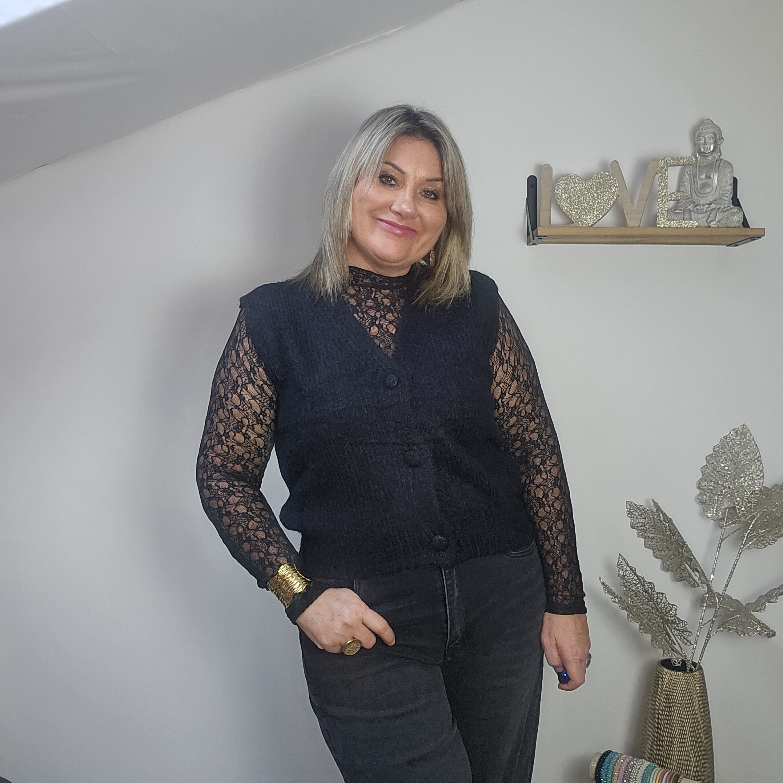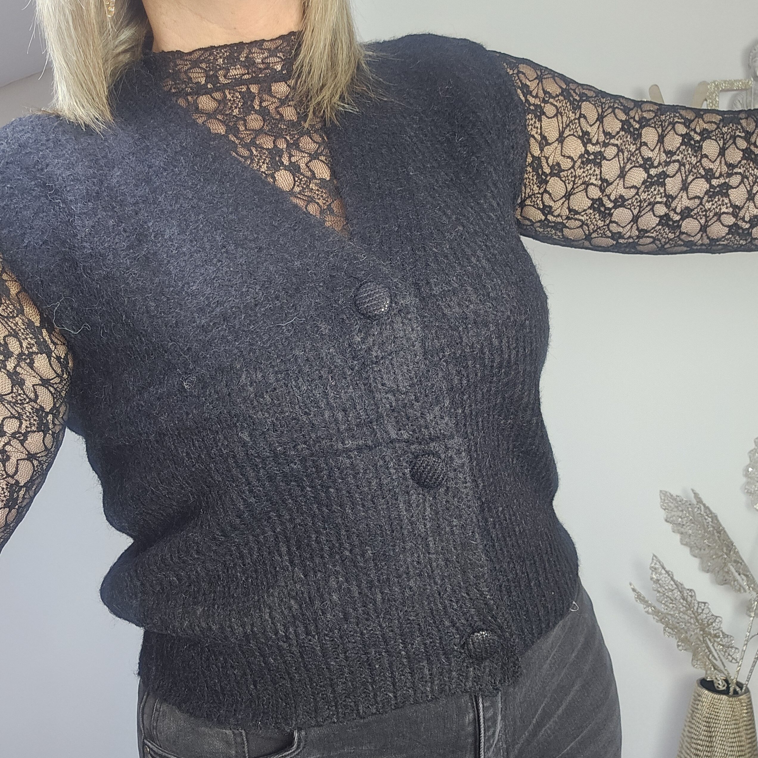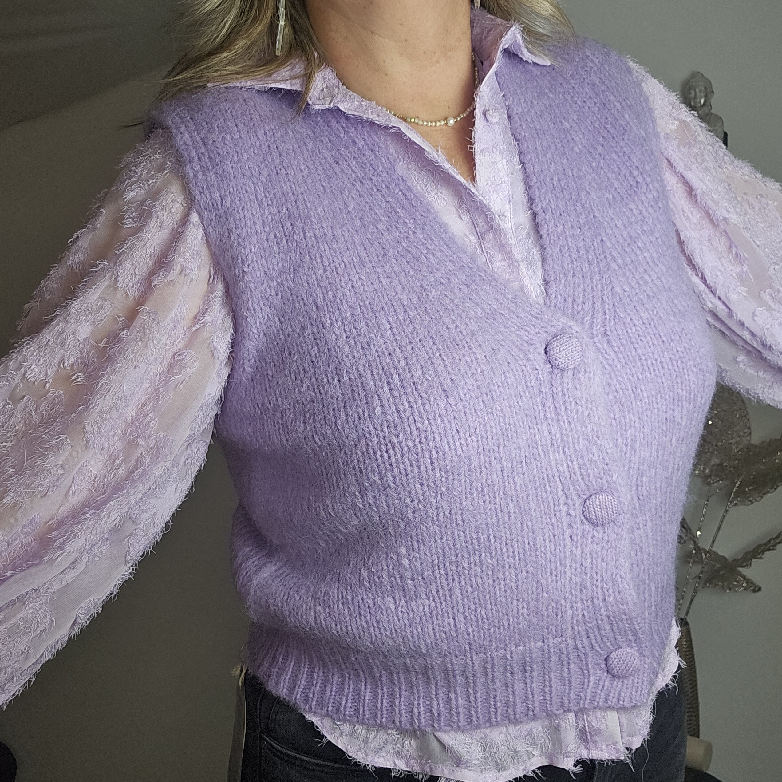 Mon regard pailleté : Gilet très doux, peut se porter avec une mousseline en dentelle à manches longues, ou une chemise, accompagné d’un pantalon, un jean ou une jupe.
