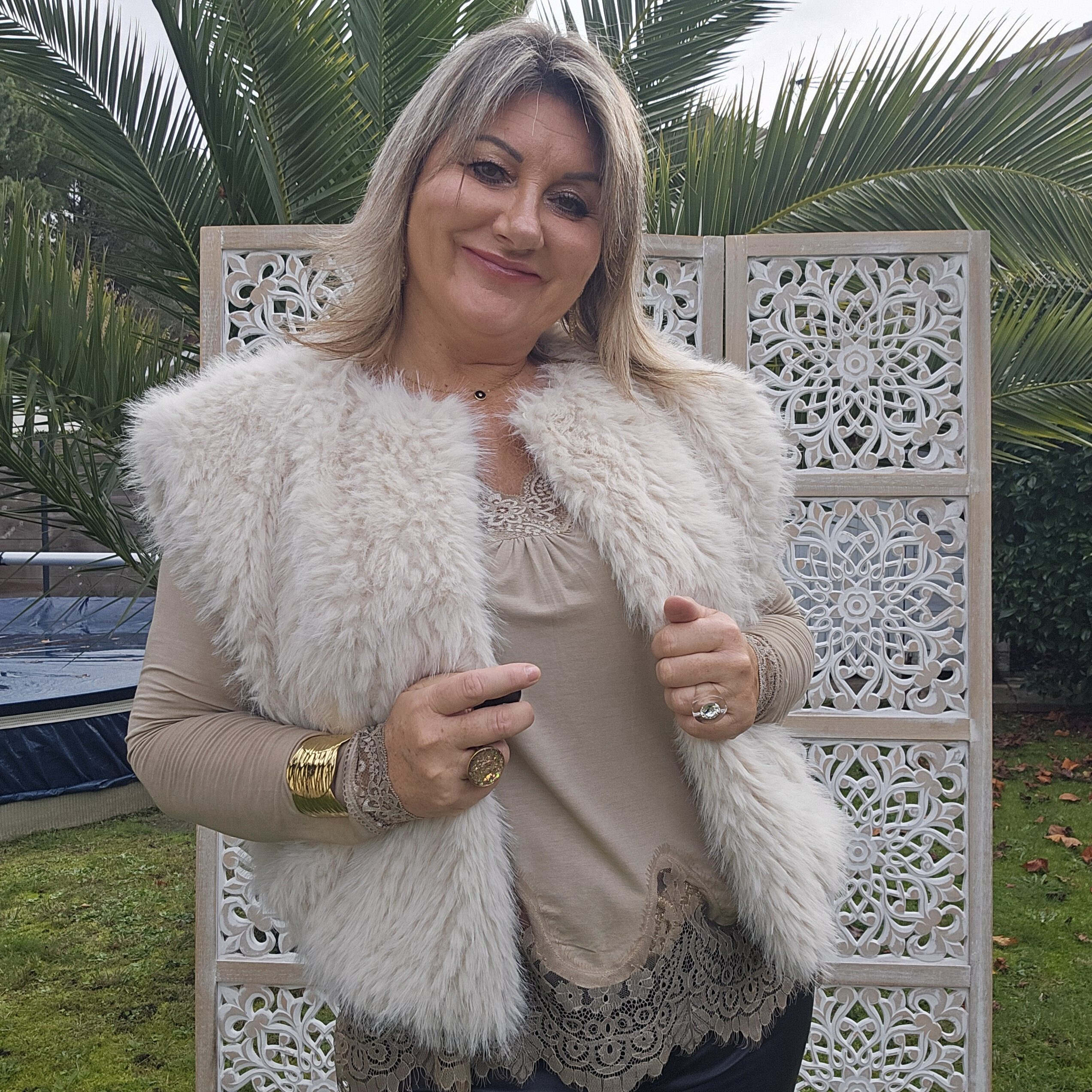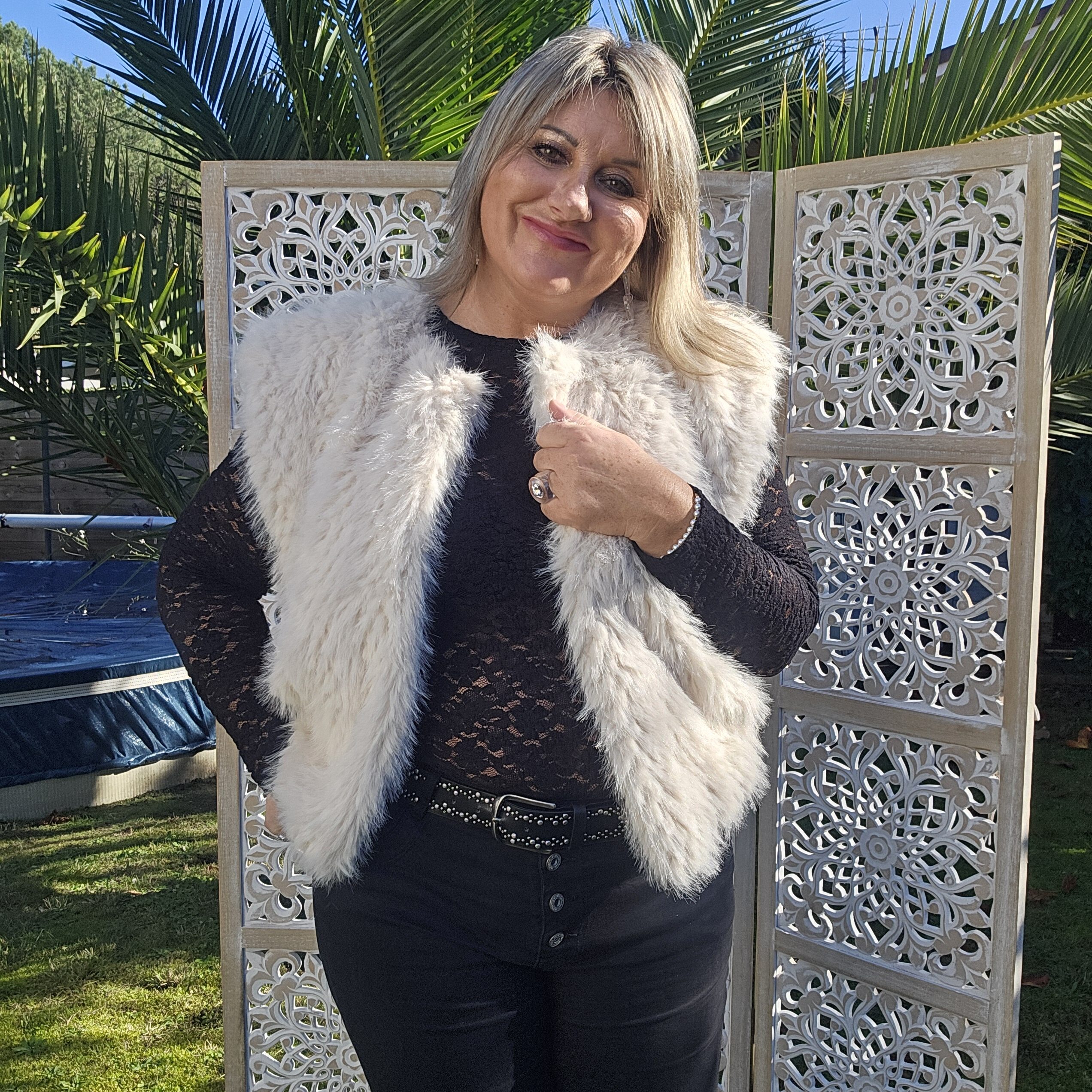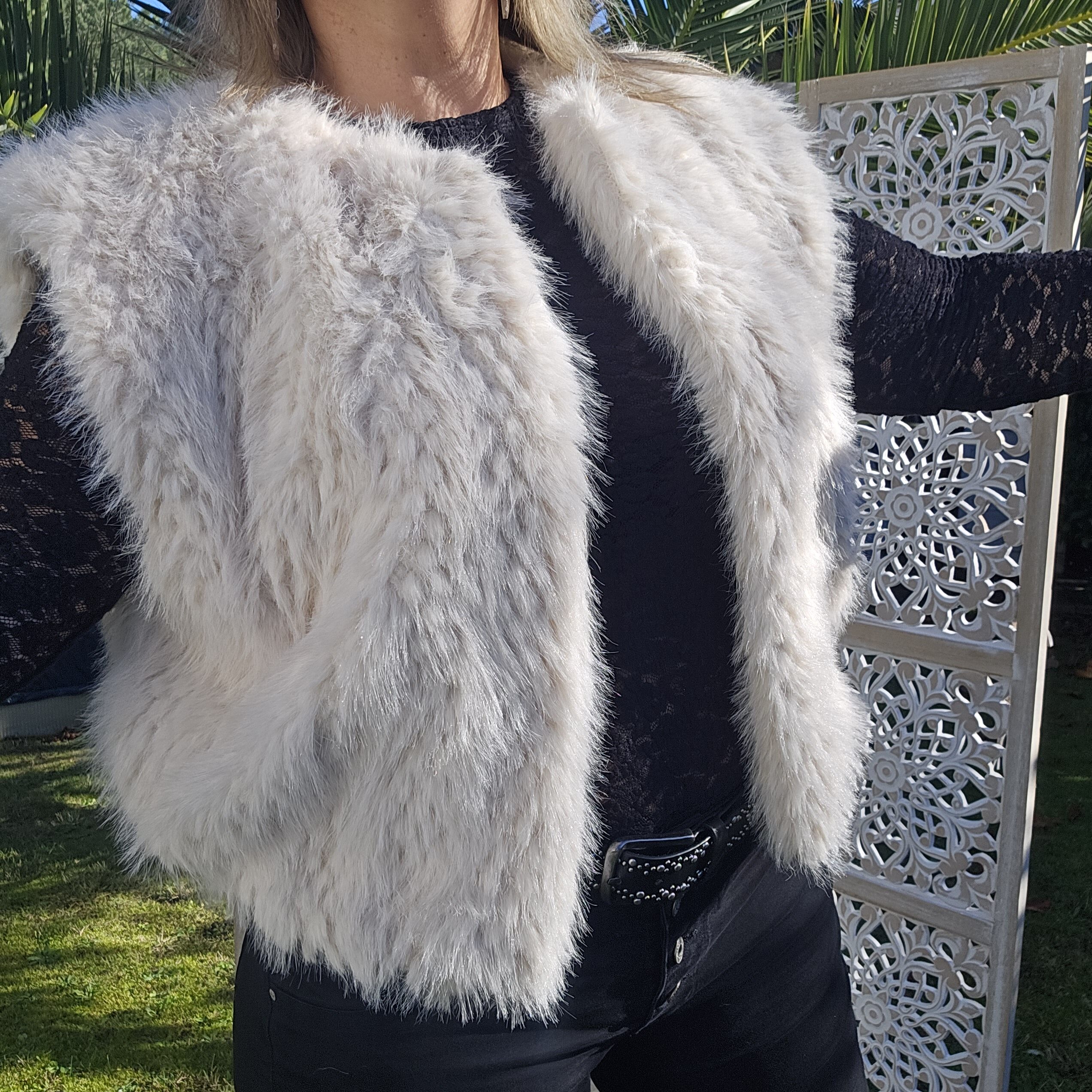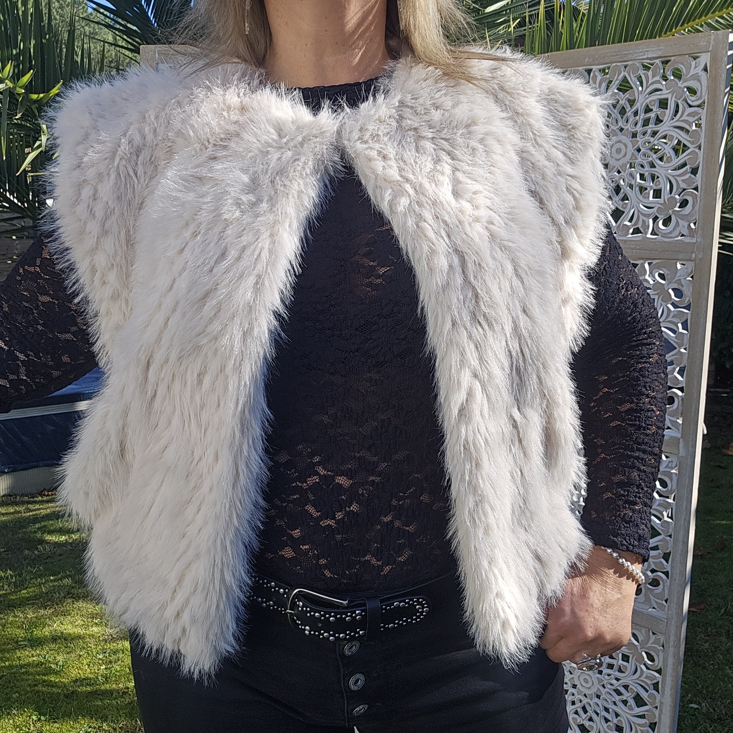 Gilet sans manches en fausse fourrure couleur écru. Fourrure de haute qualité. Col rond, 2 poches sur le côté, doublé. Un crochet en haut pour le fermer. Très doux et très chaud, à mettre sur un chemisier, une blouse, un pull, ou une mousseline. TU