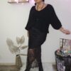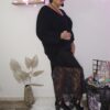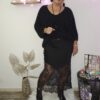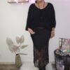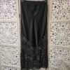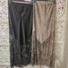 Jupe longue, la jonction entre le tissu et la dentelle est en pointe sur le devant avec la dentelle en bas, plus court sur les côtés . Elastique à la taille. Existe en noir et marron. TU.