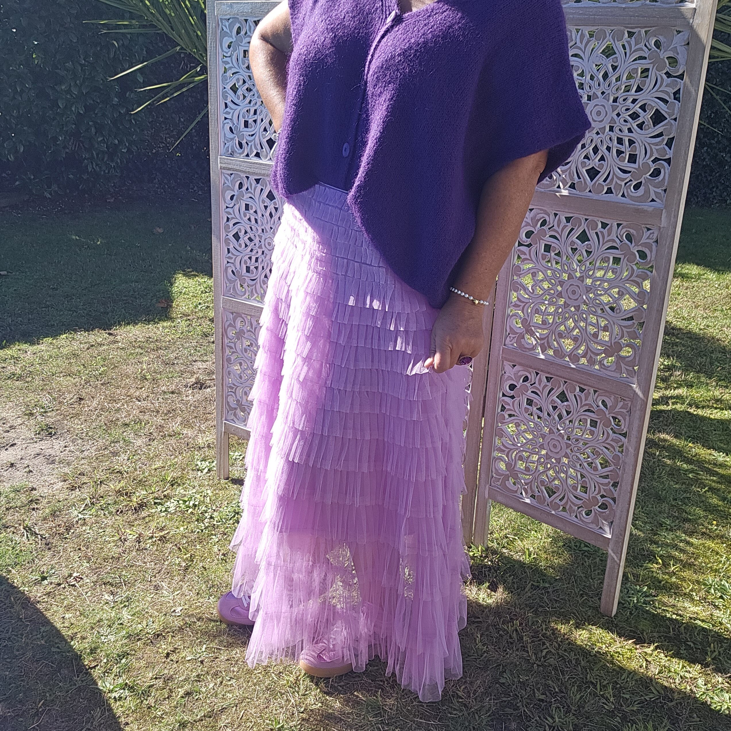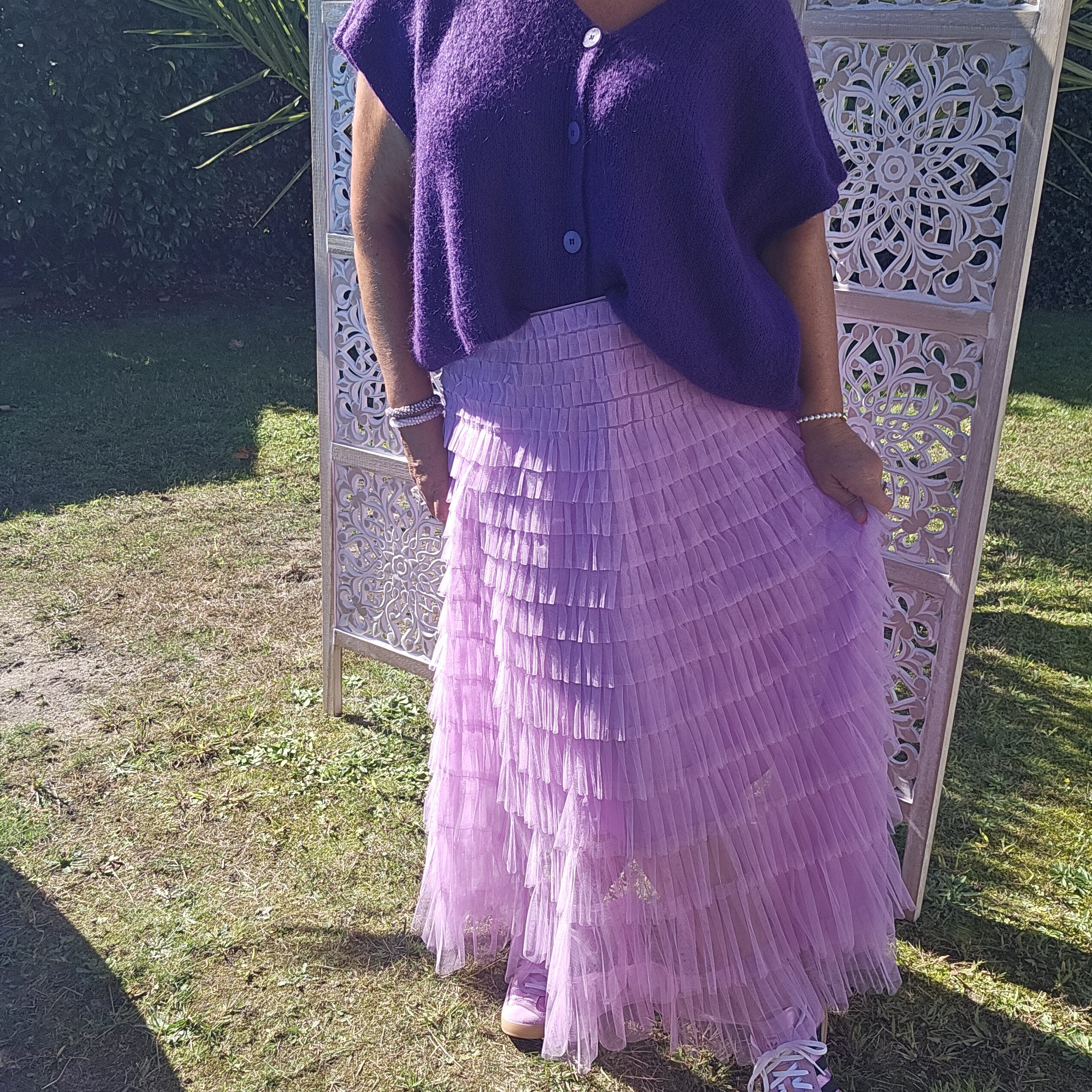 Jupe longue en tulle froufrou, doublure jusqu’à sous le genou, TU. Existe en camel et violette.