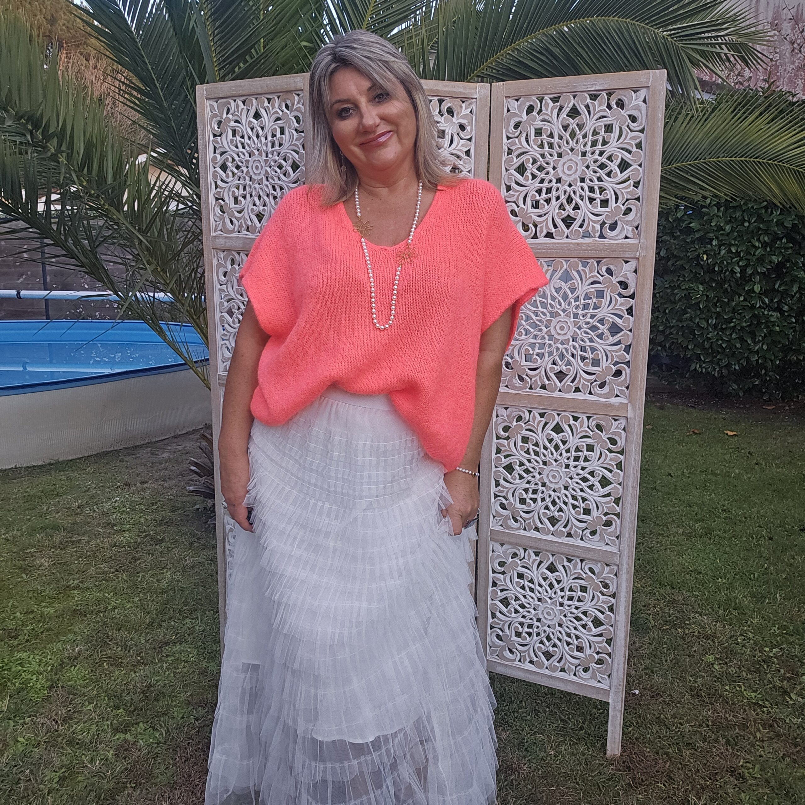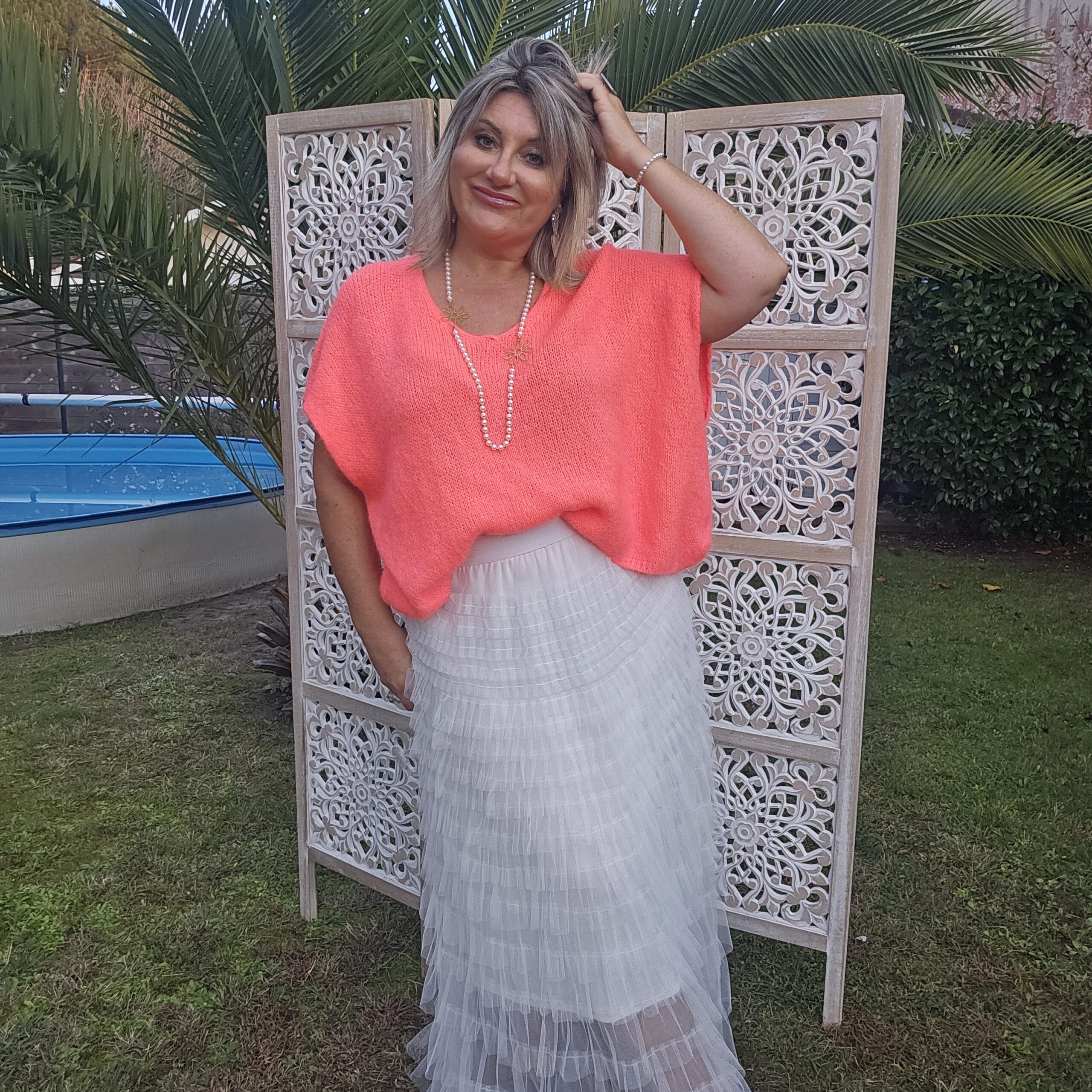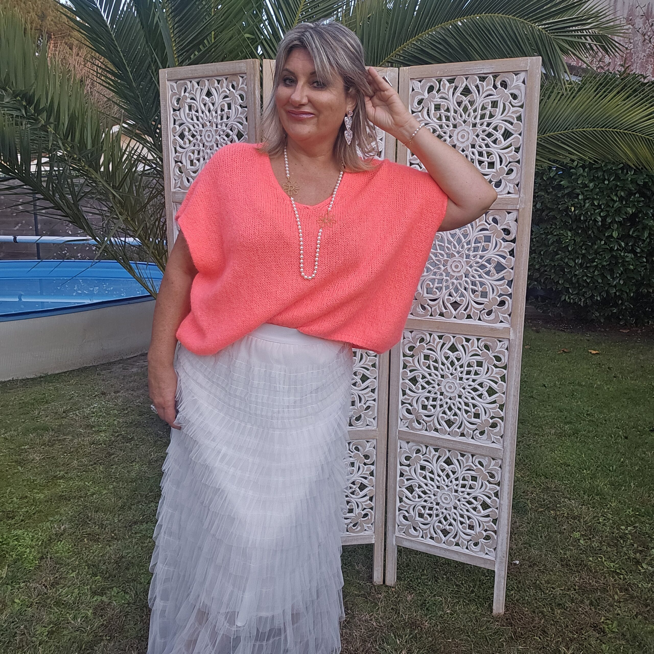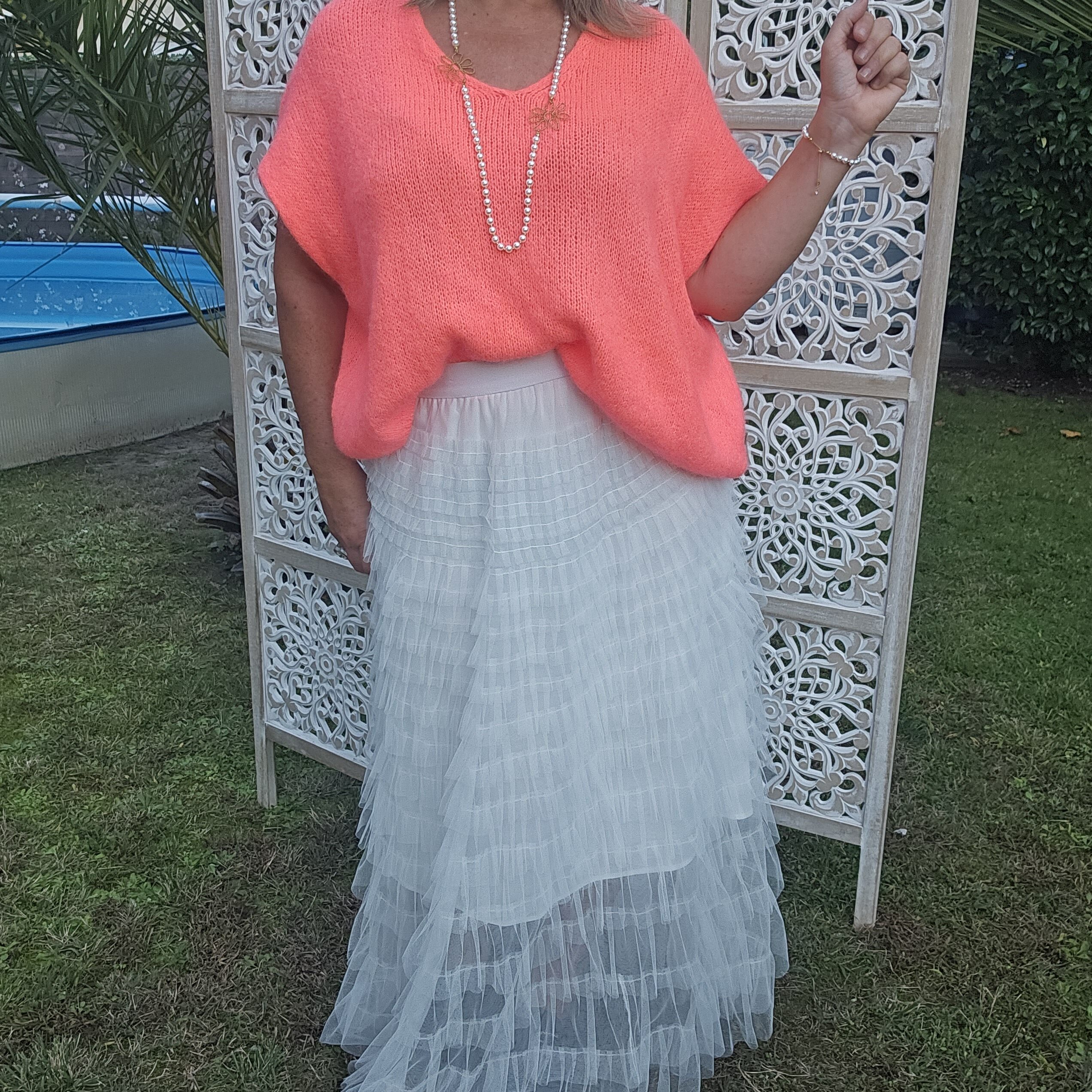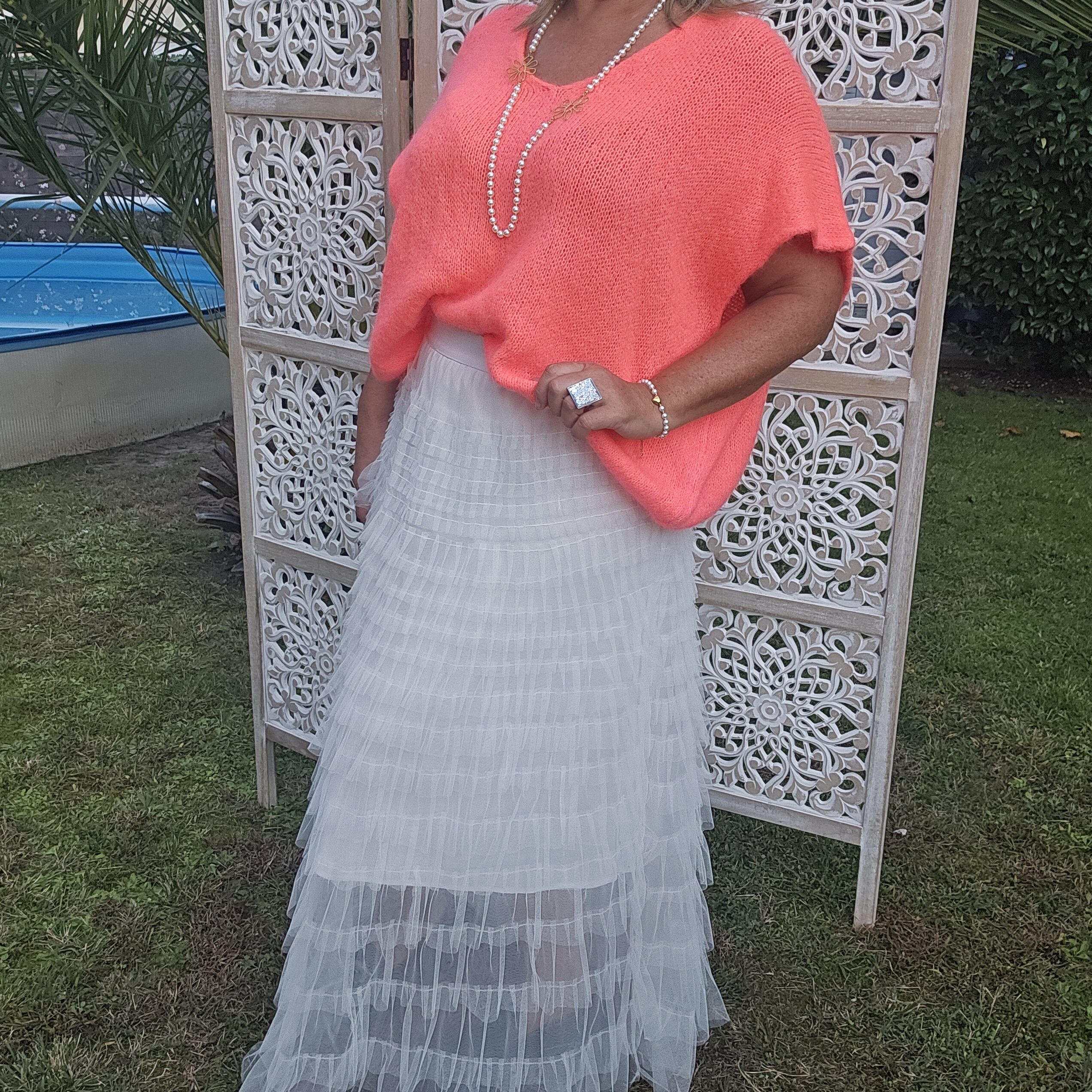 Jupe longue en tulle froufrou blanche, élastique à la taille, doublure jusqu’à sous le genou.