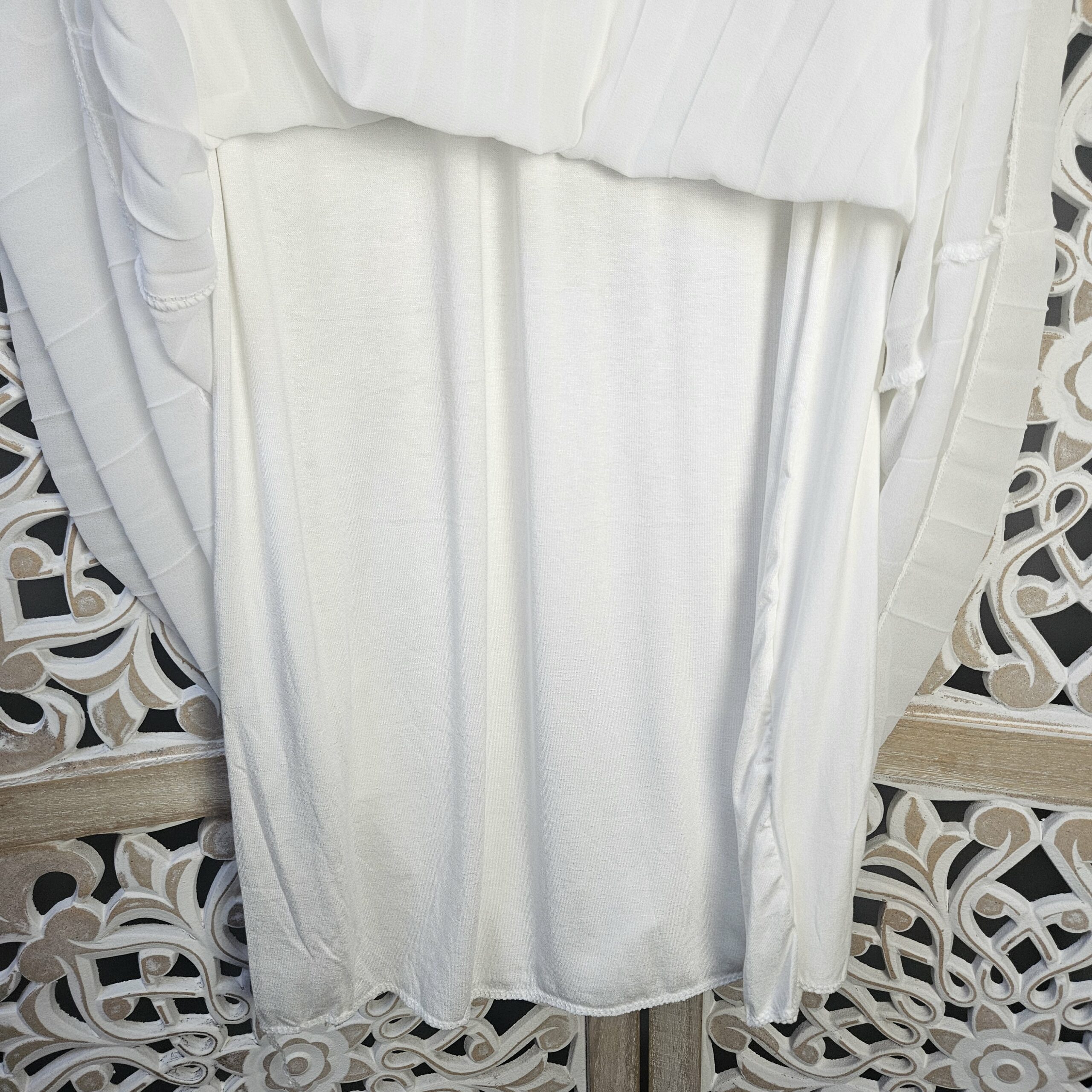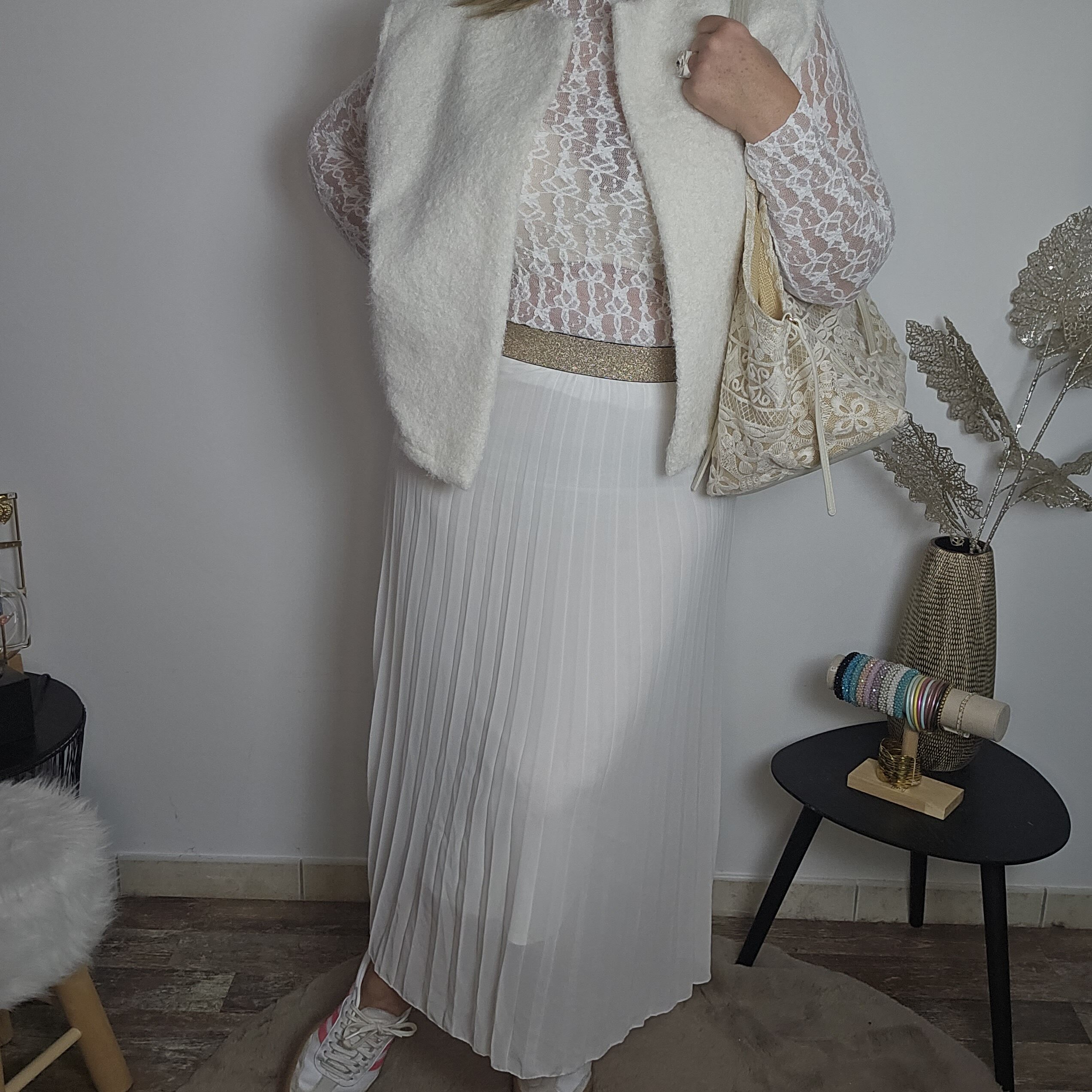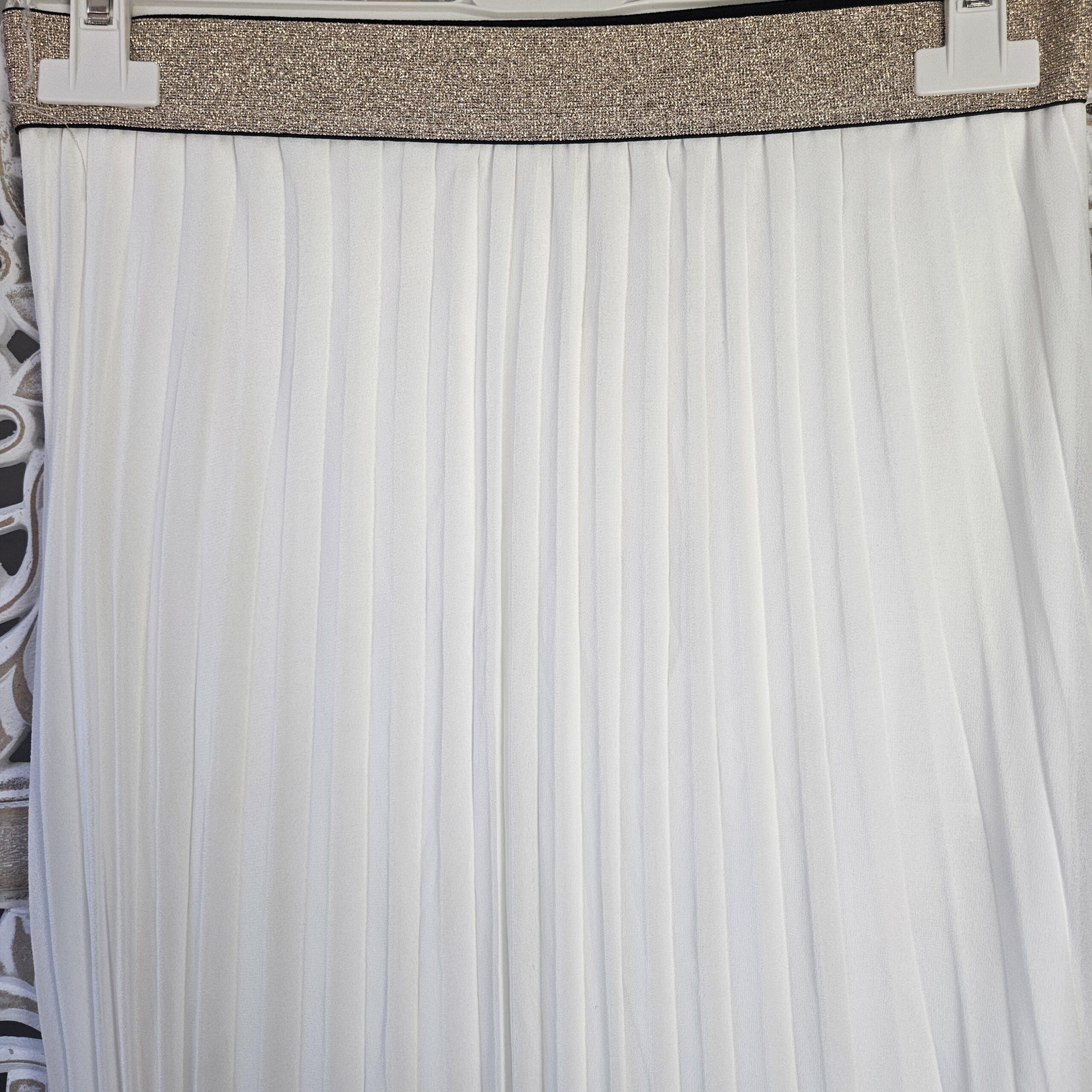 Jupe longue plissée blanche, élastique doré à la taille, TU.