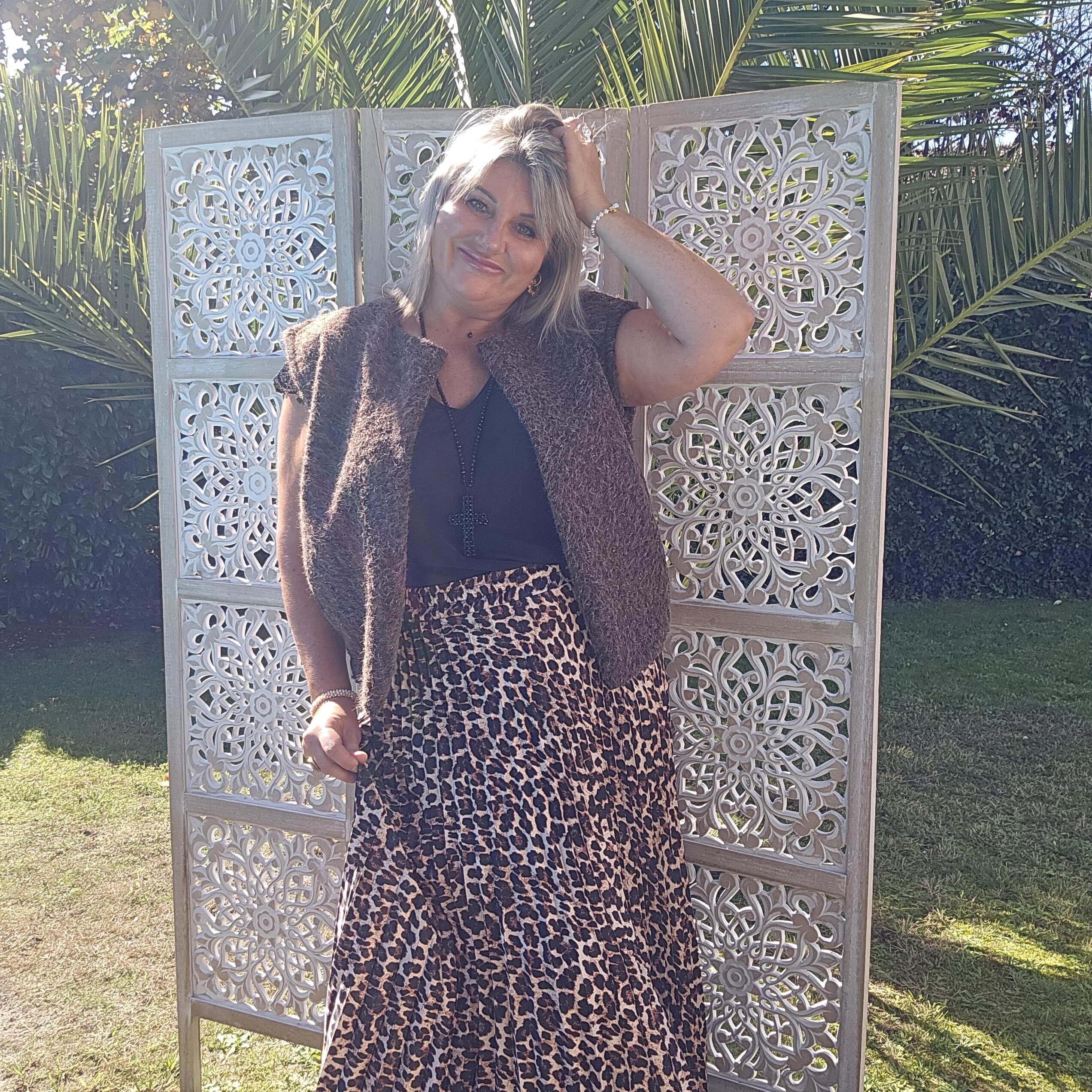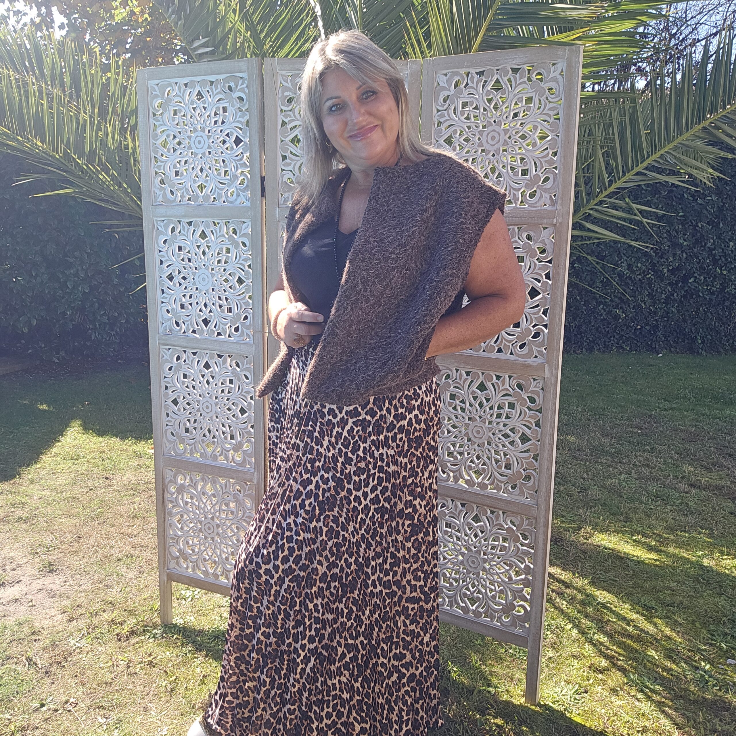 Jupe longue plissée léopard, légèrement satinée, élastique à la taille, très fluide et légère. Intemporelle ! TU.