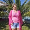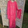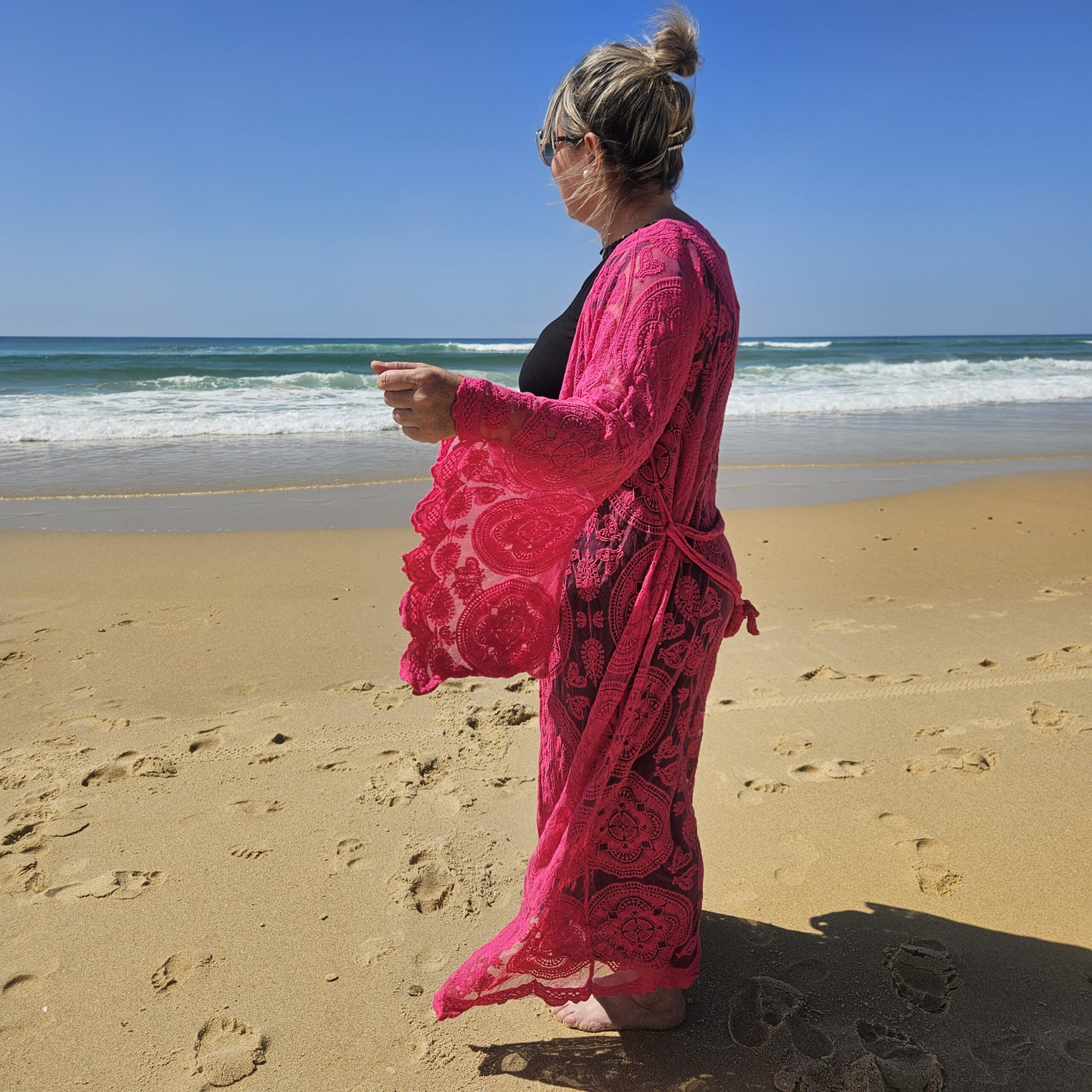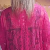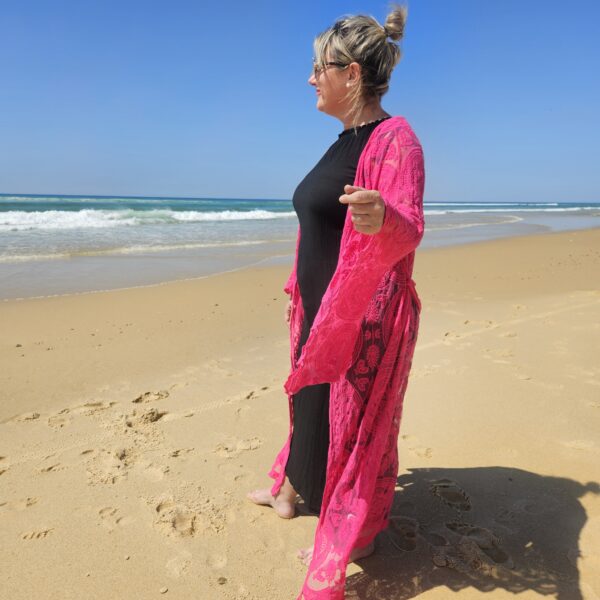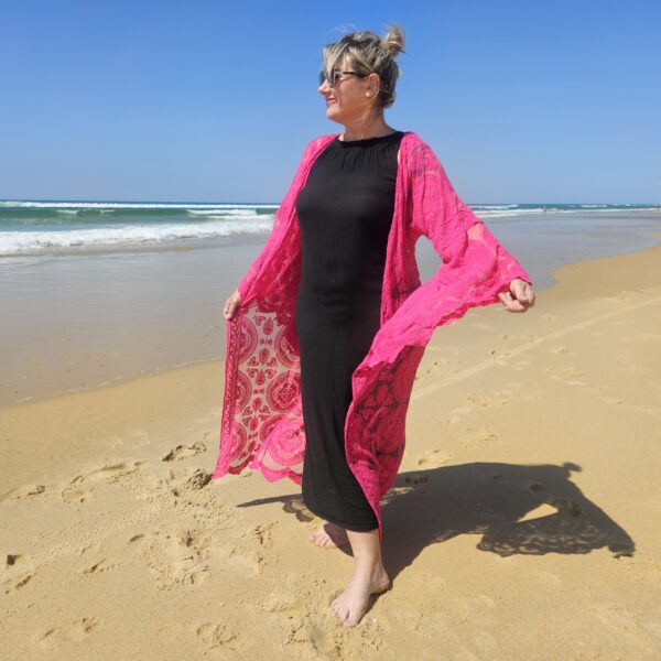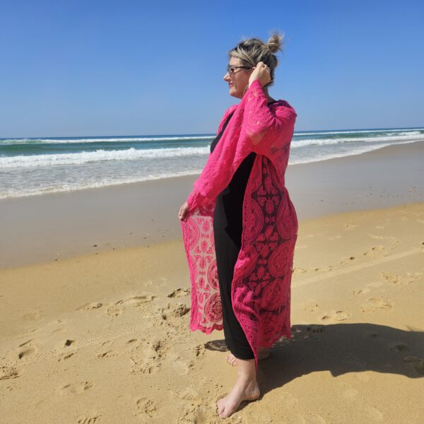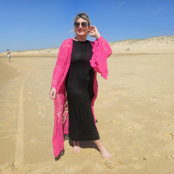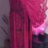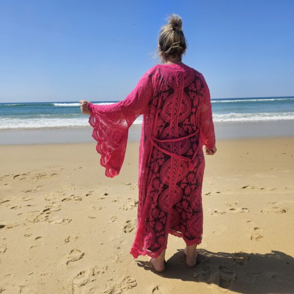Kimono rose en dentelle, manches évasées, ceinture, TU.