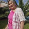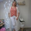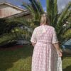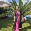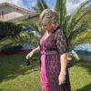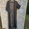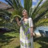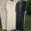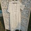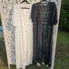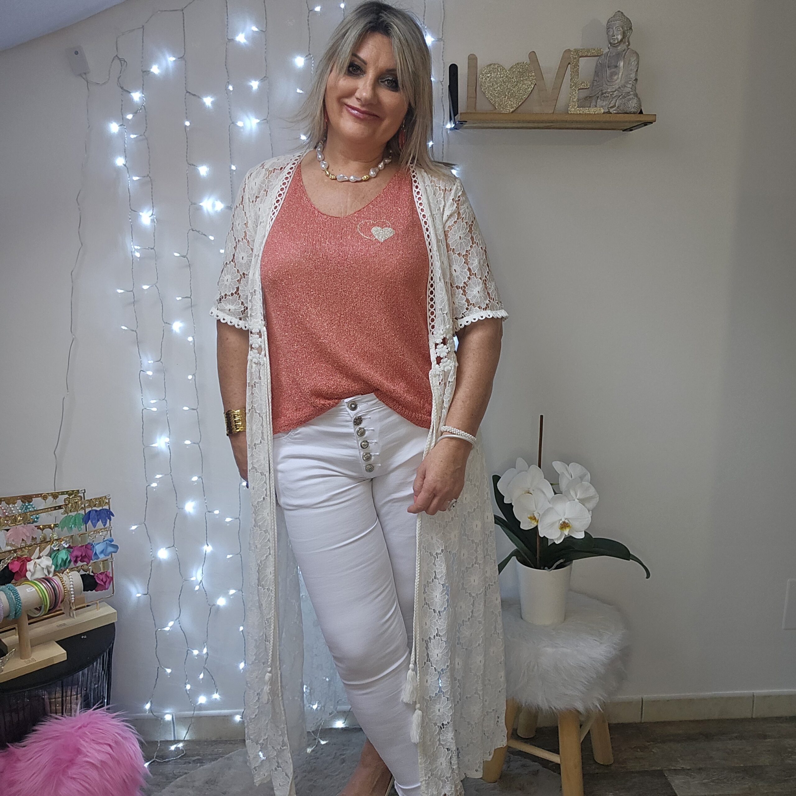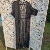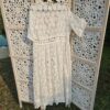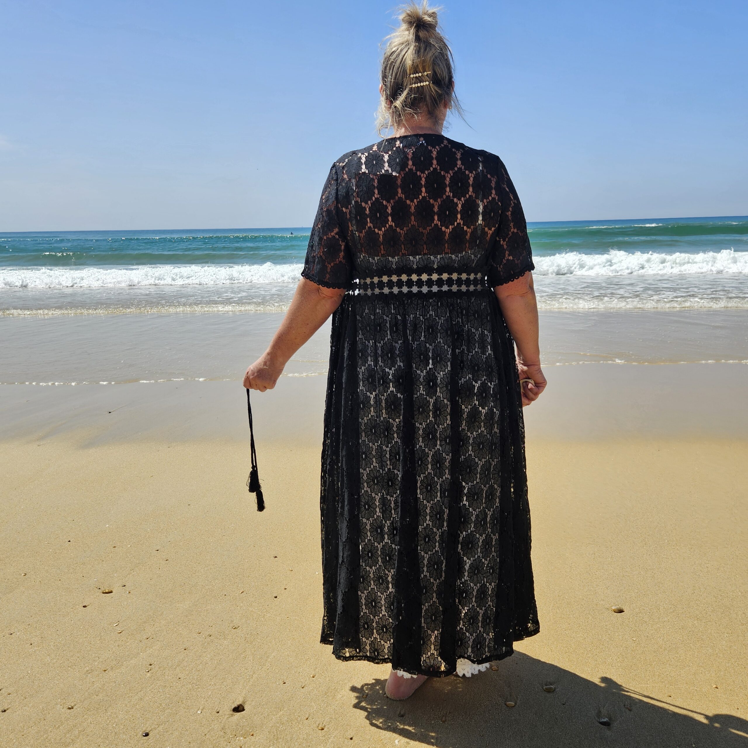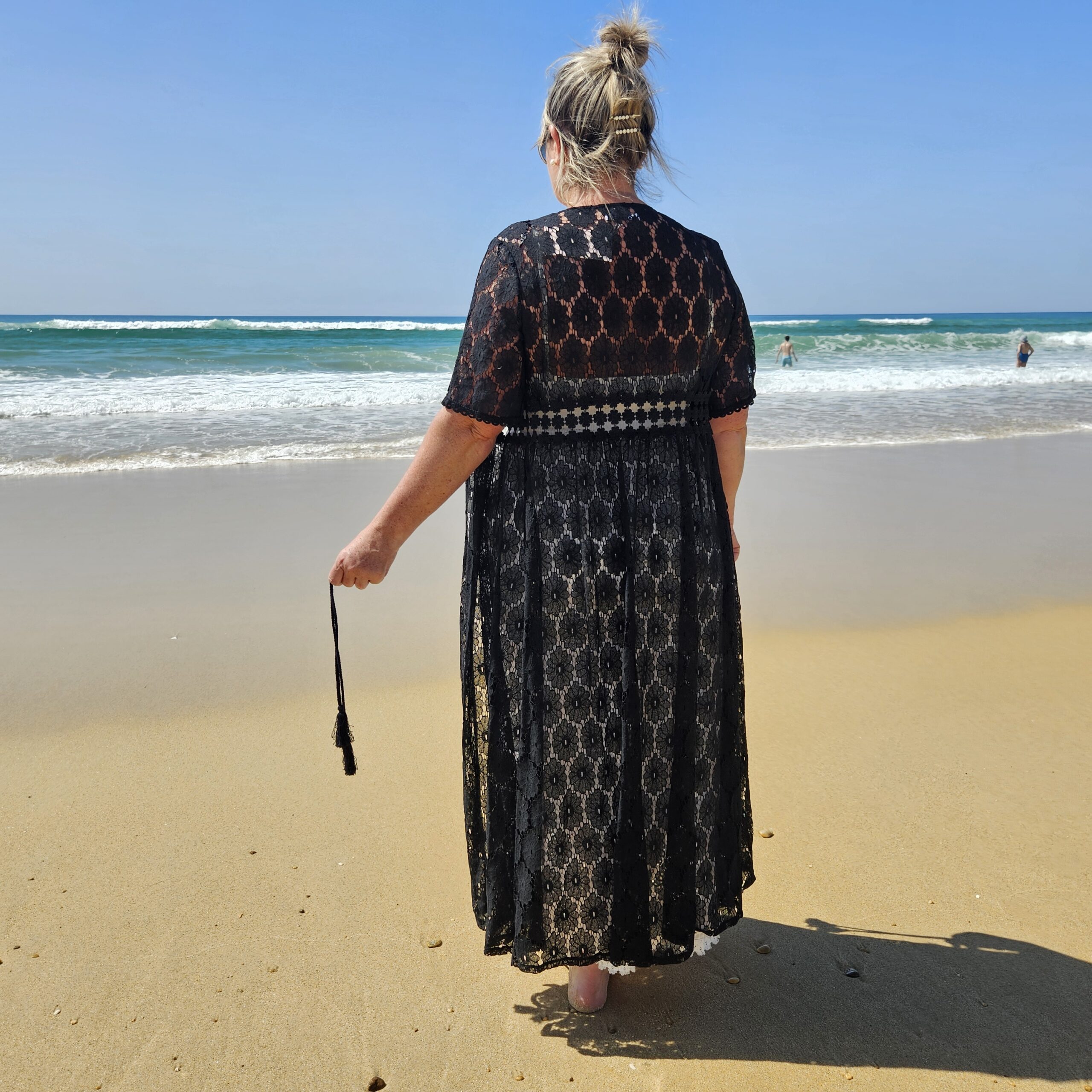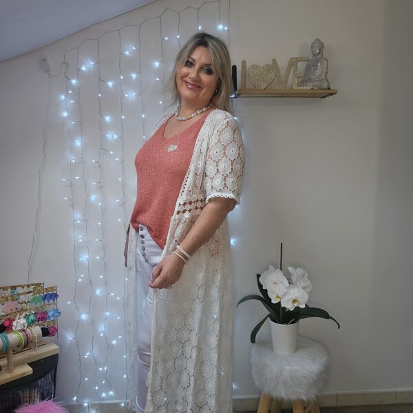 Kimono long en dentelle, fleurs liées en crochet, détail col en crochet, taille marquée par 3 rangées de fleurs en dentelle et 4 pompons, manches courtes.