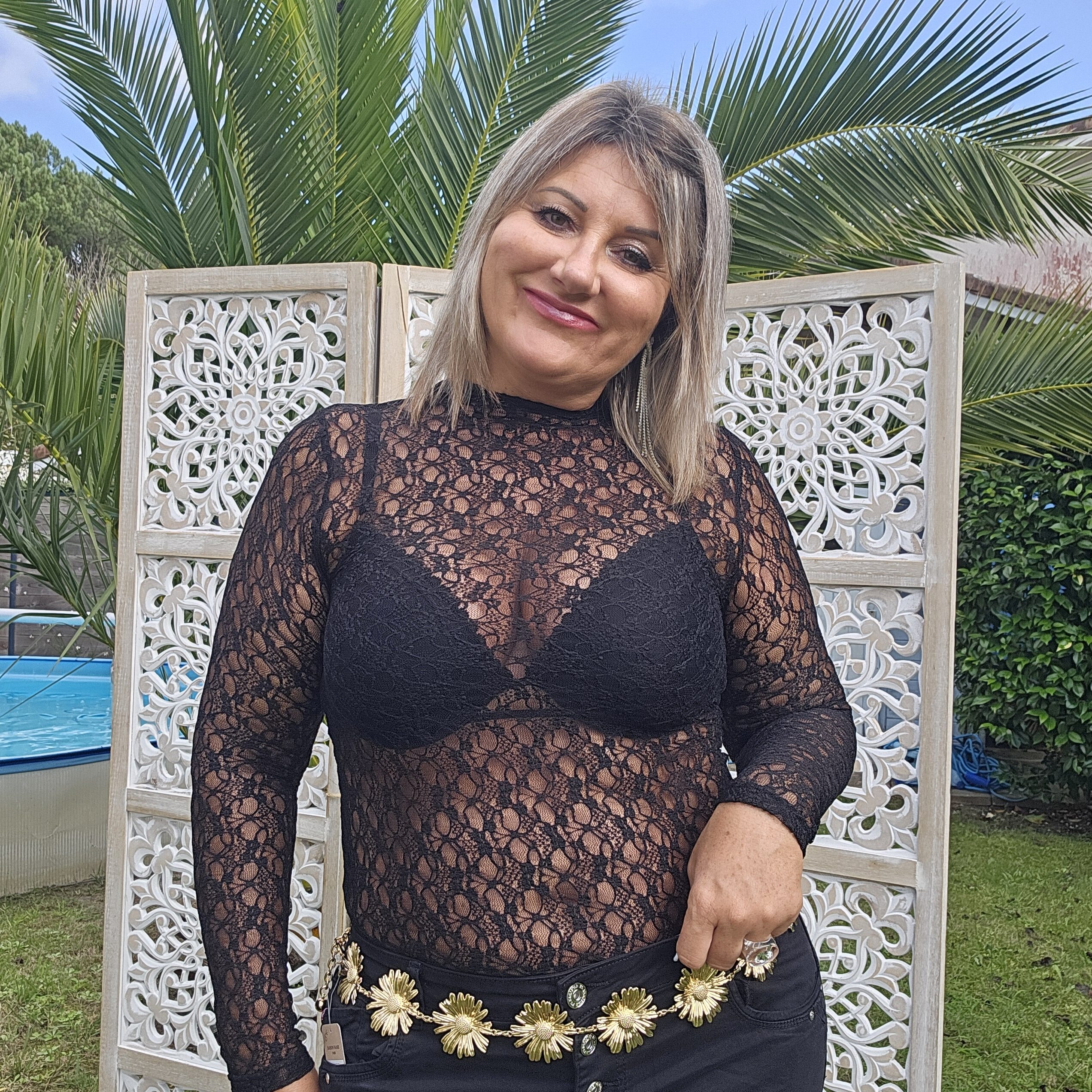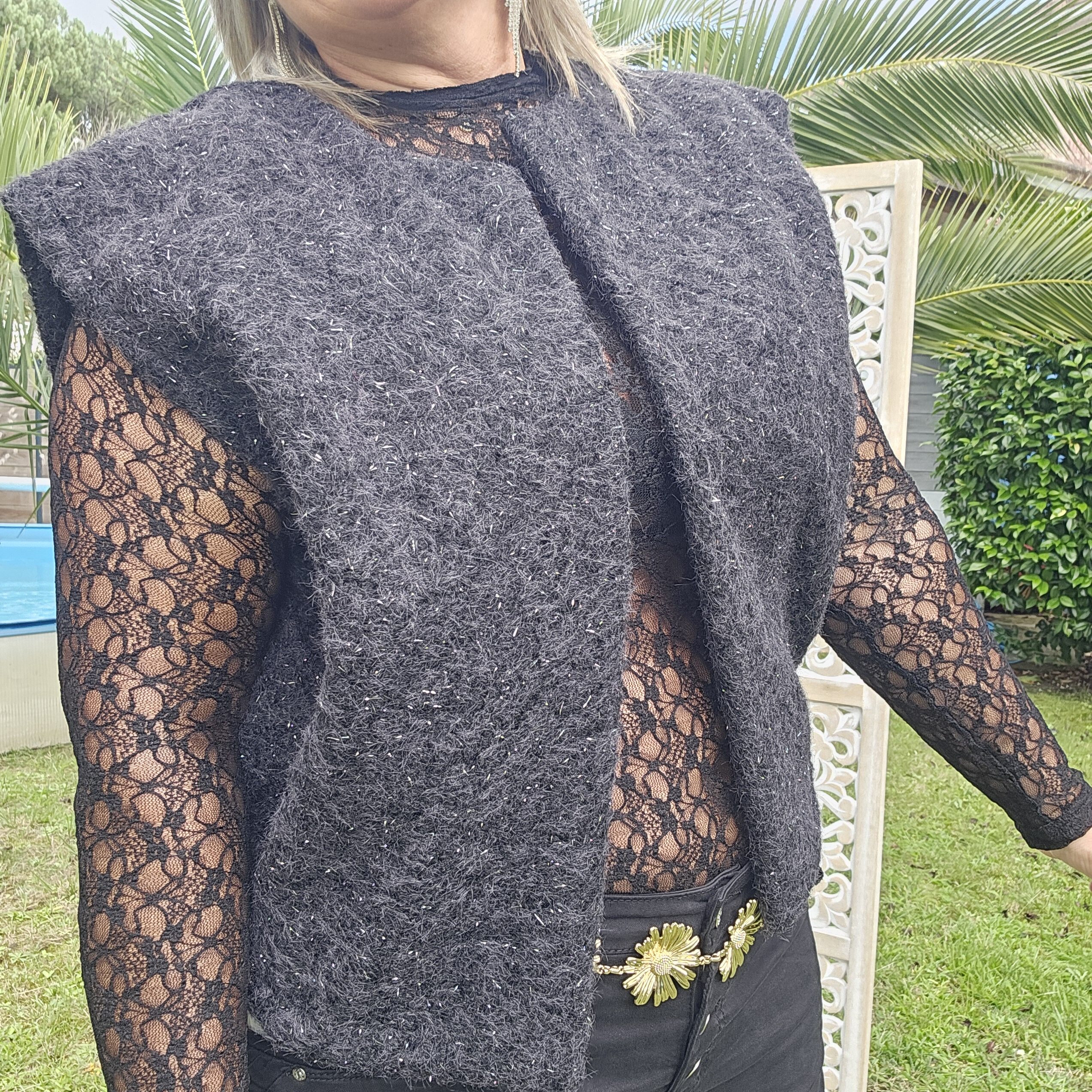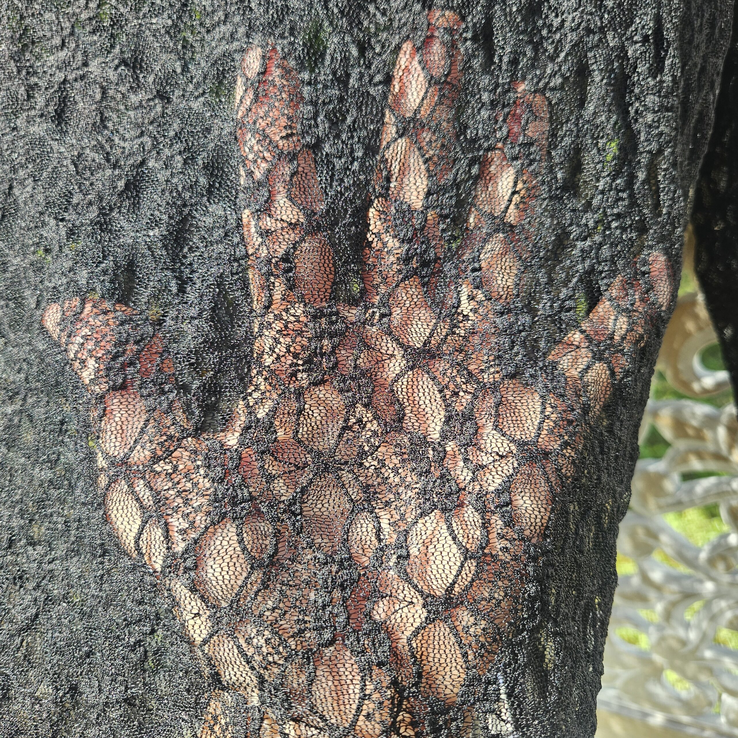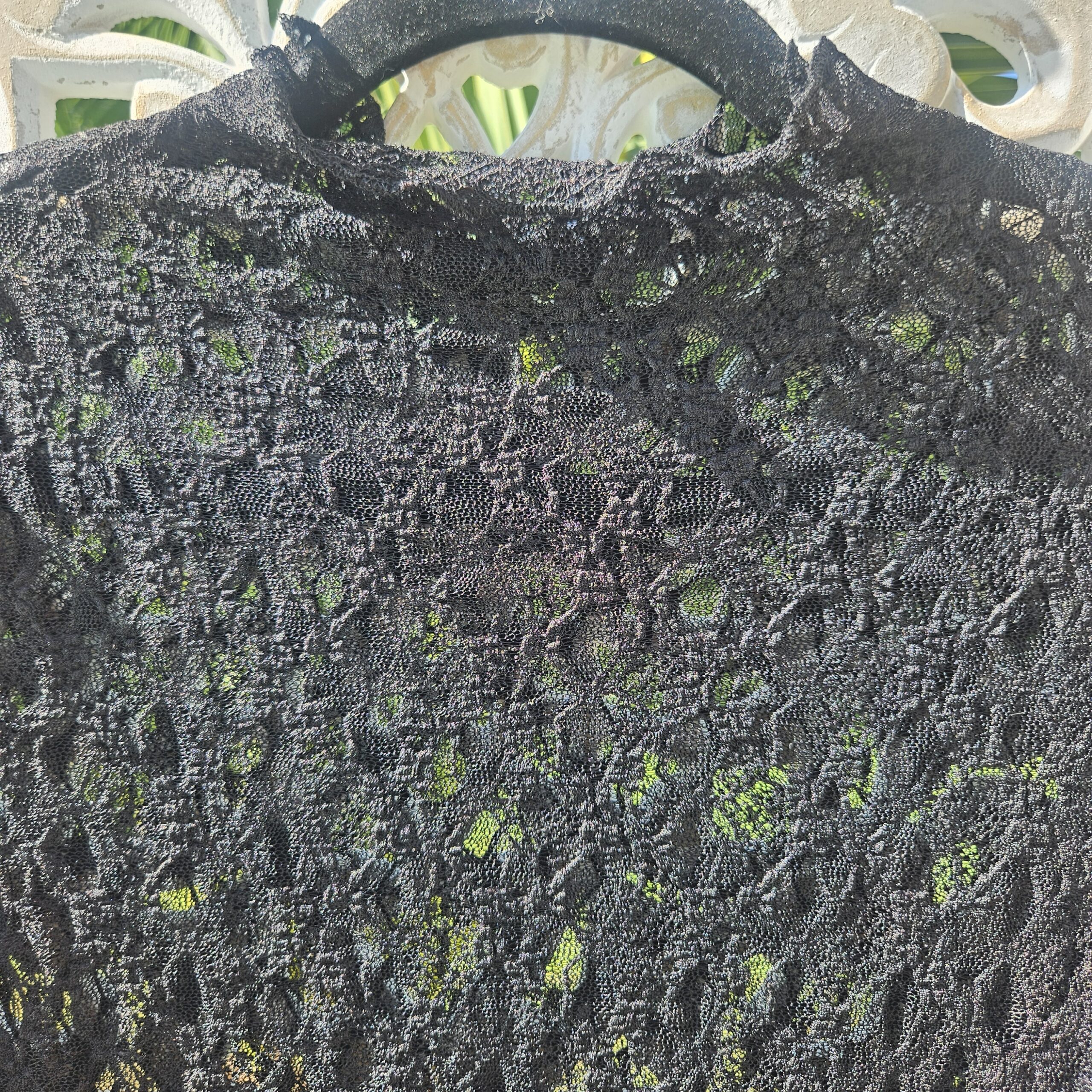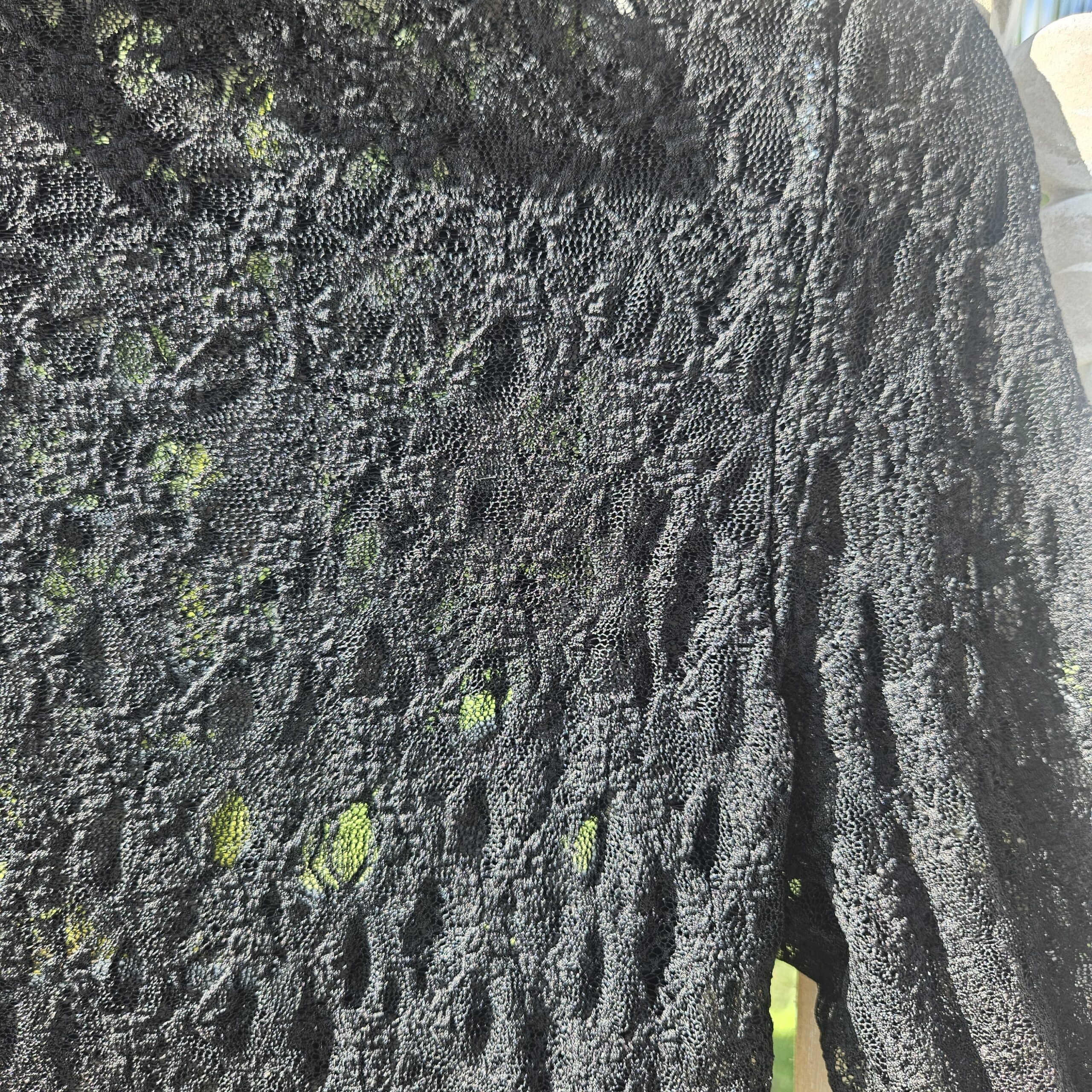 Mousseline noire en dentelle résille avec un petit col et manches longues. TU.