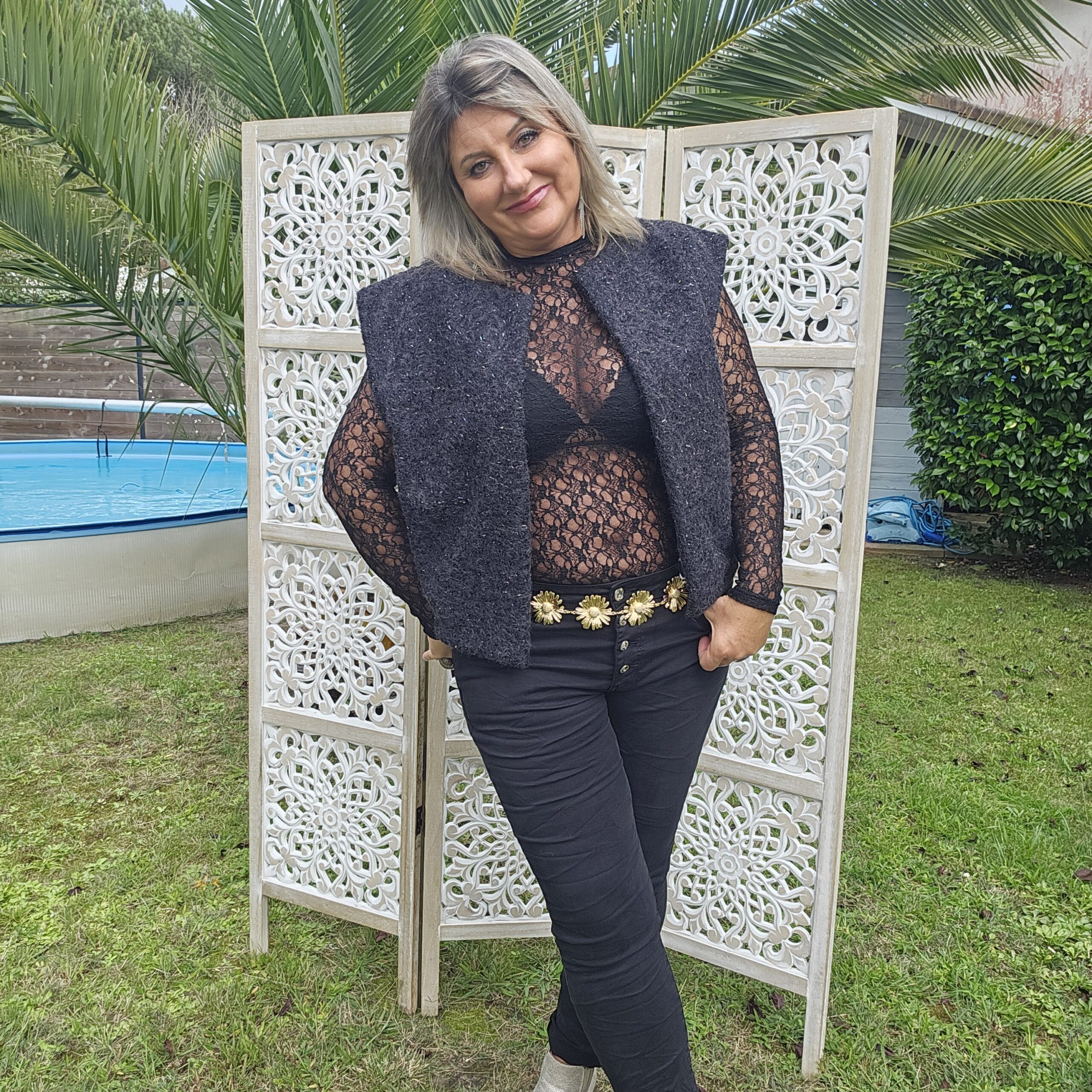 Mon regard pailleté : Cette mousseline avec son col, donne du style à vos tenues. Magnifique, indispensable à avoir absolument dans son dressing pour cet automne ! A porter avec les gilets sans manches, en mélangeant les couleurs !