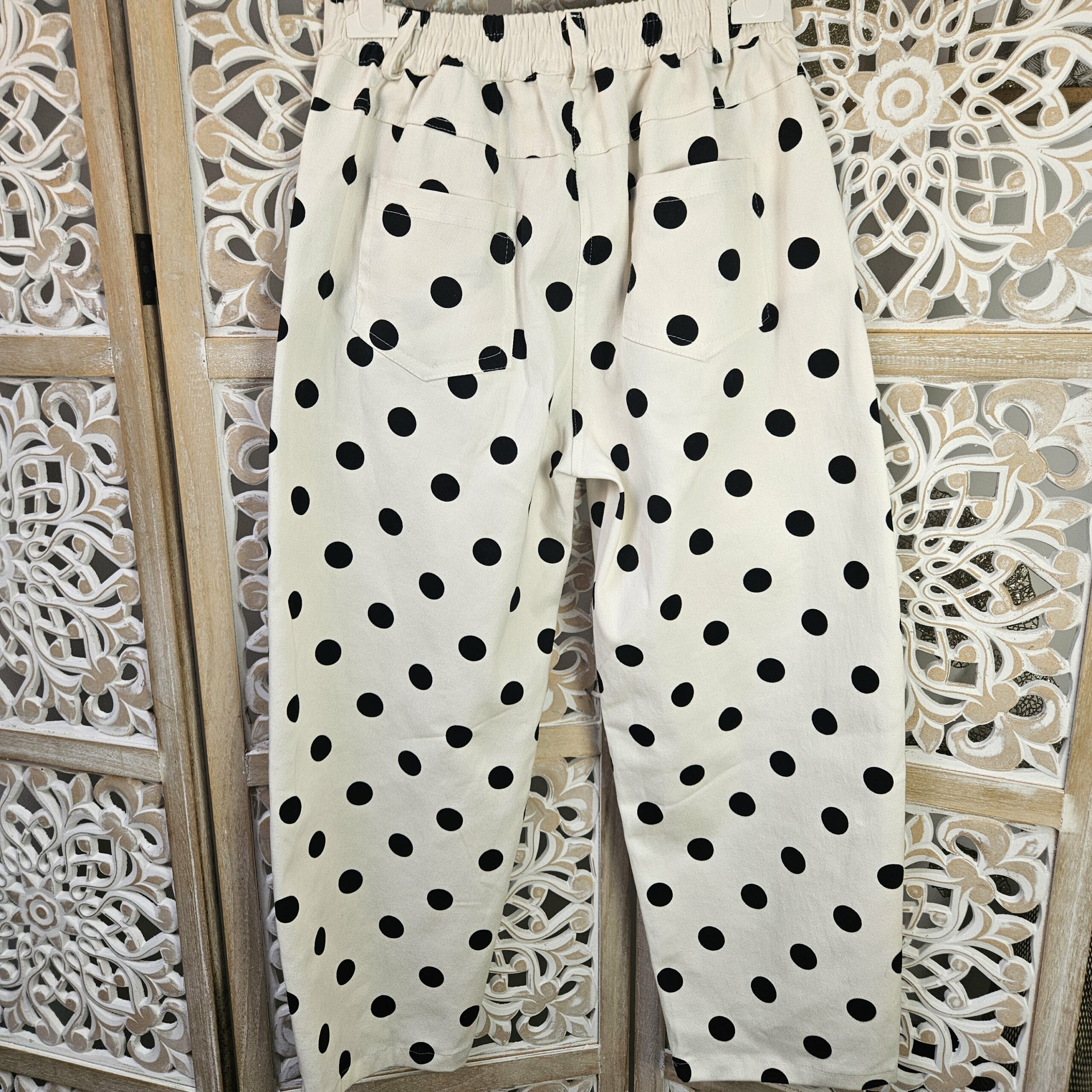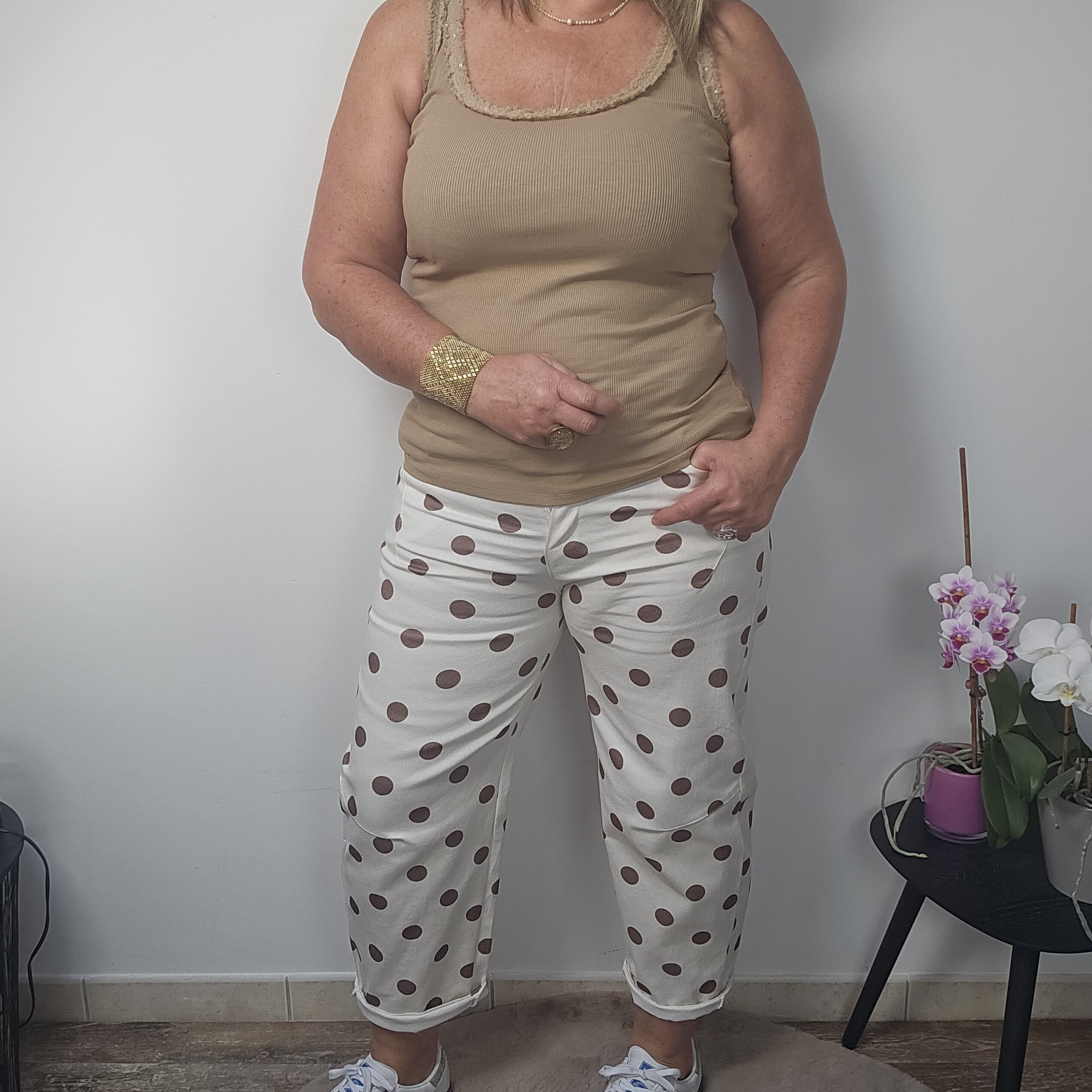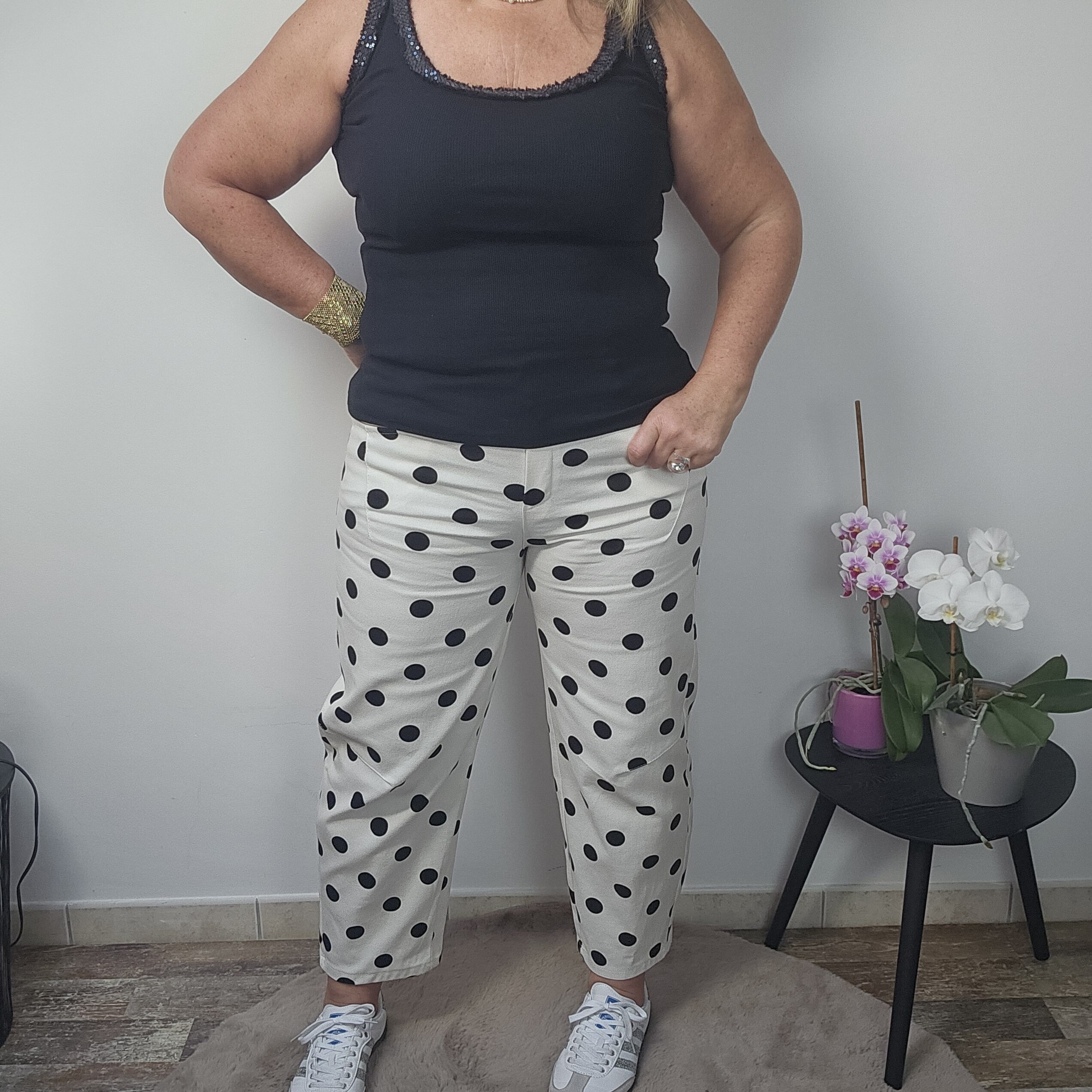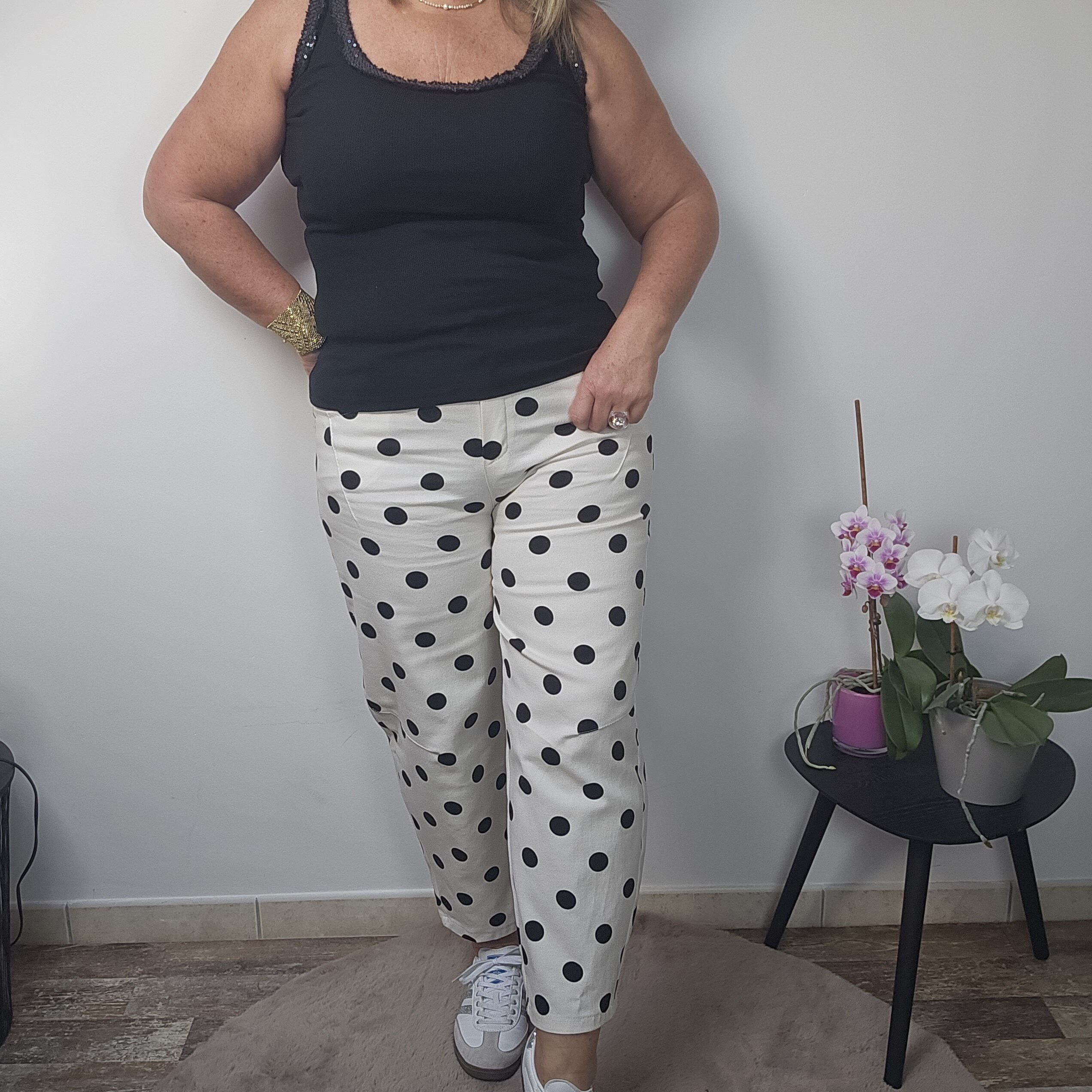 Pantalon Barrel 7/8ème, écru avec des pois. Coupe Barrel : taille haute, ample au niveau des hanches, bombée sur la jambe puis légèrement resserrée à la cheville. Couture à l’intérieur du genou, et couture en bas qui donne cette coupe Barrel. Fermeture éclaire et 1 bouton. Très confortable, extensible et très agréable à porter ! Existe en écru/taupe, écru/marine, écru/noir. TU