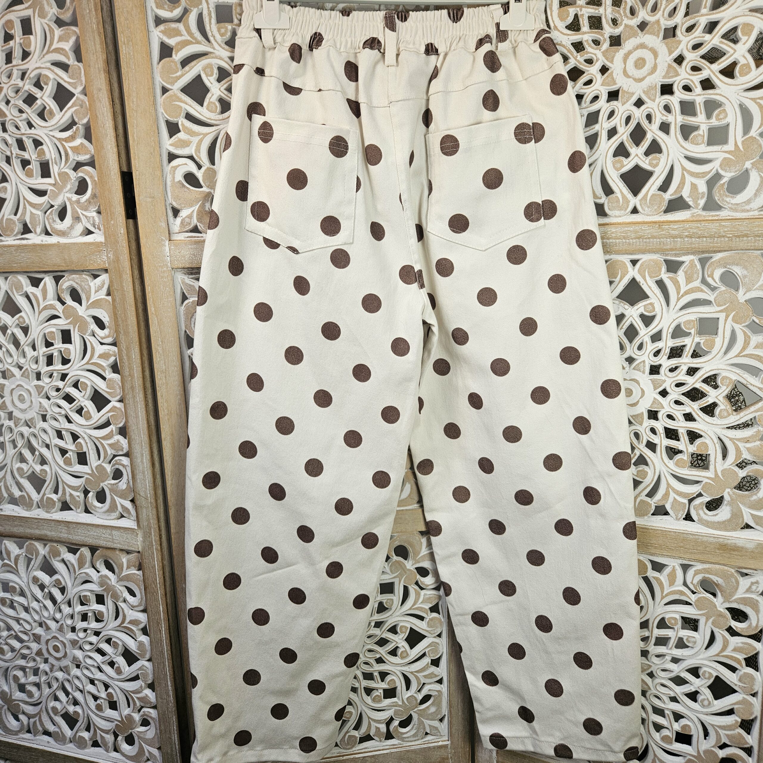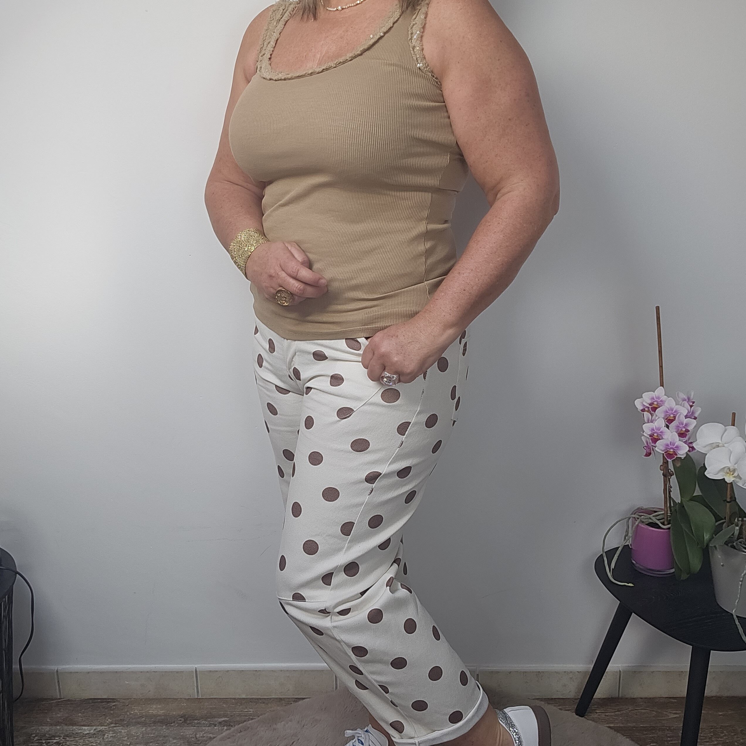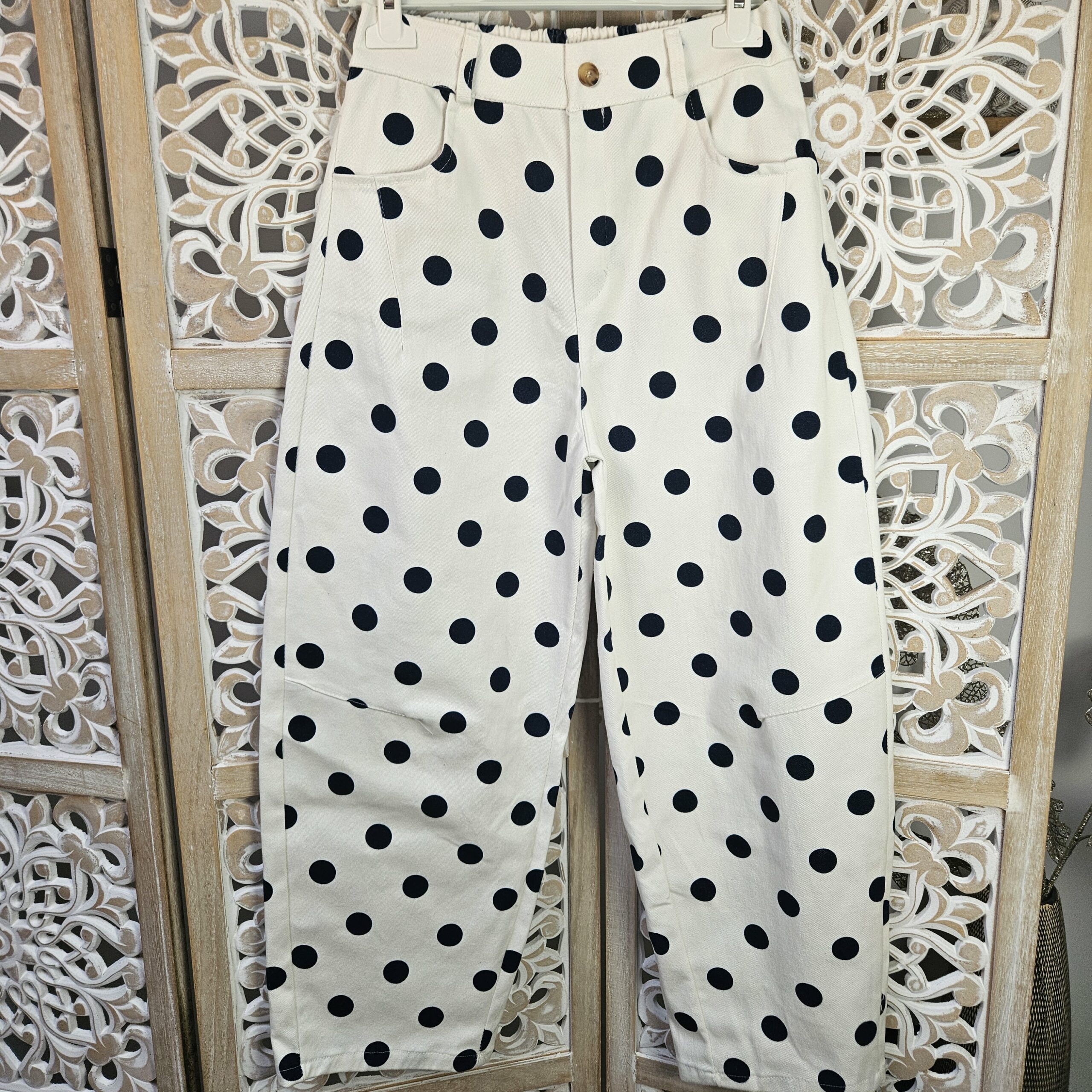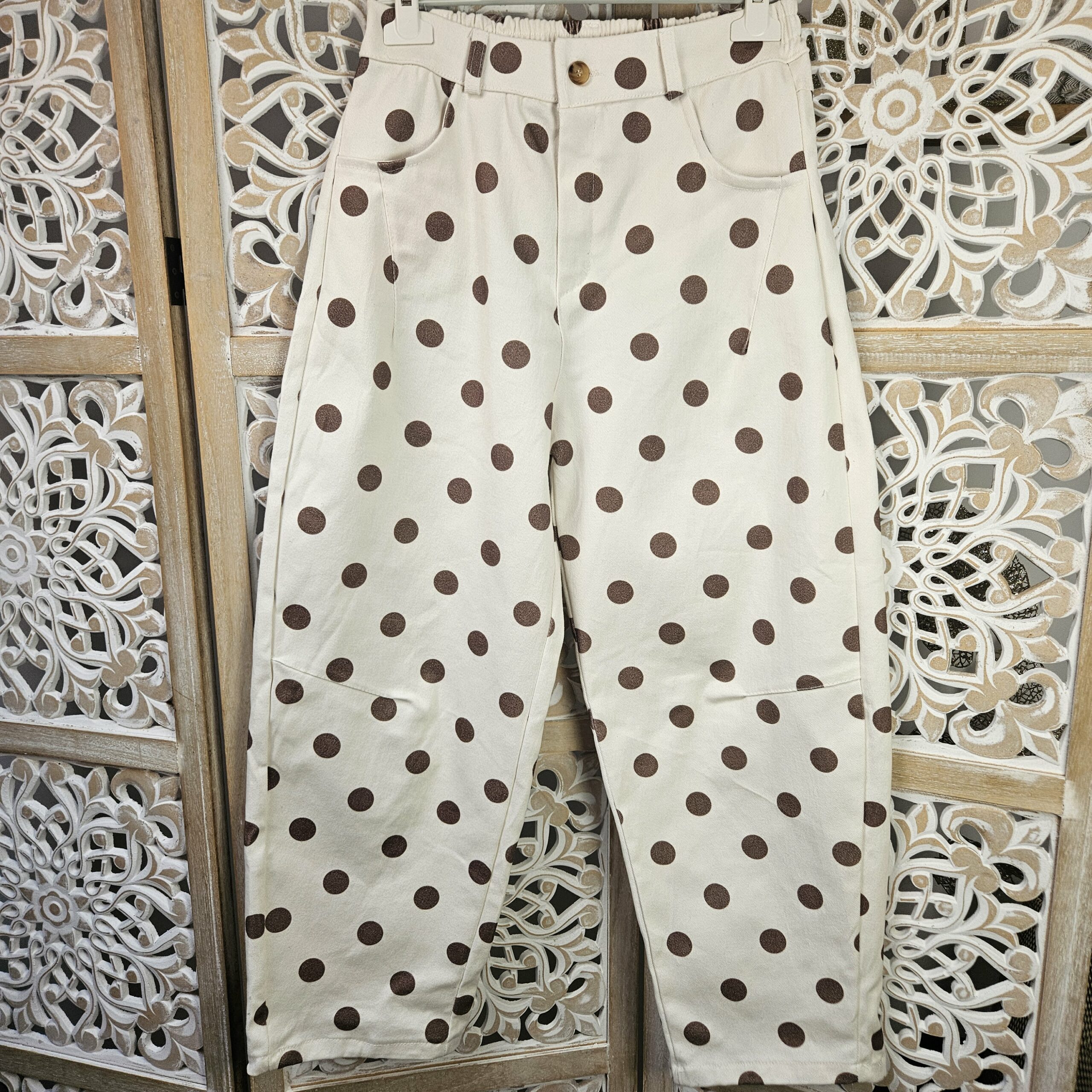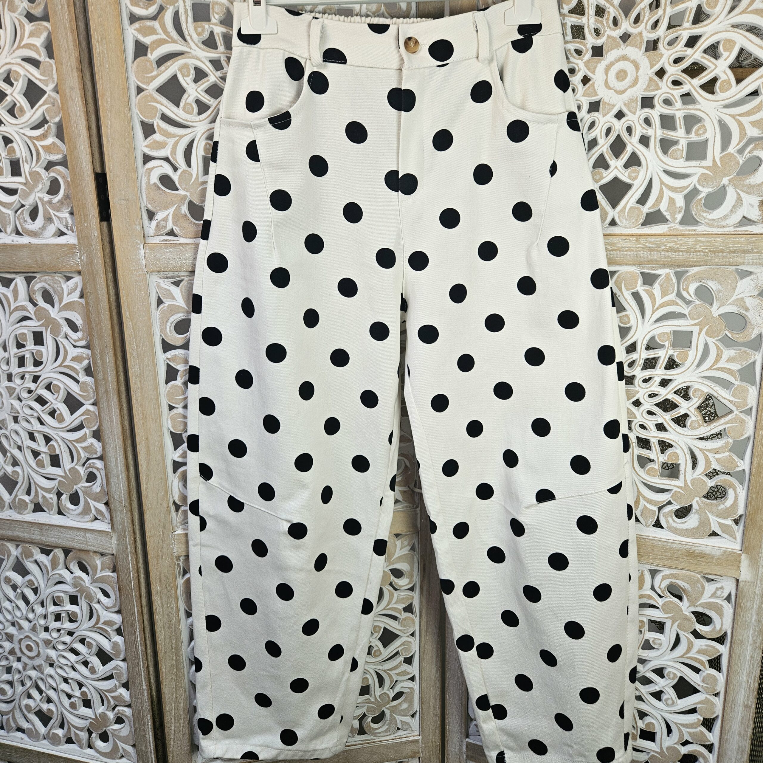 Pantalon Barrel 7/8ème, écru avec des pois. Coupe Barrel : taille haute, ample au niveau des hanches, bombée sur la jambe puis légèrement resserrée à la cheville. Couture à l’intérieur du genou, et couture en bas qui donne cette coupe Barrel. Fermeture éclaire et 1 bouton. Très confortable, extensible et très agréable à porter ! Existe en écru/taupe, écru/marine, écru/noir. TU