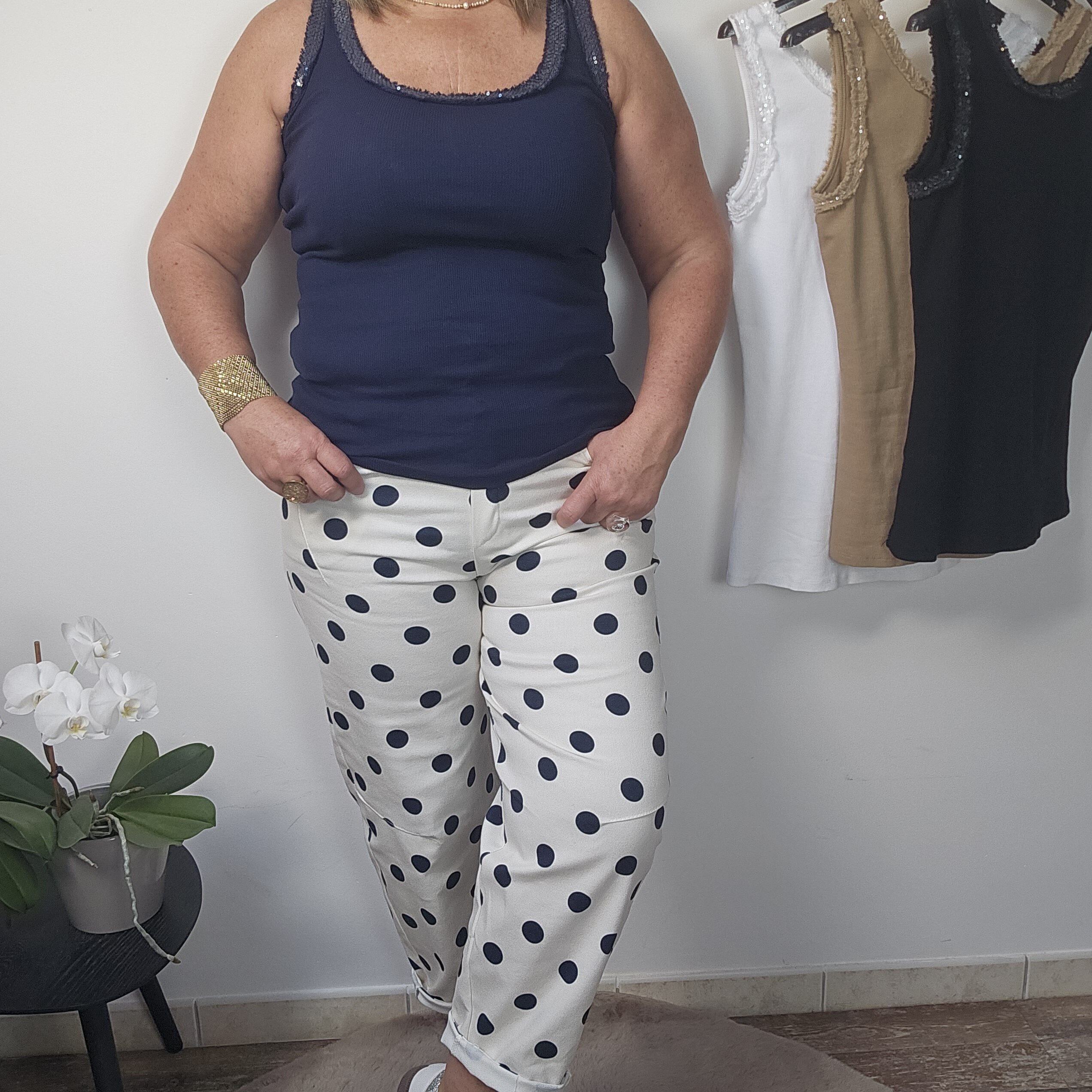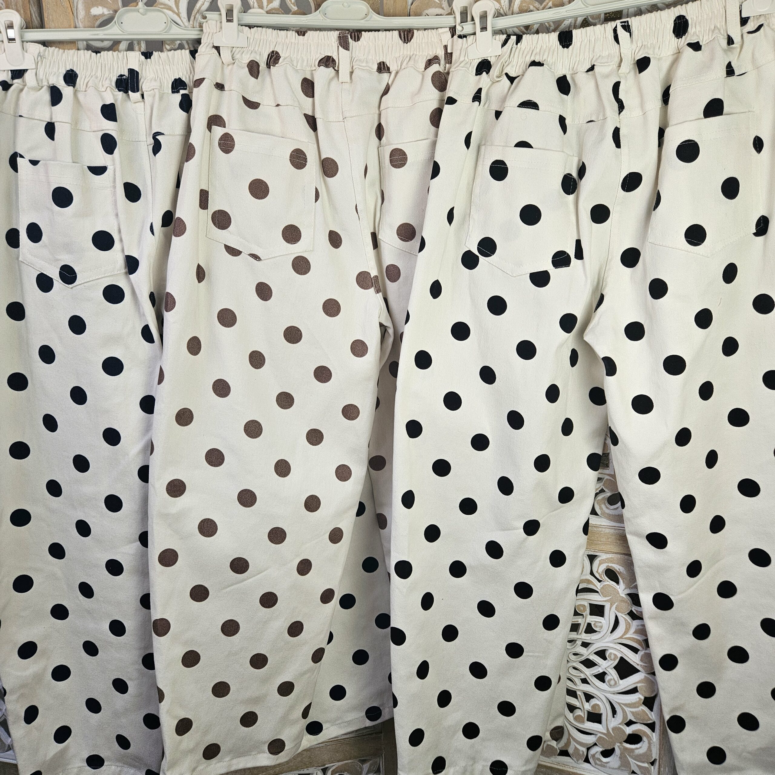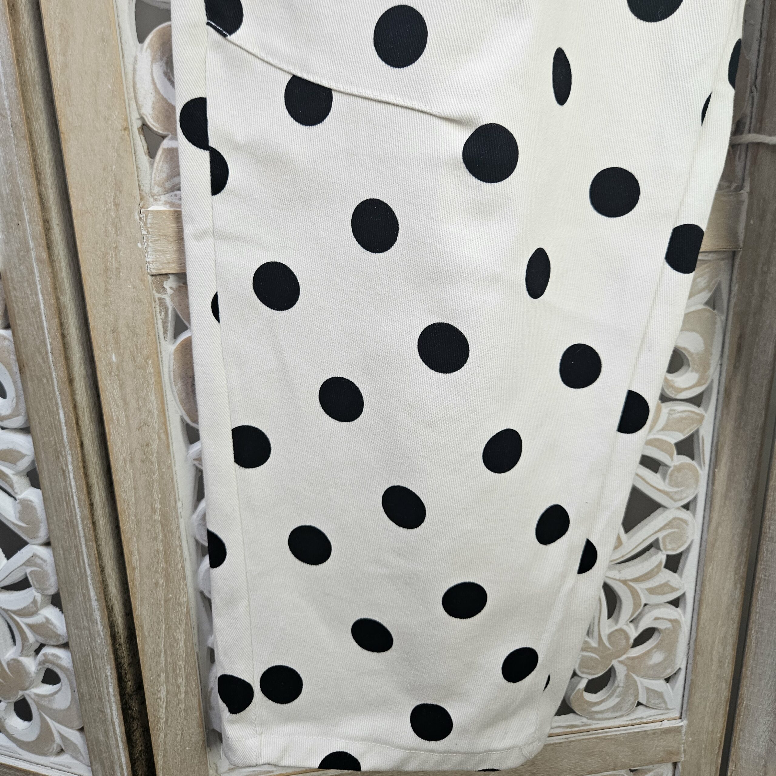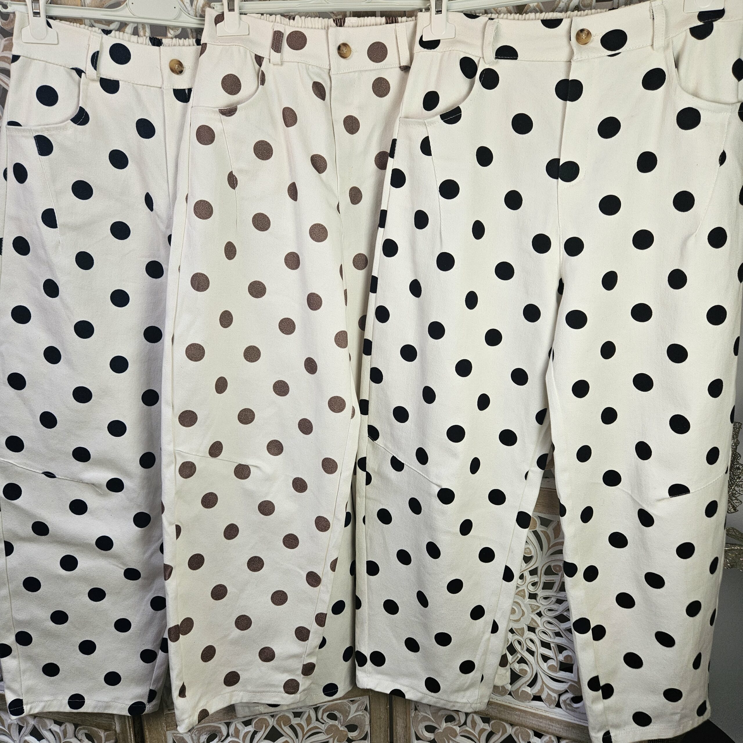 Pantalon Barrel 7/8ème, écru avec des pois. Coupe Barrel : taille haute, ample au niveau des hanches, bombée sur la jambe puis légèrement resserrée à la cheville. Couture à l’intérieur du genou, et couture en bas qui donne cette coupe Barrel. Fermeture éclaire et 1 bouton. Très confortable, extensible et très agréable à porter ! Existe en écru/taupe, écru/marine, écru/noir. TU