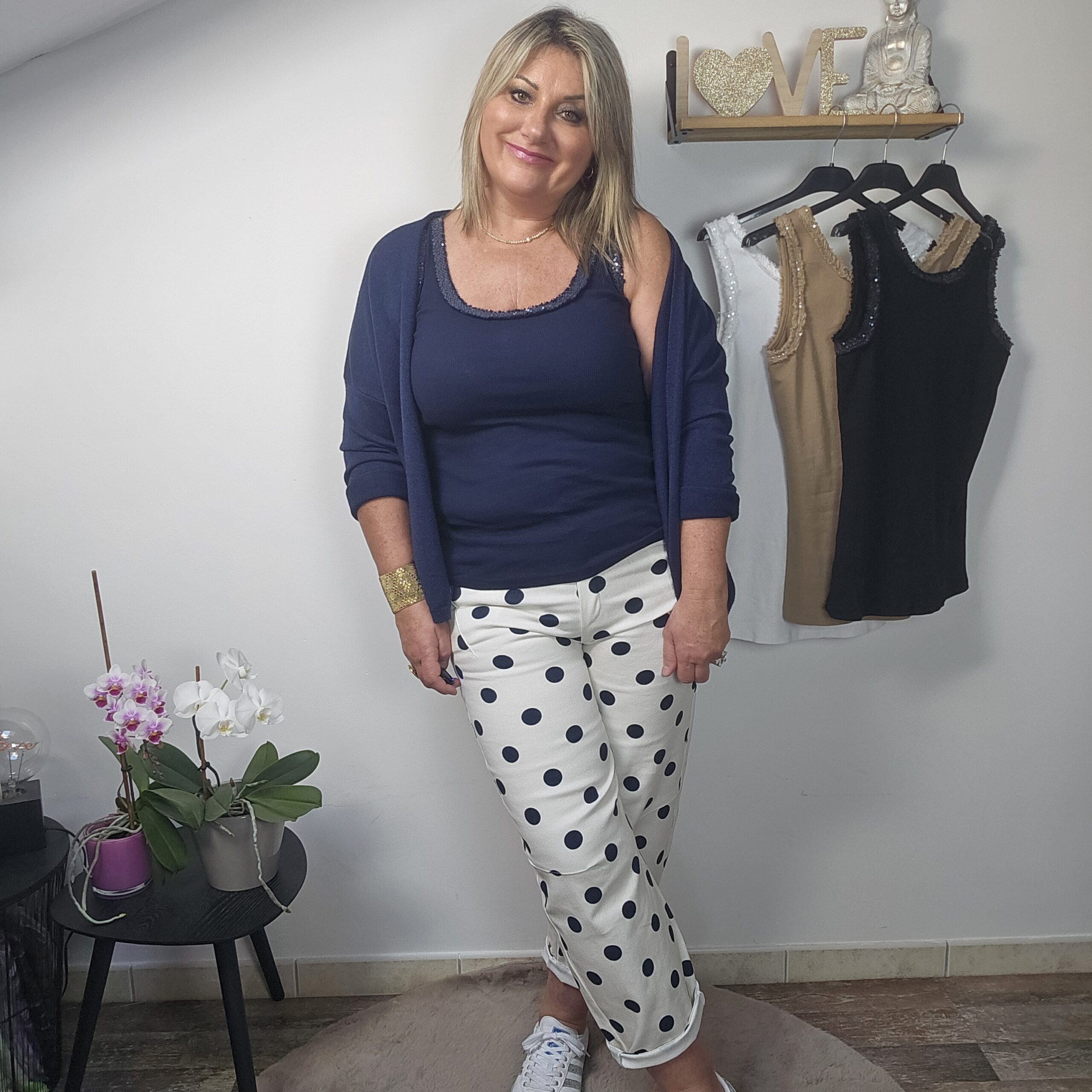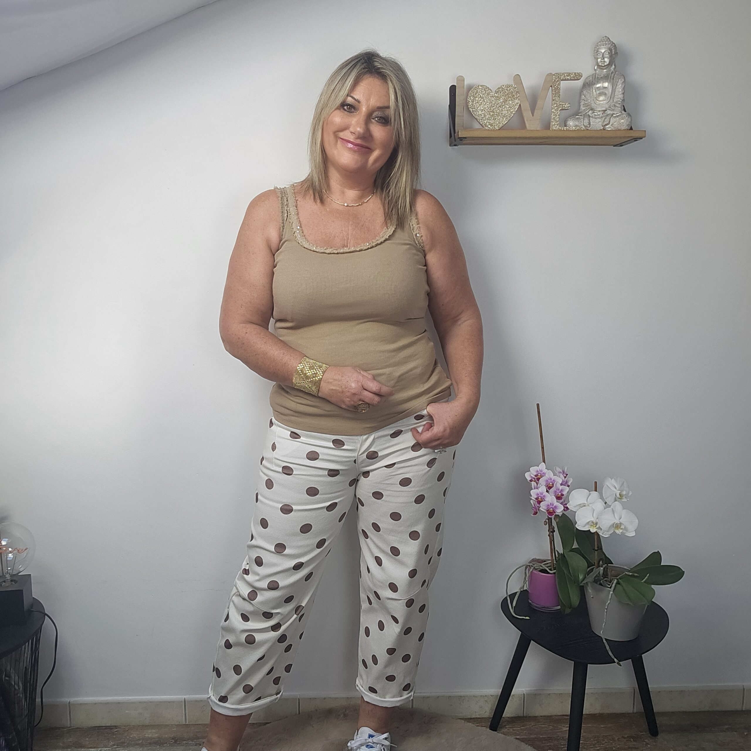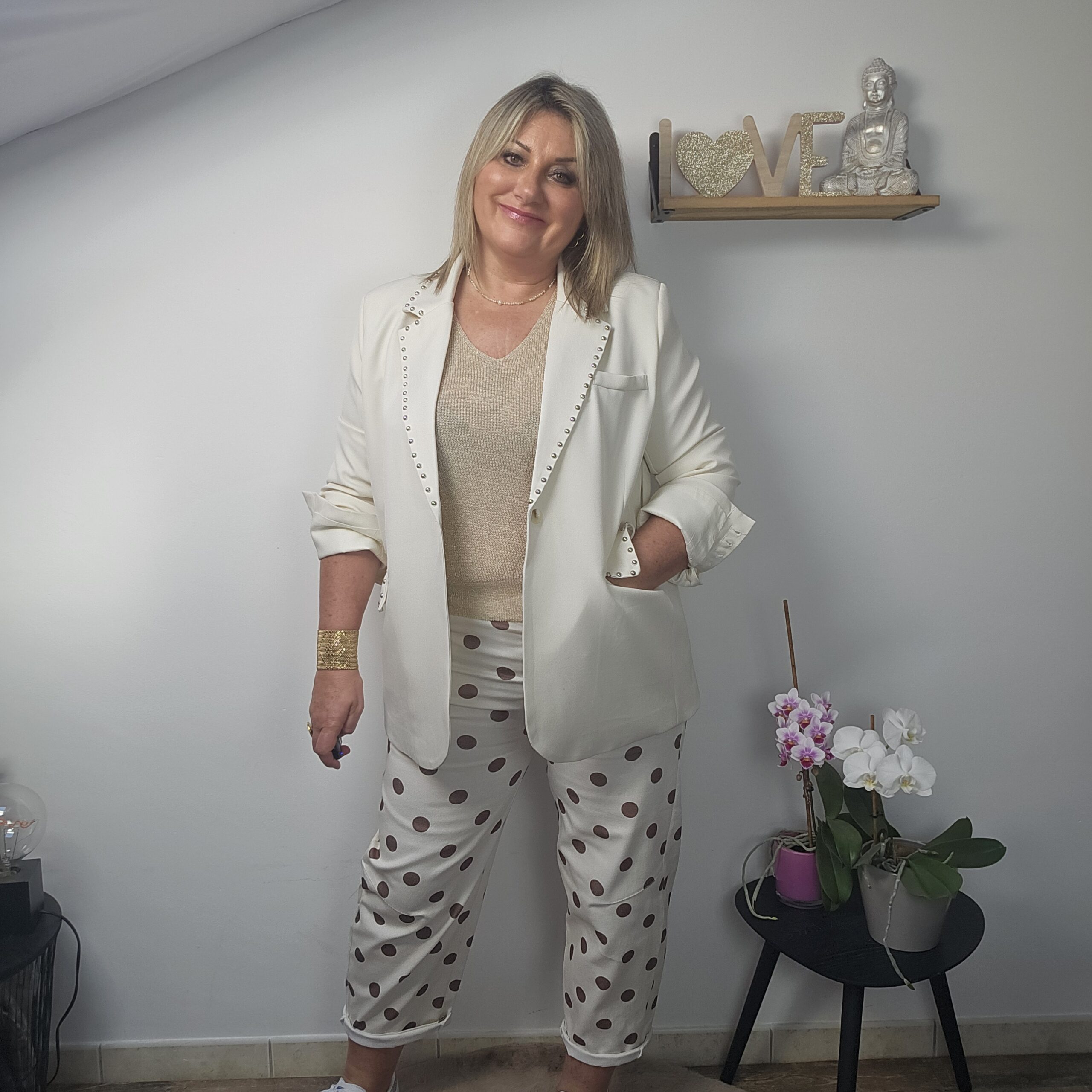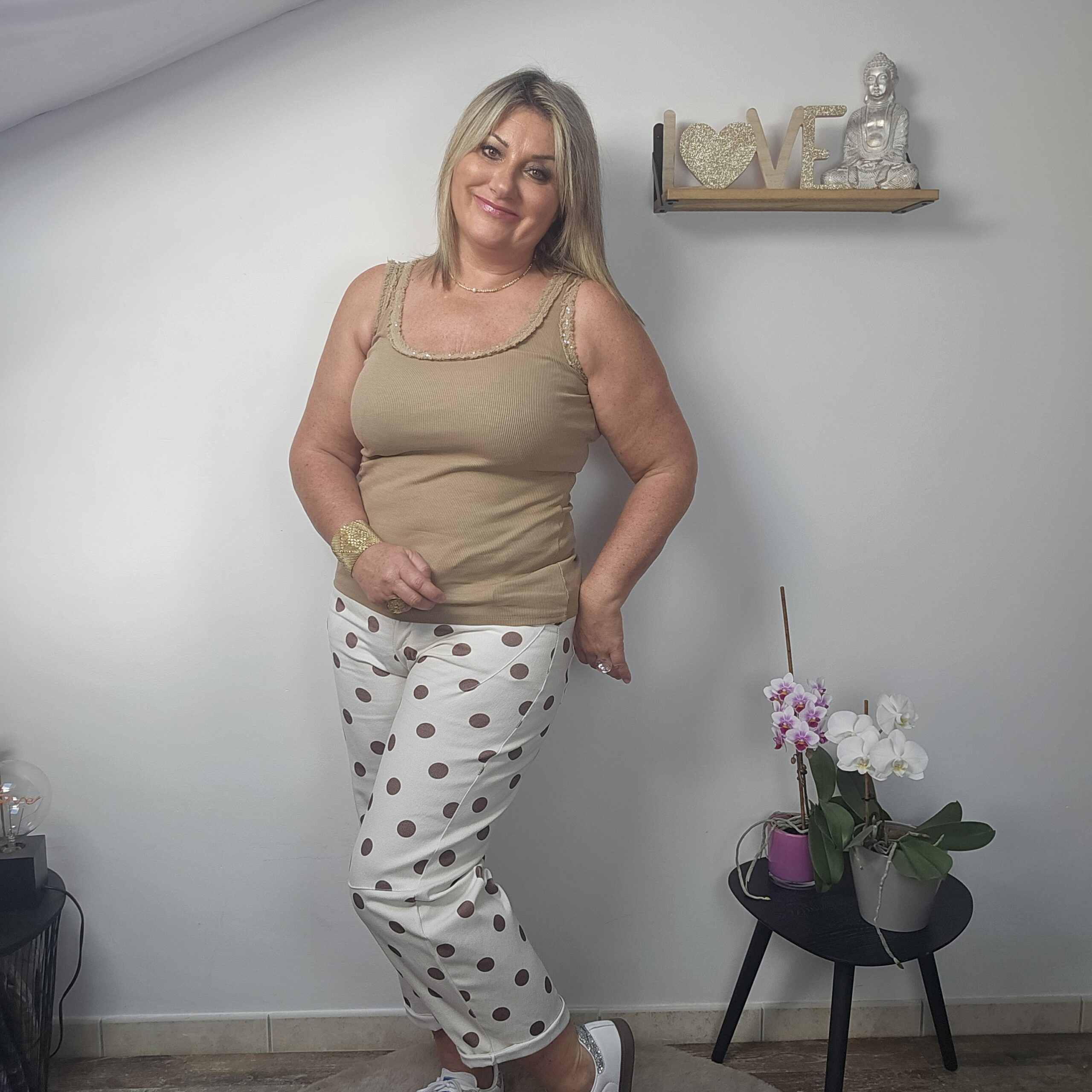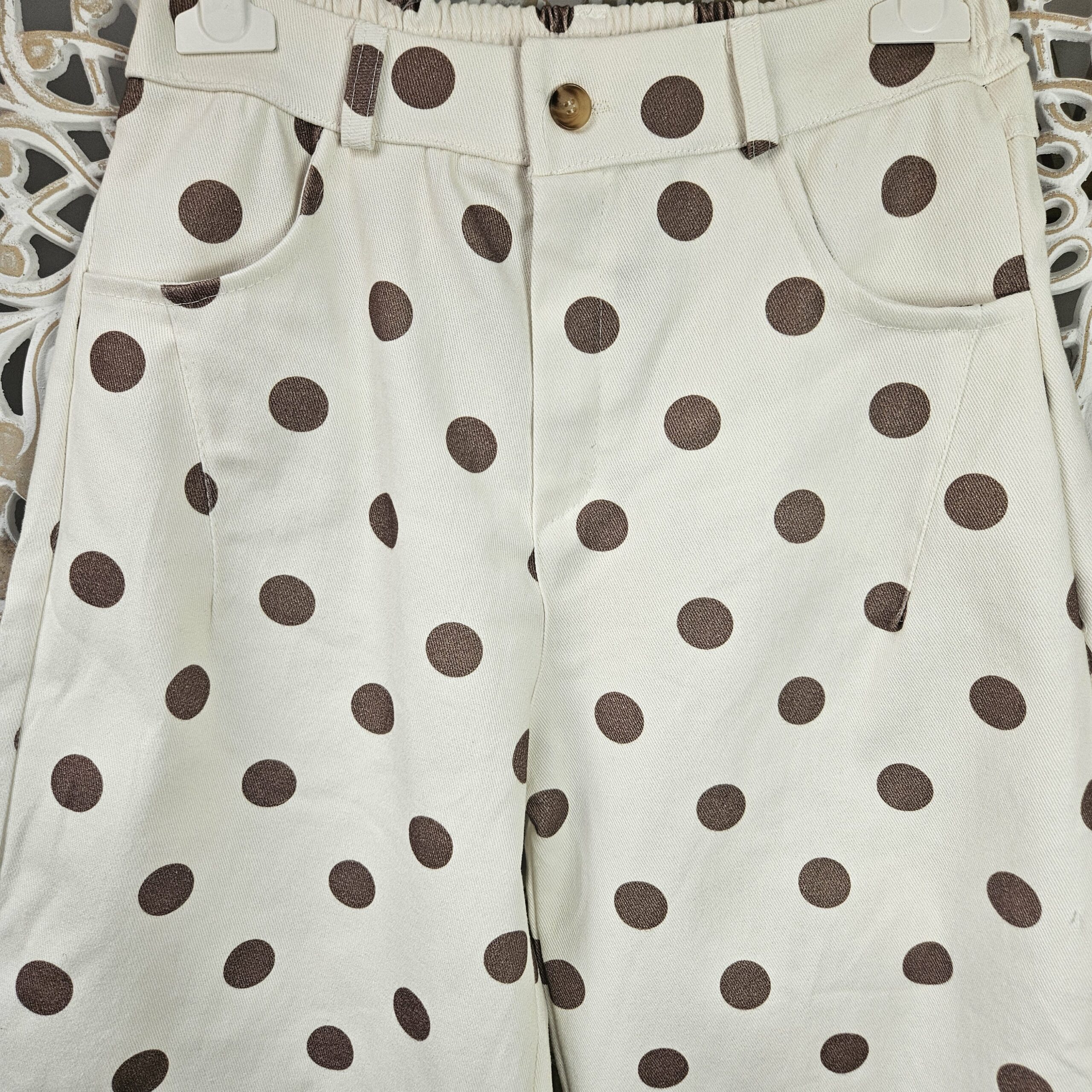 Pantalon Barrel 7/8ème, écru avec des pois. Coupe Barrel : taille haute, ample au niveau des hanches, bombée sur la jambe puis légèrement resserrée à la cheville. Couture à l’intérieur du genou, et couture en bas qui donne cette coupe Barrel. Fermeture éclaire et 1 bouton. Très confortable, extensible et très agréable à porter ! Existe en écru/taupe, écru/marine, écru/noir. TU