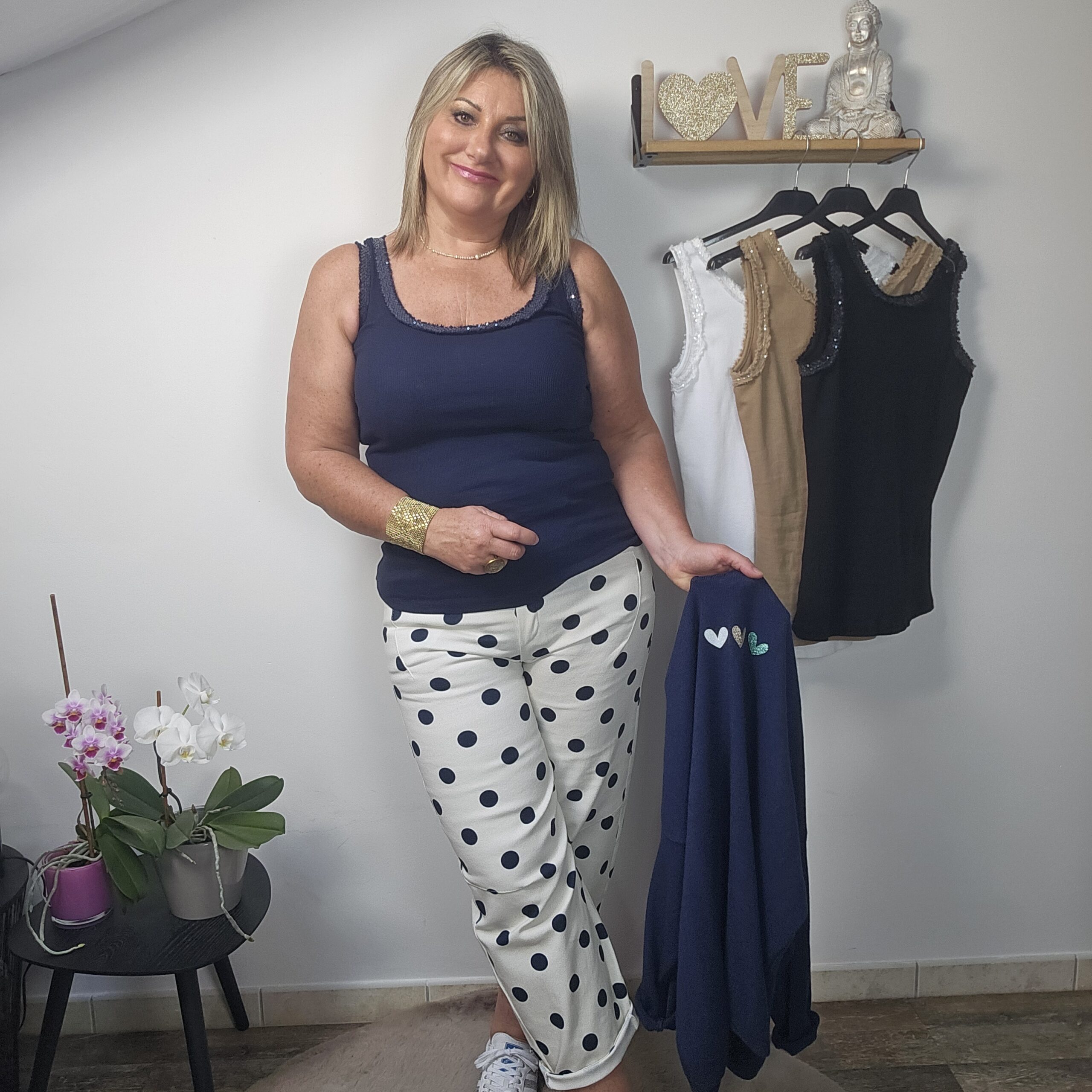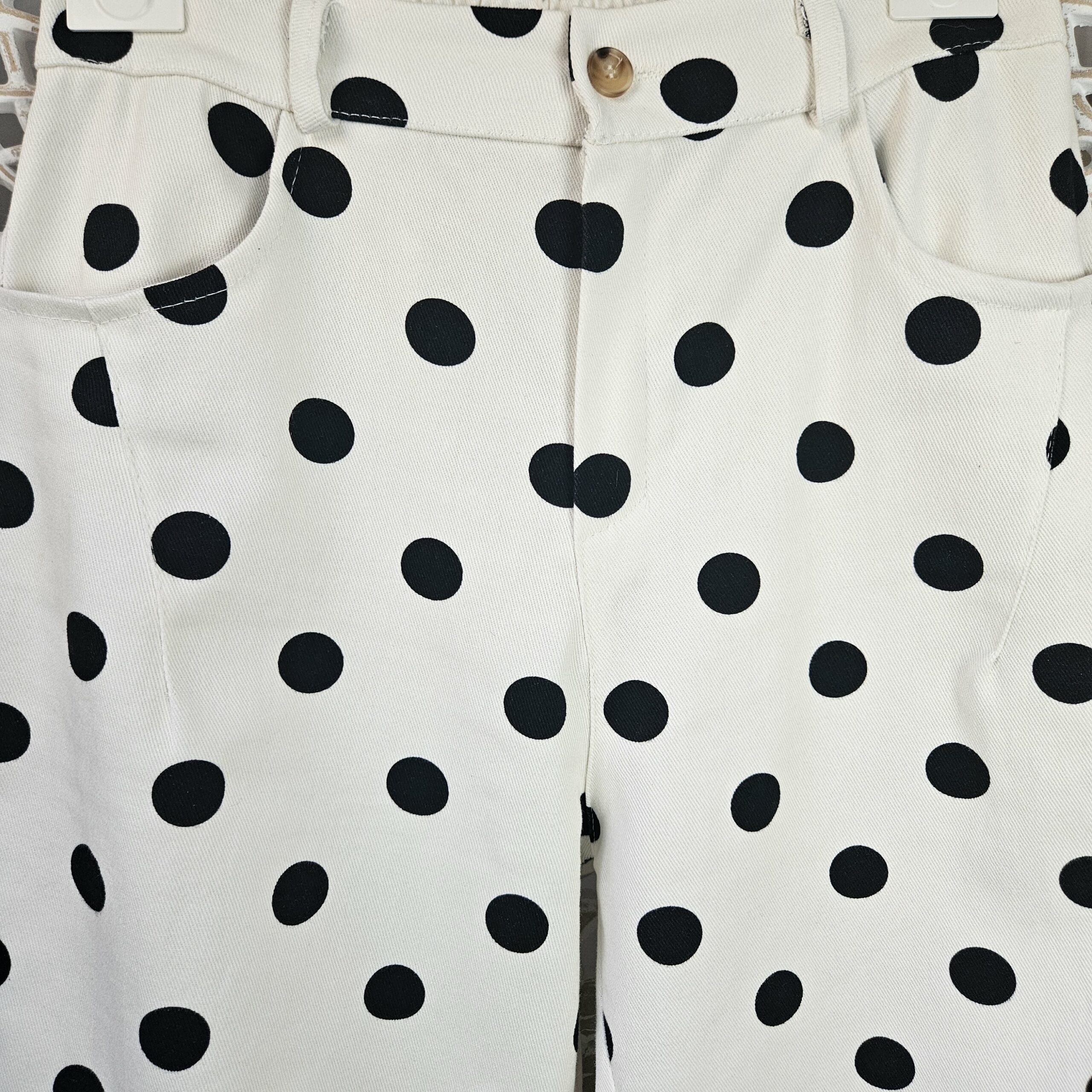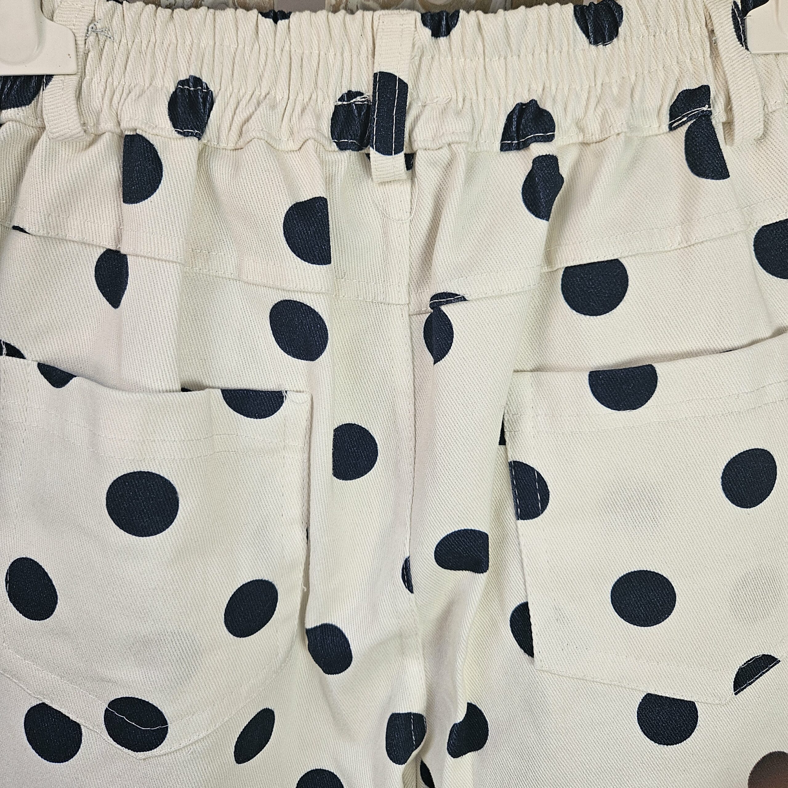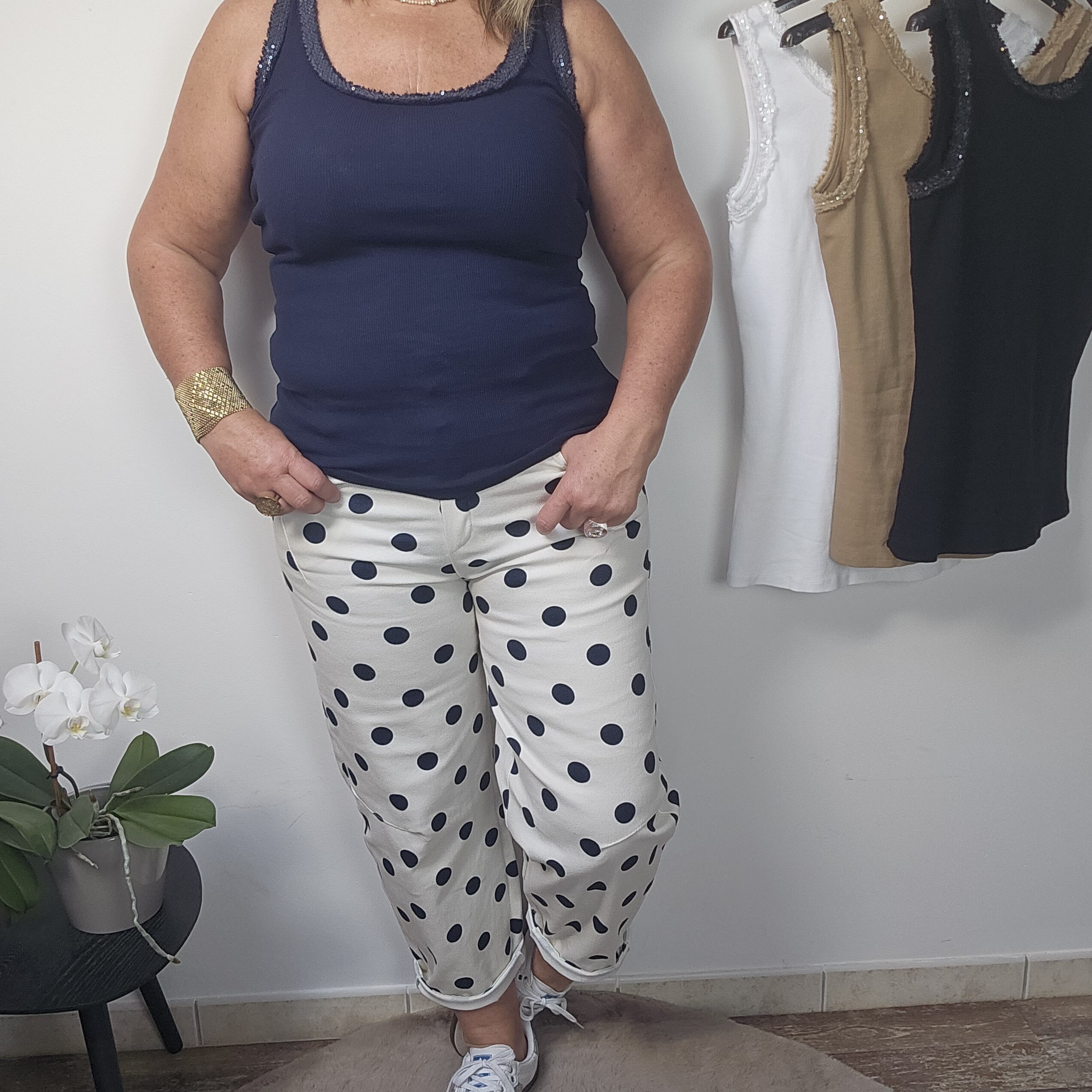 Pantalon Barrel 7/8ème, écru avec des pois. Coupe Barrel : taille haute, ample au niveau des hanches, bombée sur la jambe puis légèrement resserrée à la cheville. Couture à l’intérieur du genou, et couture en bas qui donne cette coupe Barrel. Fermeture éclaire et 1 bouton. Très confortable, extensible et très agréable à porter ! Existe en écru/taupe, écru/marine, écru/noir. TU