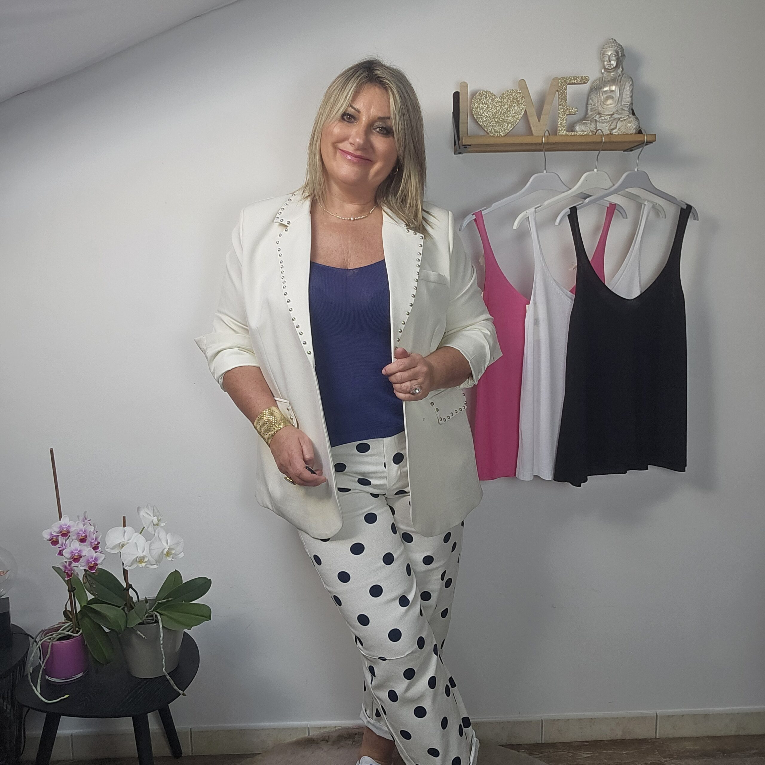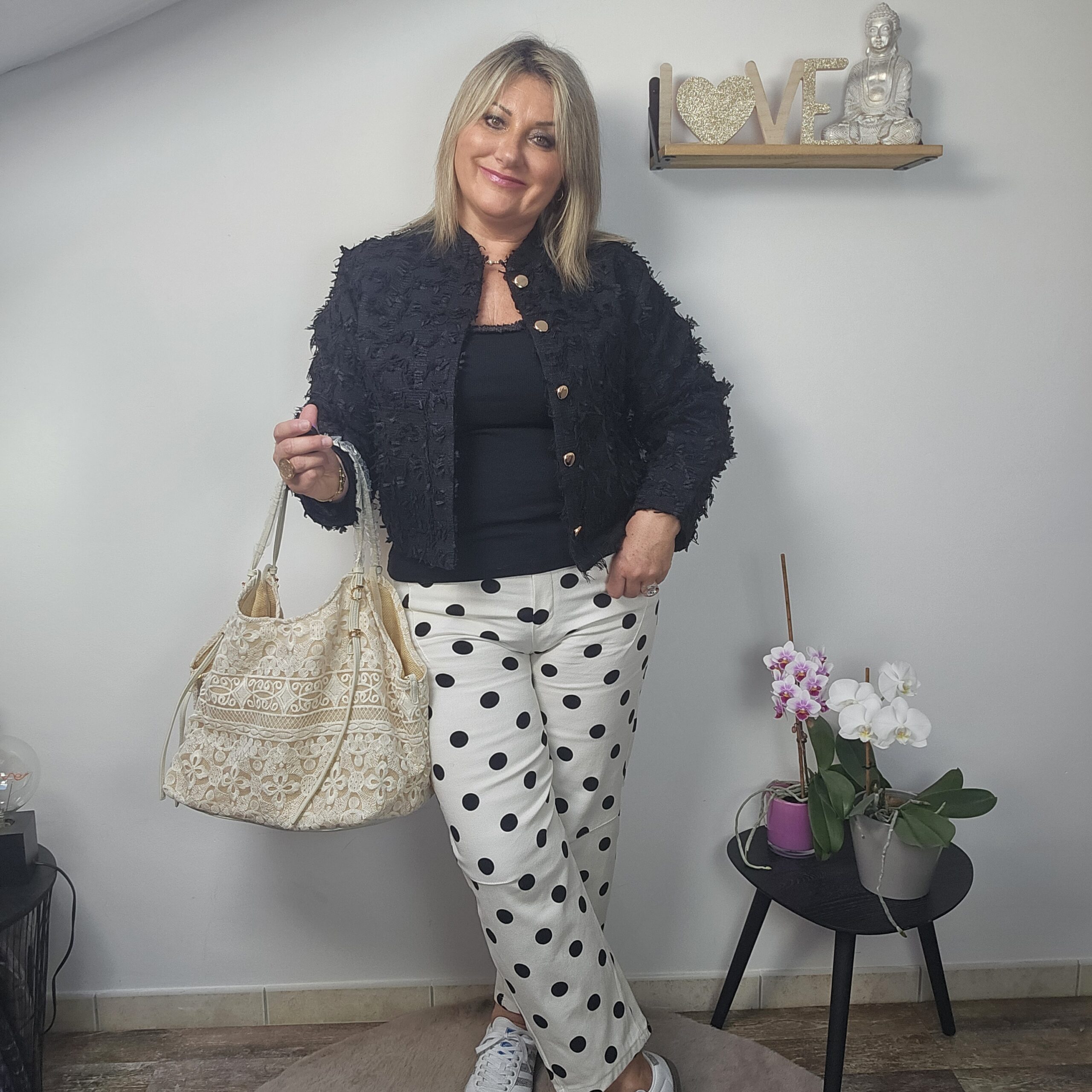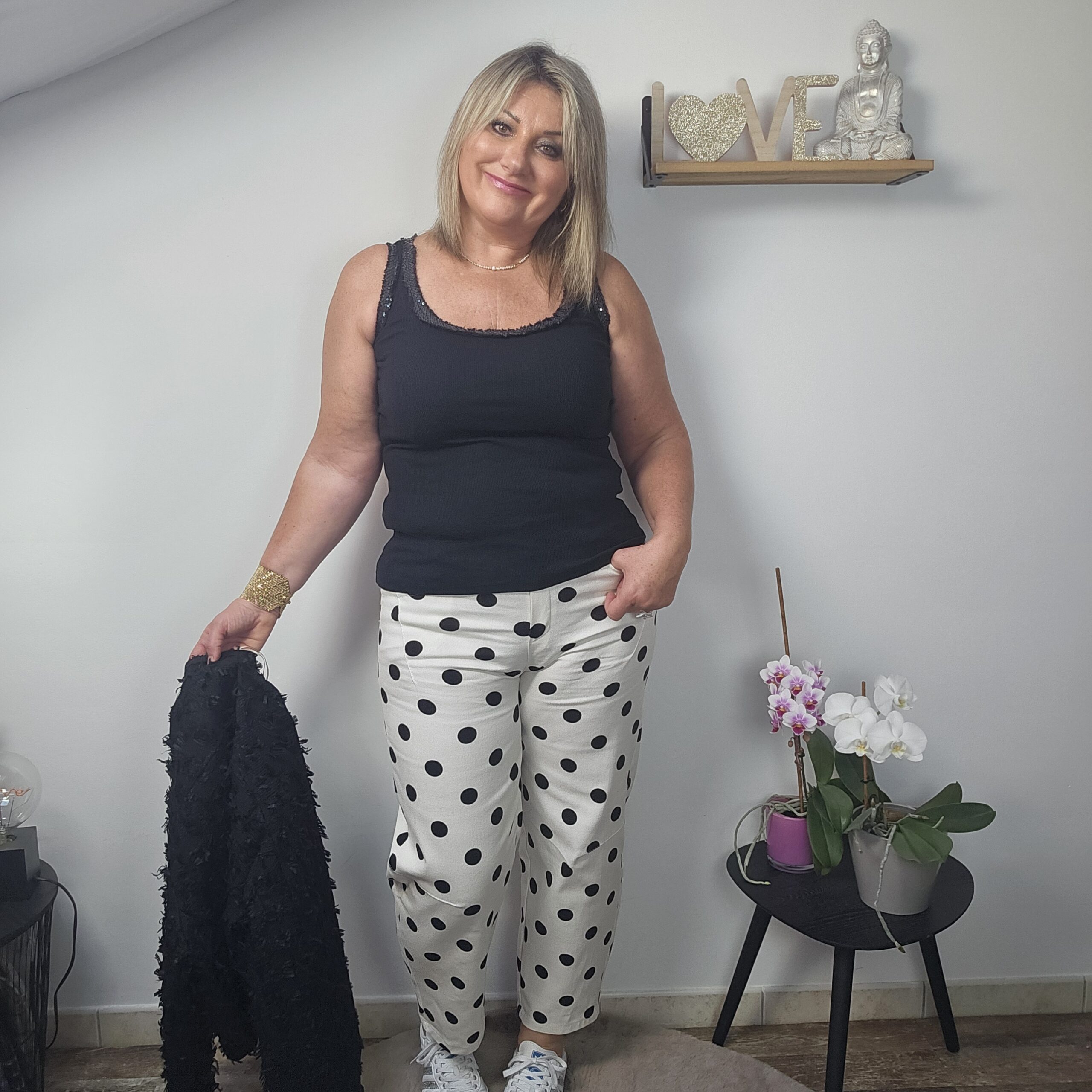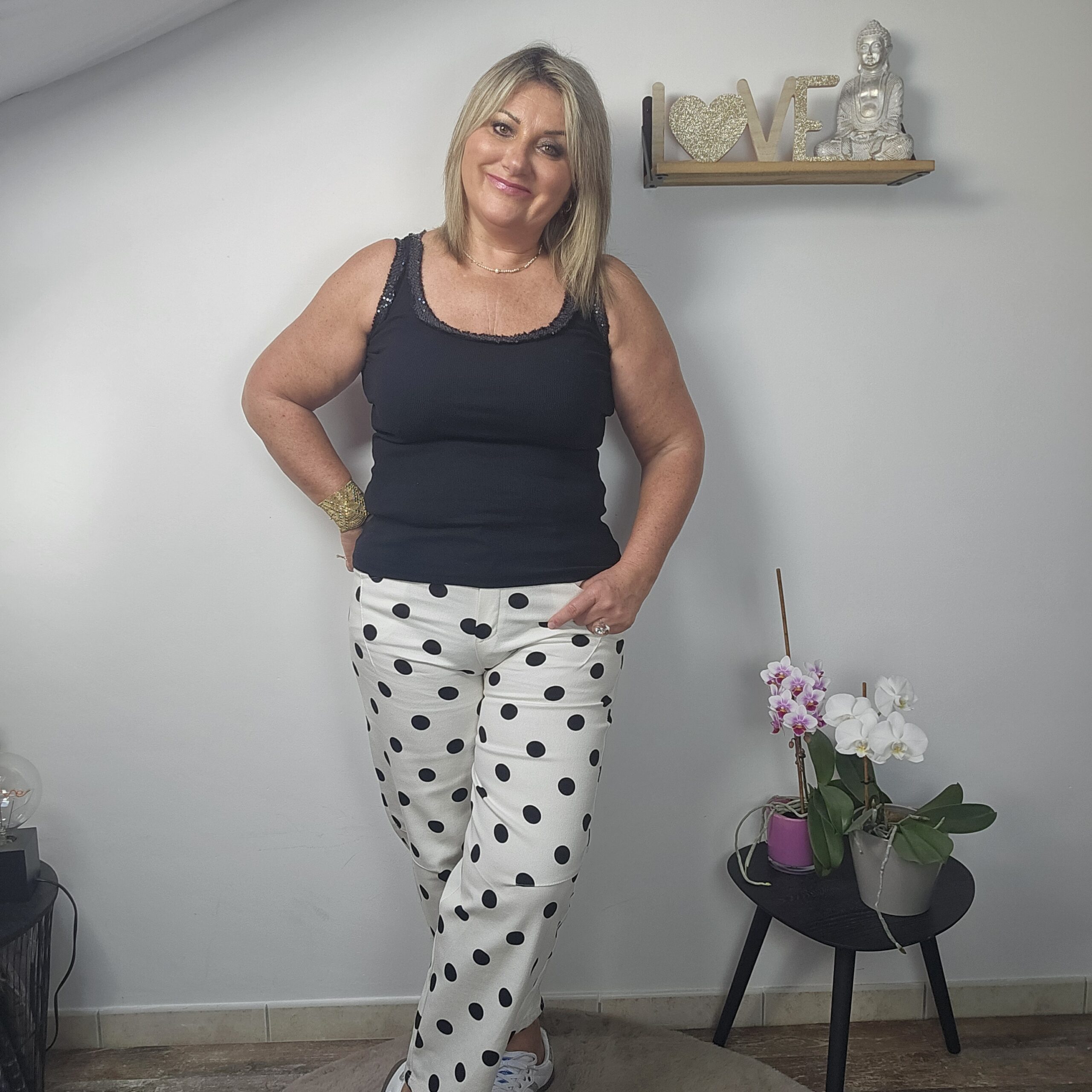 Mon regard pailleté : La coupe Barrel 7/8 ème de ce pantalon joue sur les contrastes, et apporte de la modernité. Le pois est très tendance ! A avoir absolument dans son dressing pour ce printemps !! S’adapte à toutes les morphologies.