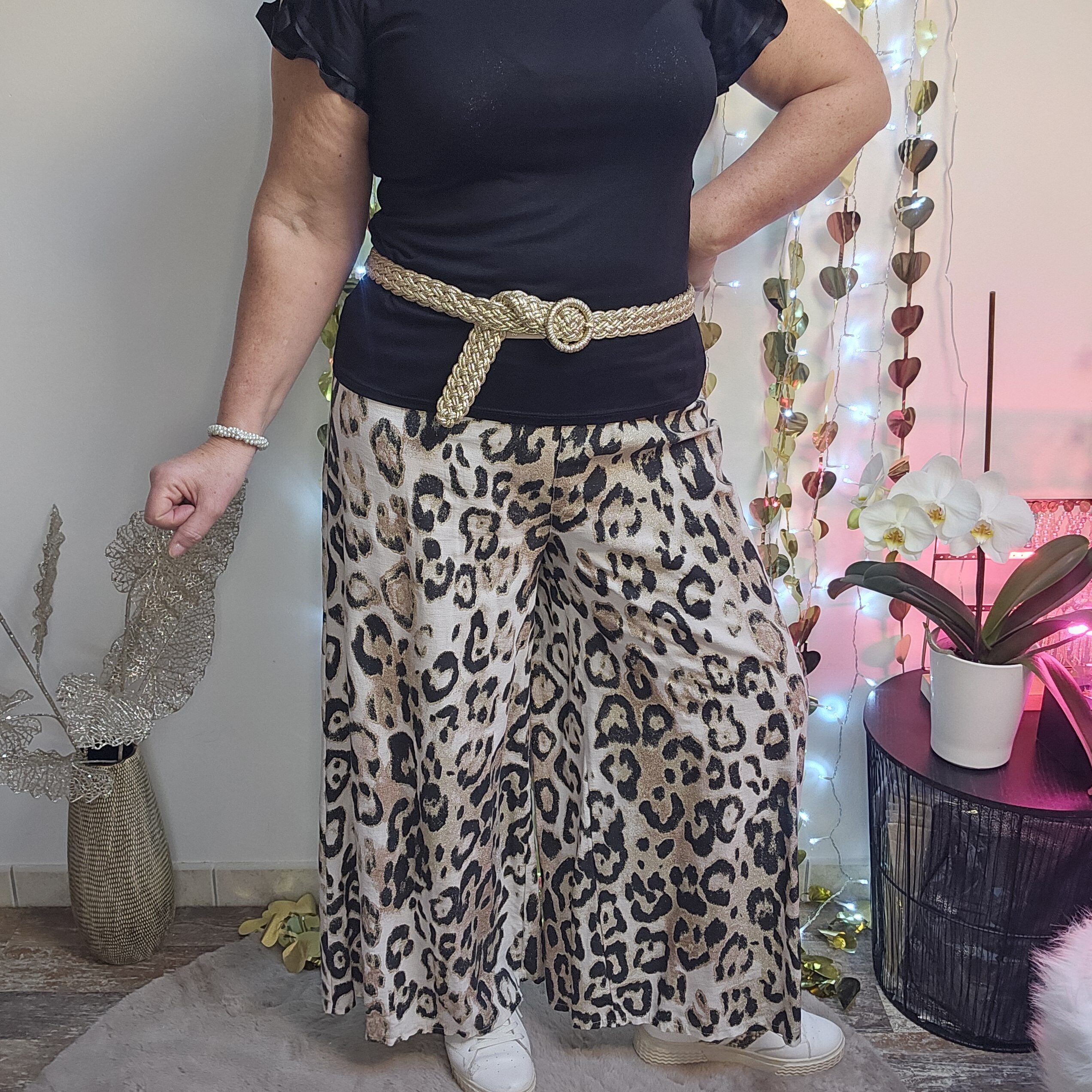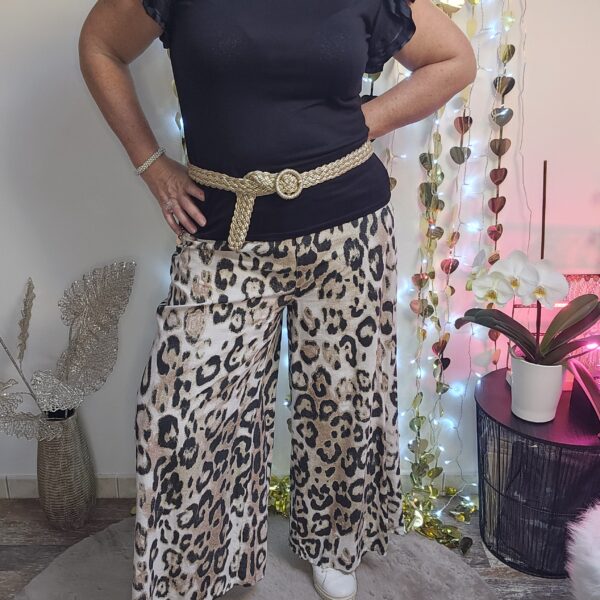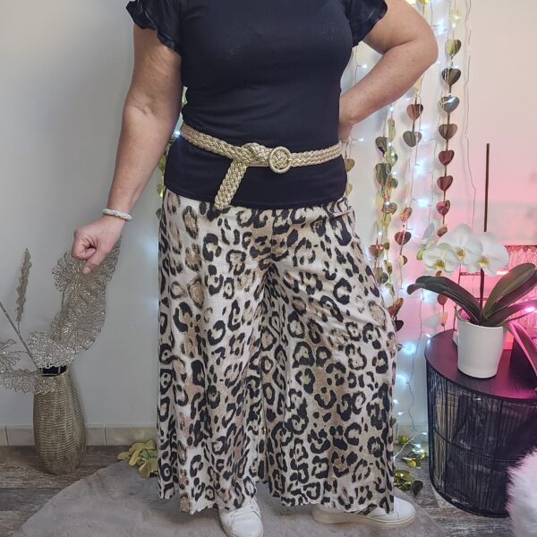 Pantalon large imprimé léopard pailleté, type palazzo. Taille smockée élastique, tissu semi fluide. TU.