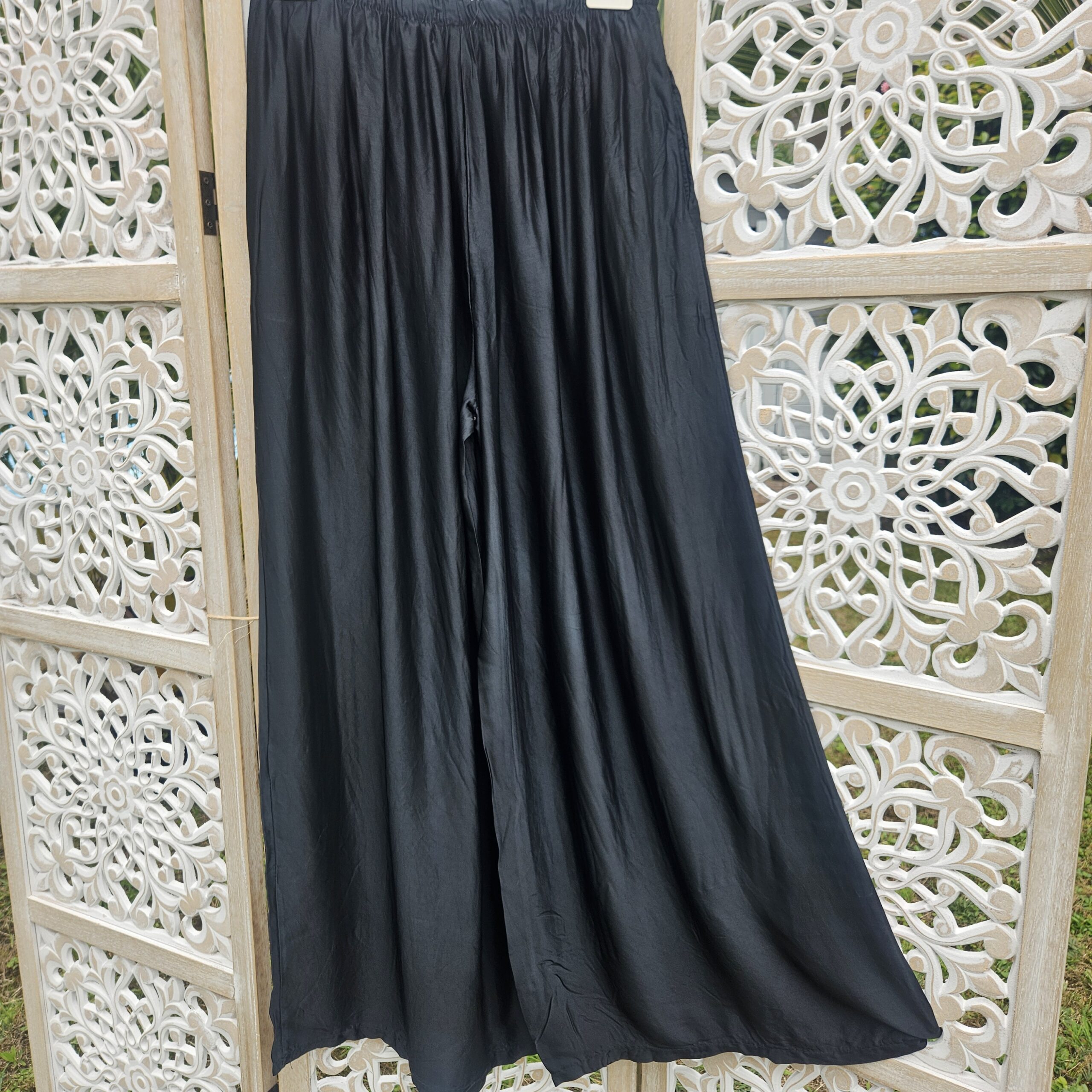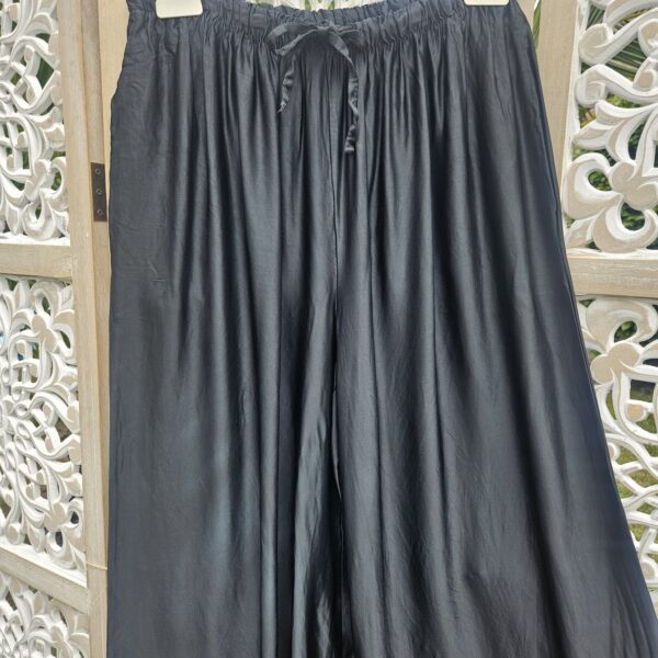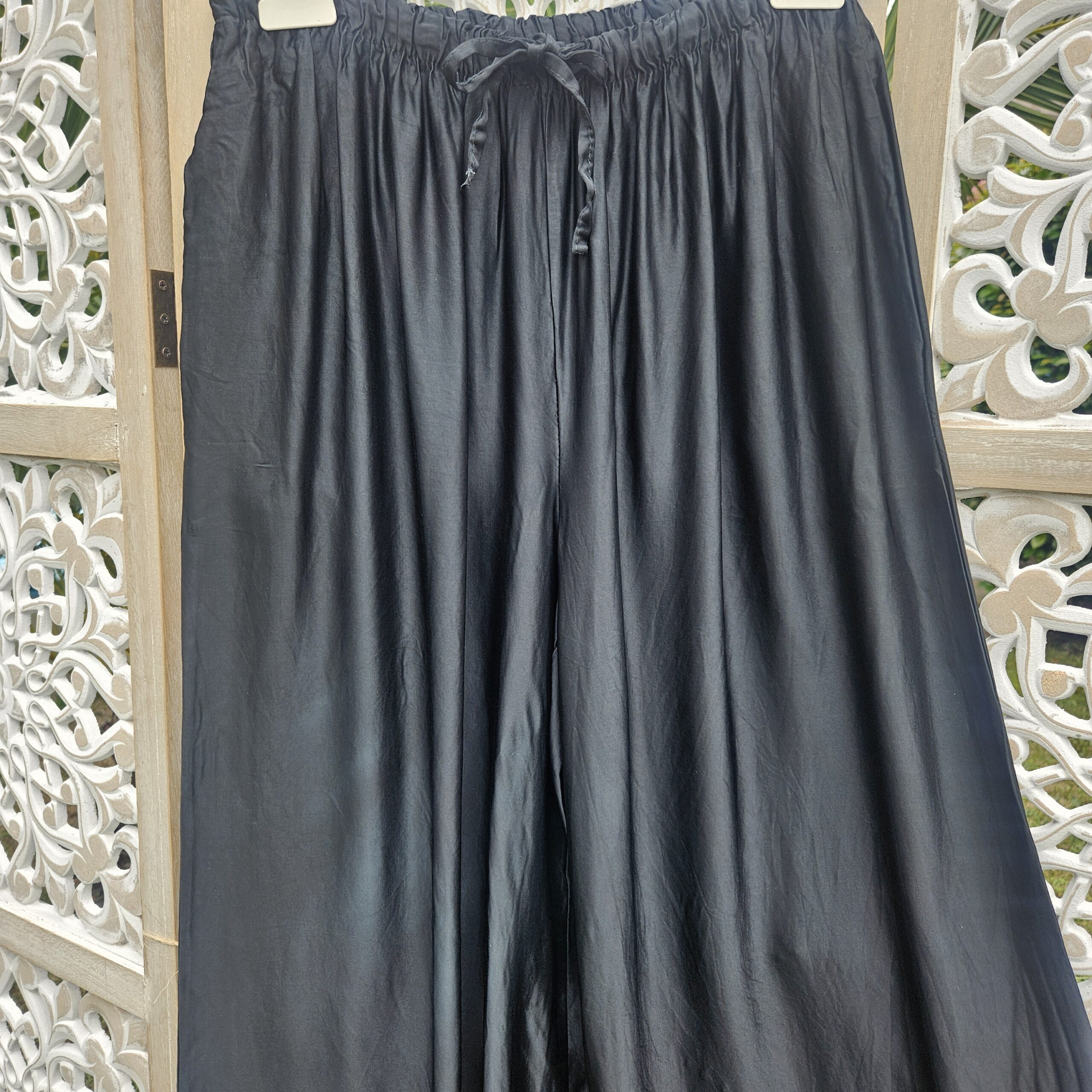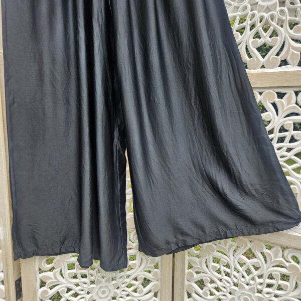 Pantalon large noir, type palazzo, élastique à la taille et liens pour nouer le pantalon, 2 poches sur le côté. TU.
