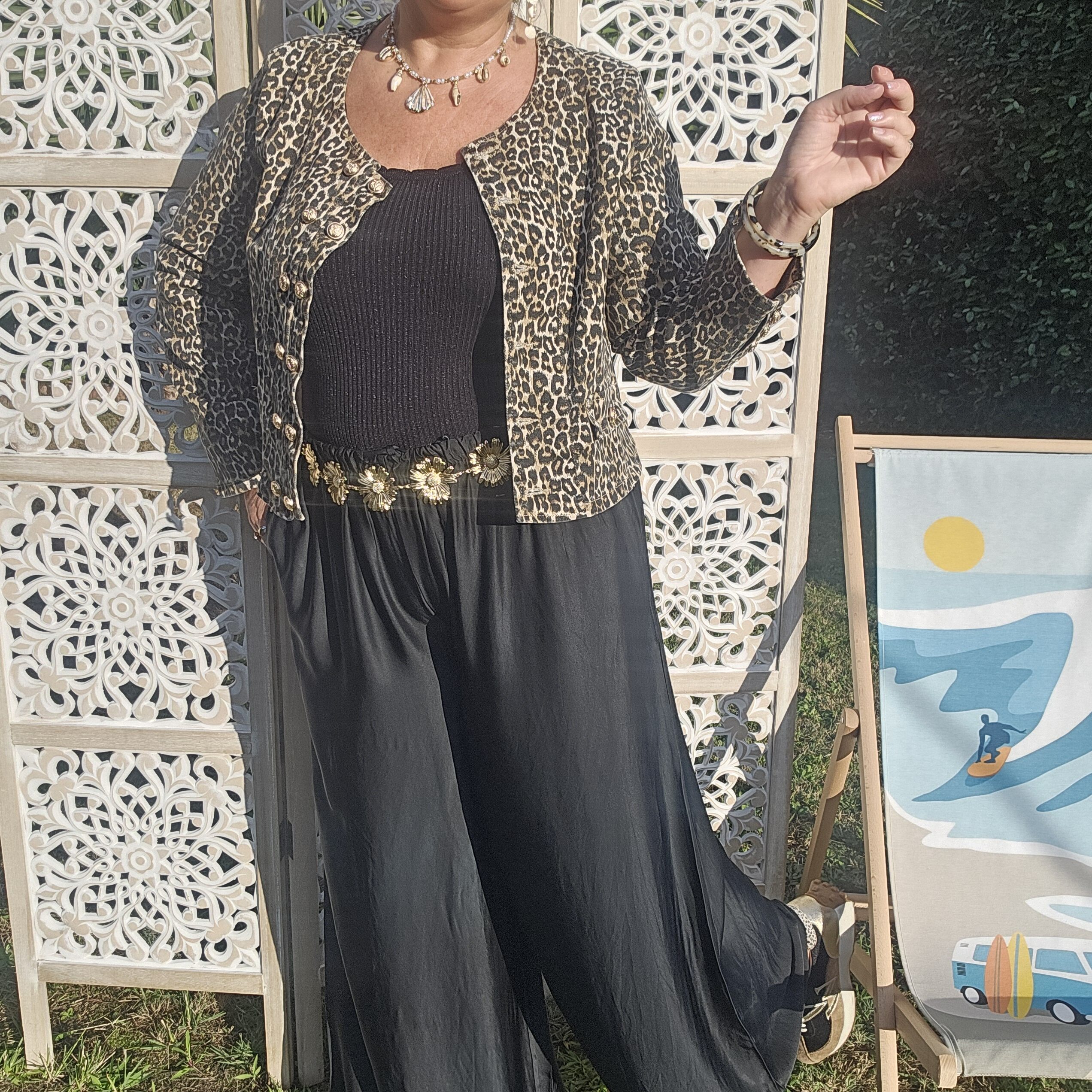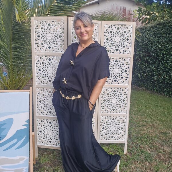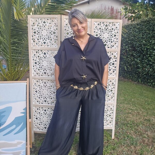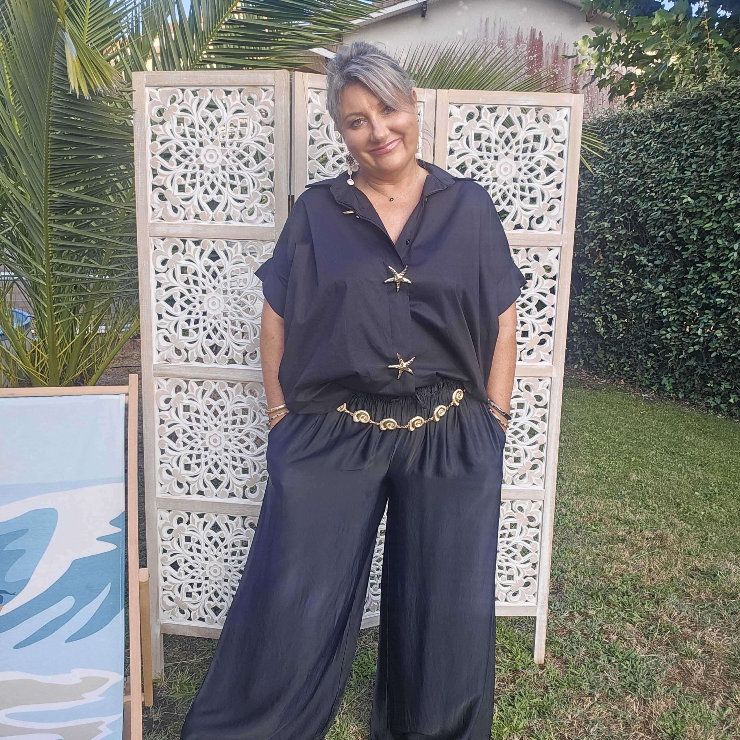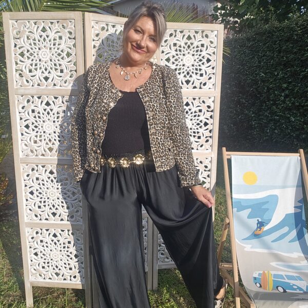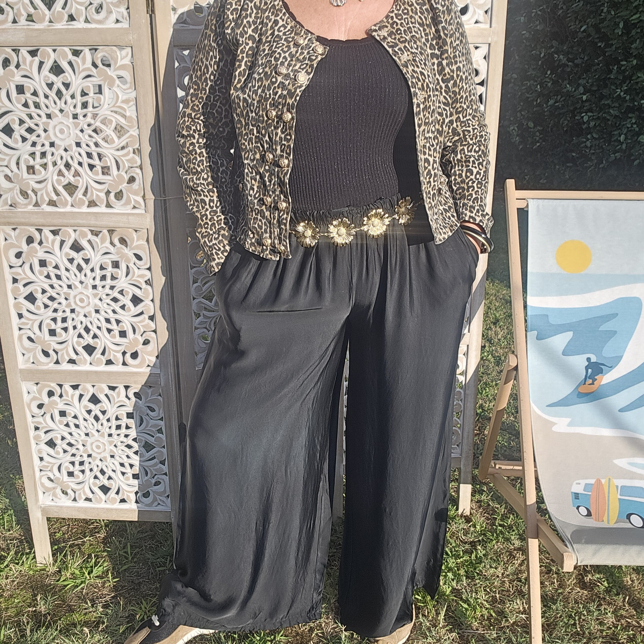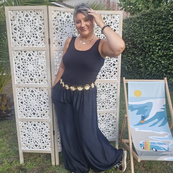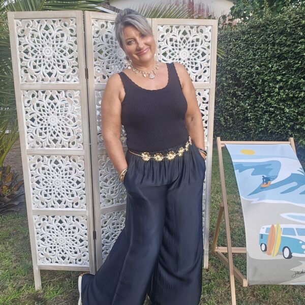 Mon regard pailleté : On aime la tenue et la fluidité de ce pantalon , très agréable à porter! Convient à différentes morphologies . A porter avec une ceinture bijou coquillages ou marguerites.
