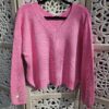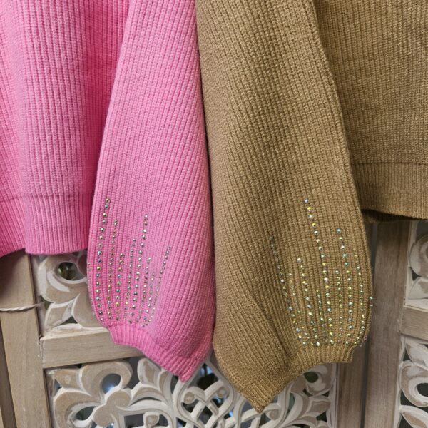 Pull col V en viscose, très doux, détail strass multicolores aux bout des manches qui sont un peu évasées. TU (36/42).