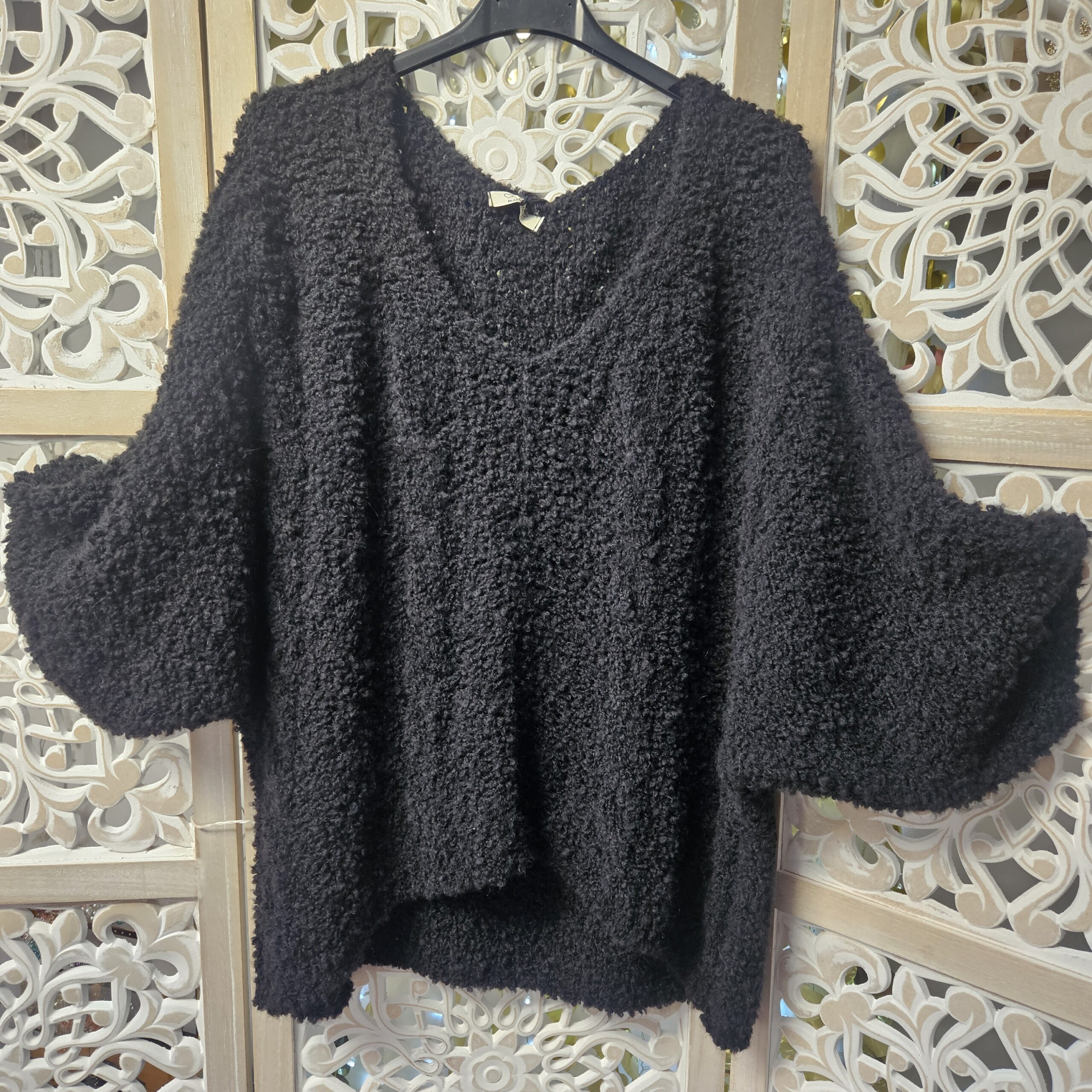 Pull col V, manches 3/4, en bouclettes tressées. 4 nattes sur le devant. Manches chauve- souris. Arrondit sur le devant et un peu plus court que derrière. Très doux. TU.