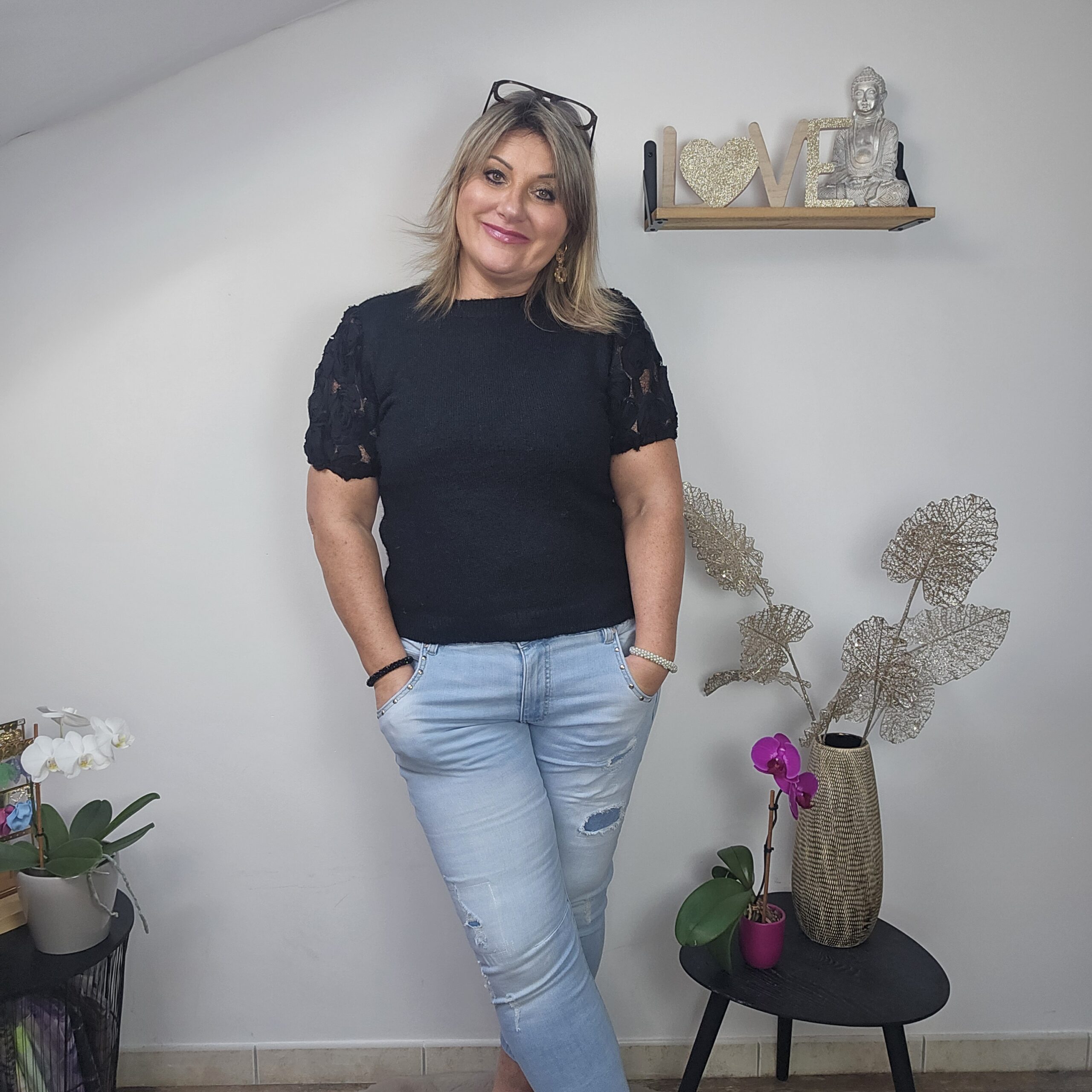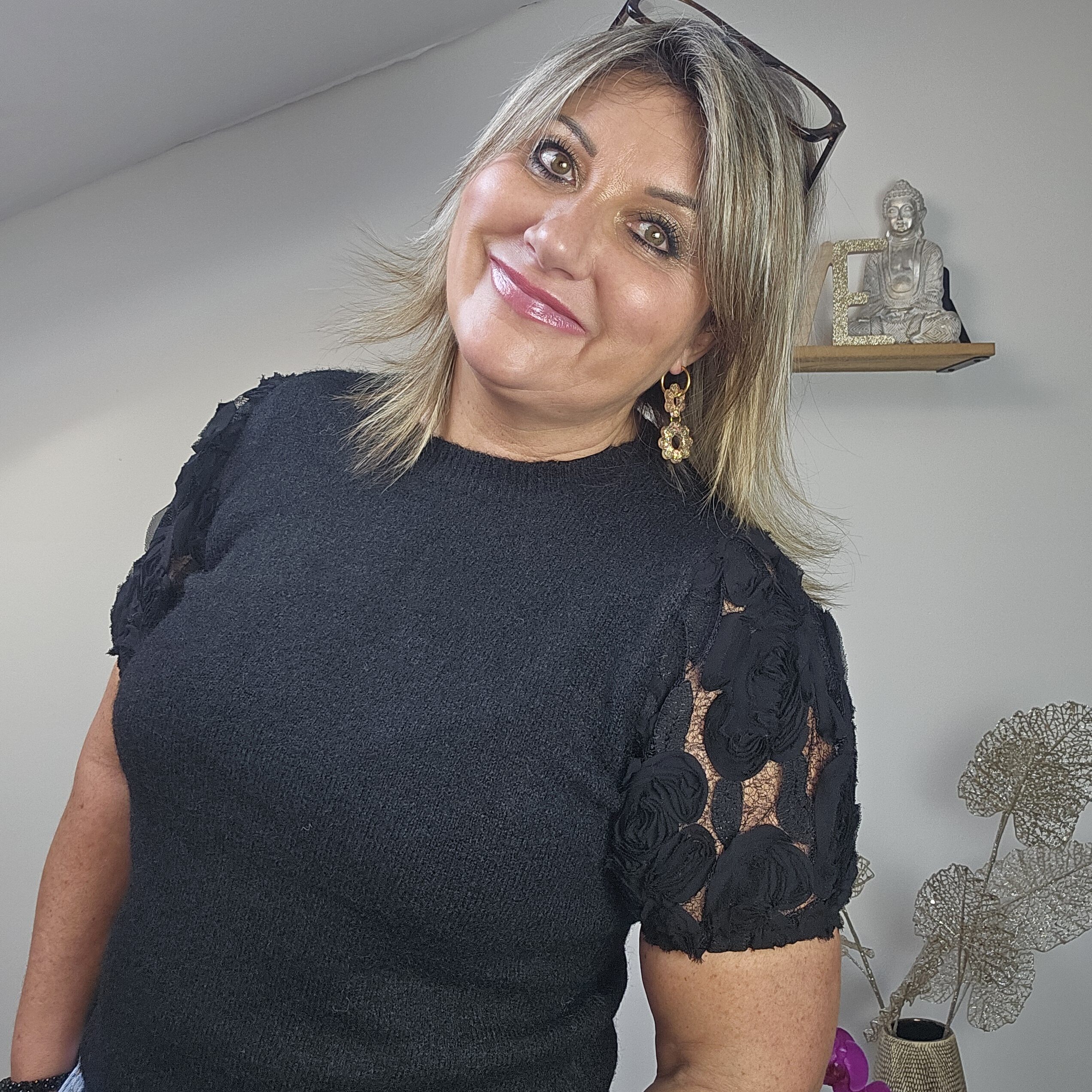 Mon regard pailleté : On aime ce pull avec ses manches en tulle avec des fleurs. Très agréable à porter, léger, doux et ne pique pas malgré la présence de laine. Idéal pour la mi saison.