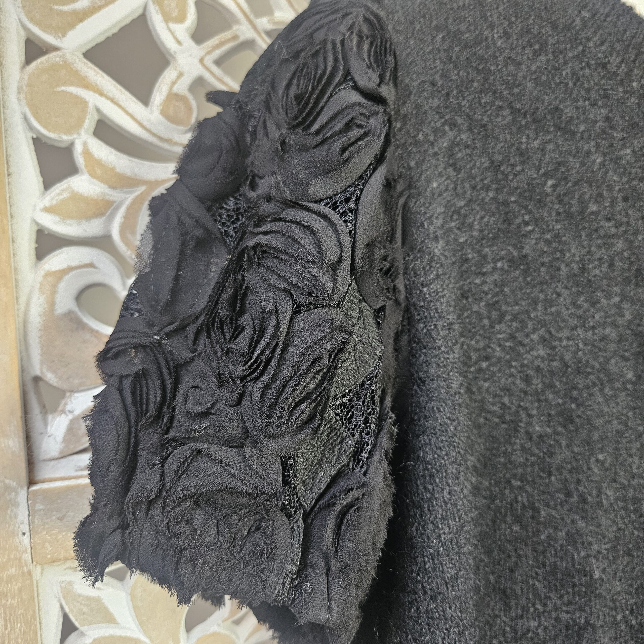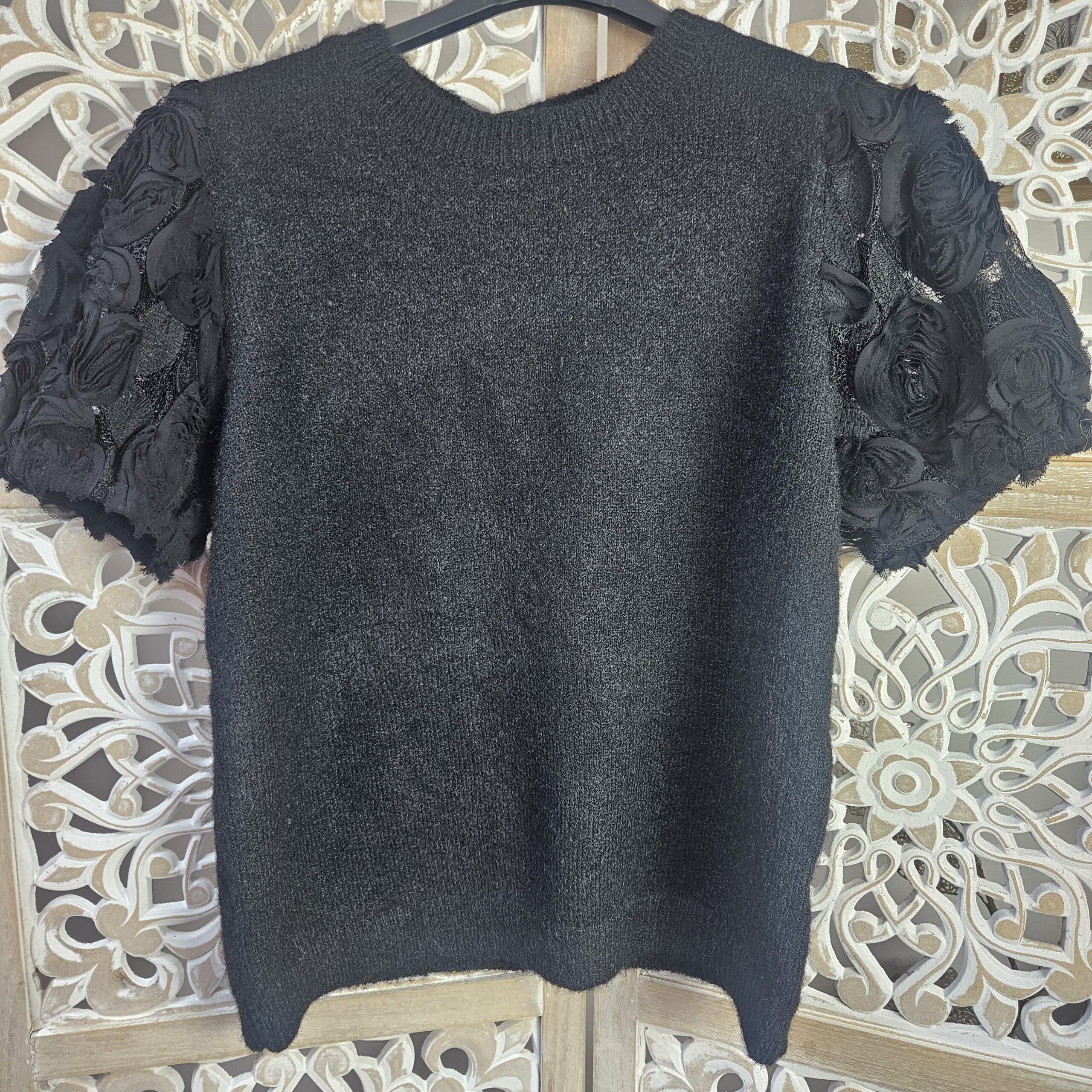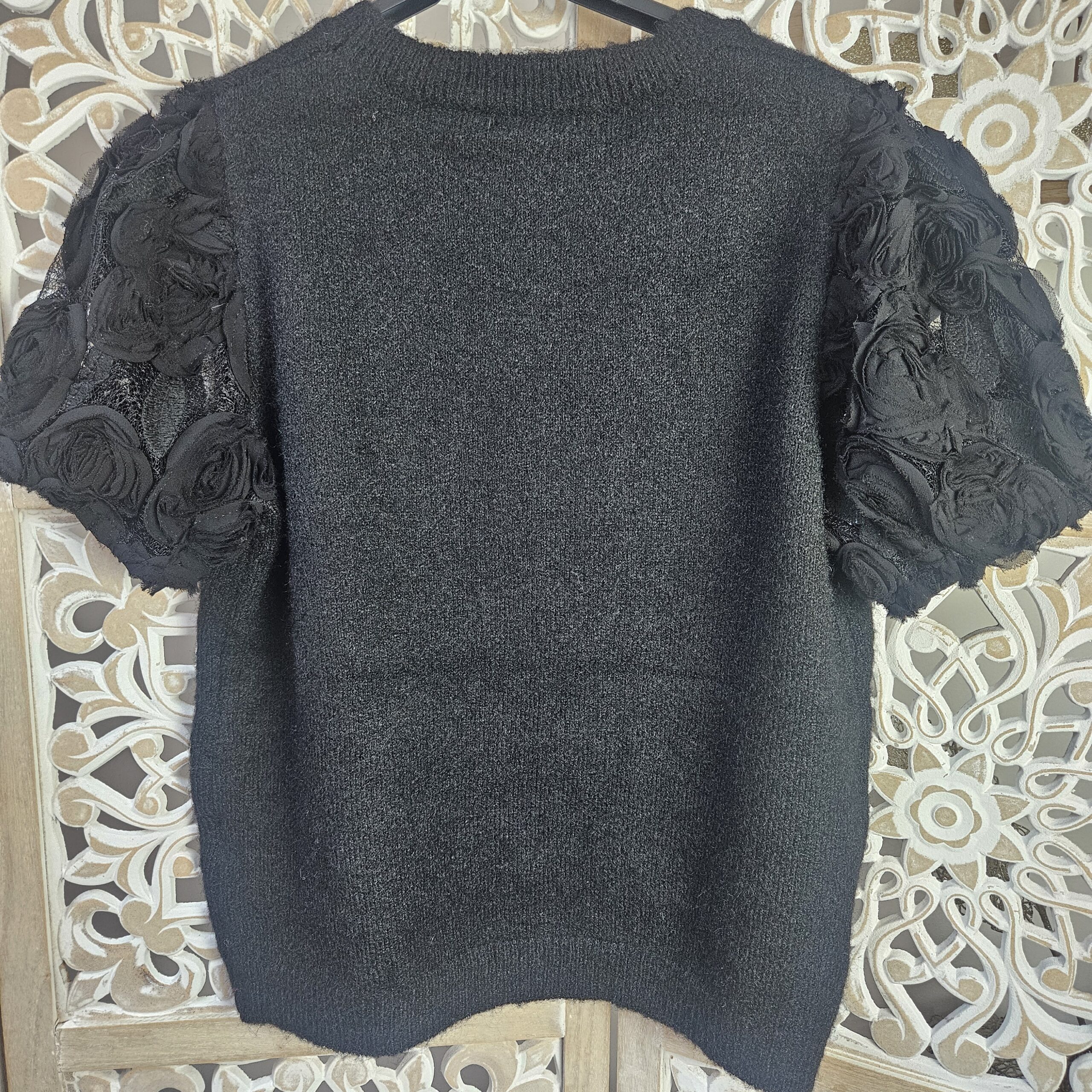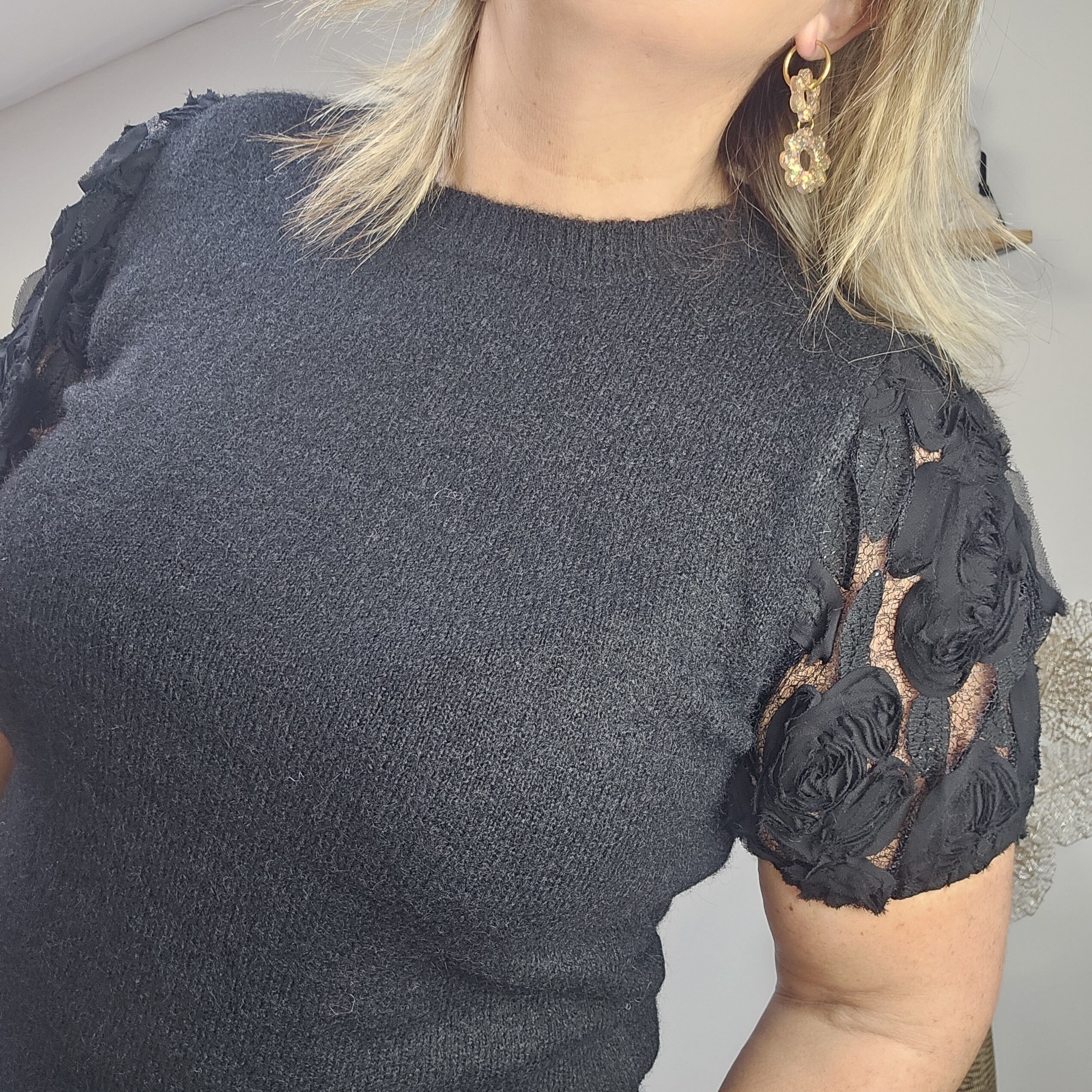 Pull manches courtes. Les manches sont en tulle avec des fleurs et le bout est élastiqué. Col arrondit. Léger et très agréable à porter, très doux, ne pique pas. Existe en noir.