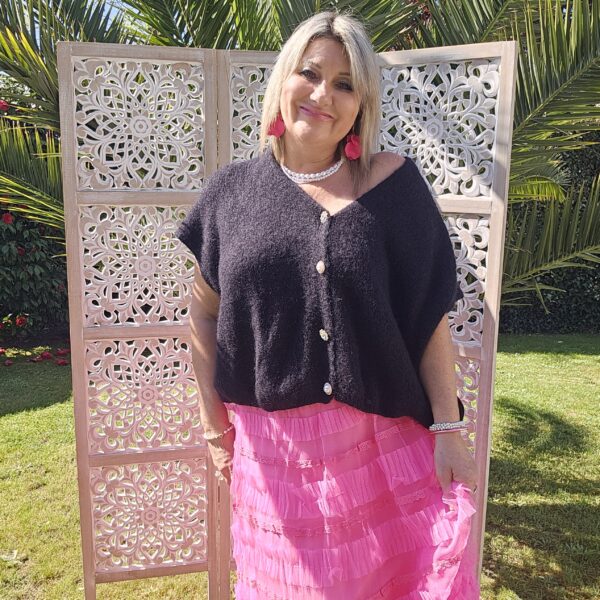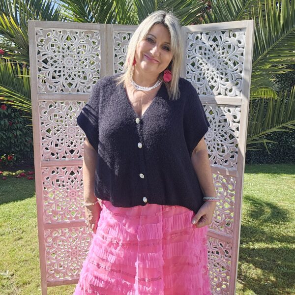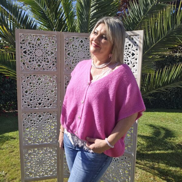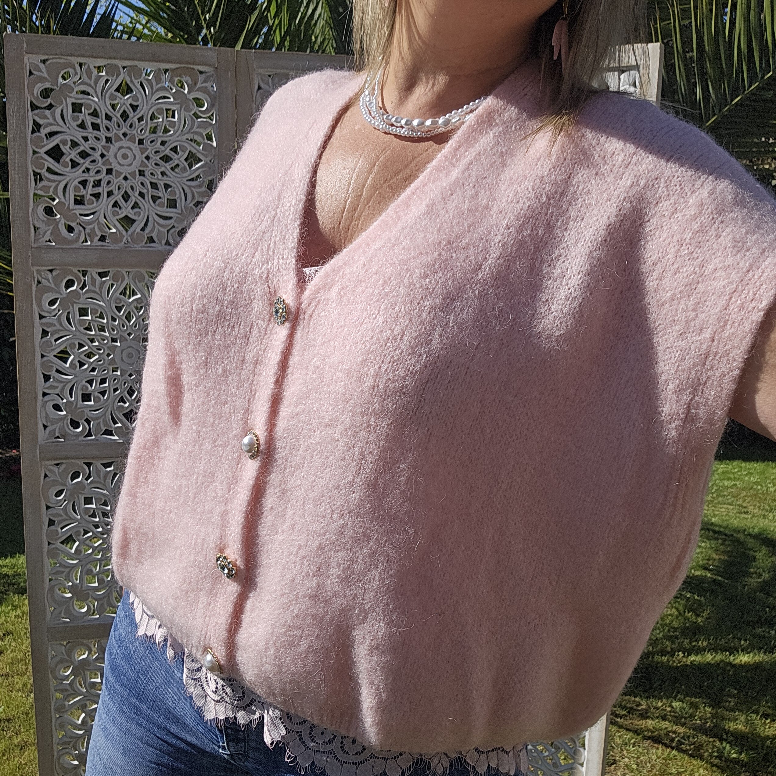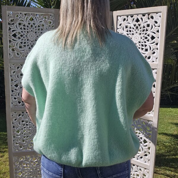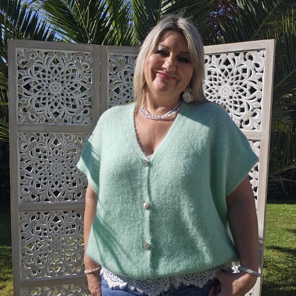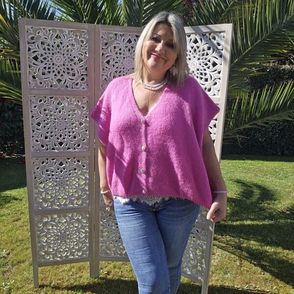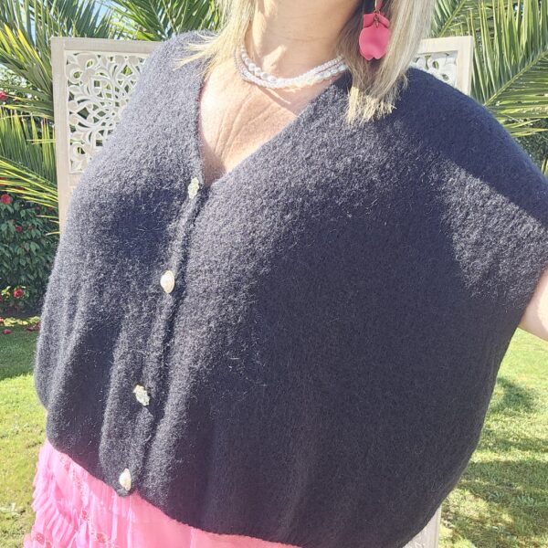 Pull col V sans manches, avec 4 boutons fantaisies, très doux par la présence de kid Mohair, ne pique absolument pas !