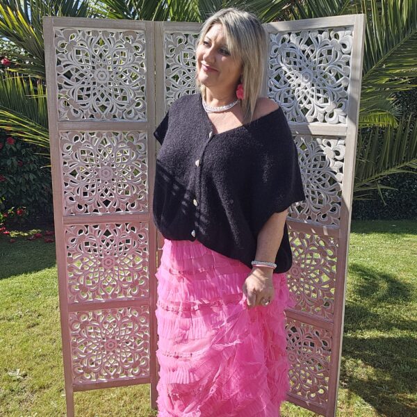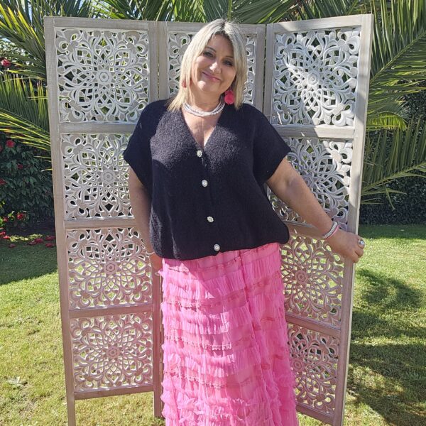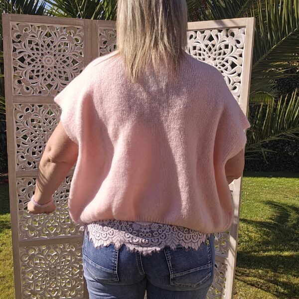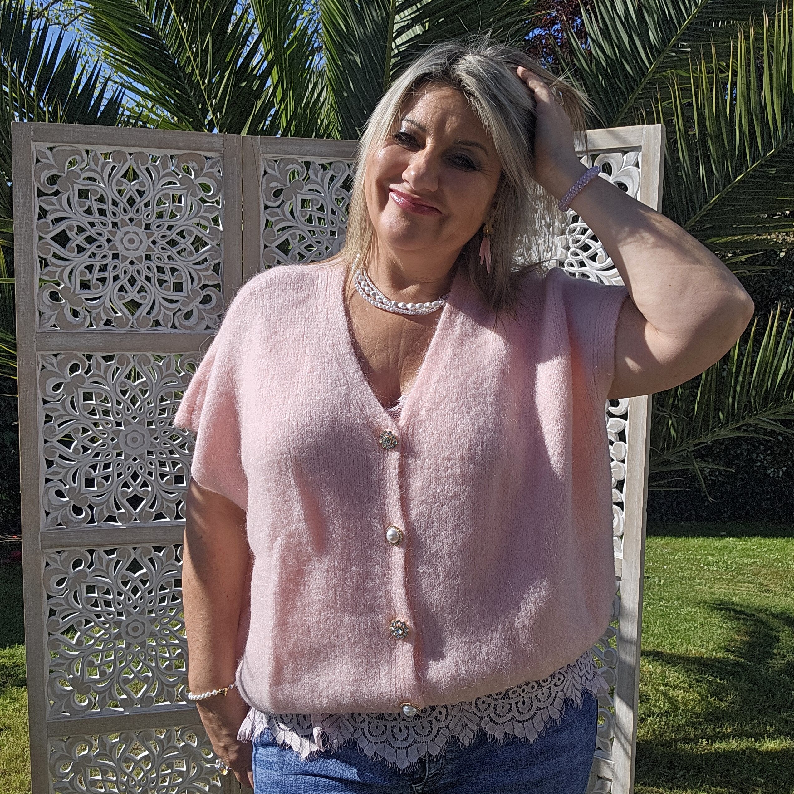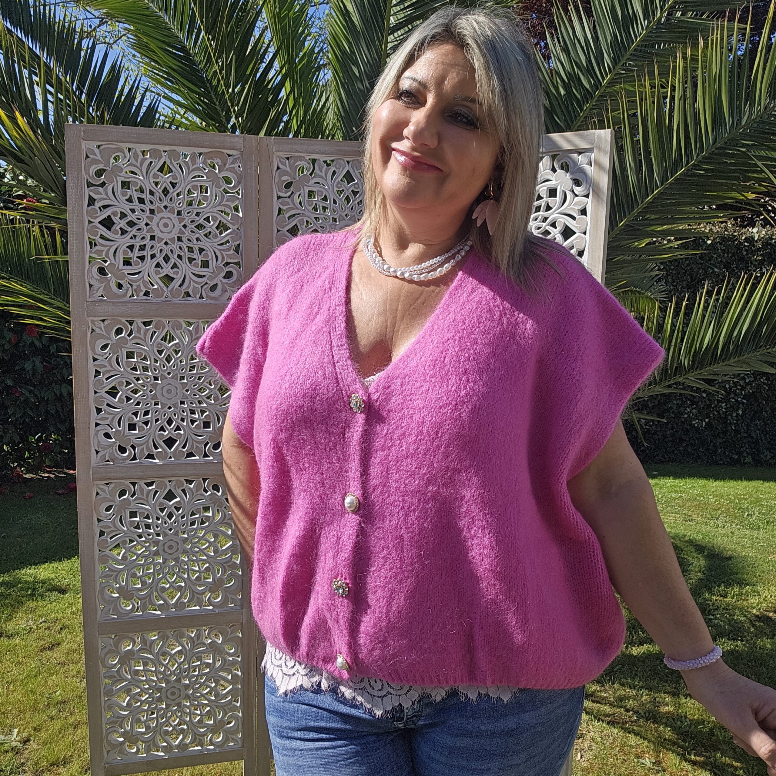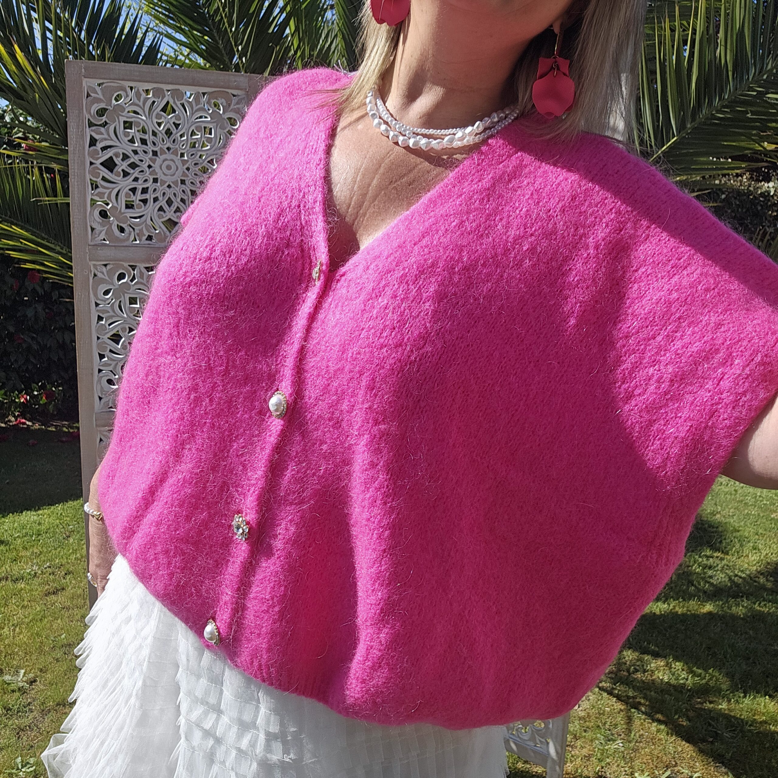 Pull col V sans manches, avec 4 boutons fantaisies, très doux par la présence de kid Mohair, ne pique absolument pas !