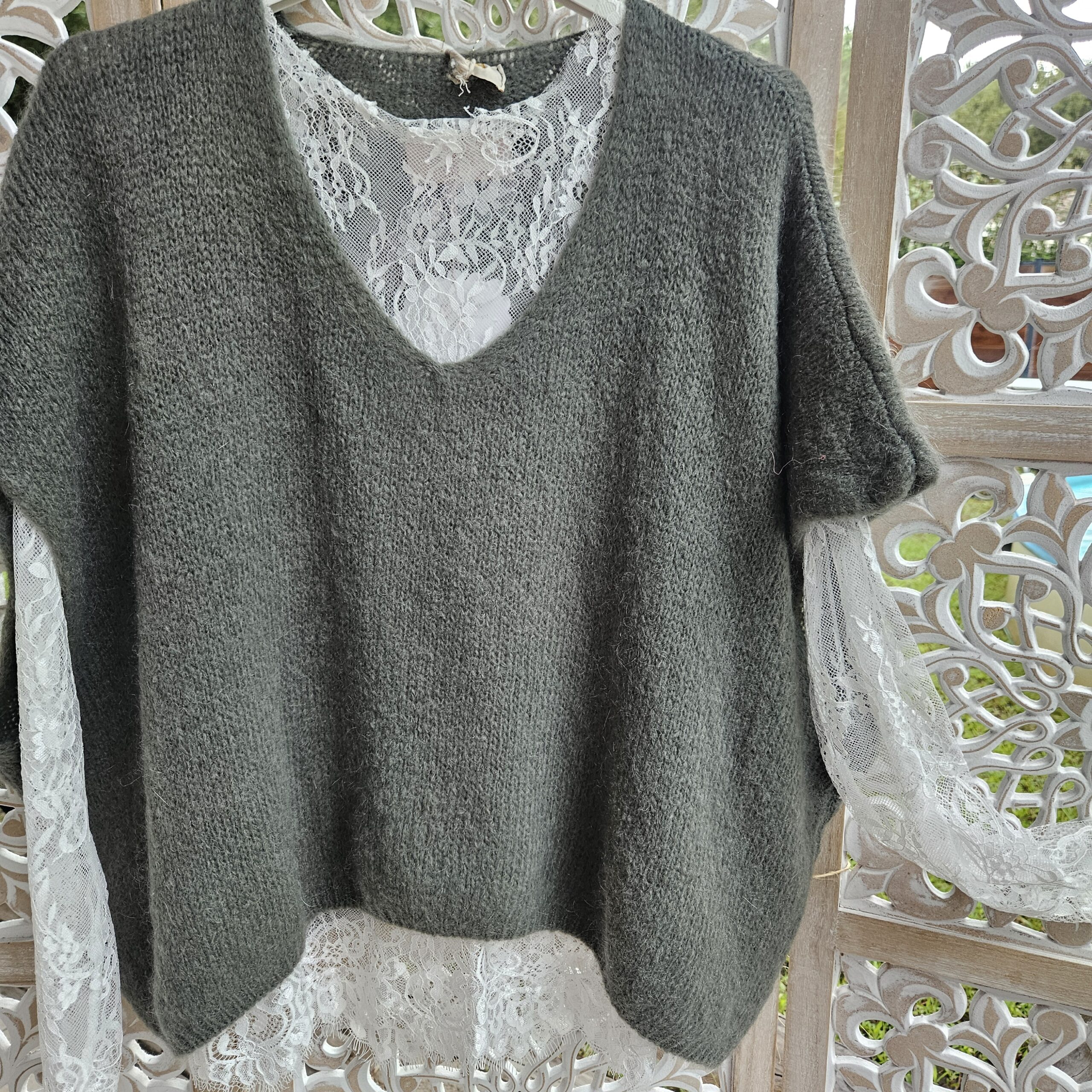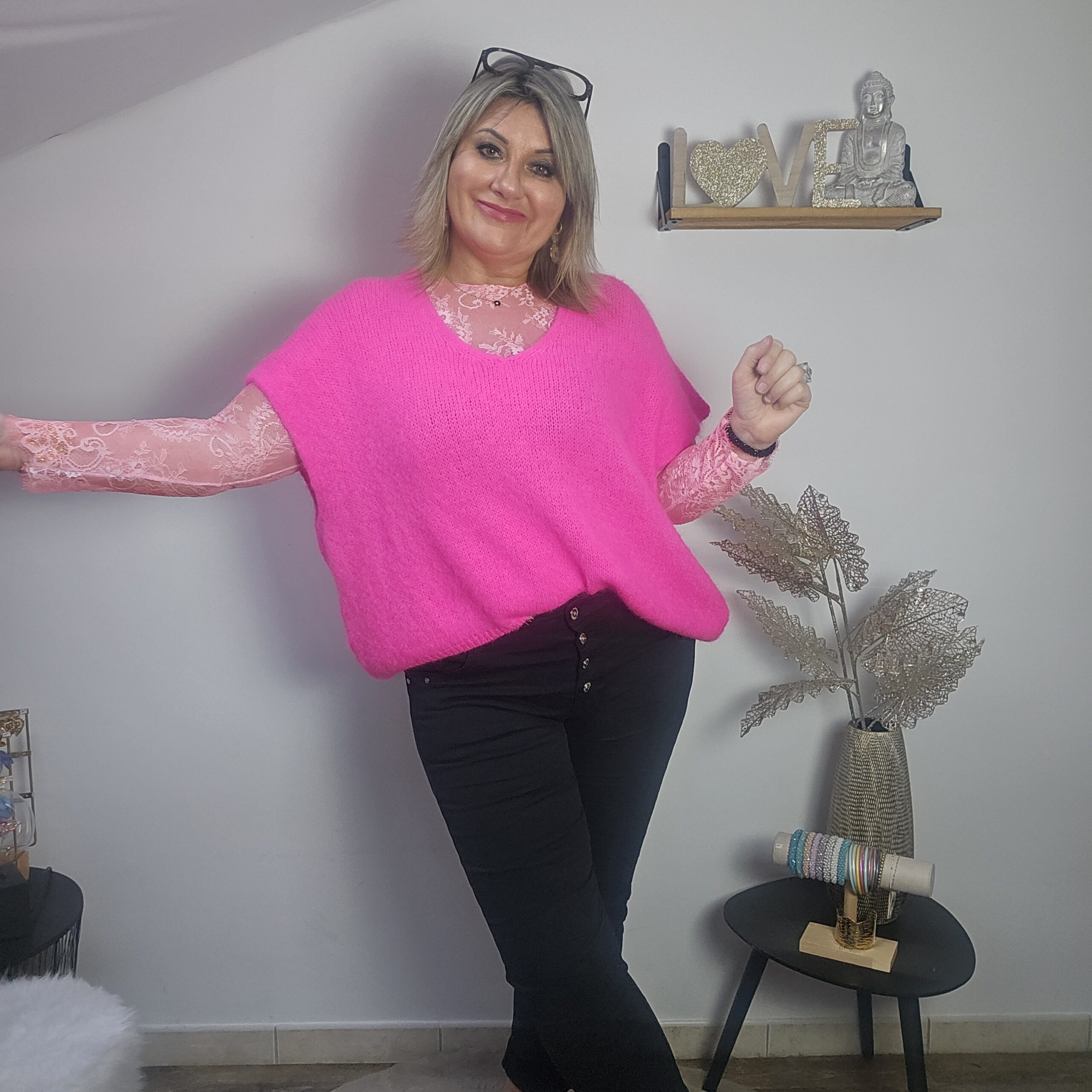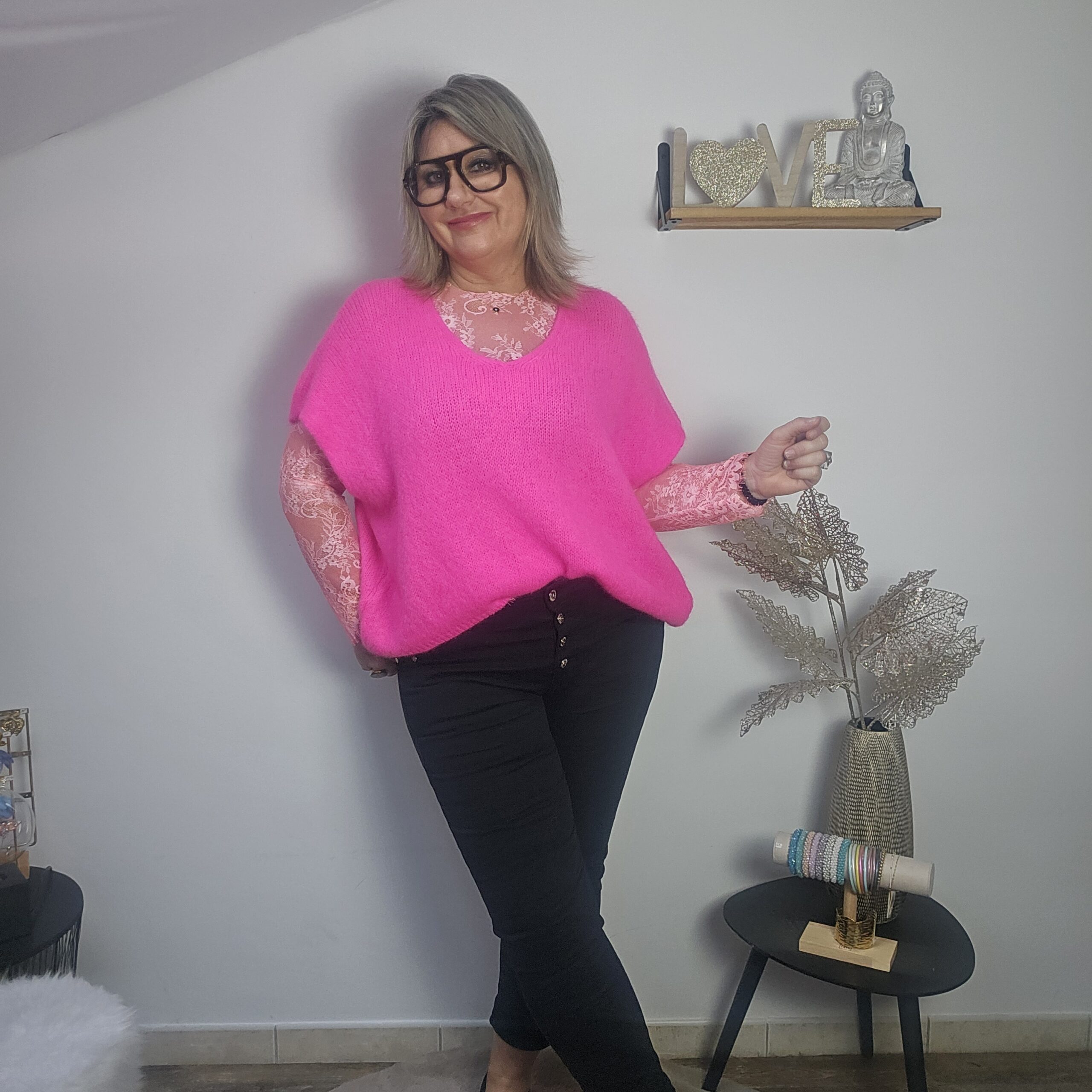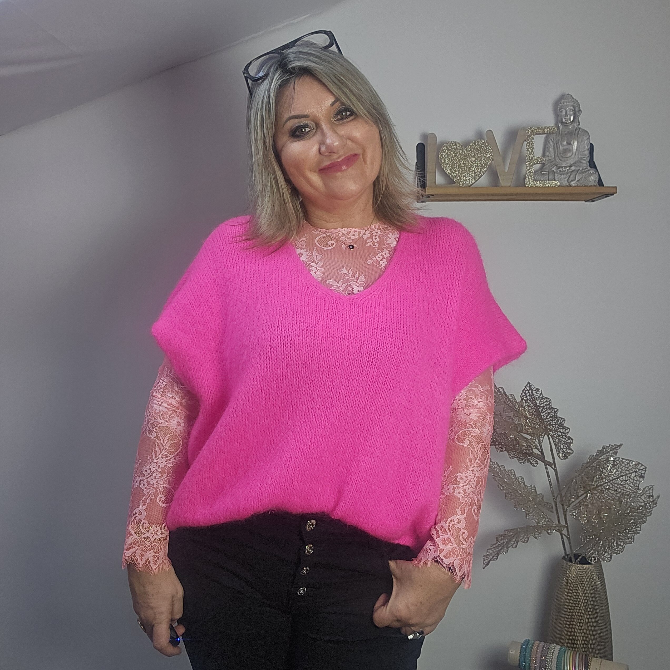 Mon regard pailleté : Pull très doux, peut se porter seul ou avec un top dentelle à manches longues, ou une chemise, accompagné d’un pantalon, un jean’s ou une jupe.